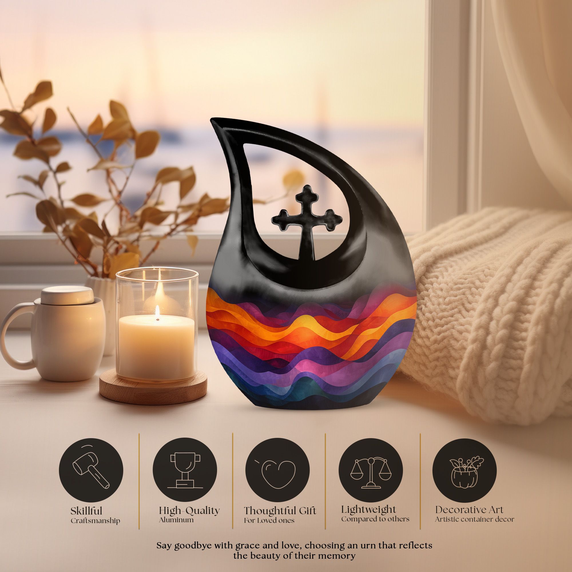 Crafted from durable aluminium, this urn features a radiant spectrum of colors shaped into gentle wave-like patterns, representing the beautiful journey of a cherished life. The secure screw-top lid ensures safe preservation, making it ideal for families wanting a centerpiece urn along with coordinated memorial ashes keepsake items, keepsake urns for ashes, or additional urn keepsake for human ashes pieces for sharing.