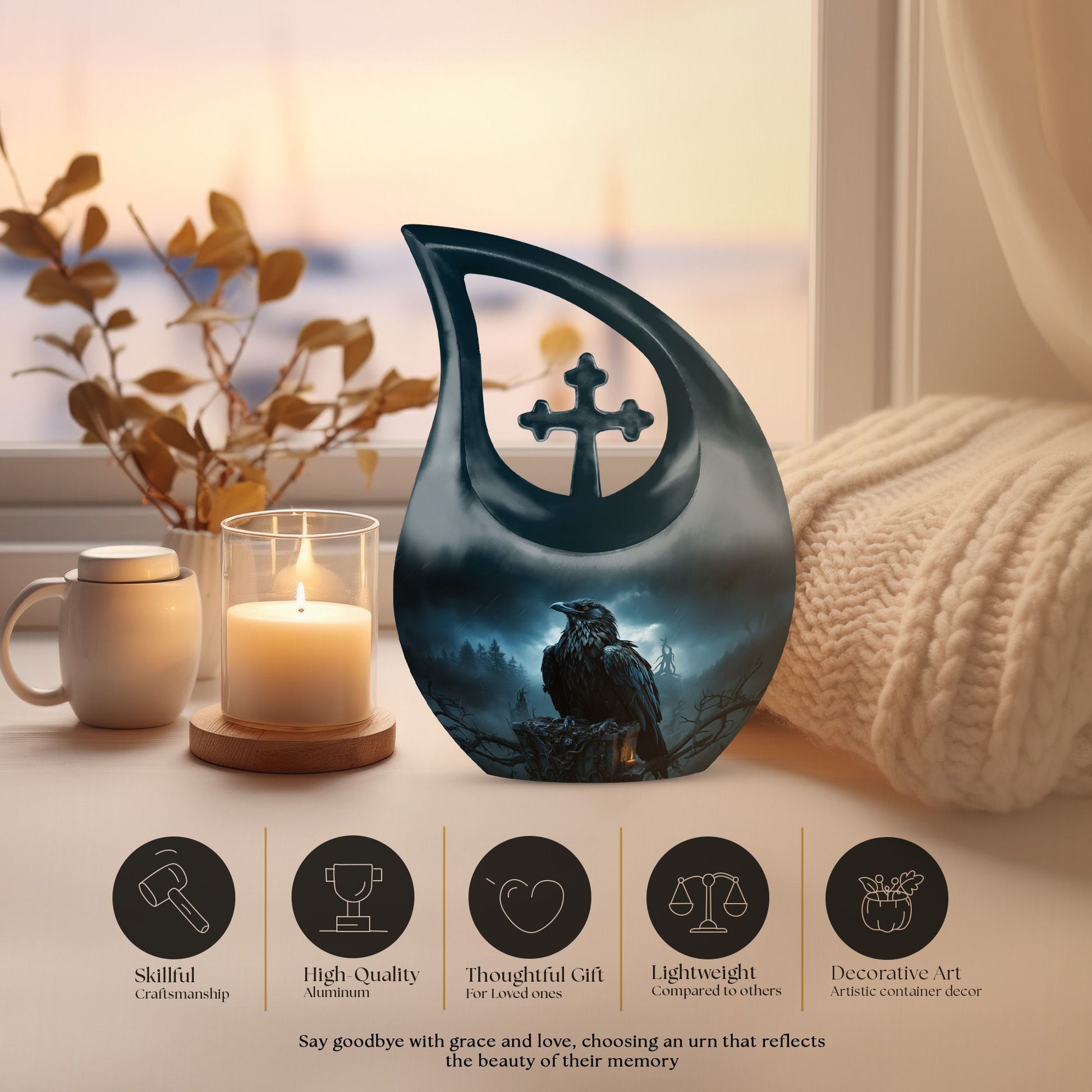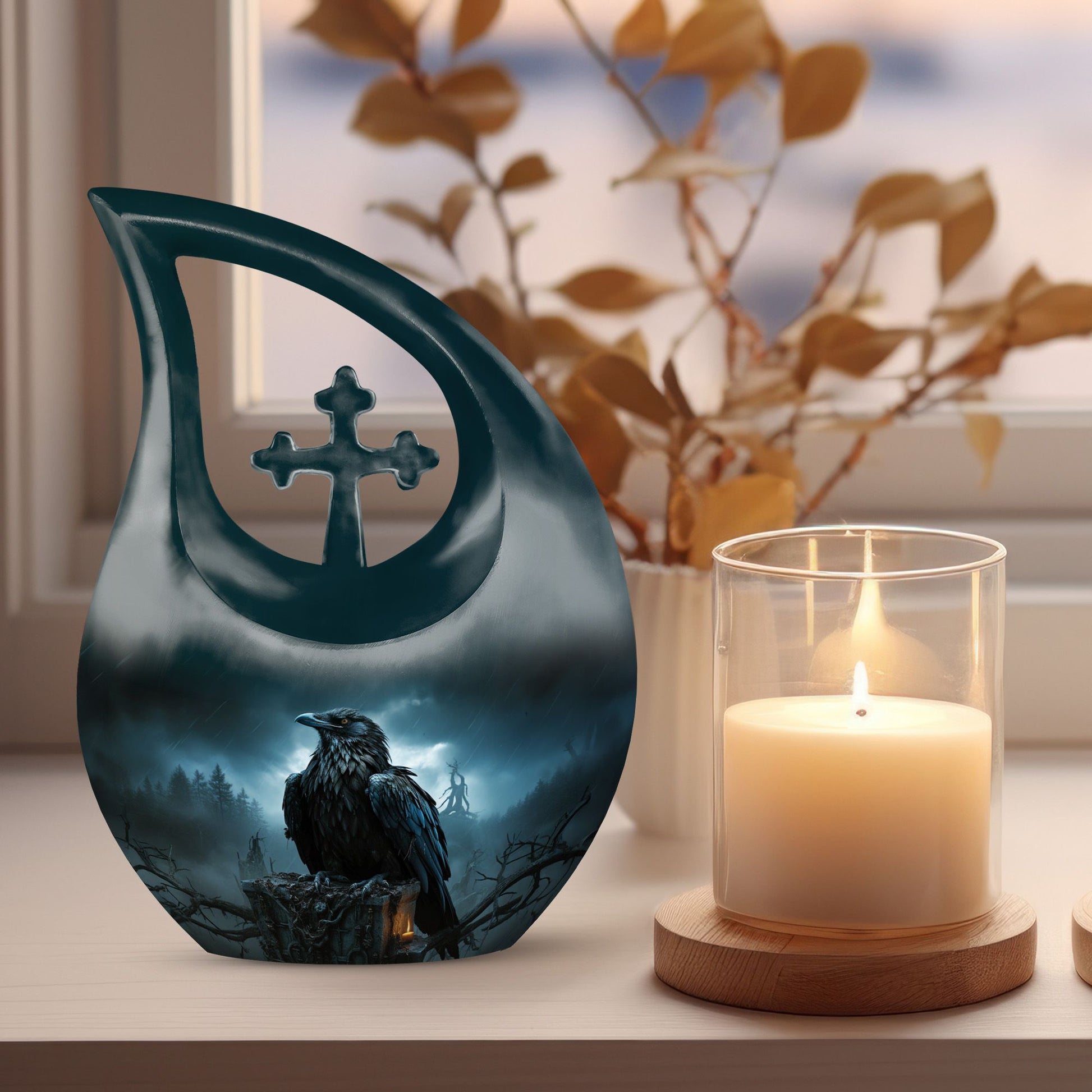 This raven-themed memorial is ideal for keepsake small urns, small urn for ashes keepsake Mom, or small decorative urn choices that honor a loved one with depth and symbolism.