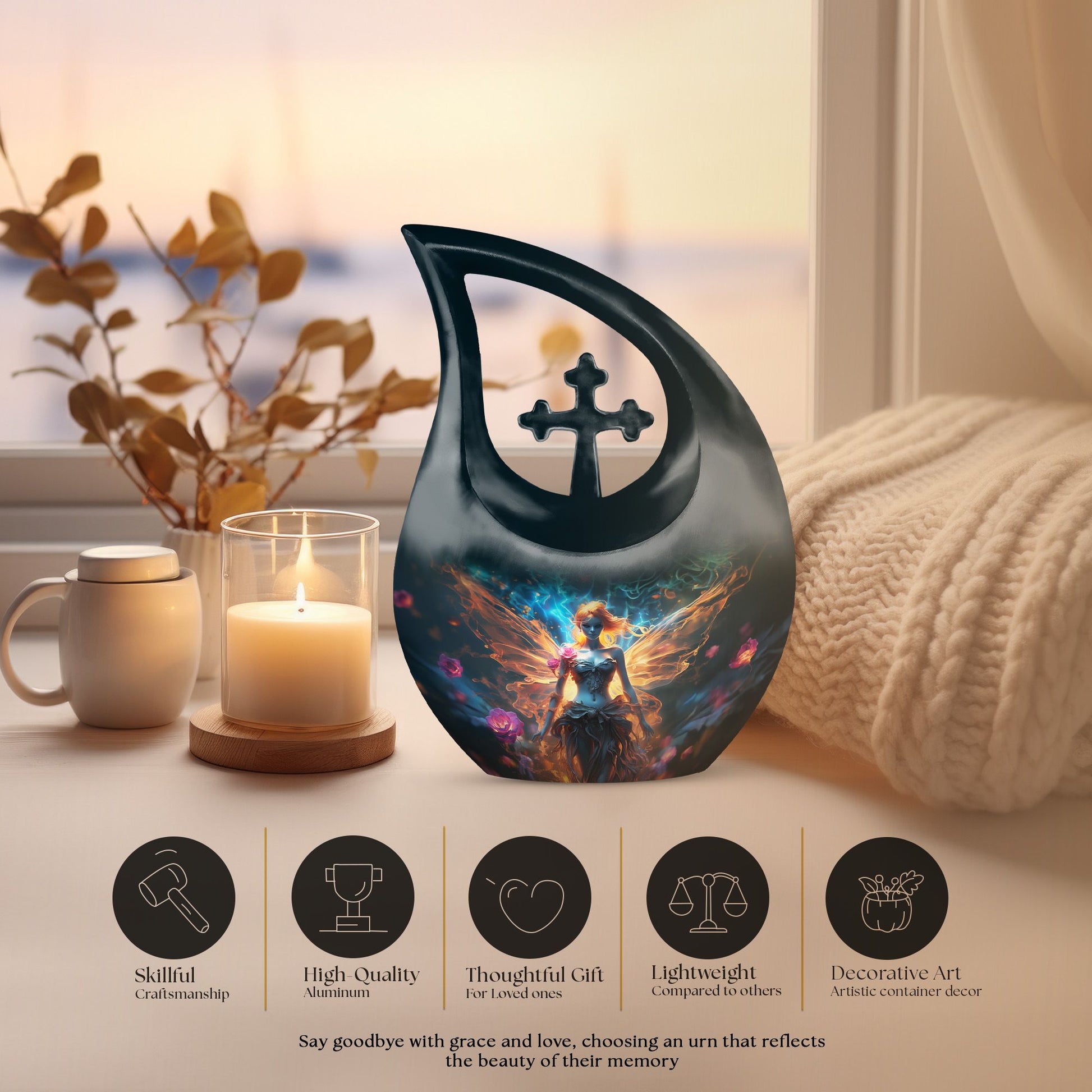 Expertly handcrafted from durable aluminium, this urn adult cremation features a deep black background illuminated with silver and violet cosmic accents and a graceful fairy silhouette — a symbol of guidance, transformation, and eternal peace. The secure screw-top lid ensures the ashes are safely preserved, while the polished finish makes this cremation urn human ash a sophisticated addition to any memorial space.