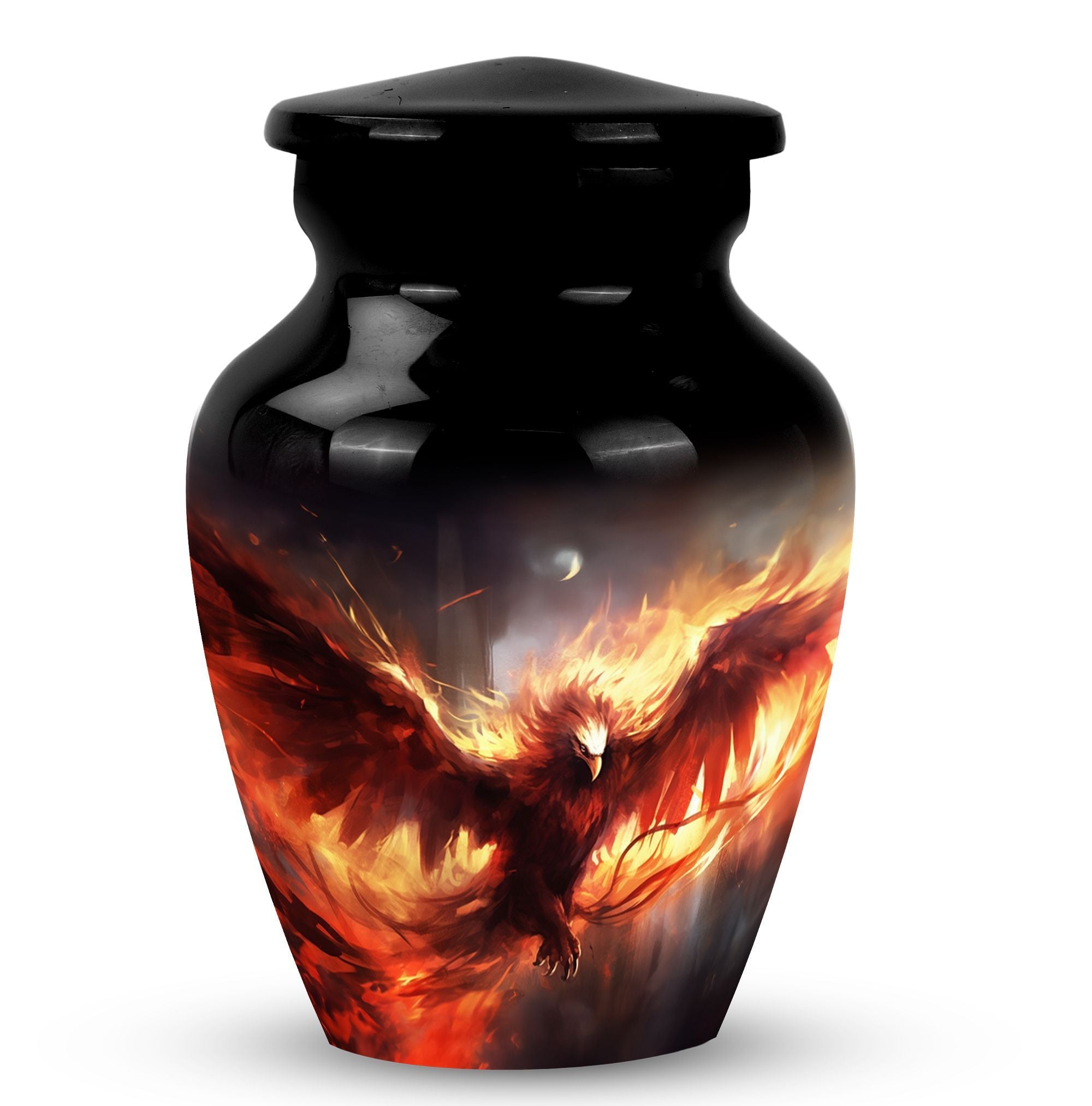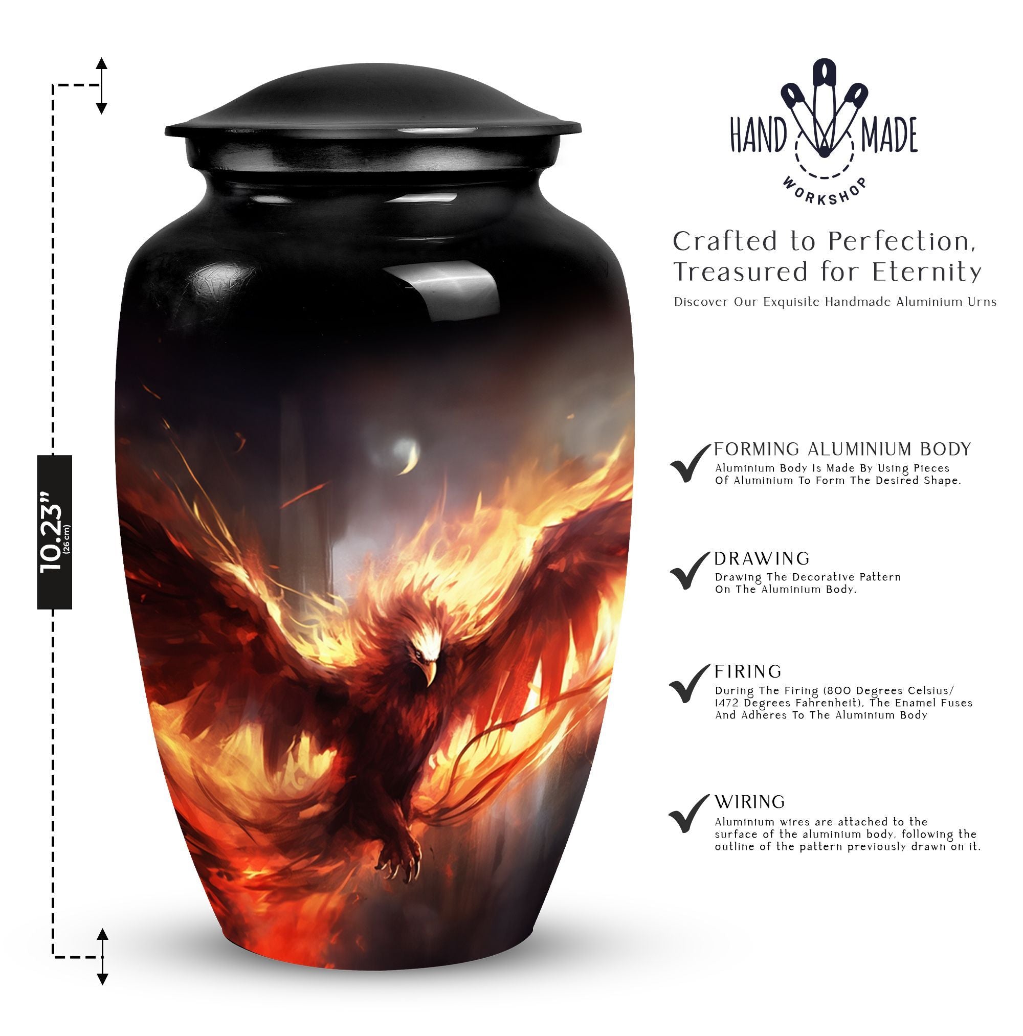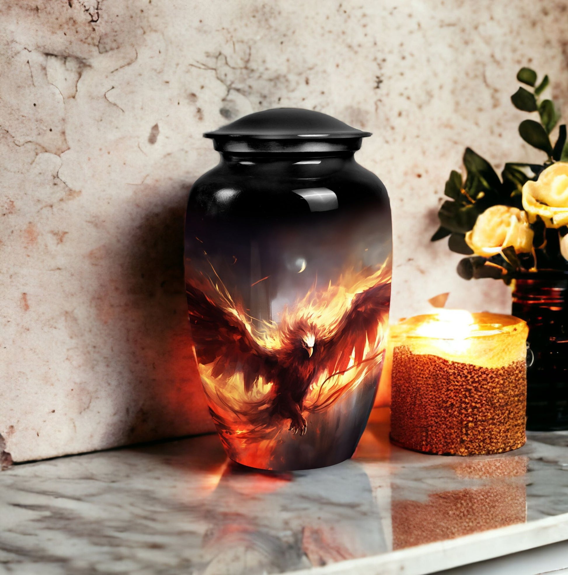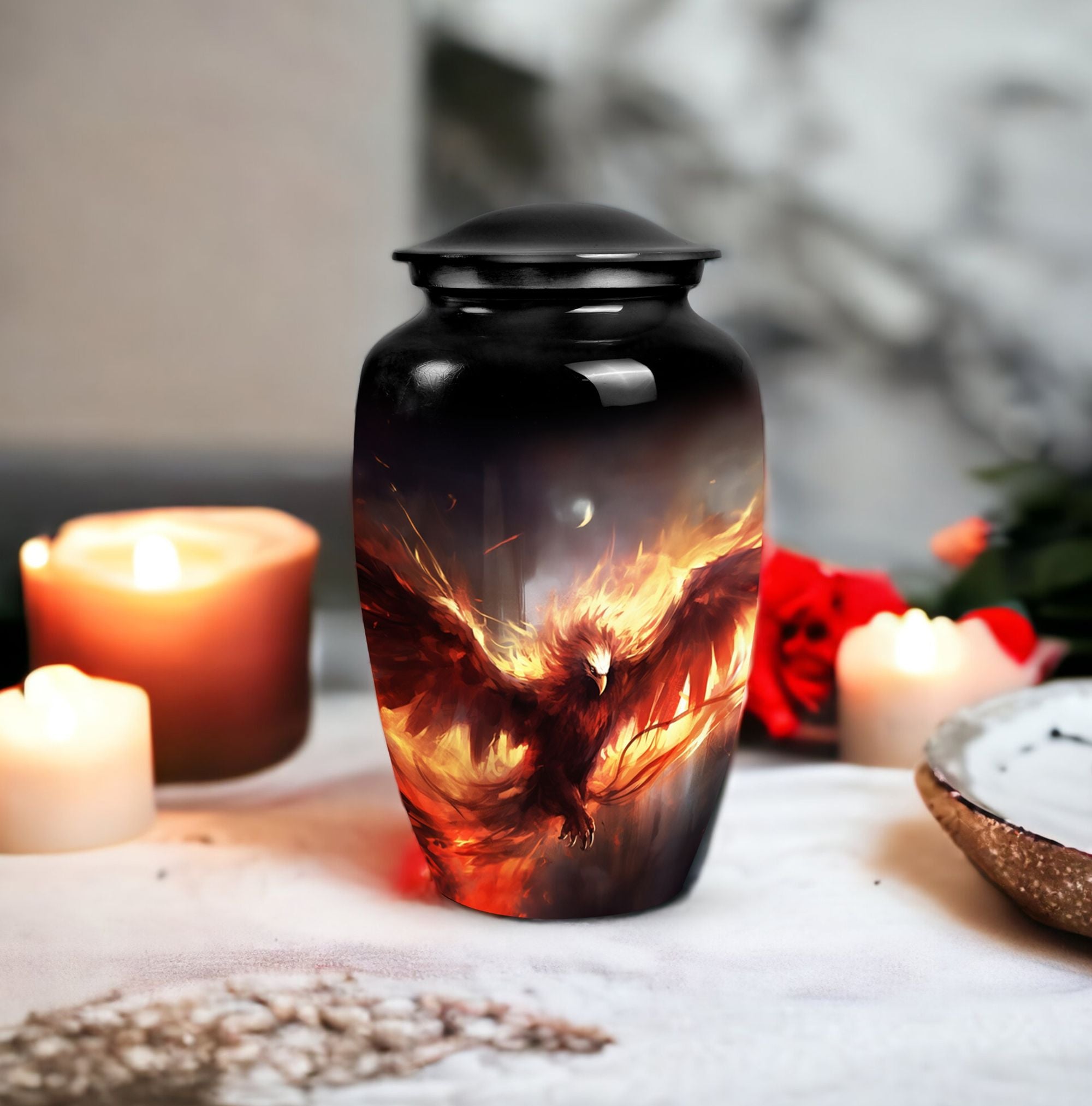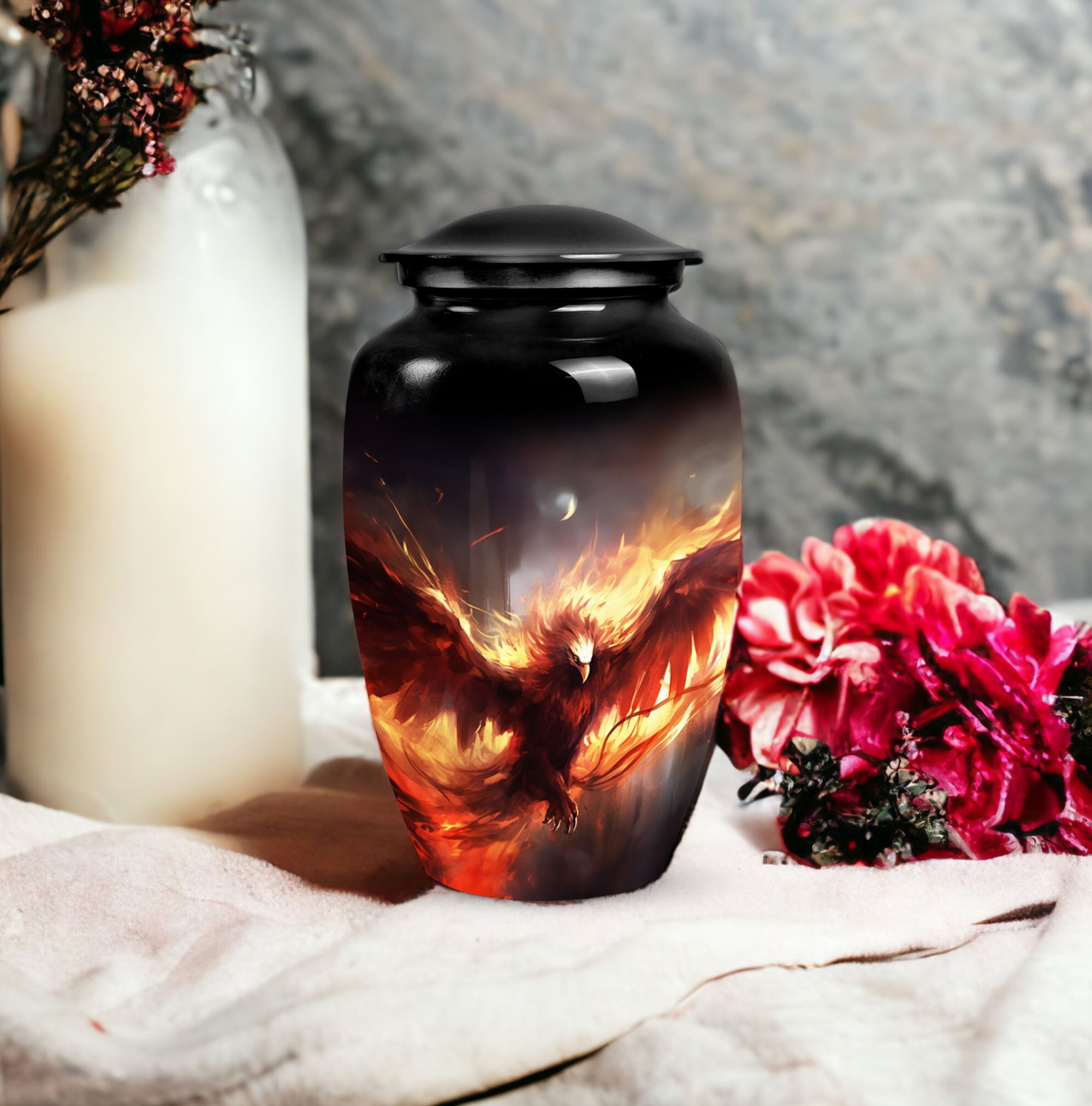 Honor the memory of your loved ones with the Red Phoenix Cremation Urn, an exquisite choice suitable for stowing away cremation ashes. Crafted from robust aluminium, this Large Urn weighs a mere 3.3 pounds and stands at an impressive 10 inches in height, facilitating a capacity of 200 cubic inches. The absence of any overly complex designs allows the innate refinement of the Classic Urn to come to the forefront, turning it into a thoughtful focal point. Alongside the Urn, the package contains a velvet pouch intended for the safekeeping of the remains. Experience a degree of personalization like no other with the possibility to engrave names on it. This product is an excellent pick not just as a unique urn for dad or urn for ashes for mom, but it also qualifies as an elegant decorative urn for human ashes. Remarkably, this urn resonates with a balance of mass appeal and unparalleled individuality. Invest in this sublime piece of art as a tribute to those who were dear to you.