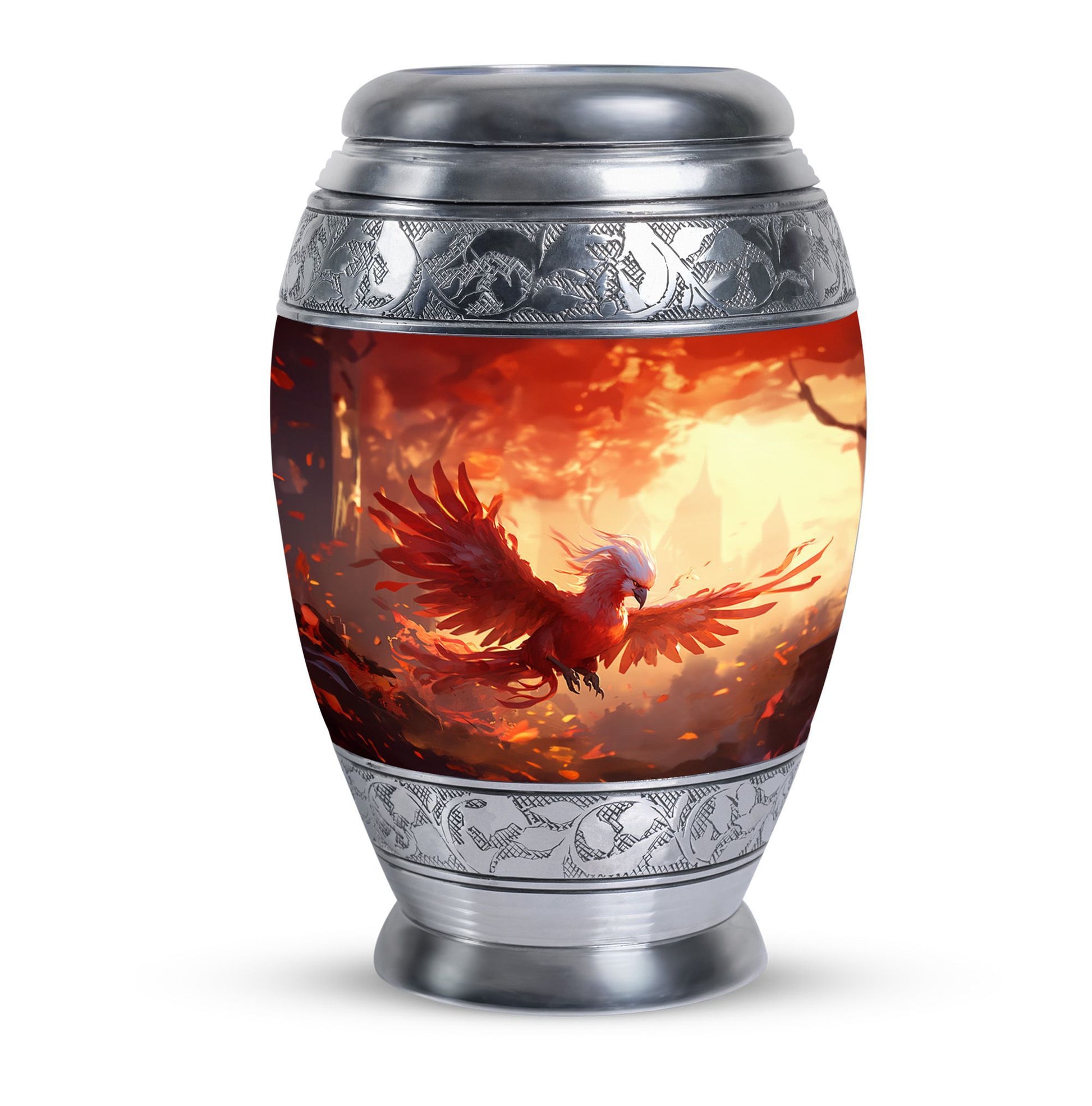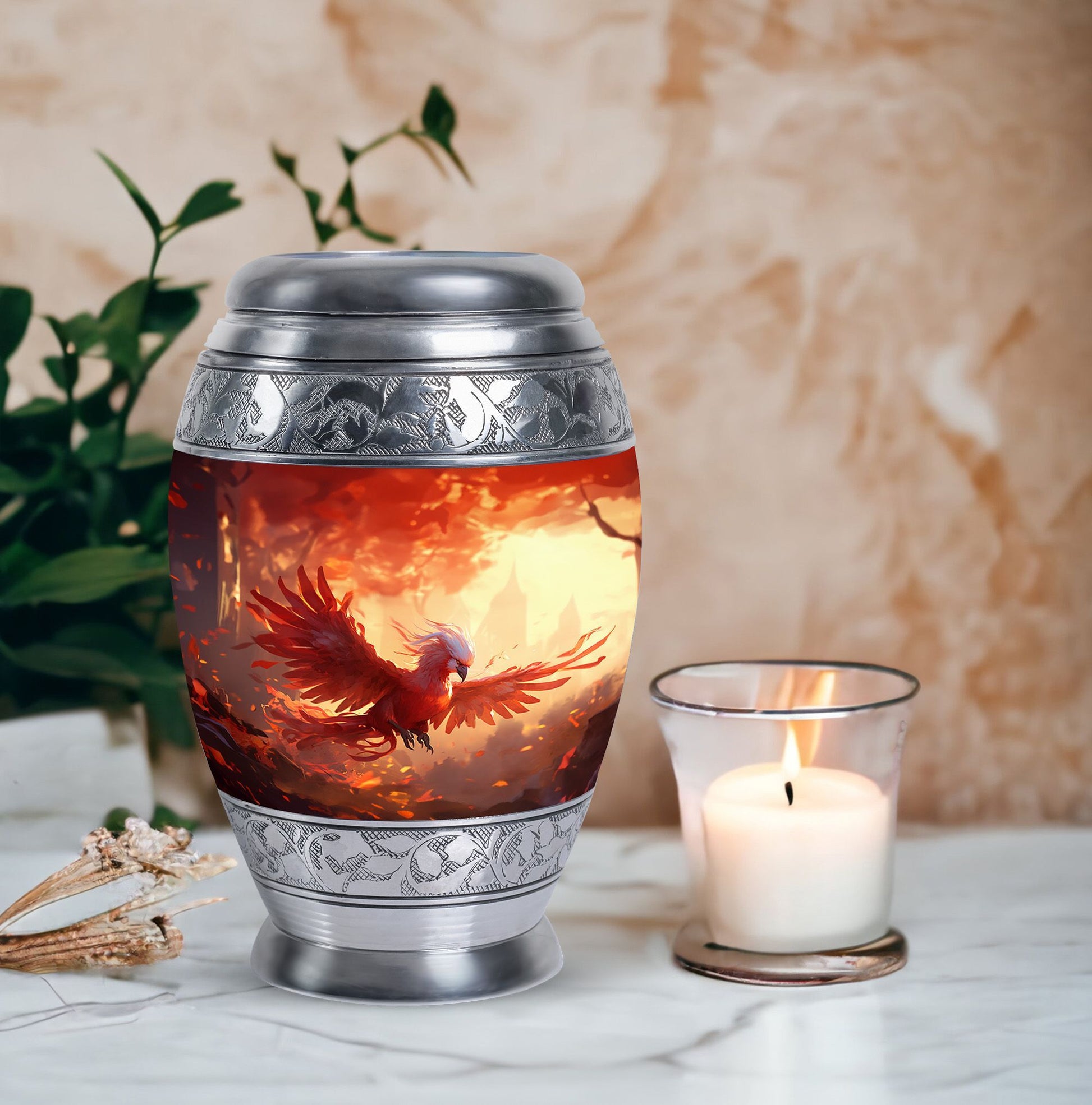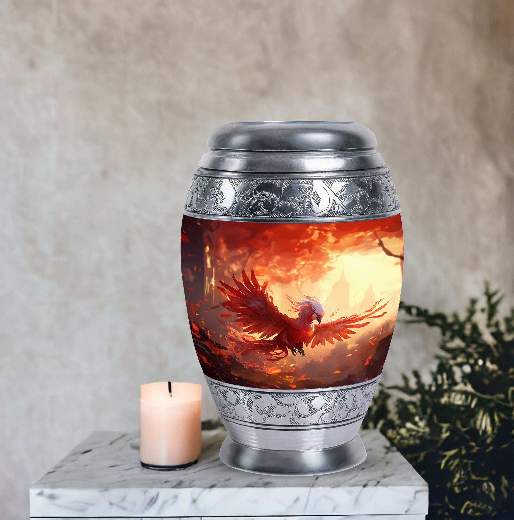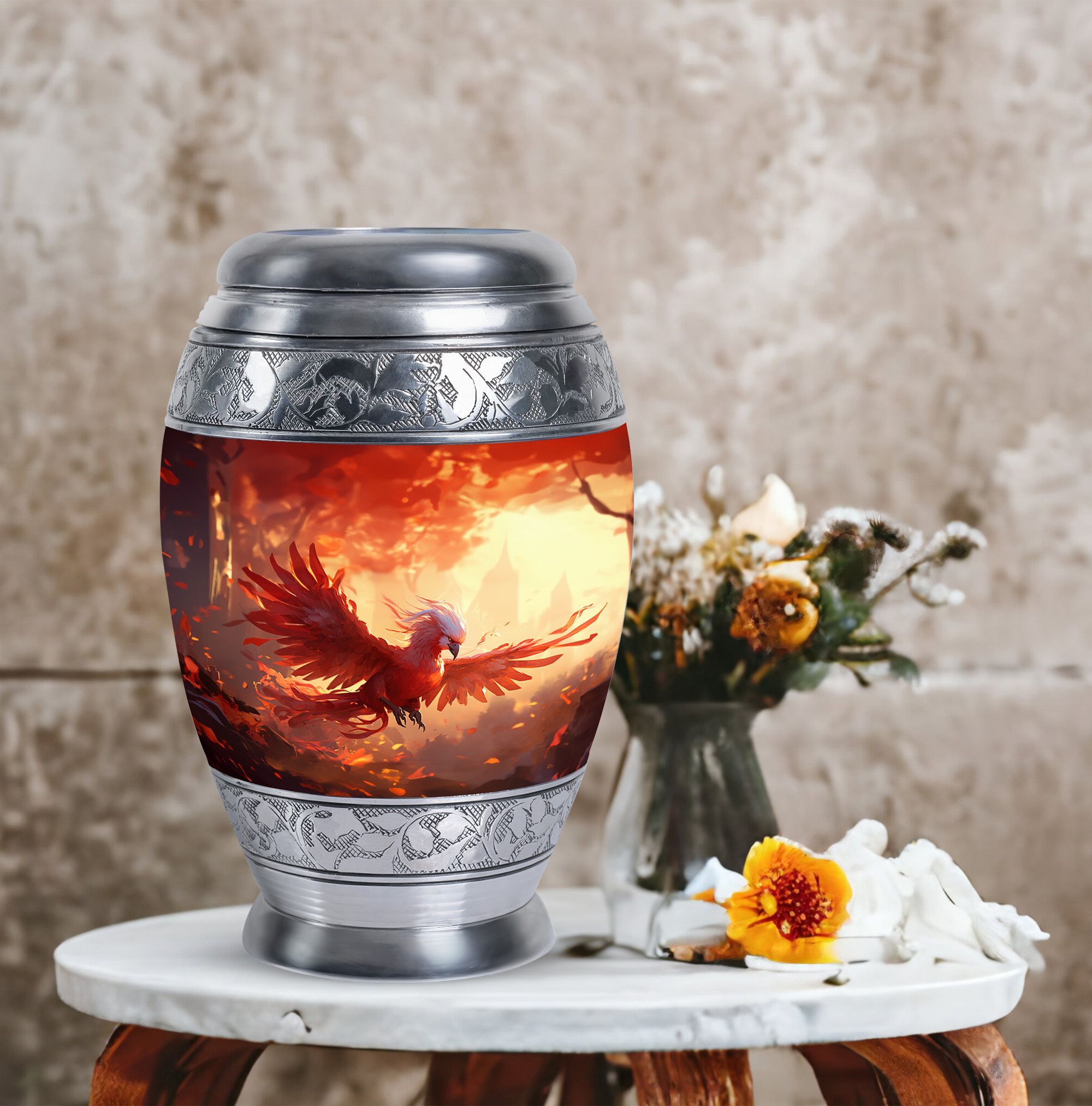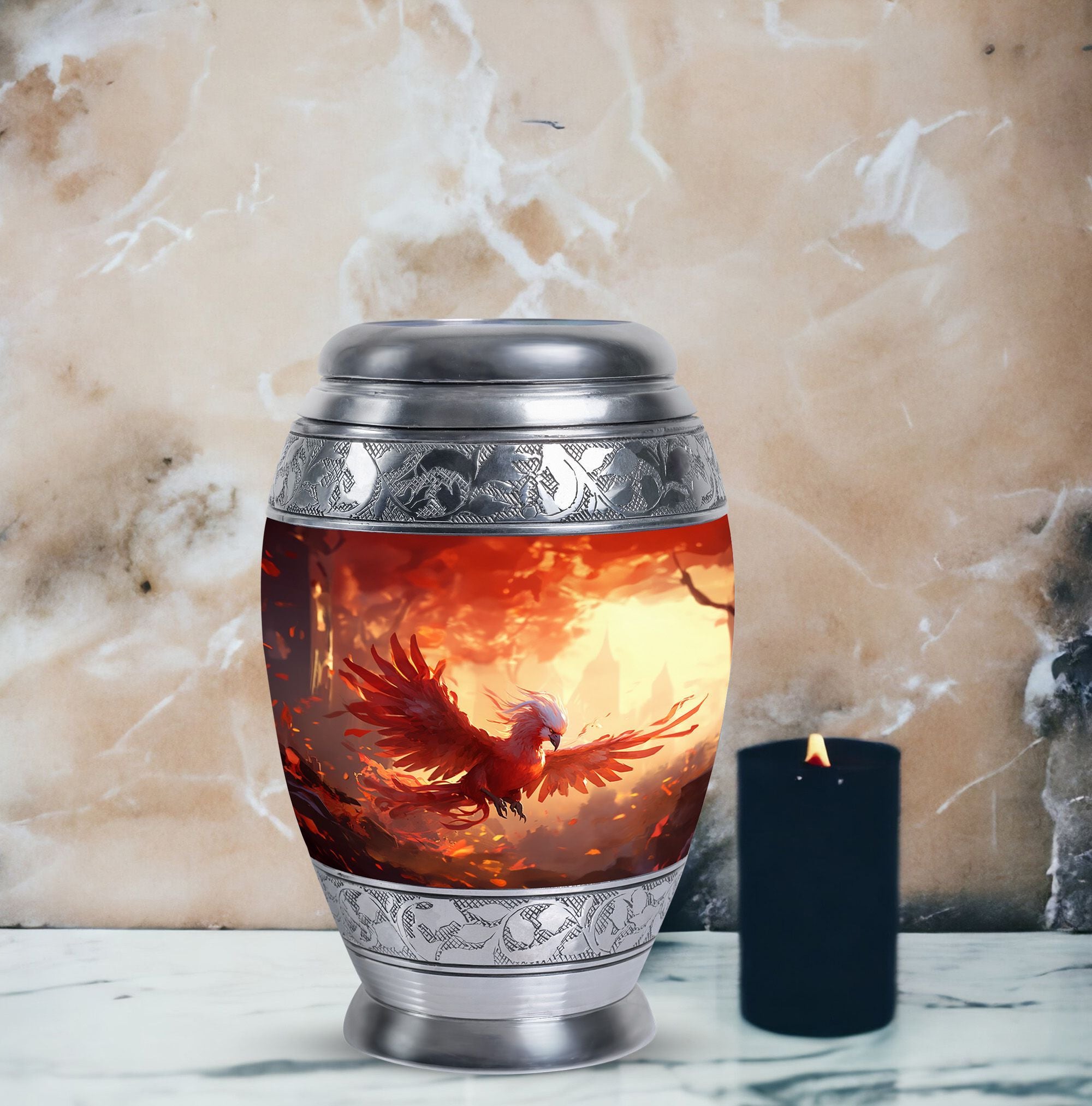 Honor your loved ones with our Red Phoenix Urns for Human Ashes, a perfect emblem of eternal respect and love. Constructed with premium aluminum, these Large Urns boast a timeless and classic urn design, which effortlessly makes an elegant statement. With a capacity of 200 cubic inches, it serves as a fitting memorial for your cherished one's final disposition. It weighs 3.3 pounds and stands at 10 inches in height, making it a prominent keepsake to symbolize your undying affections. The urns come with a velvet pouch for containment of ashes, ensuring a respectful repose for your beloved. You can further personalize these Metal Urns with engraved names, creating a unique tribute that truly resonates with your sentiments. Whether you are looking for Urns for Dad, Cremation Urns for Burial, Decorative Urns for Human Ashes, or a Modern Urn, this commemorative piece merges tradition and contemporary aesthetic in one. Note: the urn’s size measures at 3 inches. Honor their memory in a meaningful way, because their legacy deserves nothing less.