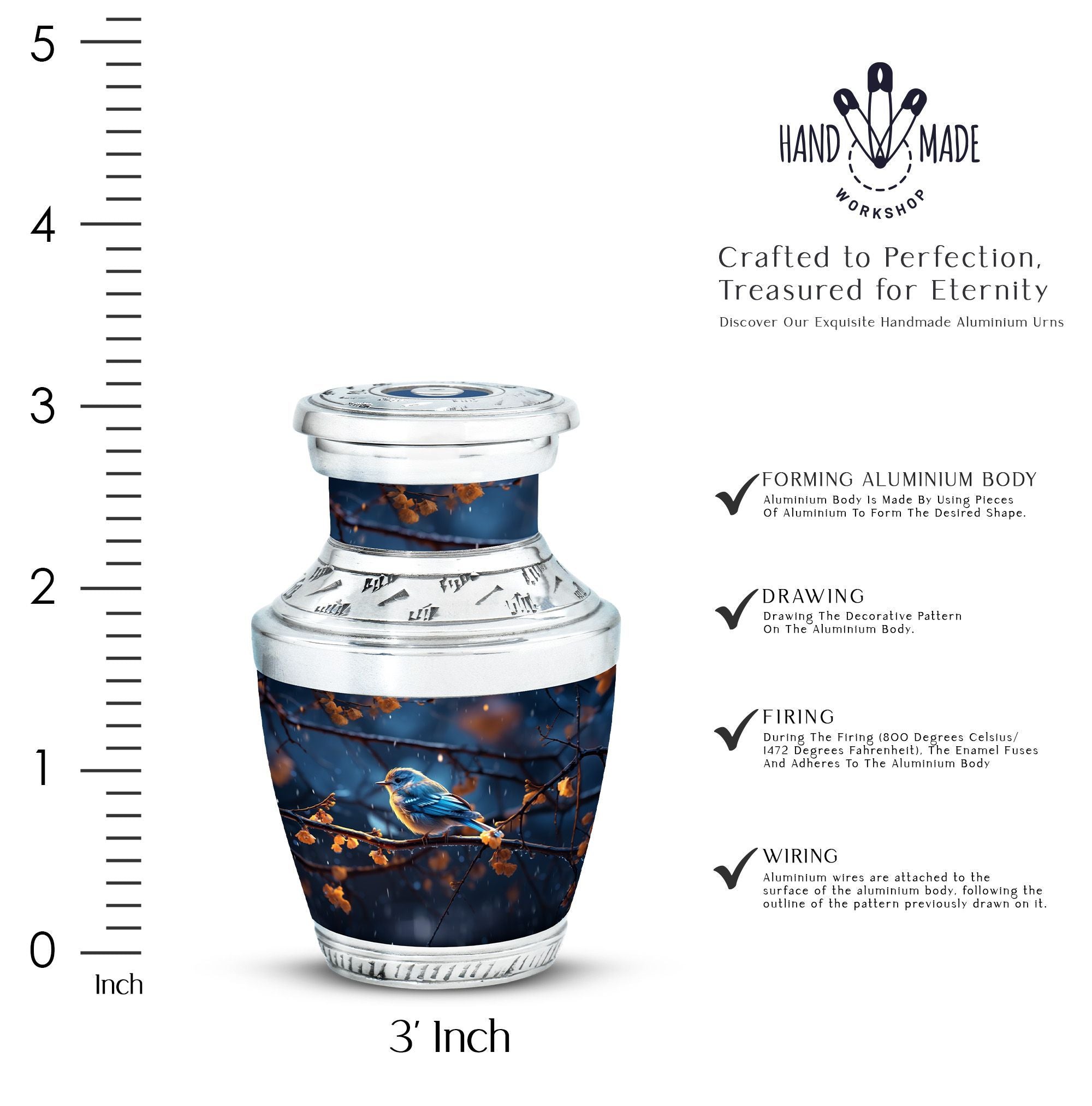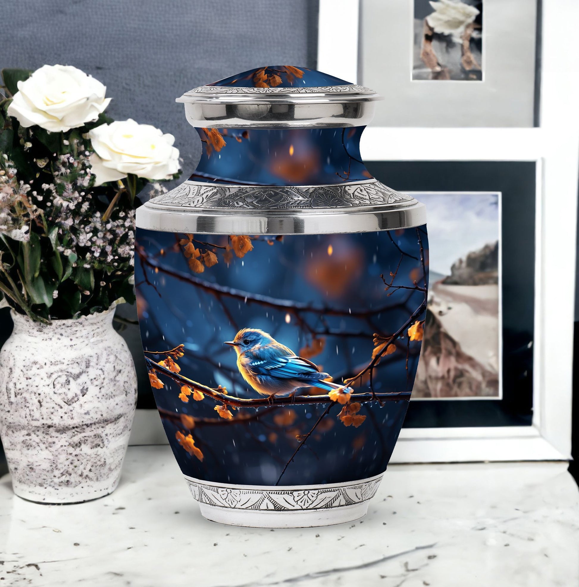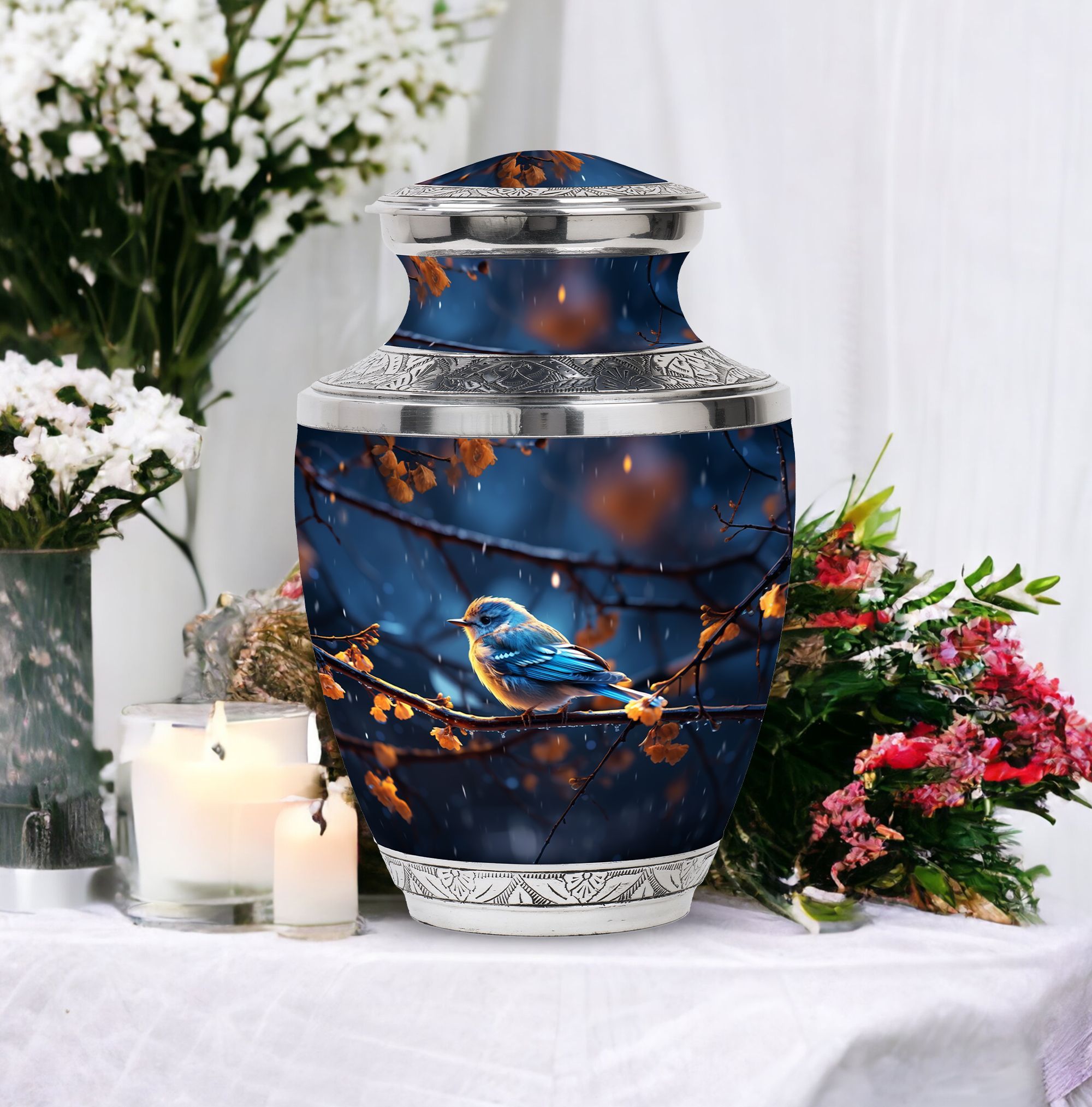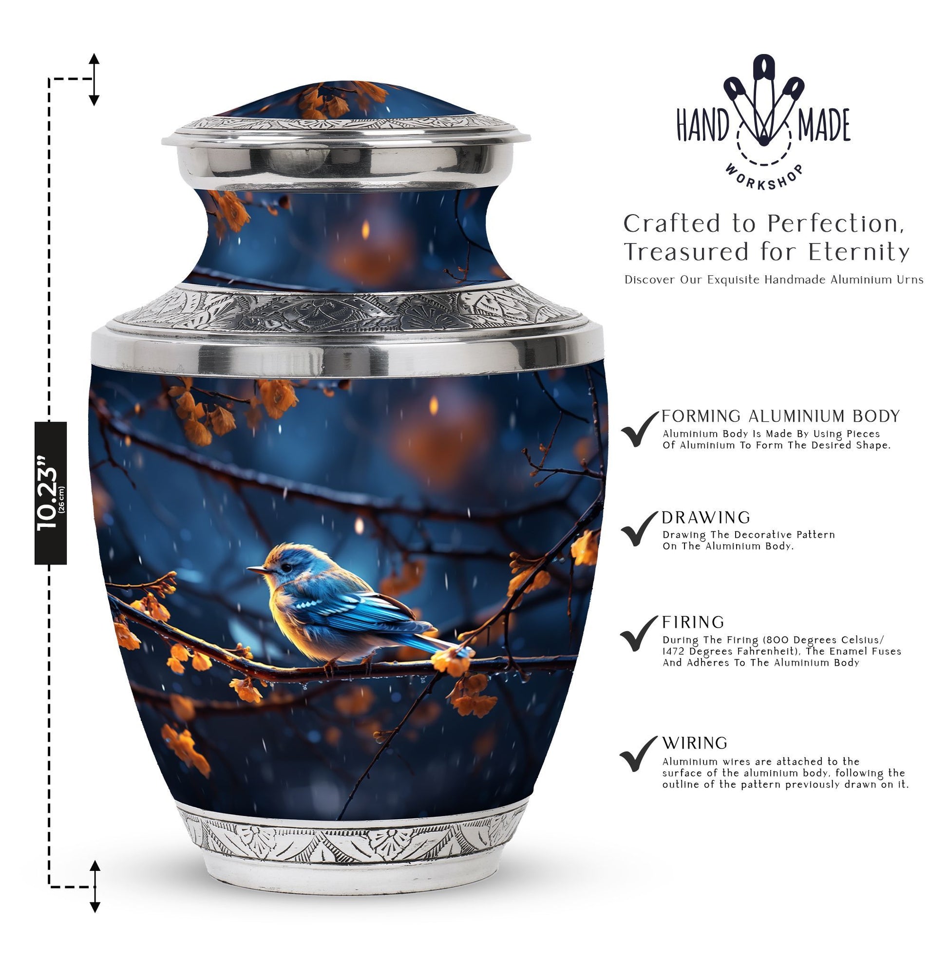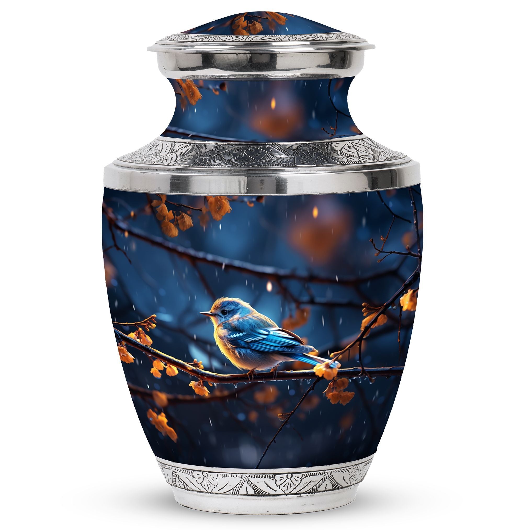 Honor the memory of your dearly departed with this heartfelt Red Sparrow Urn for Human Ashes. Standing at 10 inches in height and with a capacity of up to 200 cubic inches, this large urn is both functional and aesthetically elegant. Expertly crafted from high-quality aluminium, the urn weighs a sturdy 3.3 pounds - a standing symbol of lasting remembrance. Embracing modernity and tradition, it delivers a new perspective on memorial urns. This unique container comes complete with an accompanying velvet pouch for careful containment of ashes. Personalize the urn with engraved names, to add an intimate and thoughtful touch. Being 3 inches in size, it perfectly combines simplicity and profundity. This remarkable urn is more than a container, it's a beautiful tribute that commemorates life and respect. Cherish your loved one's memory with this stunning aluminium urn.