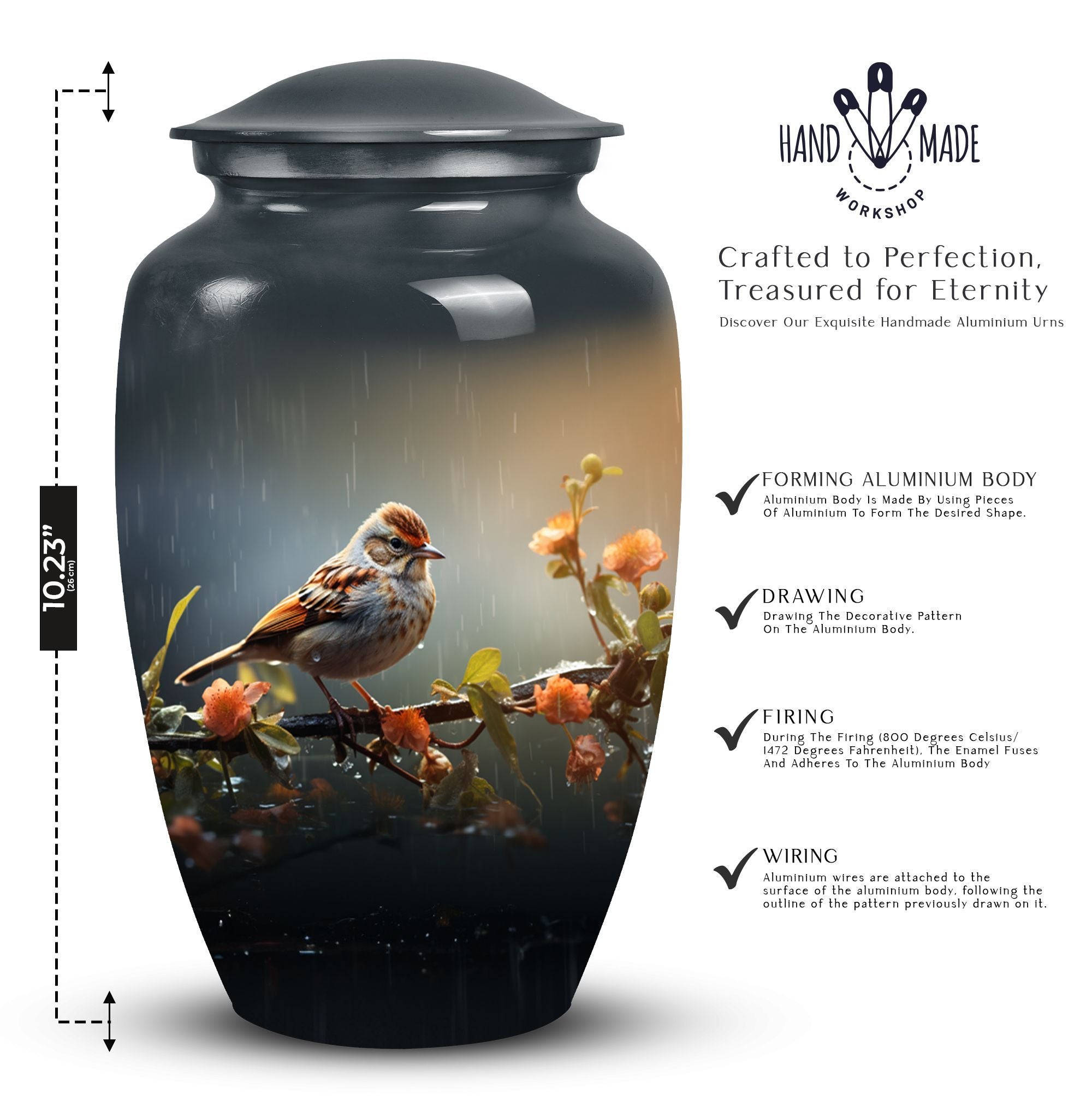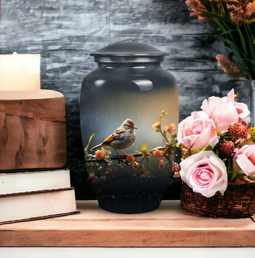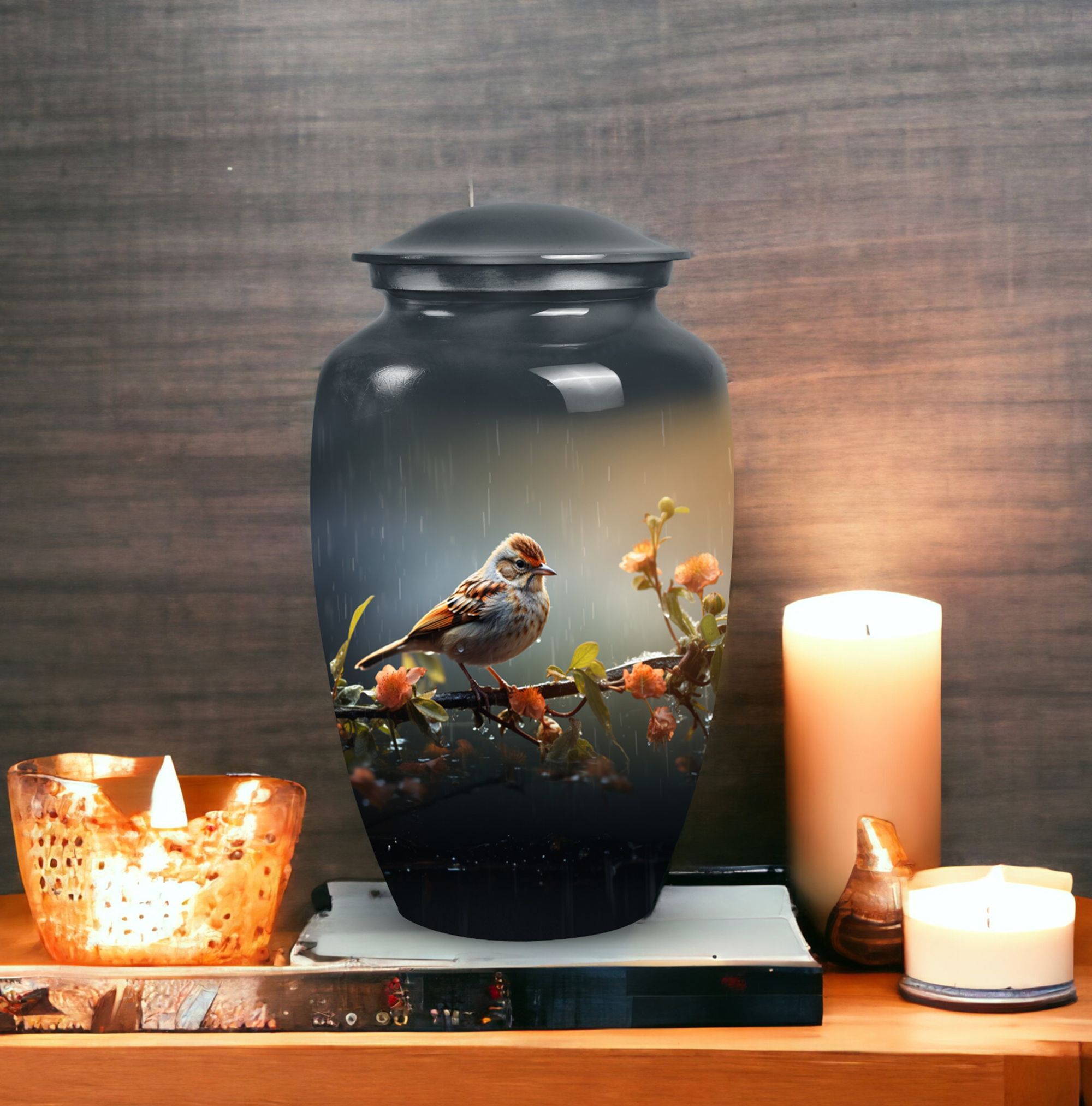 Honor the cherished memory of your departed loved one with our Red Sparrow Urns for Ashes. Crafted from robust aluminium, these large urns boast not just longevity but also a distinct aesthetic appeal, making them a revered choice amongst memorial urns. Standing tall at 10 inches with a hearty weight of 3.3 pounds, they encompass a generous capacity of 200 cubic inches, ensuring ample room for containment. The urn is accompanied by a soft velvet pouch, adding an extra layer of preservation for the sacred ashes. What sets our urns apart is their room for personal touch - you can personalize them with engraved names, making the urn even more special. This 3-inch classic urn does not just act as an ashes holder for cremation, but also as a reminder of the profound love you encapsulate for your beloved, especially if you're seeking urns for mom. With the Red Sparrow Urn, remember, honor, and cherish your loved one's life with dignity and respect.