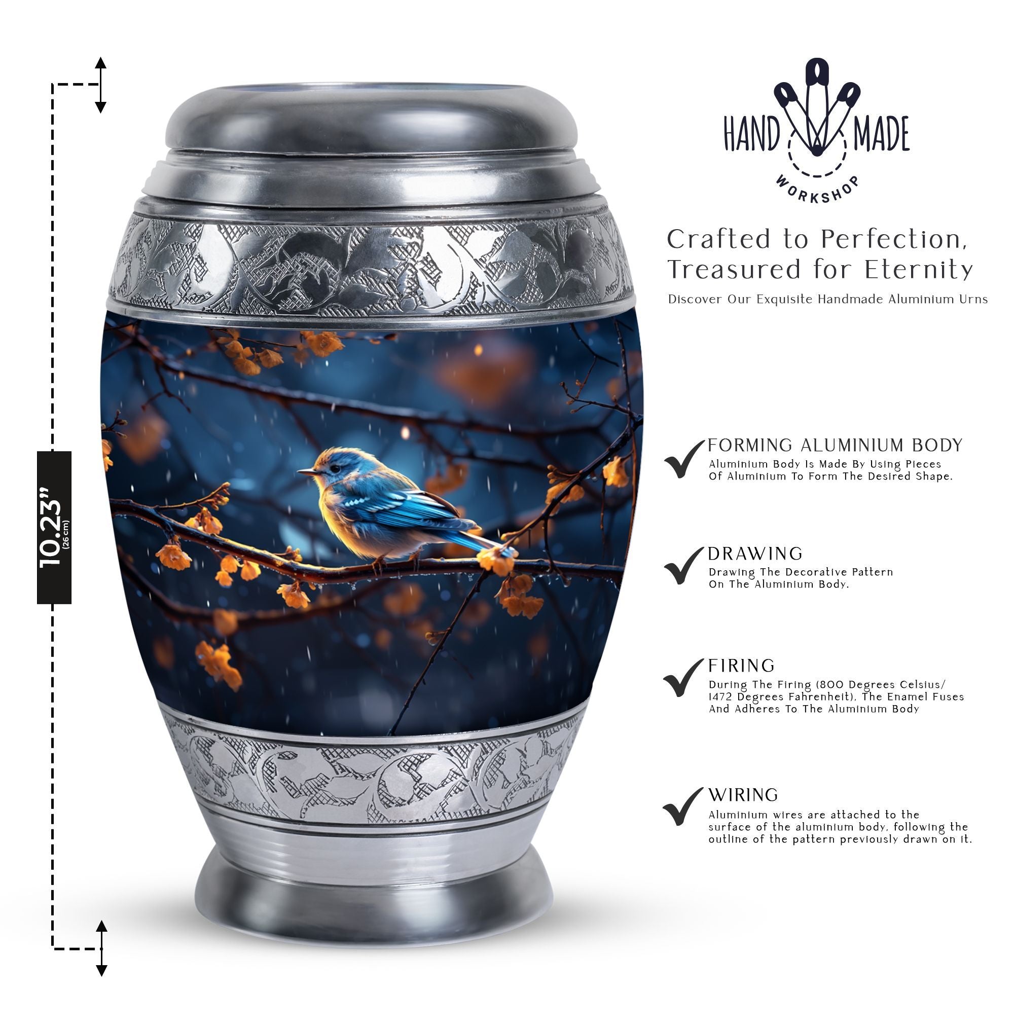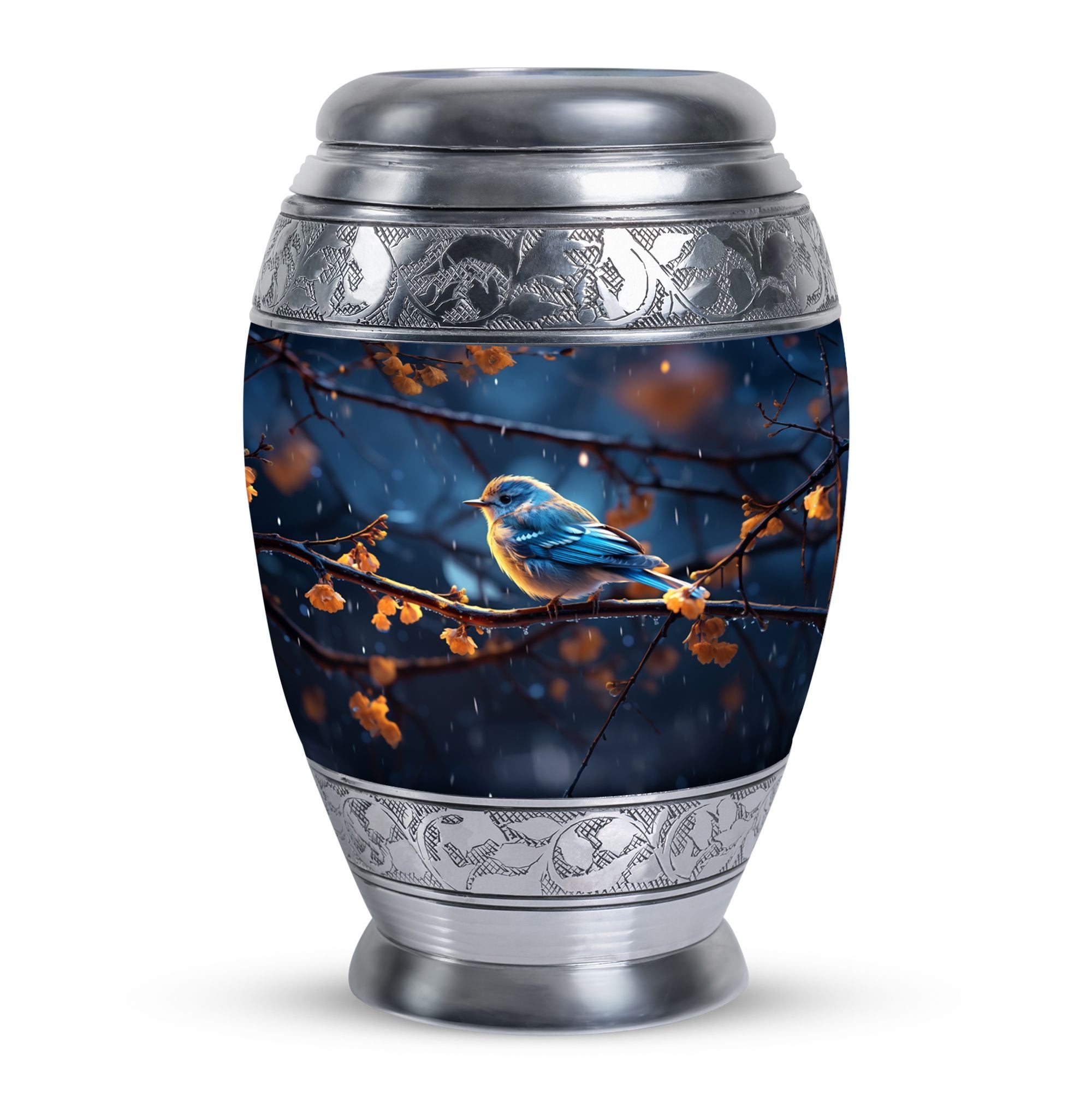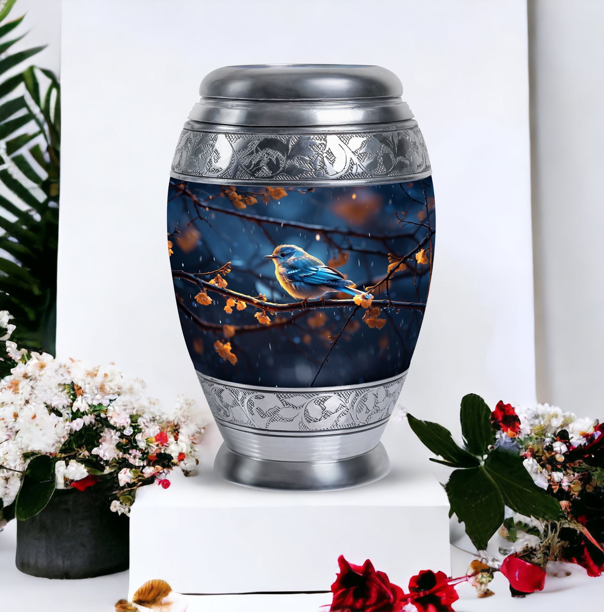Add an elegant yet poignant touch to your remembrance rituals with our Large Aluminium Red Sparrow Urns for Human Ashes. Sized at a compact 3-inch, this memorial urn has an arresting Classic Urn style, renowned for its timeless appeal. Fashioned from robust and long-lasting aluminium, it bears a capacity of 200 cubic inches to securely hold your loved one's remains. With a hefty weight of 3.3 pounds and dimensions reaching up to 10 inches in height, our funeral ashes container is robust and substantial. We understand the need for personalization in memorial rituals; thus, we offer the option to engrave names on this unique piece. The package arrives with a soft velvet pouch, ensuring a dignified containment for the ashes. A seamless blend of modern urn styles with traditional sensibilities, this product is designed keeping in mind popular search keywords like 'Custom Cremation Urns' and 'Metal Urns for Human Ashes'. Remember your loved ones with respect and serenity with this intricate piece.