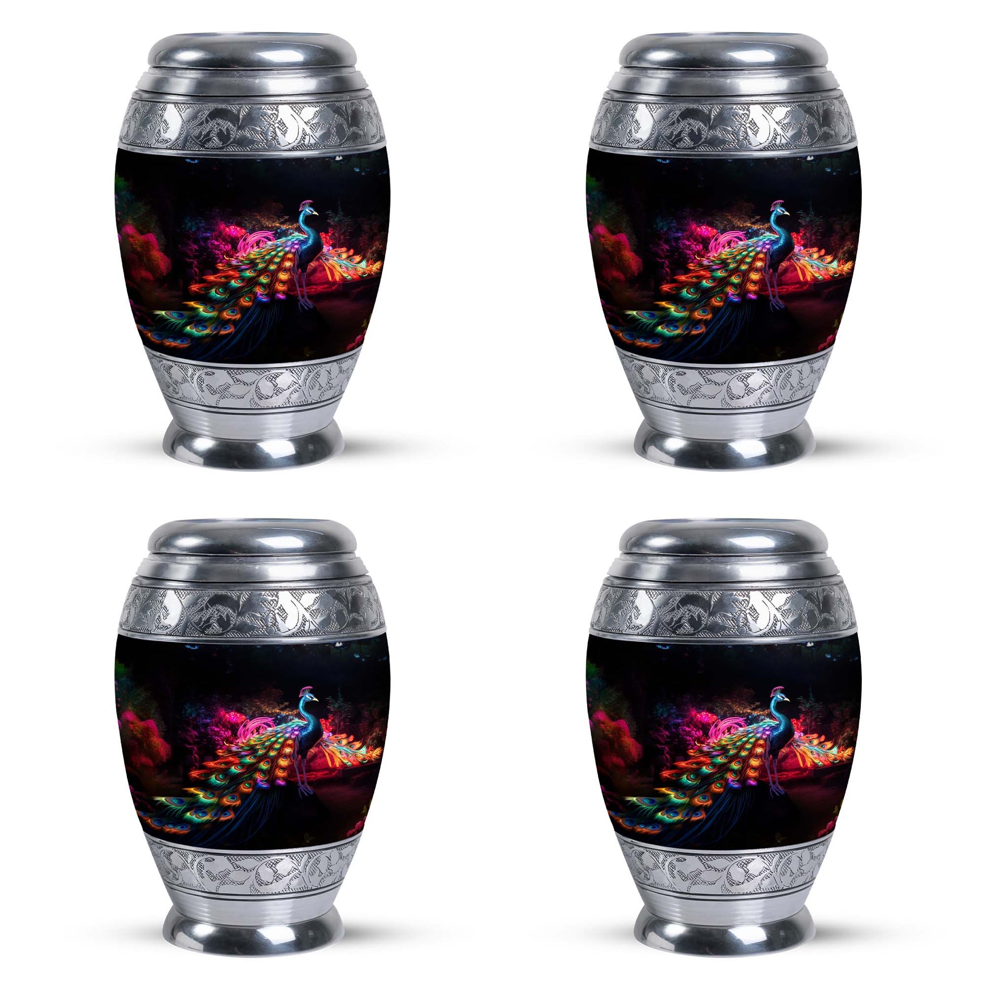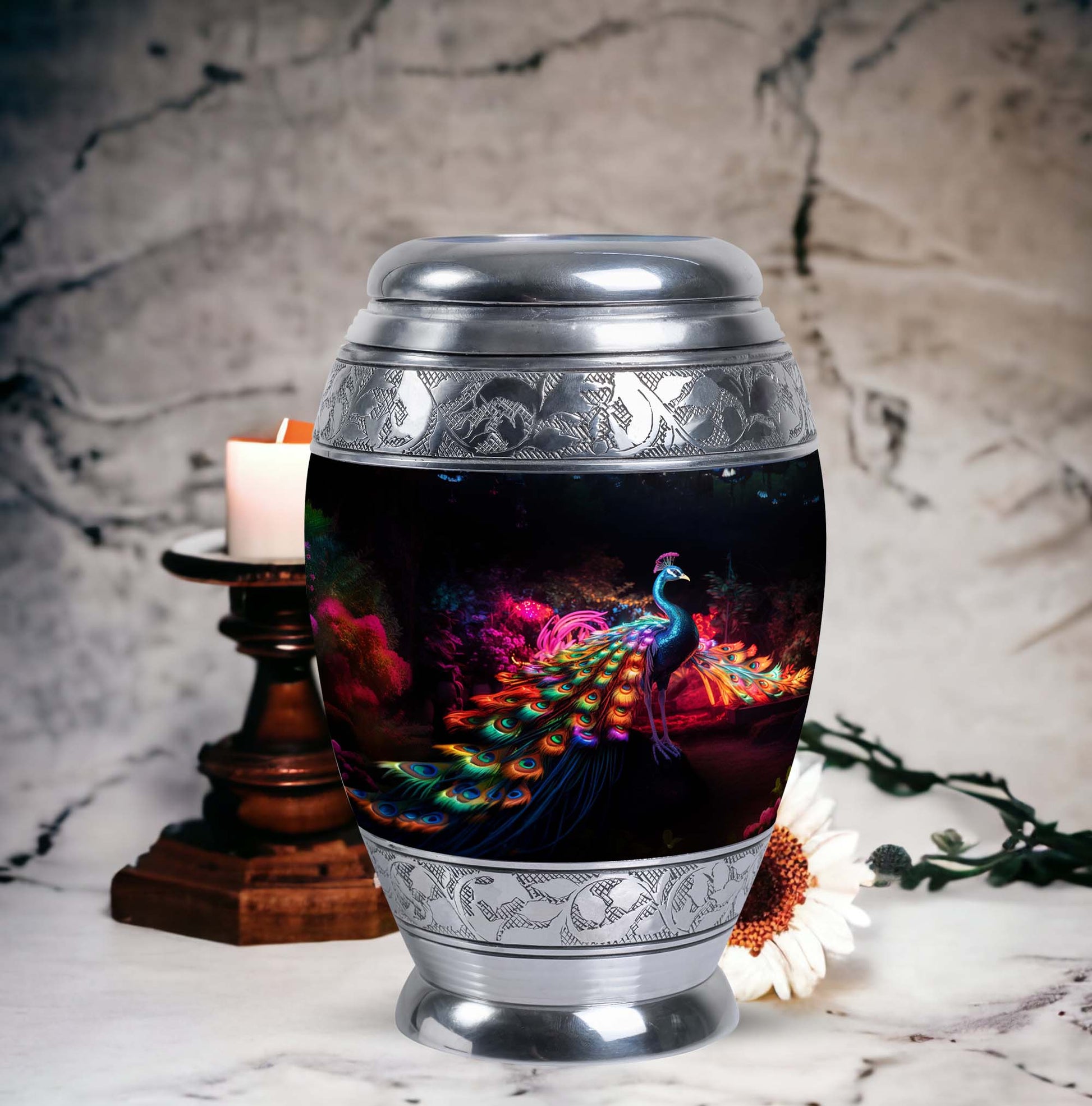 Engage with the traditional elegance and sophistication embodied in the Peacock Cremation Urn, a symbolic resting place for your loved ones. A masterpiece carefully crafted from robust Aluminium, it stands tall at 10 inches with a dignified weight of 3.3 pounds. This piece captures the essence of memorial ceremony supplies, devotedly housing a substantial capacity of 200 cubic inches – fitting for urns for ashes for adults or burial urns for adults. Each Large Urn provides a tangible remembrance, supported by a feature to personalize with engraved names, making it a heartfelt tribute to your departed. The urn offers a secure seal, further complemented by a velvet pouch for dignified containment of ashes. If you're looking for an urn container or urns specifically for dad, this classic urn embraces enduring serenity.