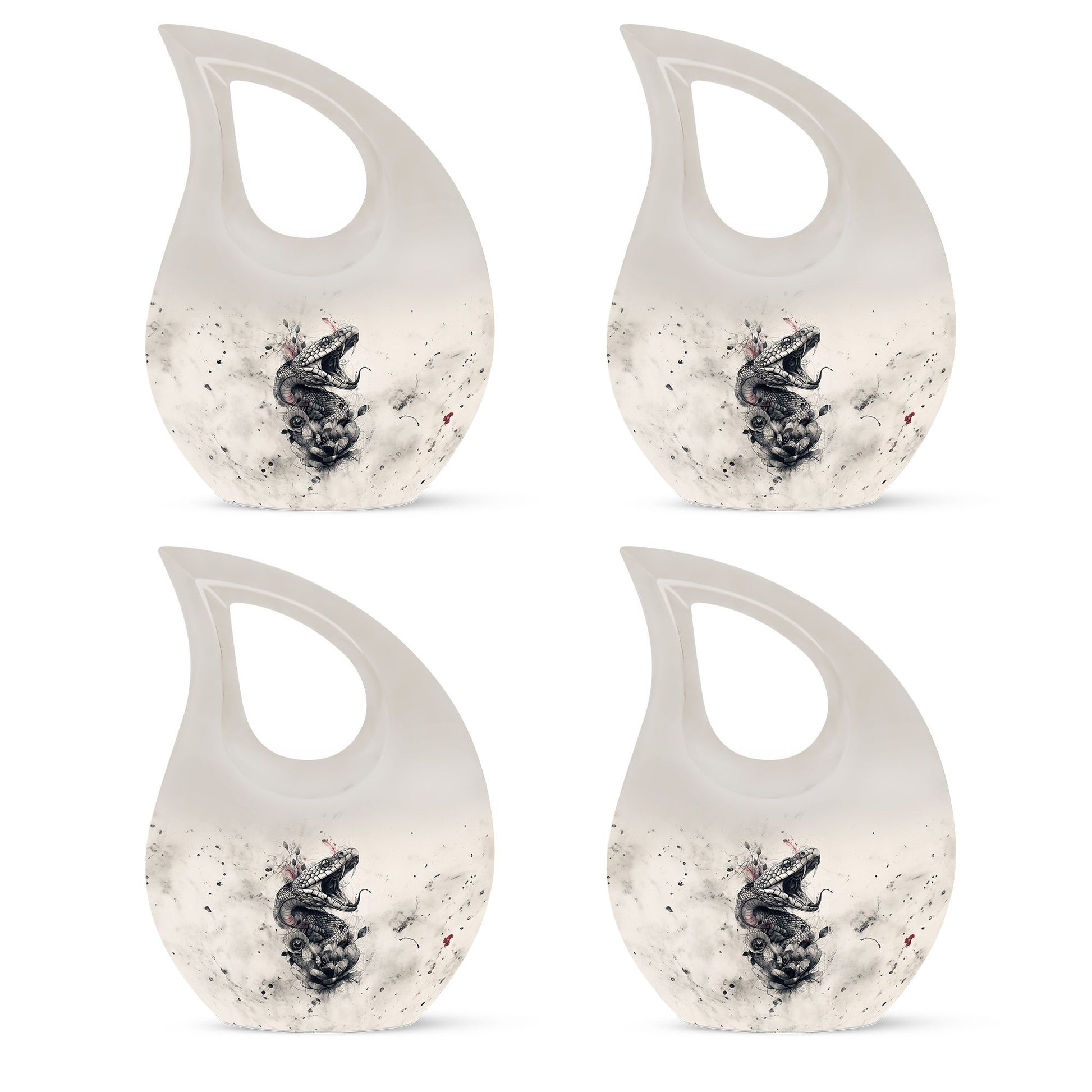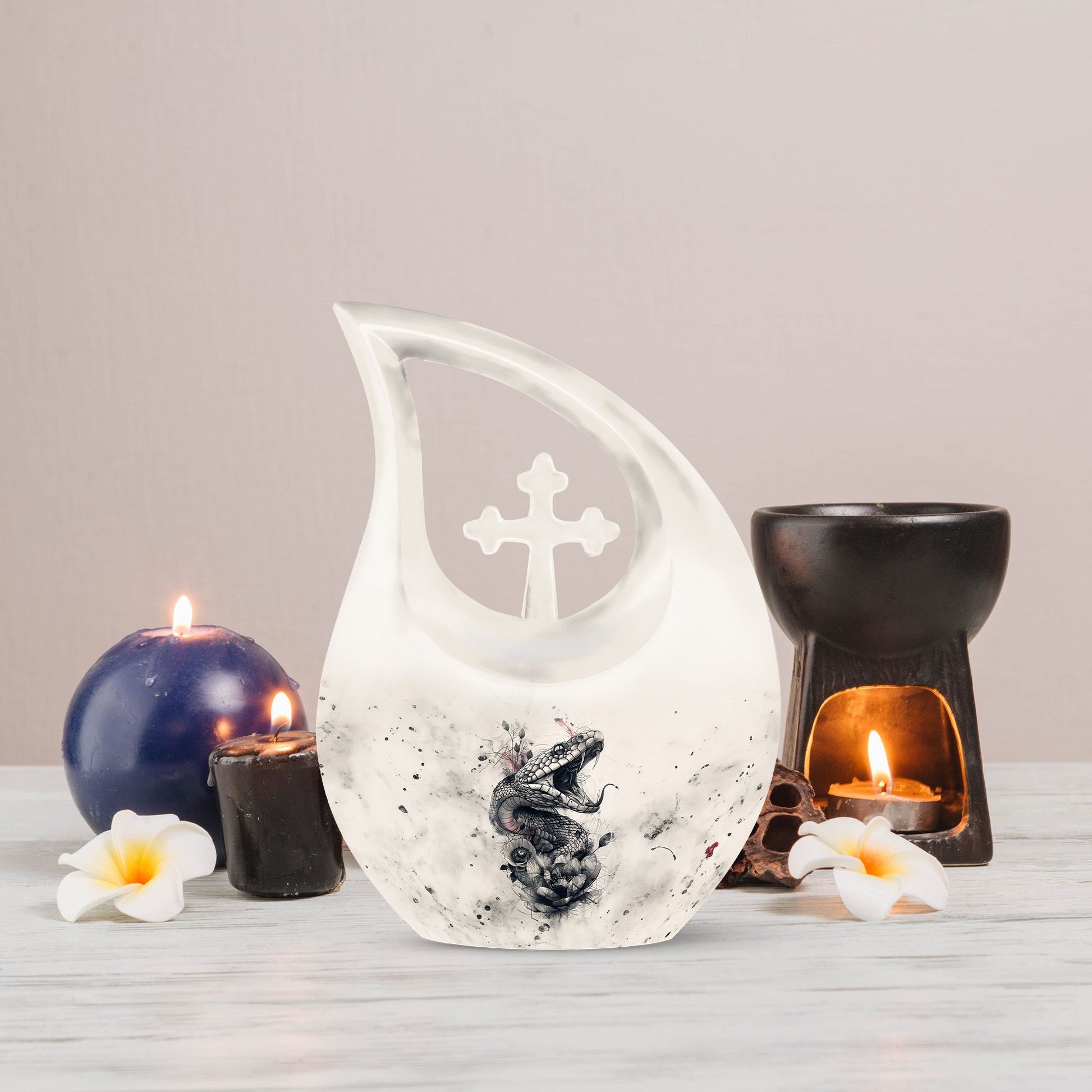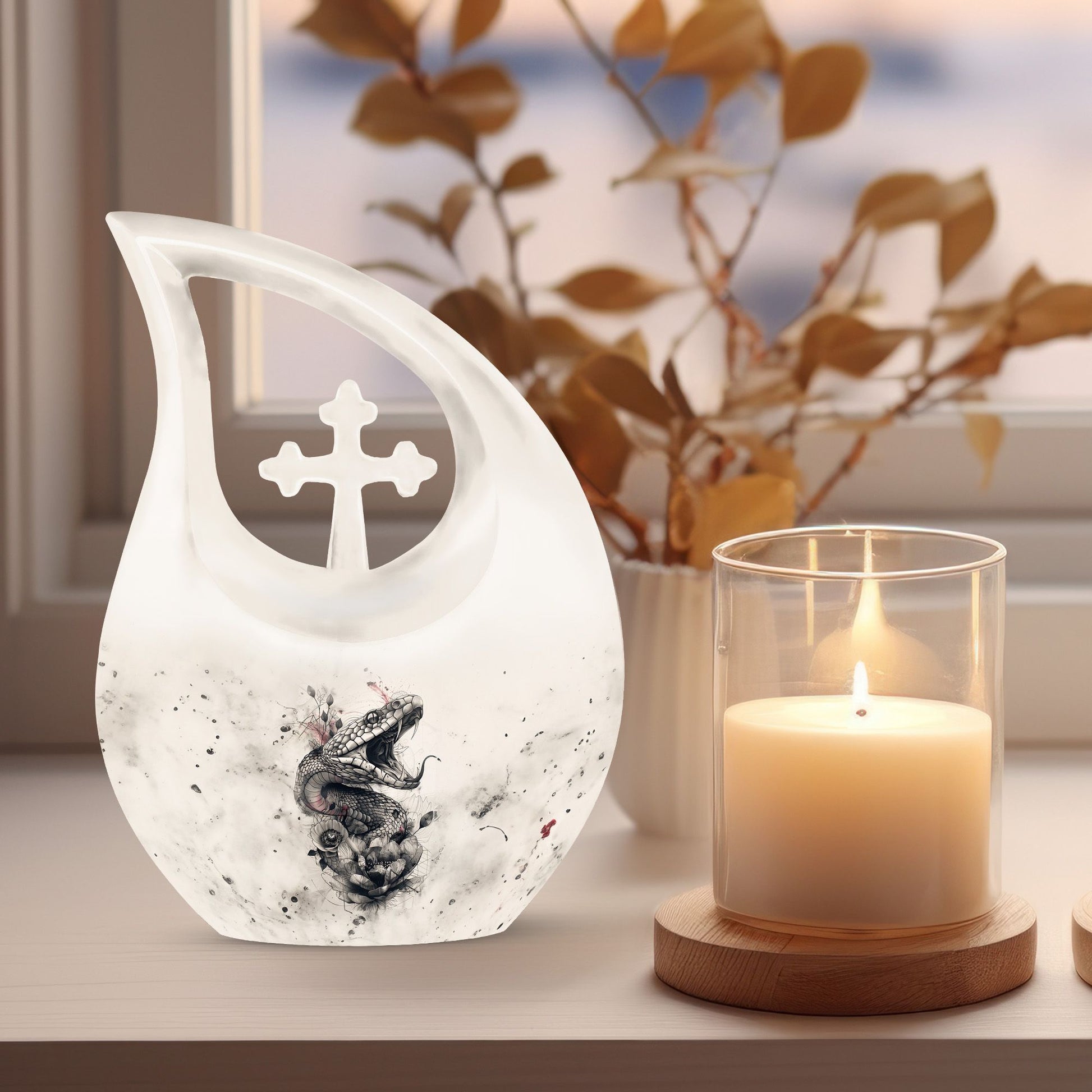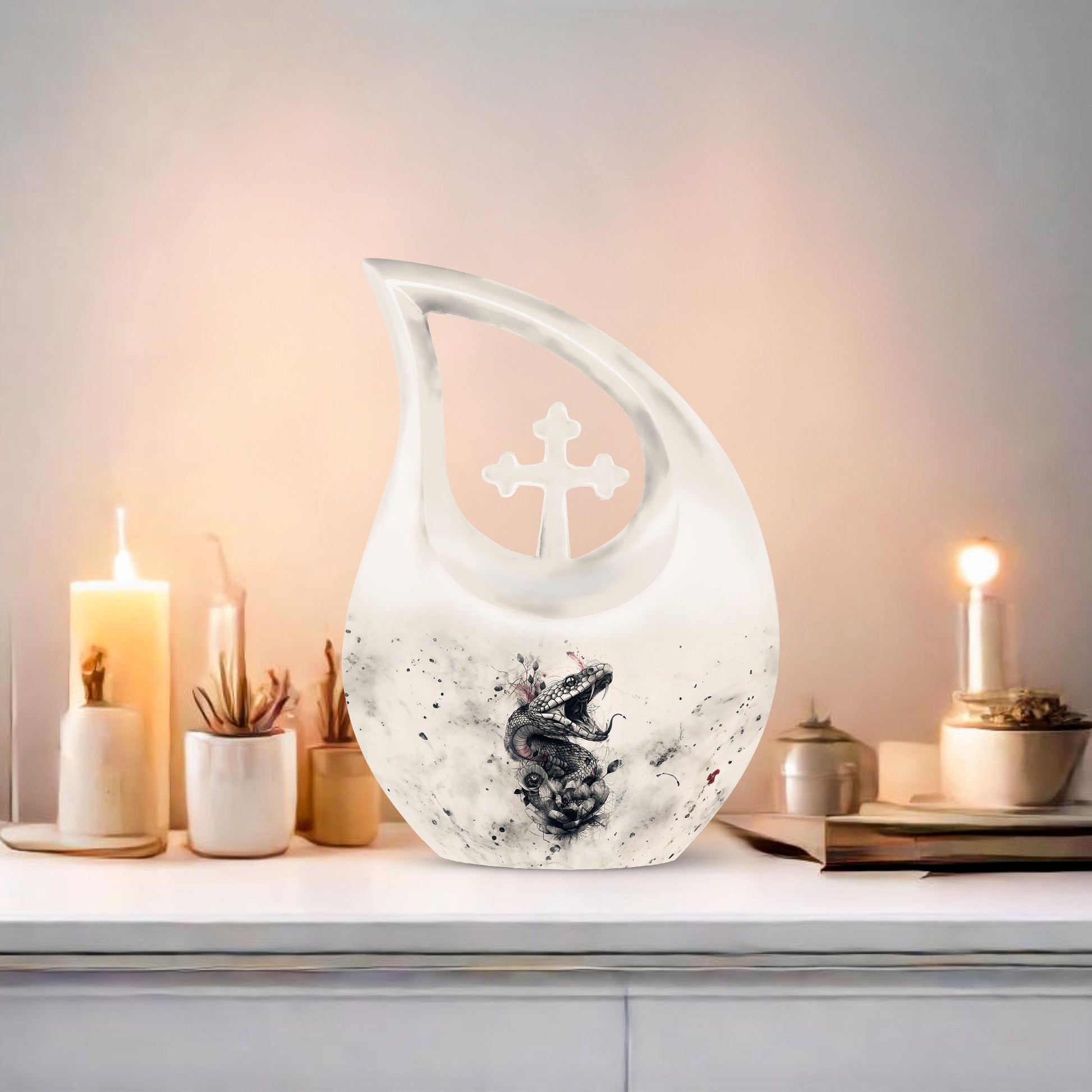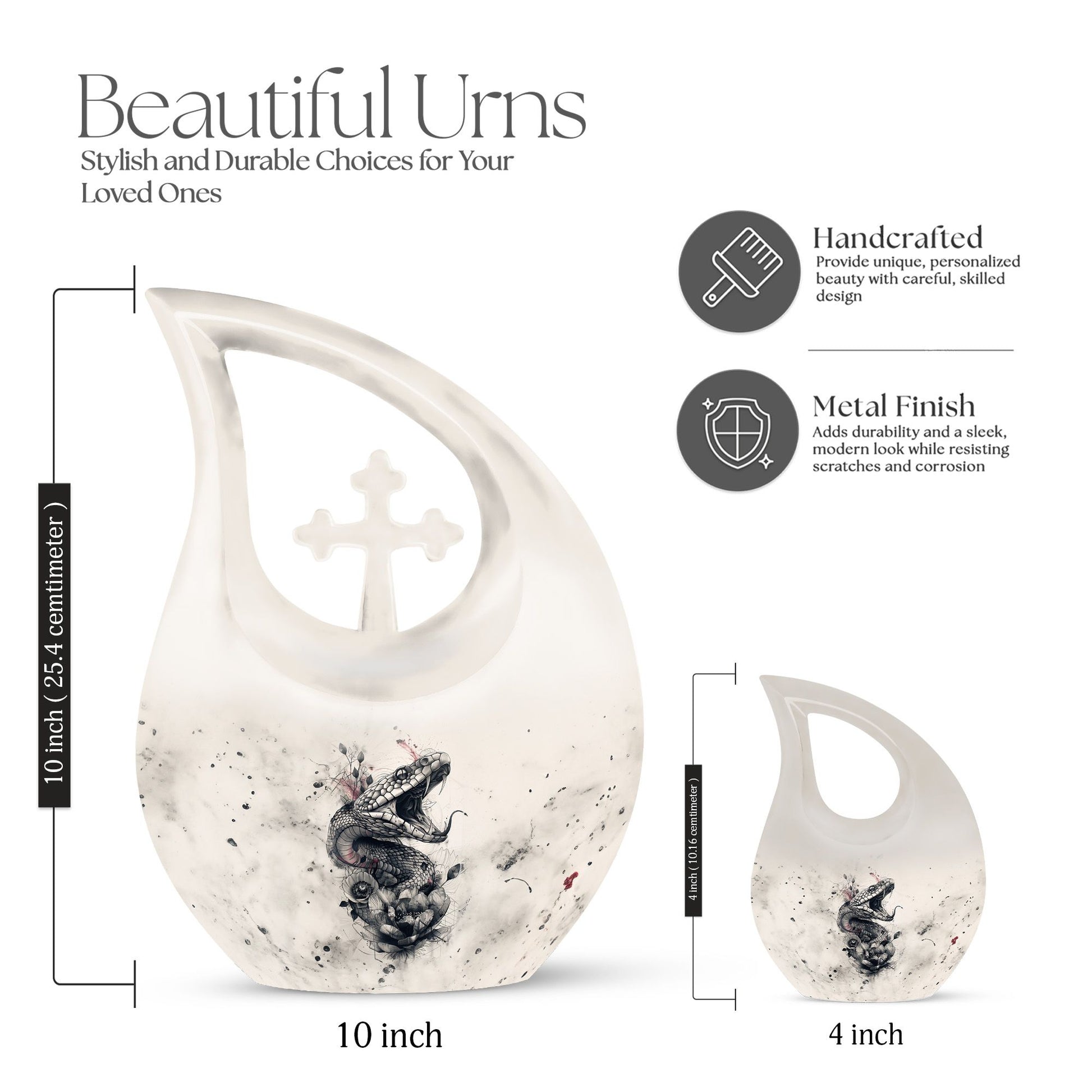 Immerse yourself in memories and honour those you hold dear with our 10-inch Snake Urn, a substantial yet soothing adornment for your commemoration or reflection space. With an intricate Cross Drop motif, this large urn delivers an emotional depth as profound as its 200 cubic inch capacity. Carefully crafted from durable Aluminium, it weighs a comforting 3.3 pounds, embodying gravitas and longevity. Each urn arrives with a soft velvet pouch, lending an added layer of protection and reverence when it comes to containment of ashes. As a unique touch, we offer the option of personalizing your urn with engraved names; turning a remembrance into a distinct memento. An integral part of Memorial Ceremony Supplies, these custom urns are ideal for adults and seniors, rekindling precious moments with every glance. Dive into a sacred journey of remembrance with our snake urn, a symbol of healing, rebirth and eternal love. Forget the ordinary, embrace the extraordinary.