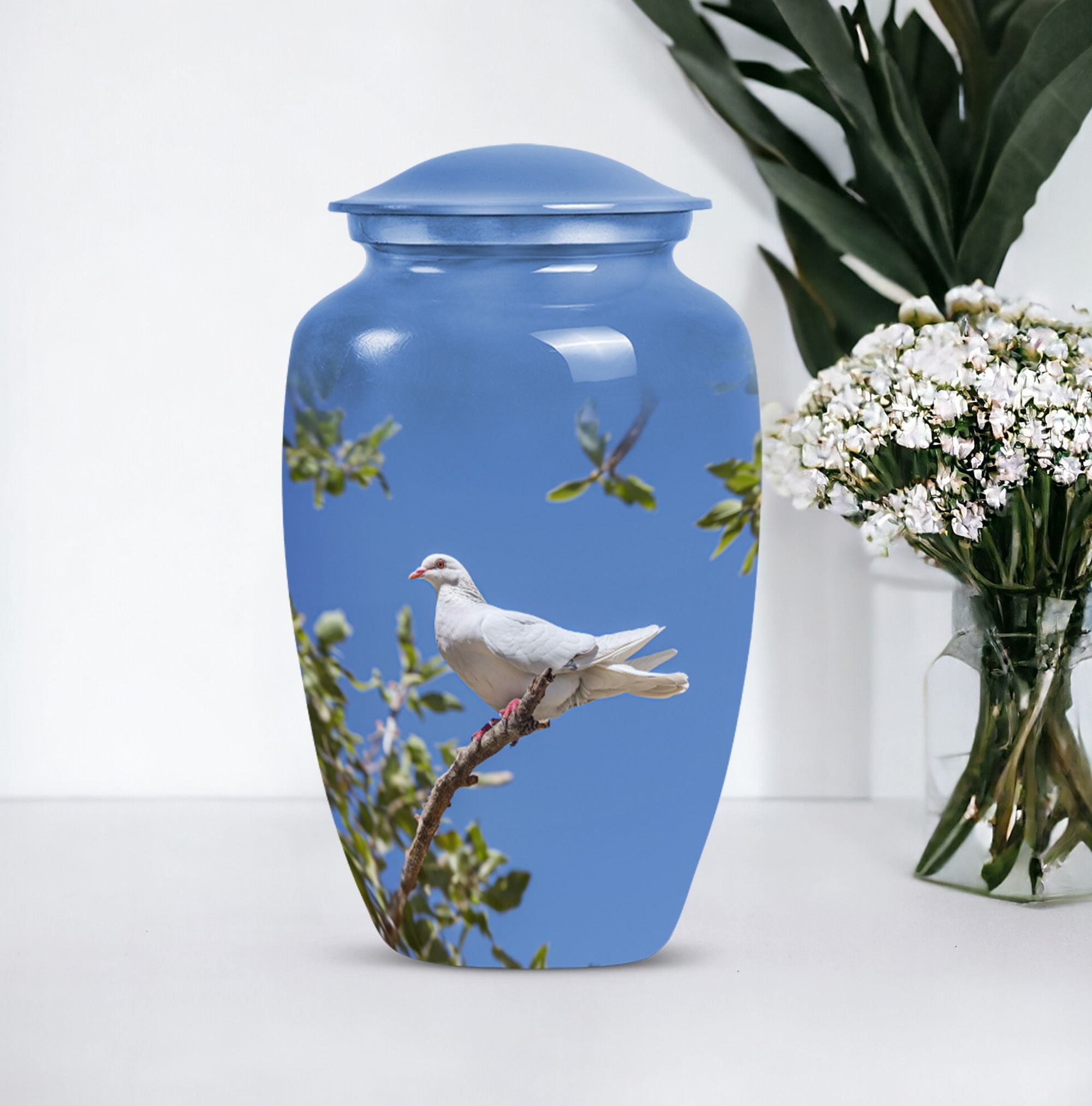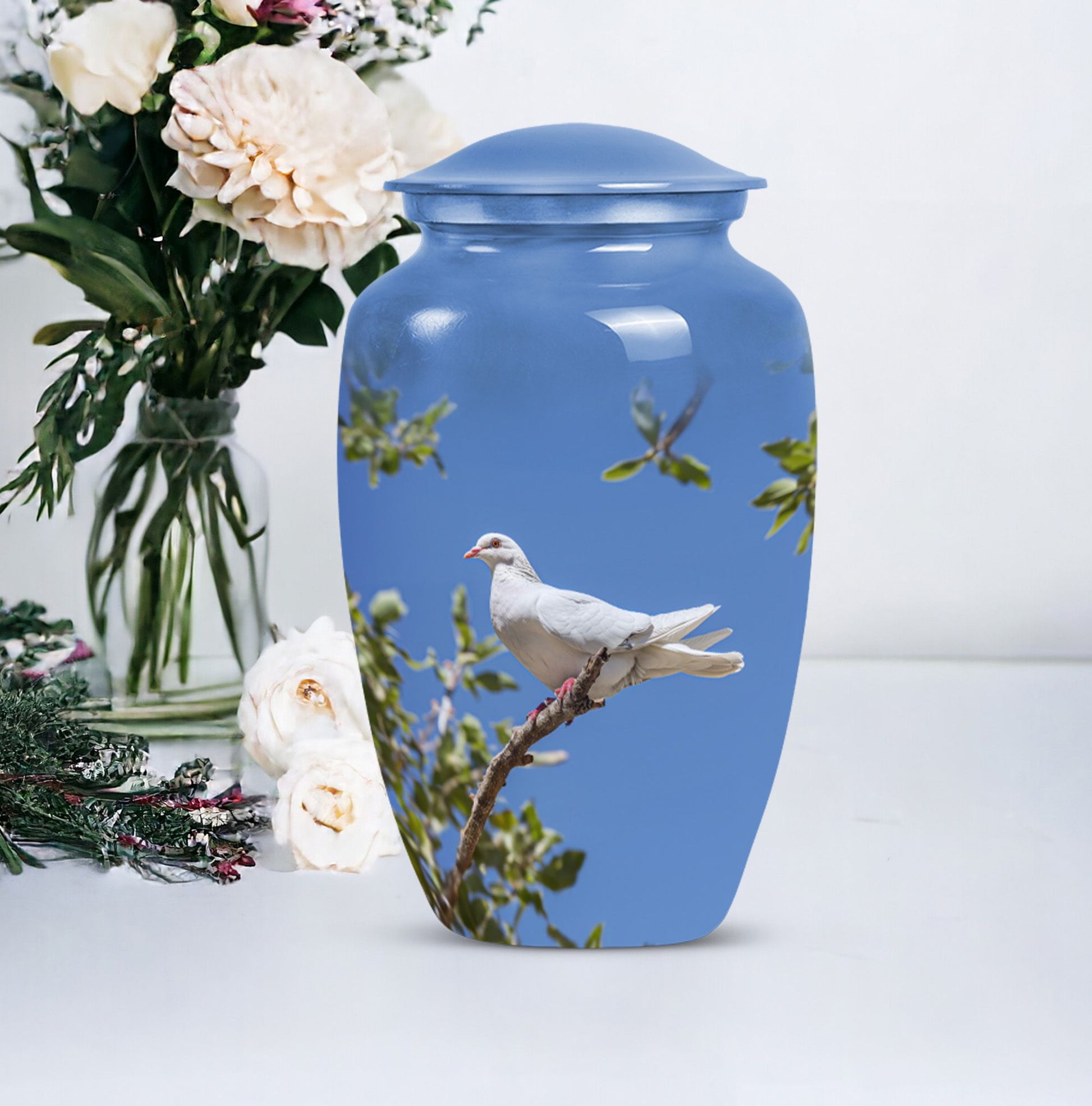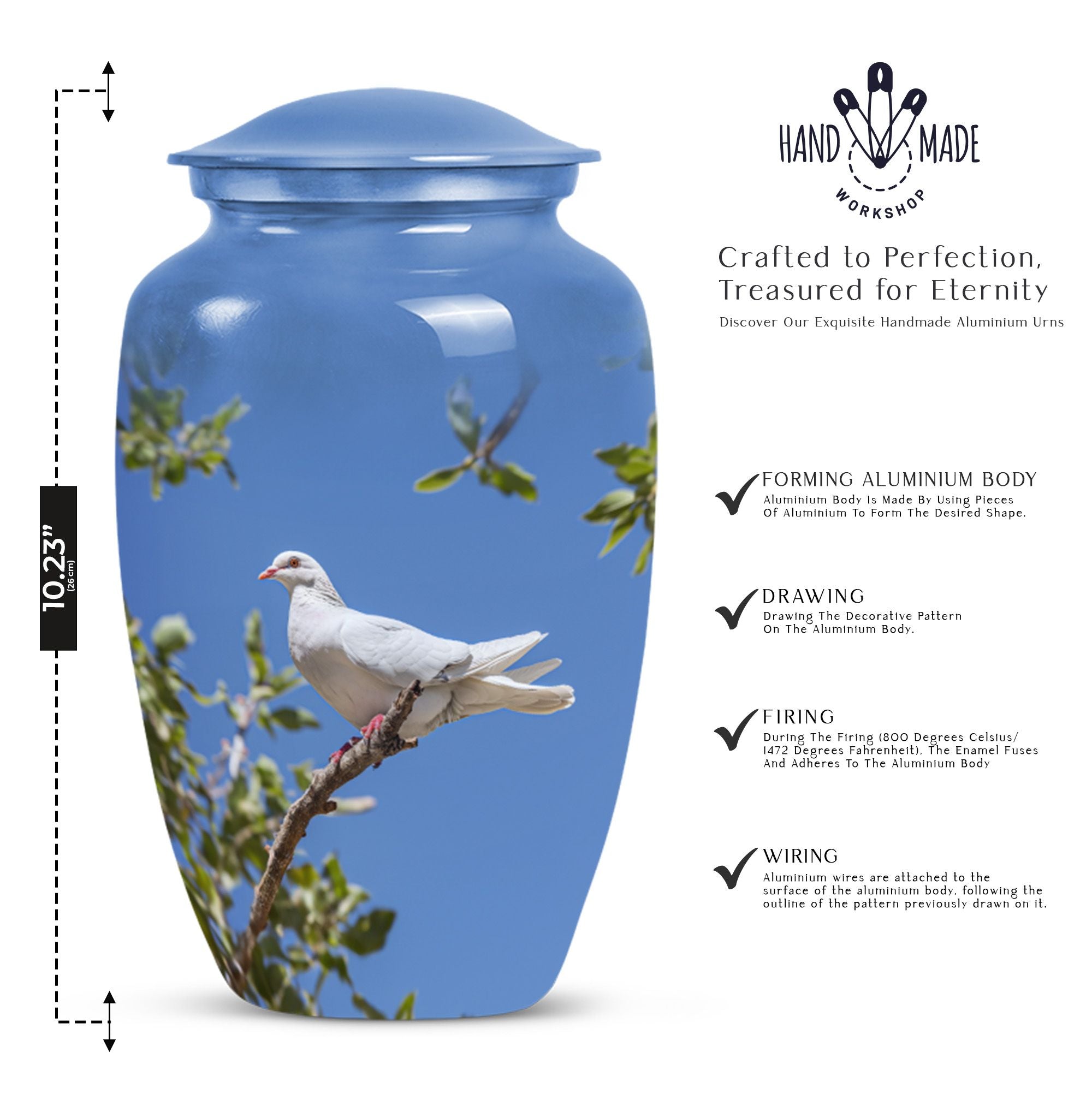 Show your enduring love and respect with our Dove Urn, a 10-inch large urn meticulously crafted from durable Aluminium material. This memorial urn responds to your need for a tangible symbol of remembrance, manifesting a subtle, elegant tribute to your beloved adult female. Weighing only 3.3 pounds, this urn can easily hold up to 200 cubic inches of ashes. The Dove theme lends a sense of peace and tranquillity to the piece. As a thoughtful gesture, each purchase includes a velvet pouch for the containment and preservation of ashes. With its capacity and sturdiness, this urn can also serve as a cremation medium for human ashes. For an added intimate touch, customization is possible with engraved names. This distinct deviation from the conventional box shape gift is indeed a unique, cherished possession. Express your love with a timeless symbol; choose the Dove Urn - an epitome of love, respect and the enduring bond. Note: Design not available for discussion.