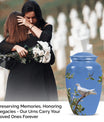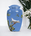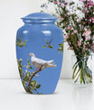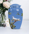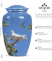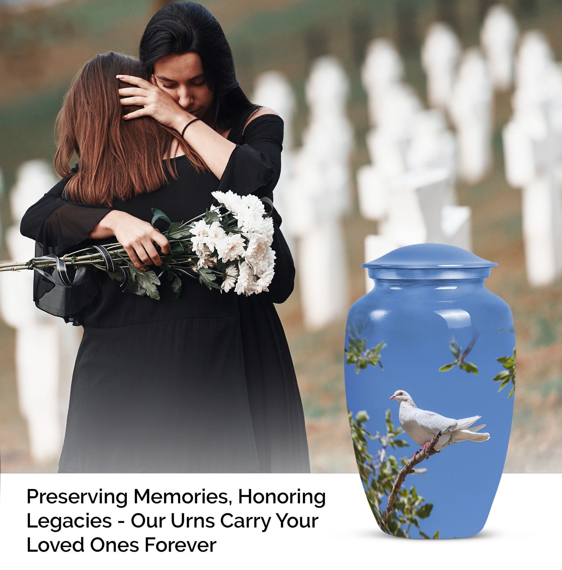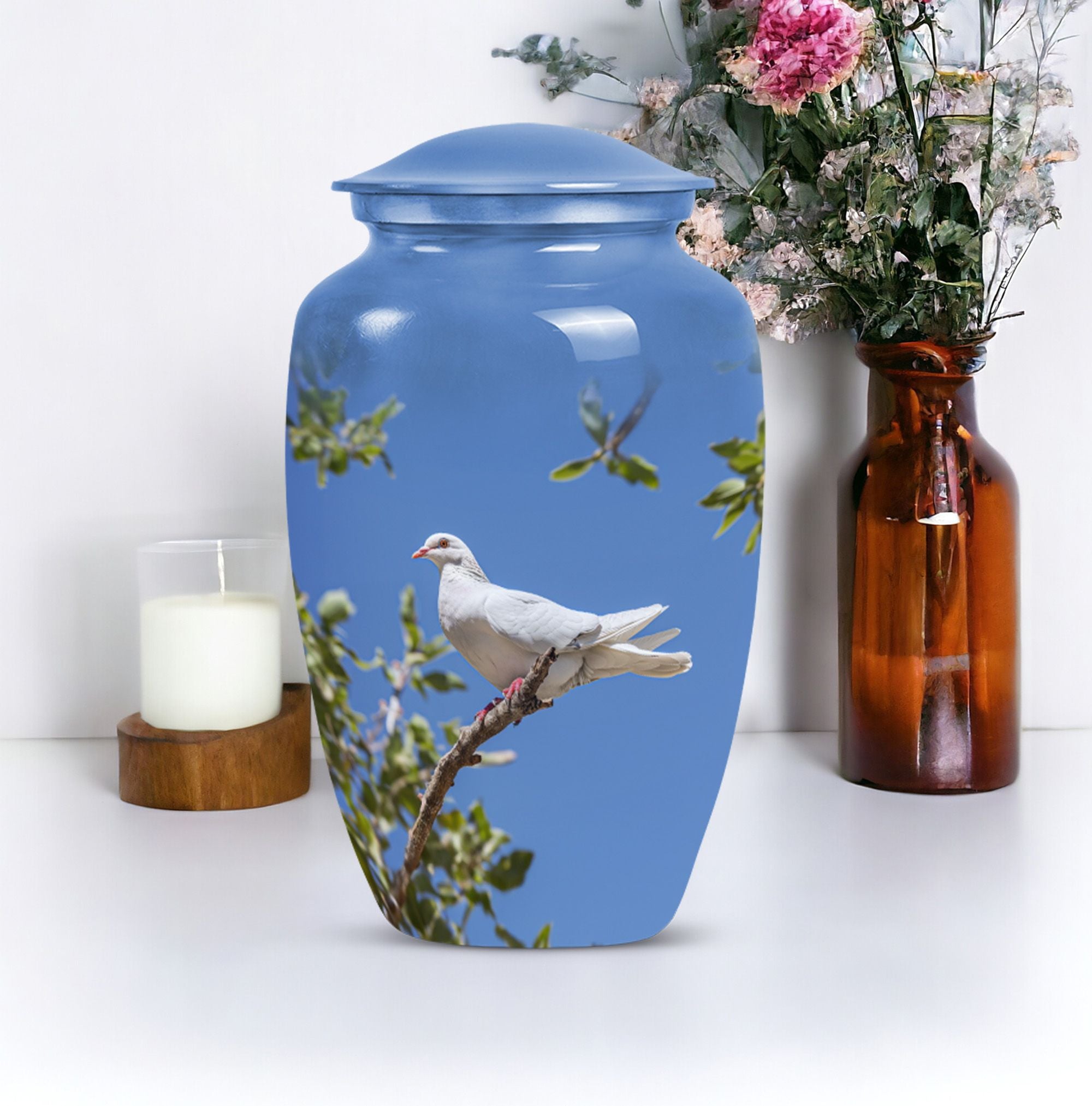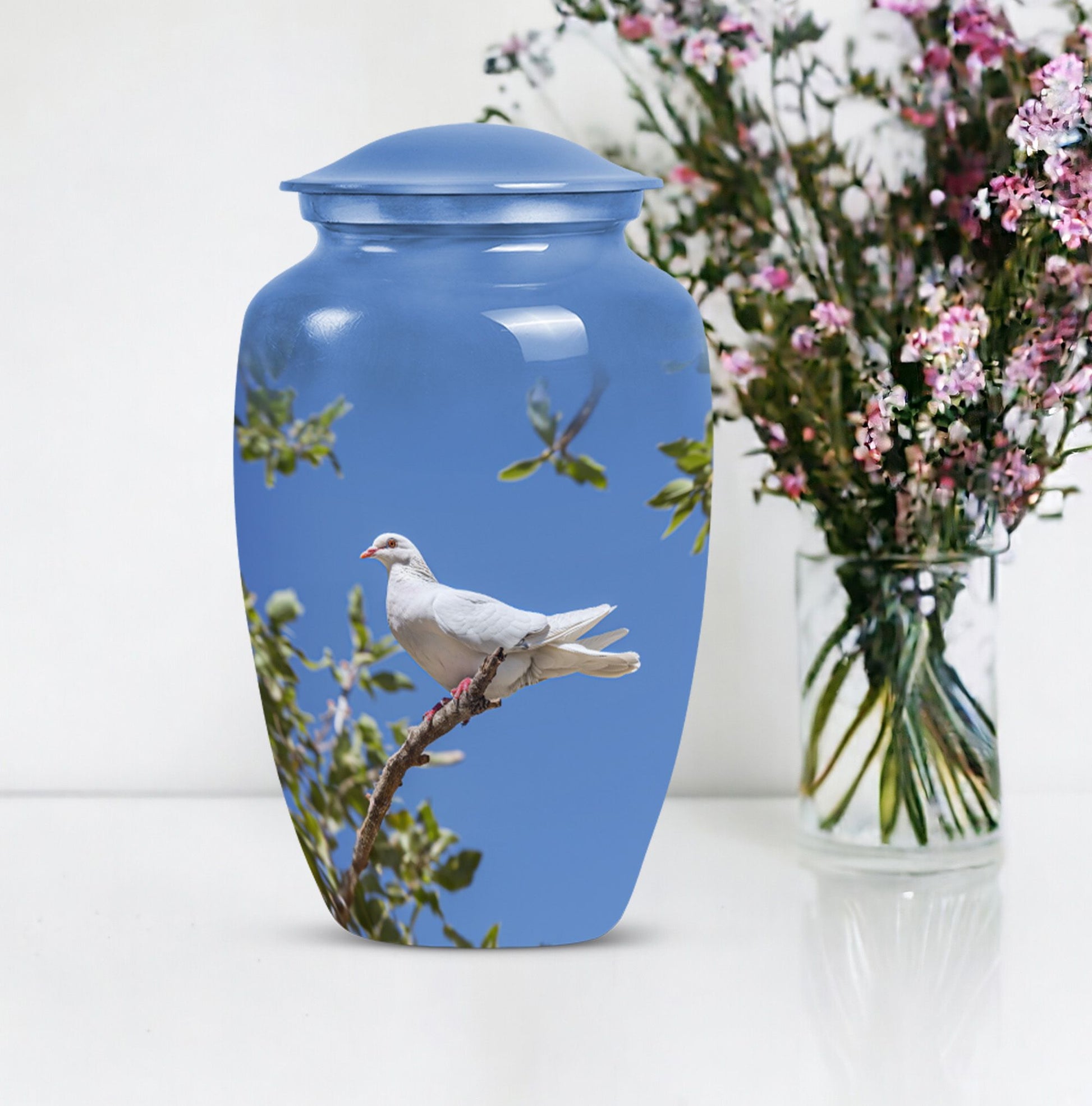 Show your enduring love and respect with our Dove Urn, a 10-inch large urn meticulously crafted from durable Aluminium material. This memorial urn responds to your need for a tangible symbol of remembrance, manifesting a subtle, elegant tribute to your beloved adult female. Weighing only 3.3 pounds, this urn can easily hold up to 200 cubic inches of ashes. The Dove theme lends a sense of peace and tranquillity to the piece. As a thoughtful gesture, each purchase includes a velvet pouch for the containment and preservation of ashes. With its capacity and sturdiness, this urn can also serve as a cremation medium for human ashes. For an added intimate touch, customization is possible with engraved names. This distinct deviation from the conventional box shape gift is indeed a unique, cherished possession. Express your love with a timeless symbol; choose the Dove Urn - an epitome of love, respect and the enduring bond. Note: Design not available for discussion.