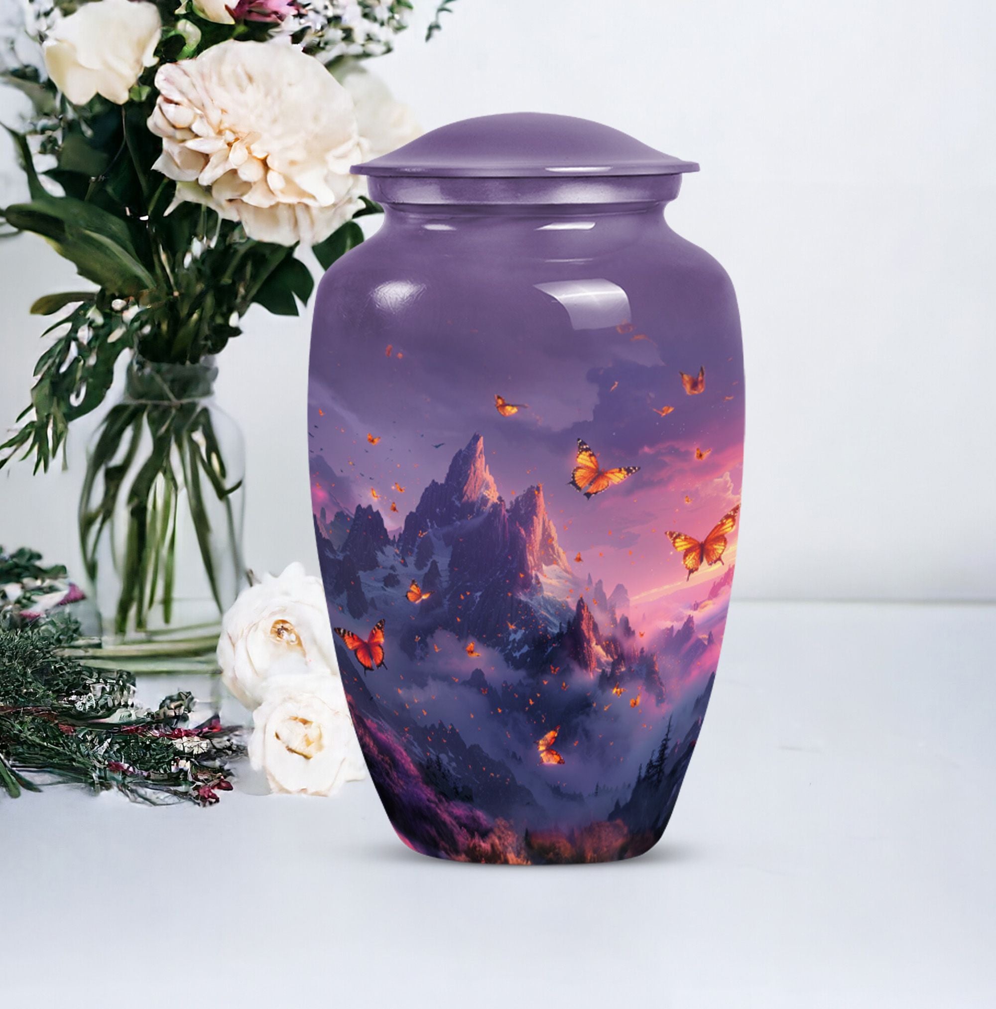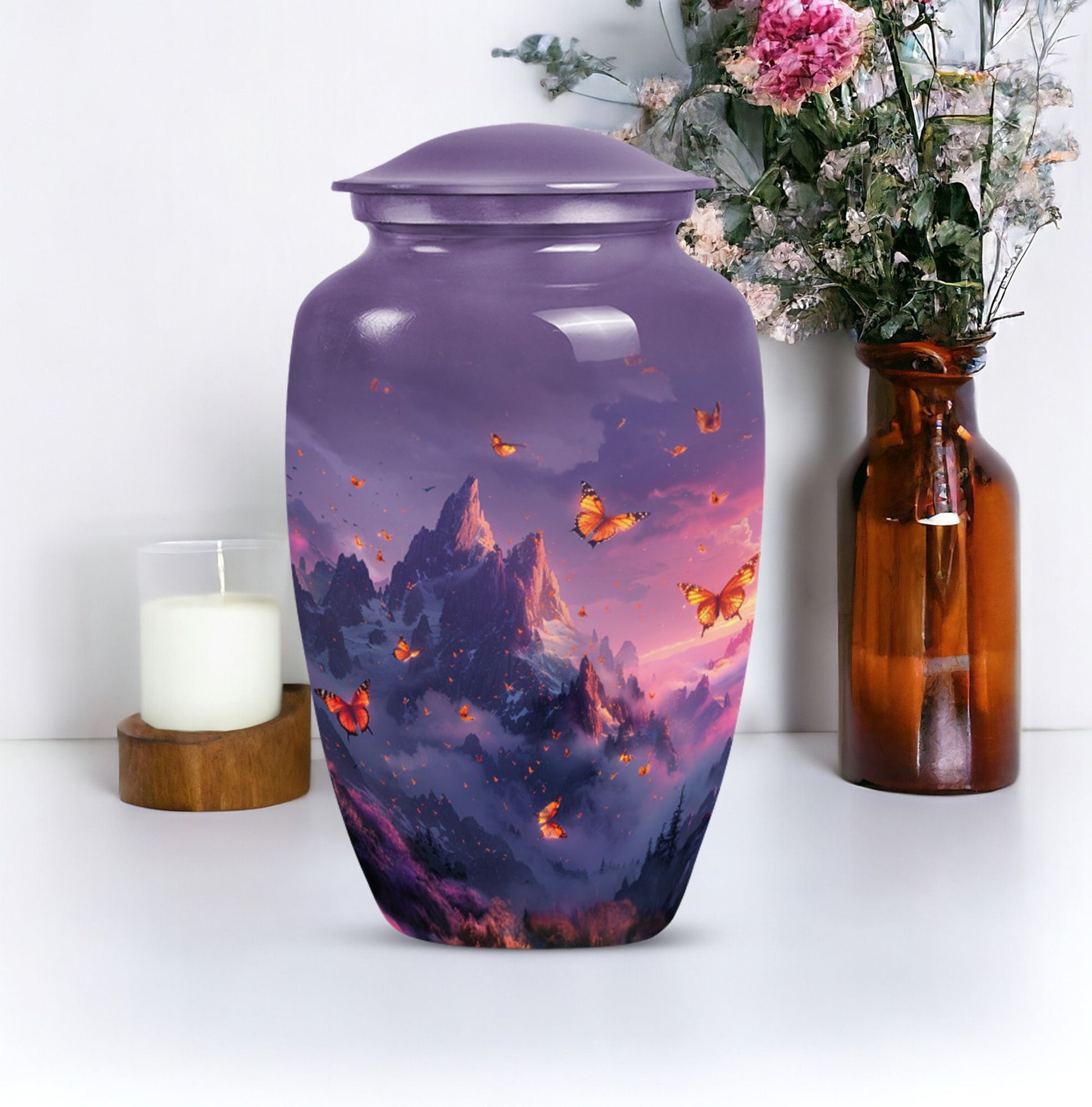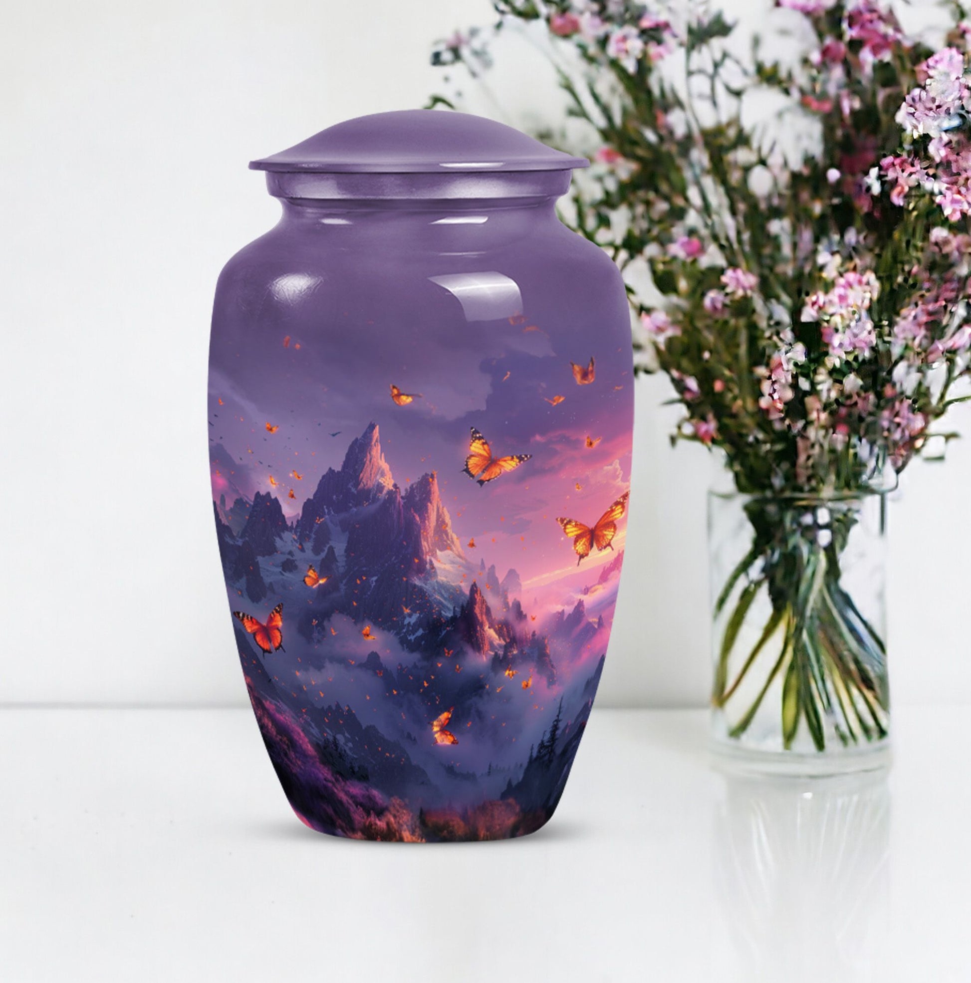 Elegantly crafted and boasting a profound respect for ceremony, this Purple Meadow Urn is an ideal choice for remembering and memorializing loved ones. As an homage to the beauty of life and the dignity of passing, this cremation urn boasts a large size of 10 inches and a capacity of 200 cubic inches, making it suitable for any adult or senior. It offers a weight of 3.3 pounds, indicating its sturdy and reliable aluminium construction. Even now, we understand the need for personal touches, and this product offers customization where you can etch your loved one's name, reminding us that every life is unique. On receiving our urn, you'll find it housed in a specially made velvet pouch, ensuring a respectful containment of the ashes. With primary keywords like 'purple meadow Urn, cremation urn for dad', and secondary ones like 'Burial ash urns for humans, human ash urn ashes, urn for human ashes, cremation urn for burial' making it easy to locate us. Choose our Purple Meadow Urn, preserving memories with grace and reverence.