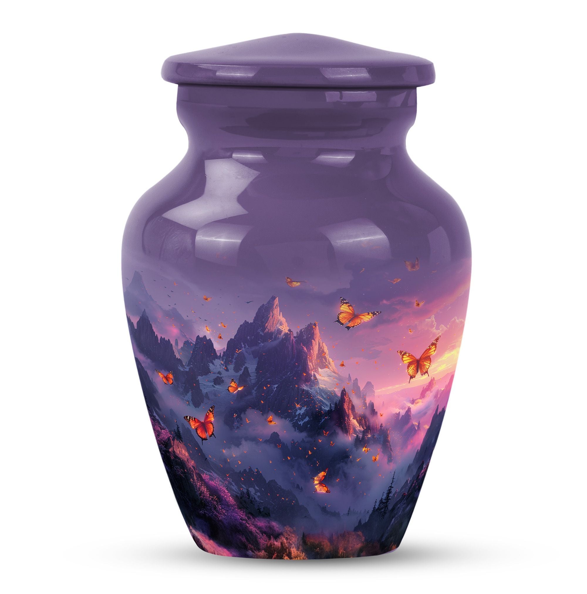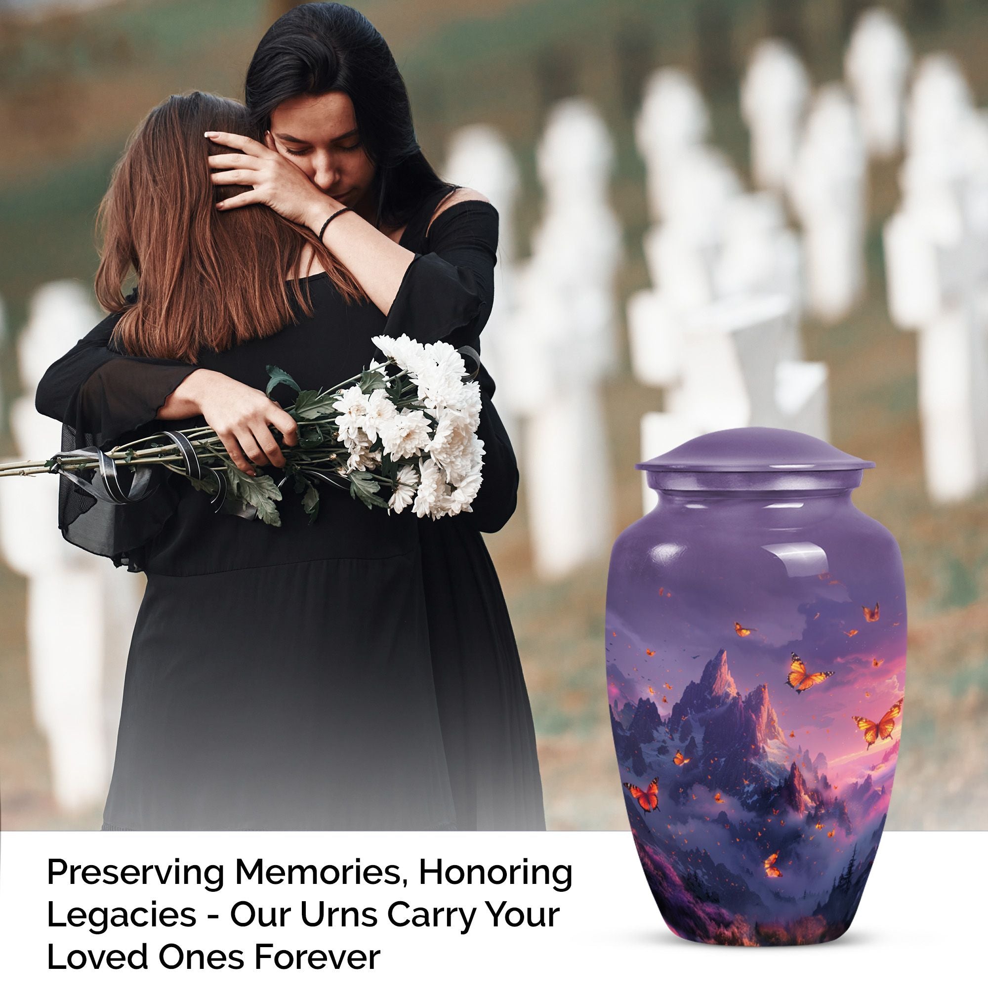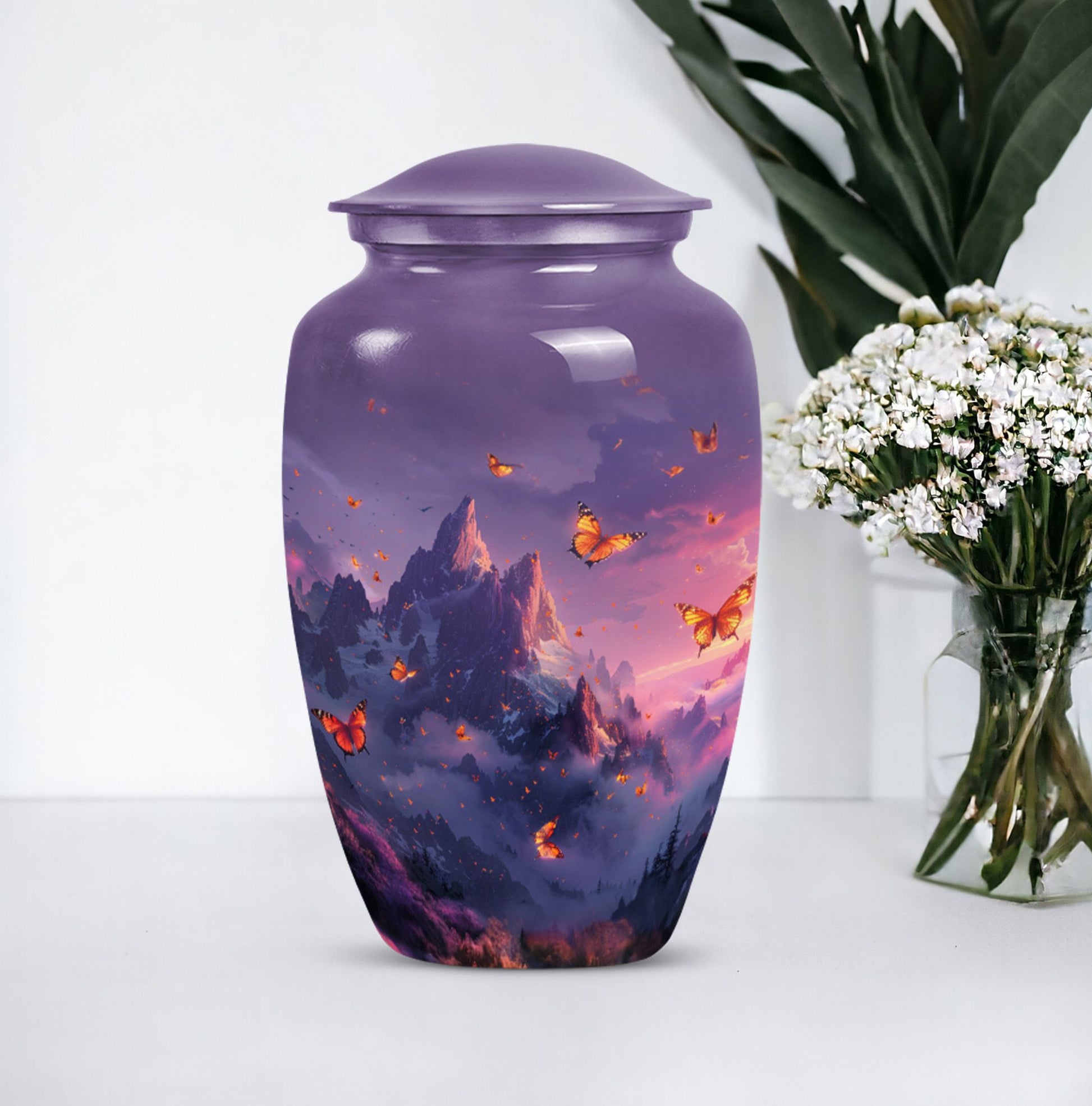 Elegantly crafted and boasting a profound respect for ceremony, this Purple Meadow Urn is an ideal choice for remembering and memorializing loved ones. As an homage to the beauty of life and the dignity of passing, this cremation urn boasts a large size of 10 inches and a capacity of 200 cubic inches, making it suitable for any adult or senior. It offers a weight of 3.3 pounds, indicating its sturdy and reliable aluminium construction. Even now, we understand the need for personal touches, and this product offers customization where you can etch your loved one's name, reminding us that every life is unique. On receiving our urn, you'll find it housed in a specially made velvet pouch, ensuring a respectful containment of the ashes. With primary keywords like 'purple meadow Urn, cremation urn for dad', and secondary ones like 'Burial ash urns for humans, human ash urn ashes, urn for human ashes, cremation urn for burial' making it easy to locate us. Choose our Purple Meadow Urn, preserving memories with grace and reverence.