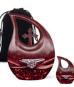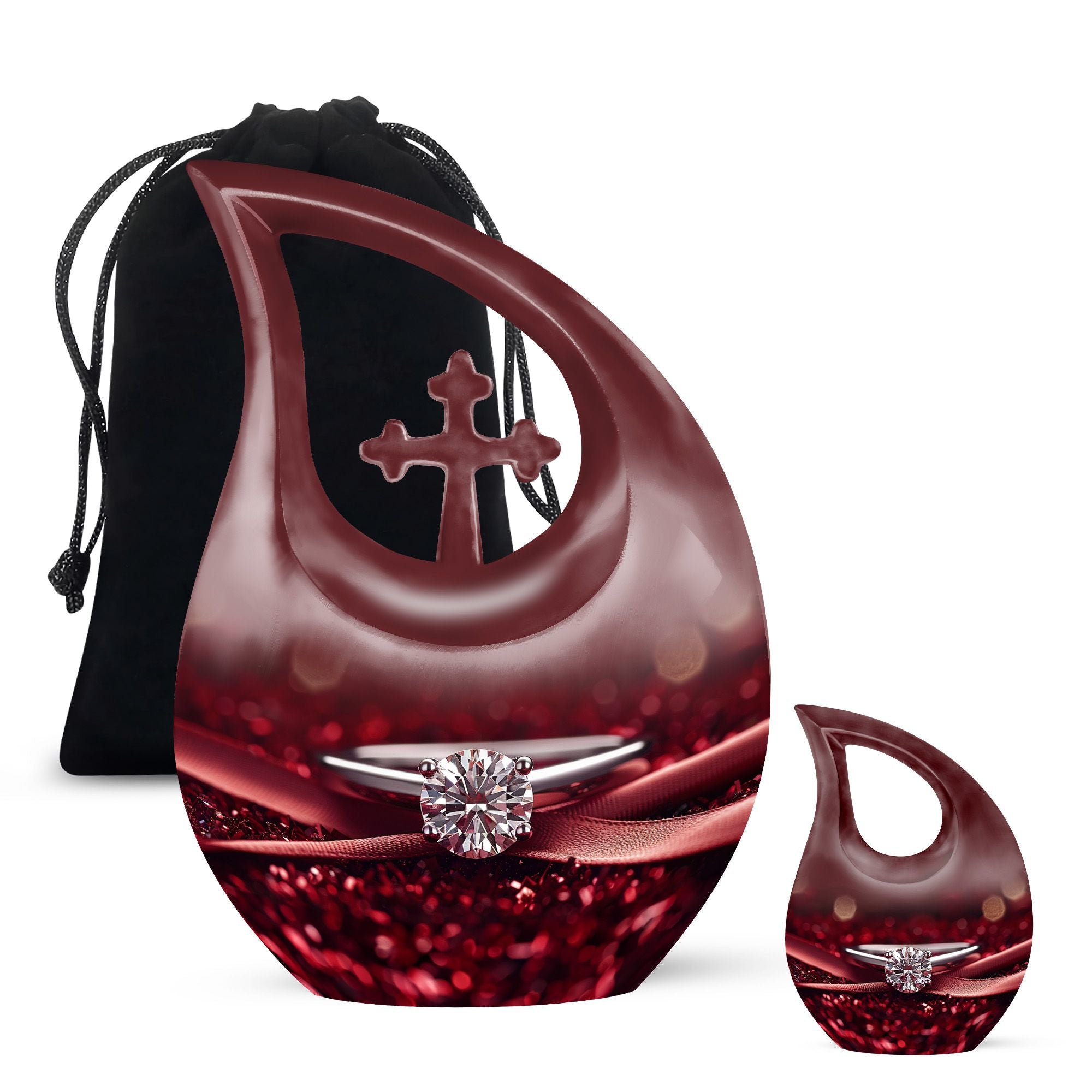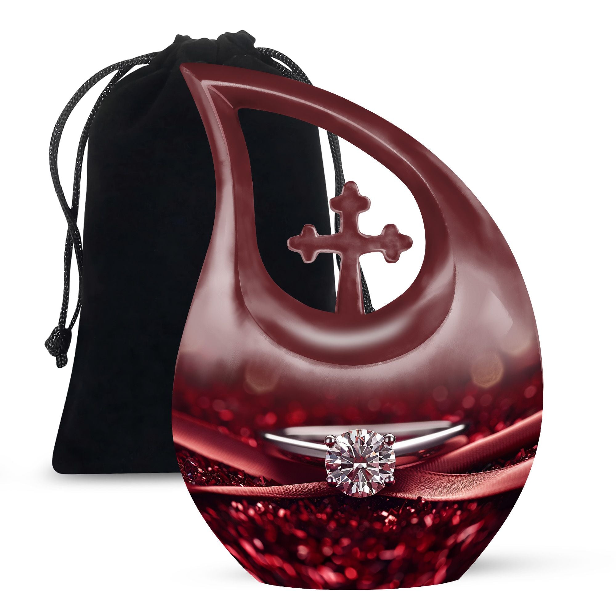 Securely honor your loved one's last wishes with our exceptional 'Cross Drop' Ring Urn. This unique urn showcasing a Ring theme, is crafted from hard-wearing aluminium, carefully shaped into a 10-inch high Large Urn. With an astonishing capacity of 200 cubic inches, it can effortlessly hold your Dad's earthly remains. This urn weighs just 3.3 pounds, making it straightforward to relocate whenever needed. Our carefully manufactured, 10 inches in size, Ring Urn truly acknowledges the importance of a dignified goodbye. Personalize this urn by engraving names on it, adding a heartfelt and candid appeal. We also provide an elegant velvet pouch for keeping ashes intact. The extraordinary Cremation Box provides a memorable way to recall the memories of your beloved adults. This ideal funeral urn combines functionality with aesthetics for an elegant remembrance. Immensely explored keywords in related searches include Cremation Containers, Memorial Urns, and Large Urns for Ashes which validates its immense popularity.