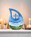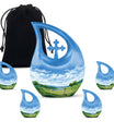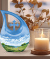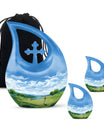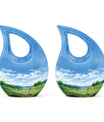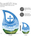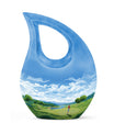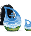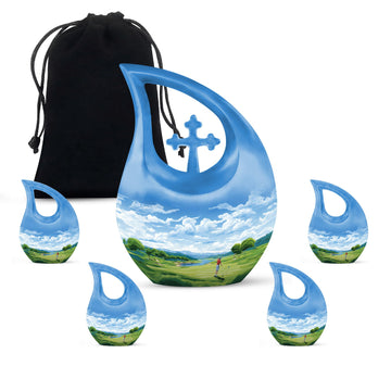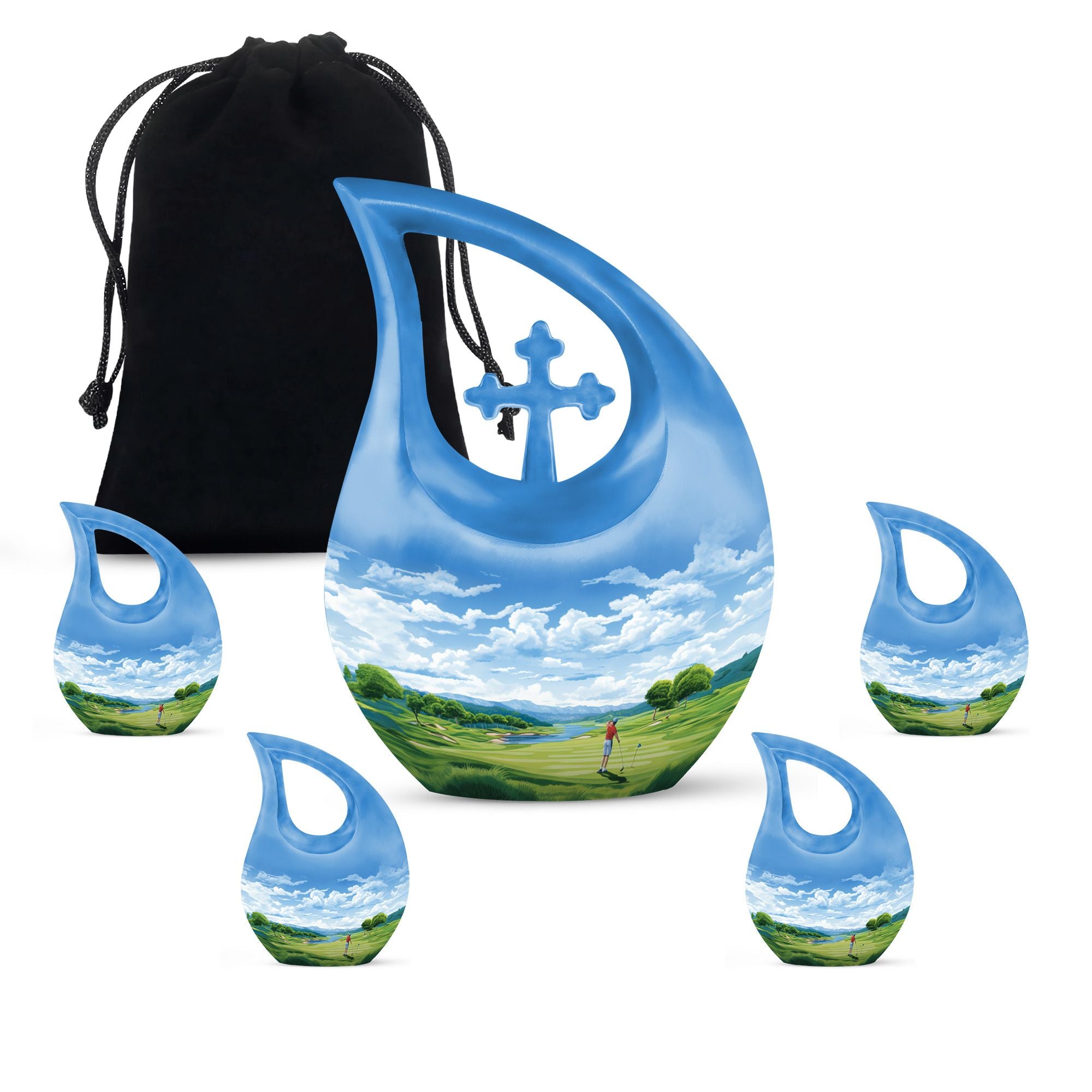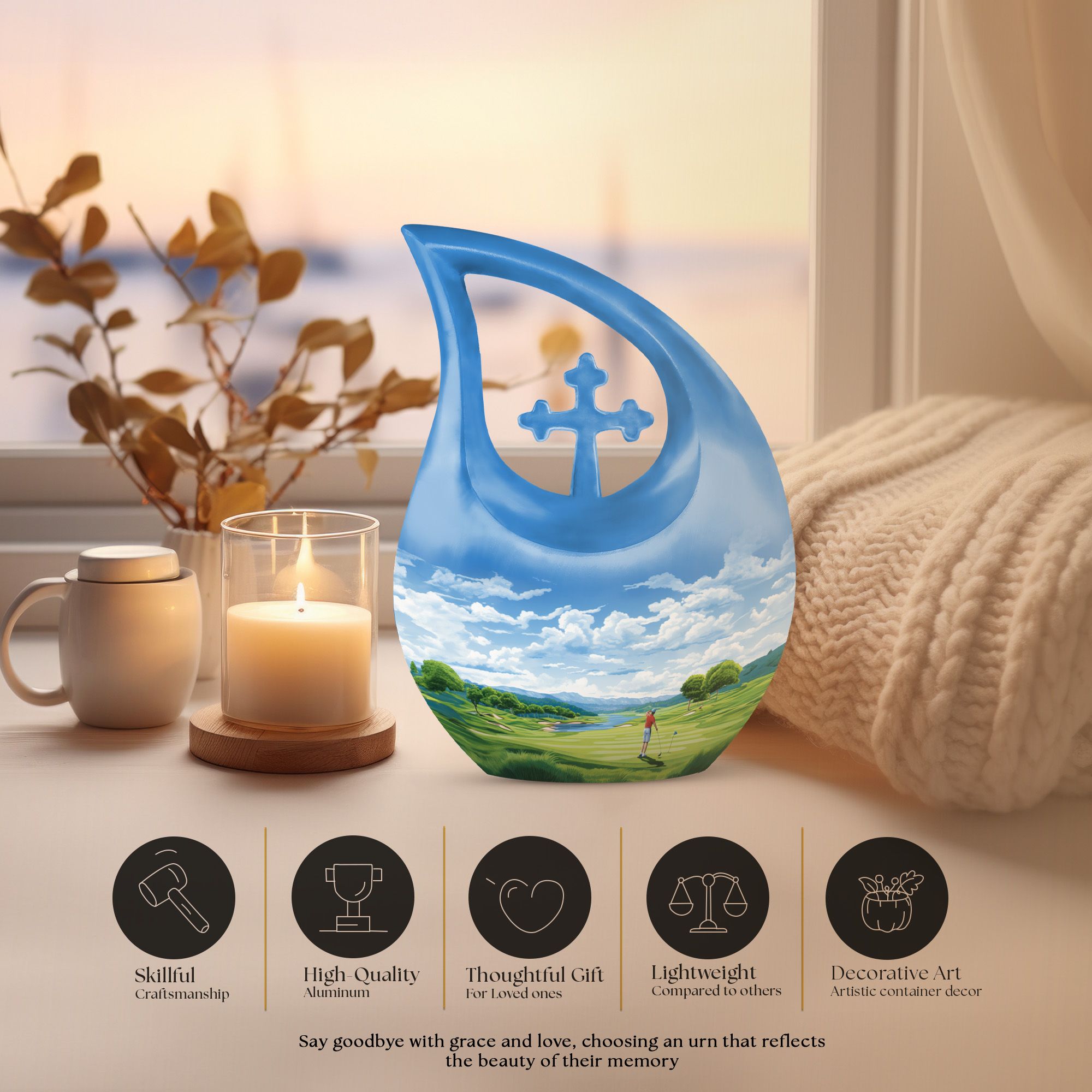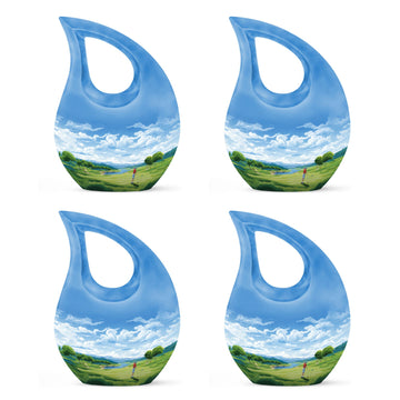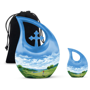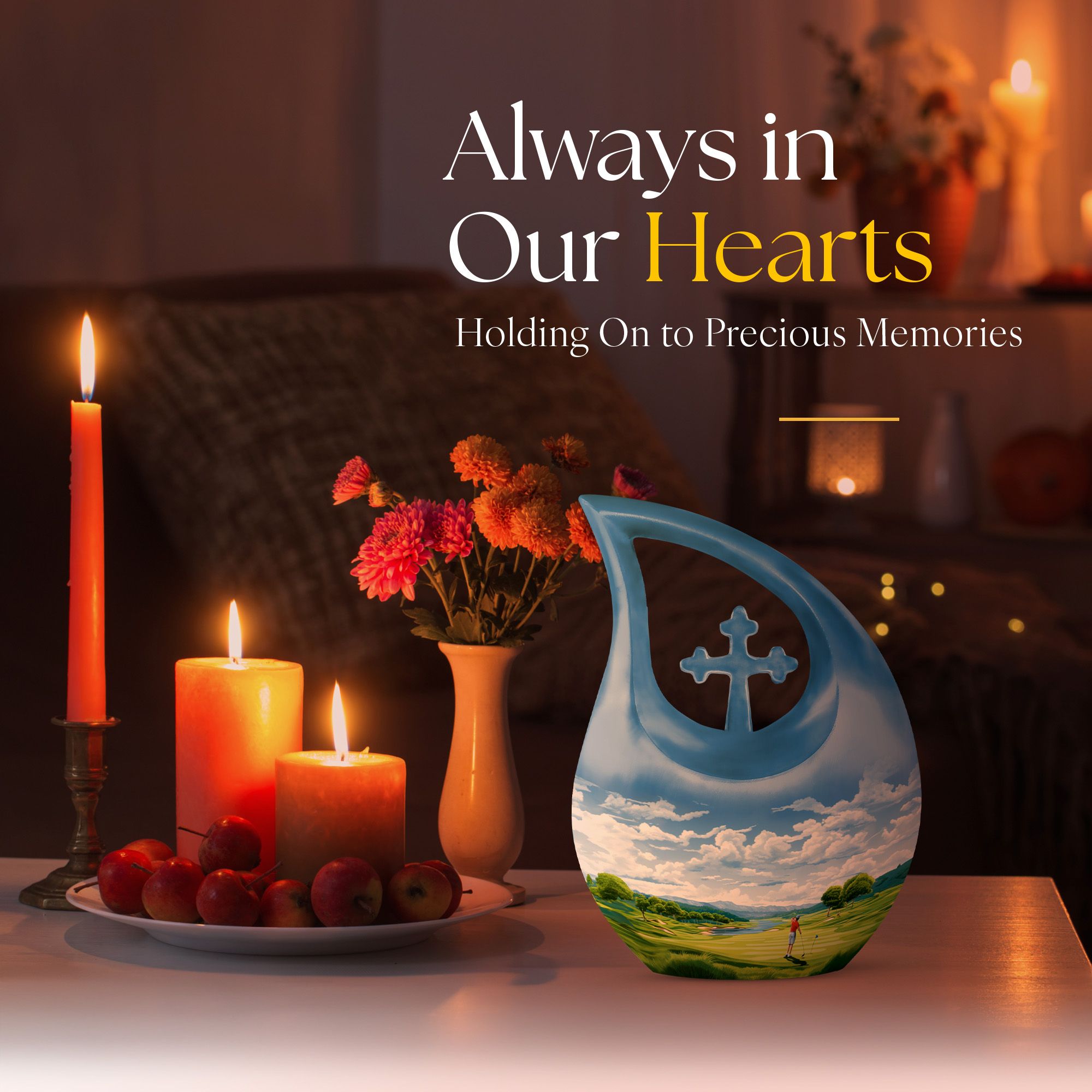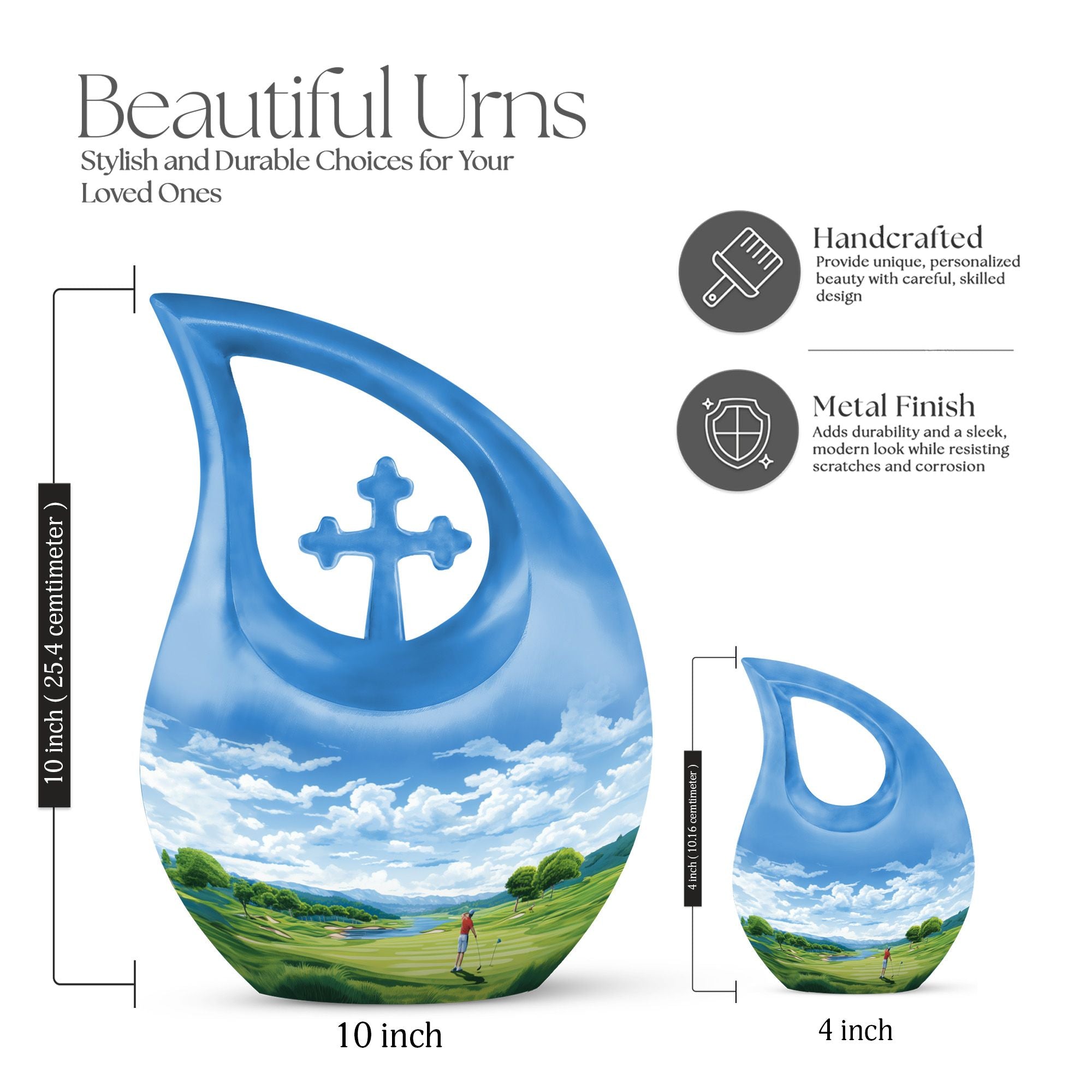 Crafted from durable aluminum, this landscape memorial urn for ashes features a tranquil golf-themed scene that reflects serenity, dedication, and a love for the outdoors. Standing 10 inches tall and holding 200 cubic inches of ashes, it serves beautifully for those searching for funeral urns for adult ashes men, adult urns for human ashes women, or a universal urn for men & women. Its secure screw-top lid ensures safe storage, while its elegant artwork makes it a meaningful choice for families. For shared remembrance, it pairs well with mini small urns for men, mini urn for ashes for women, ashes keepsake for men, cremation keepsakes for men, keepsakes for women, or matching funeral urns for women. Whether chosen as an urn for women & men, it honors life with grace and warmth.
