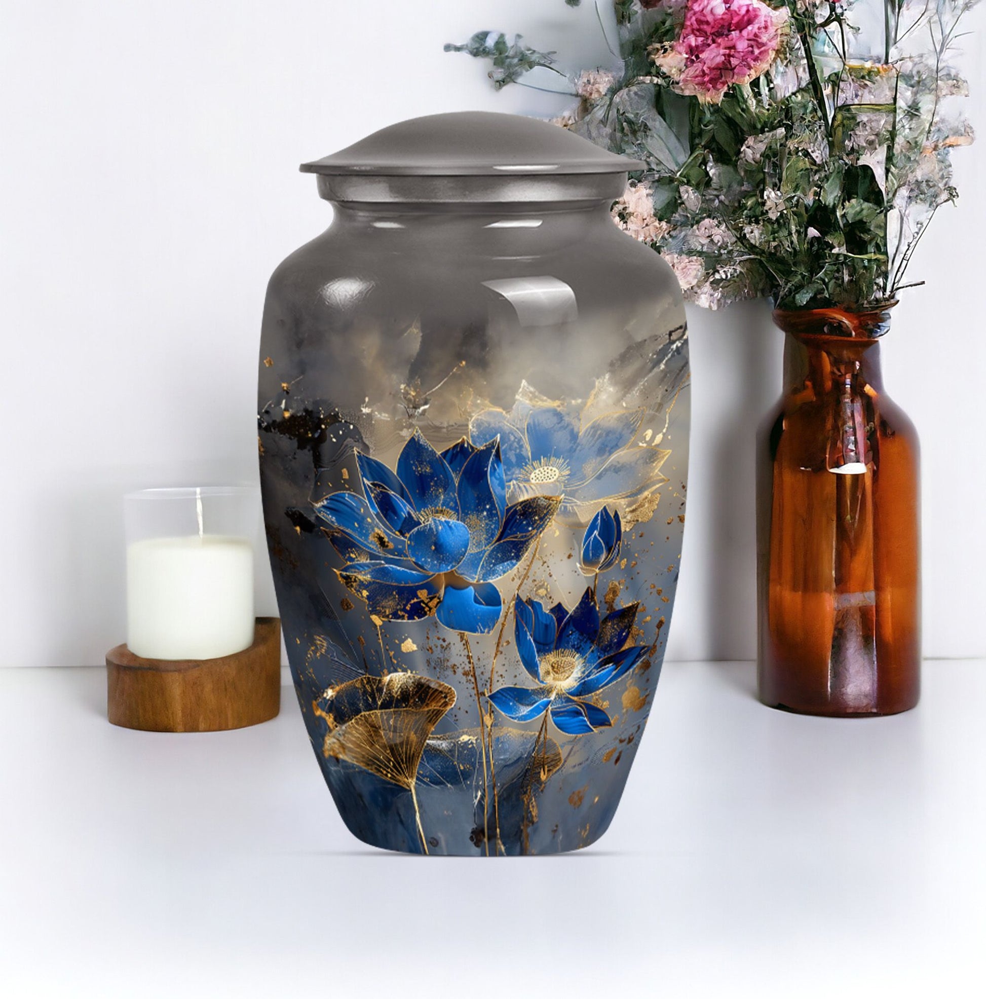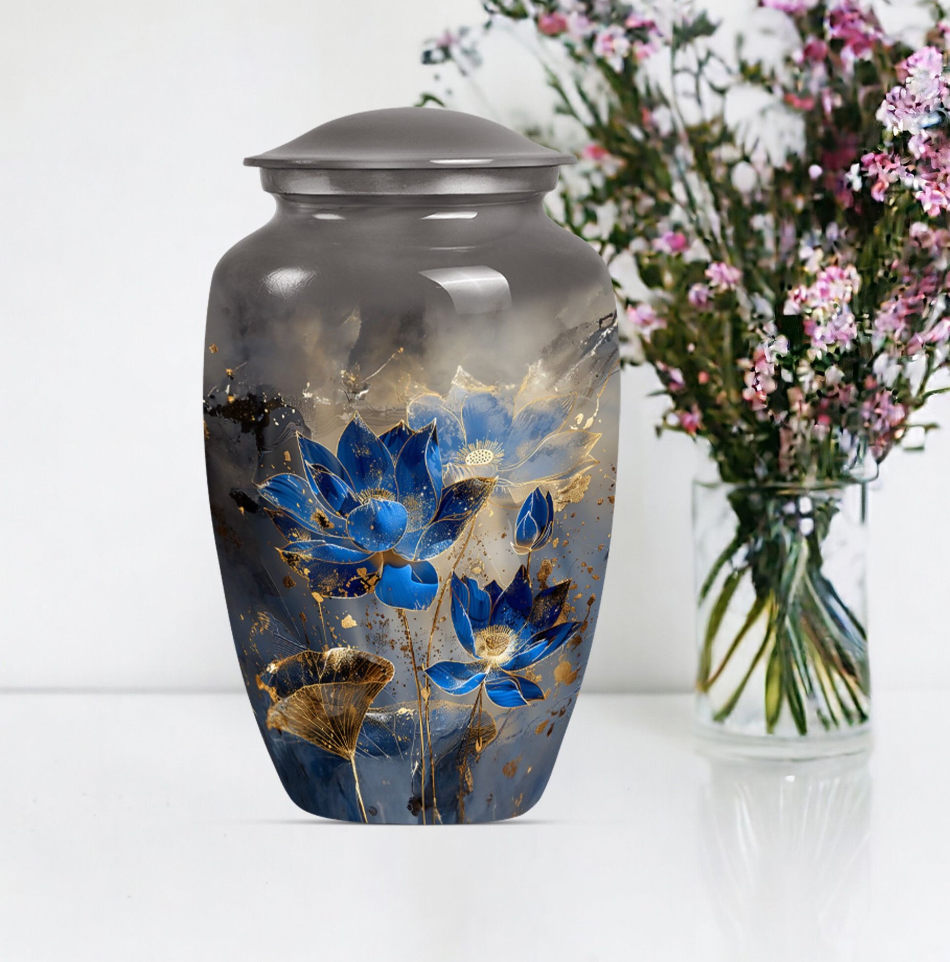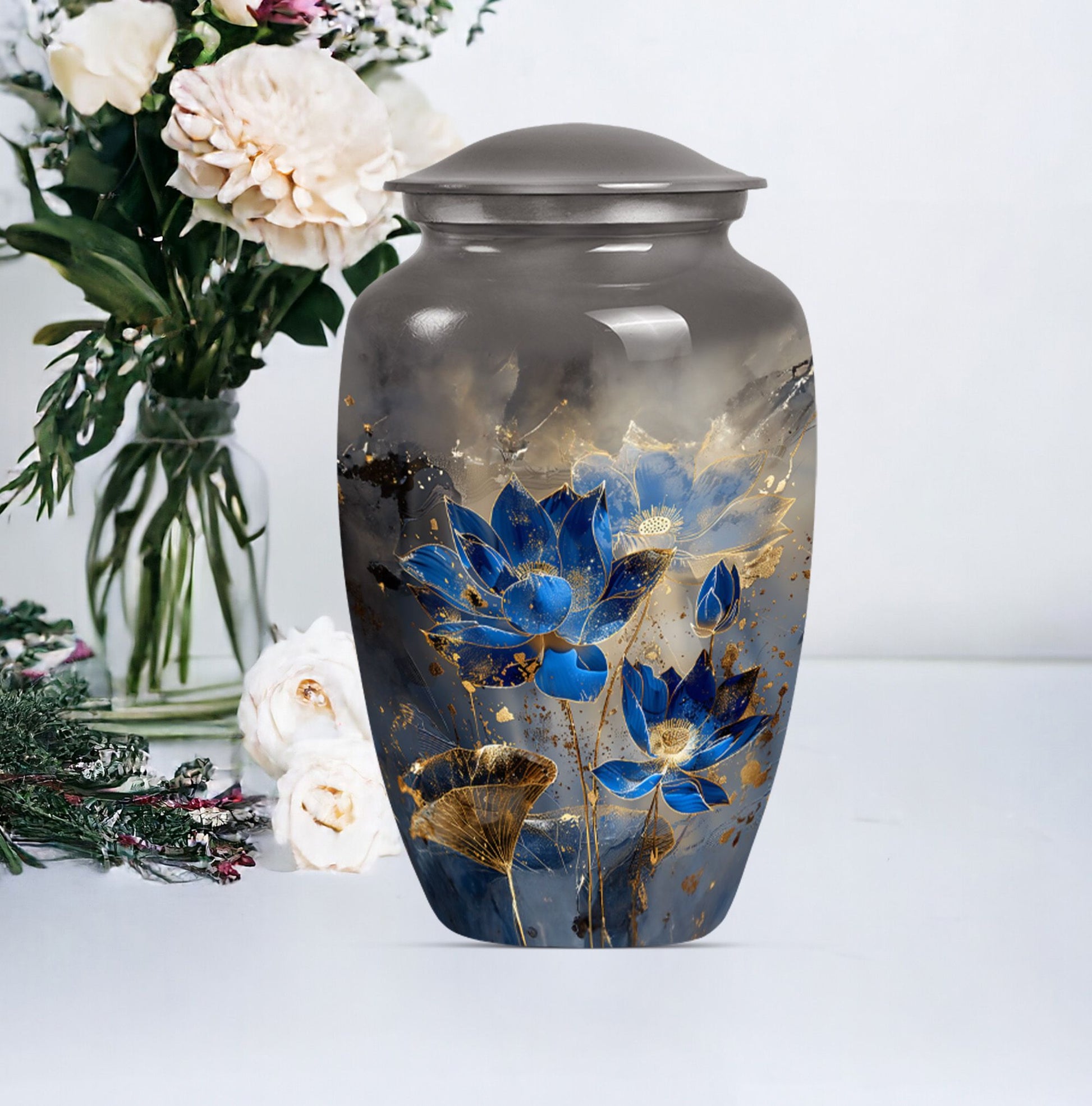 Deeply honor your loved one's memory with our Lotus Urn, a unique memorial urn tailored for adults. With an abstract theme and crafted from rigid, high-quality aluminium, this cremation urn combines longevity and style subtly. Its substantial size, standing at 10 inches in height and weighing 3.3 pounds, ensures ample capacity of up to 200 cubic inches, ideal for large urn needs. The classic urn design echoes elegance, ensuring a respectful and dignified elocution of your loved one's memory. As a value-added feature, we offer customization - engrave names on it to add a personal touch to the farewell. Also included in the package, a plush velvet pouch for containment of ashes maintains their sanctity and promotes easier handling. Target your search using terms such as 'female urns', 'Companion Urns for Two Adults', 'urns for ashes' or 'large metal urn for ashes' to explore more in the 'Memorial Ceremony Supplies' category.