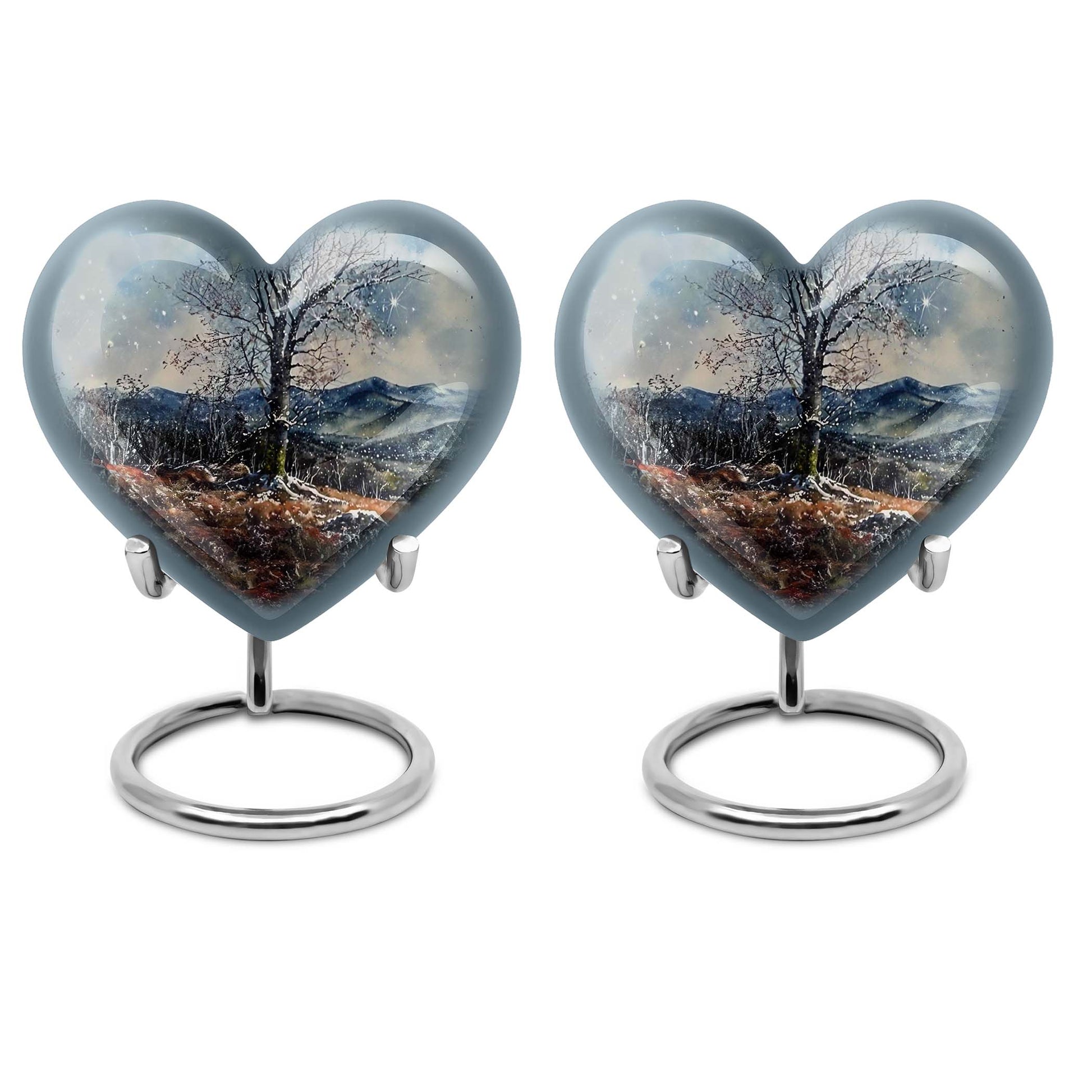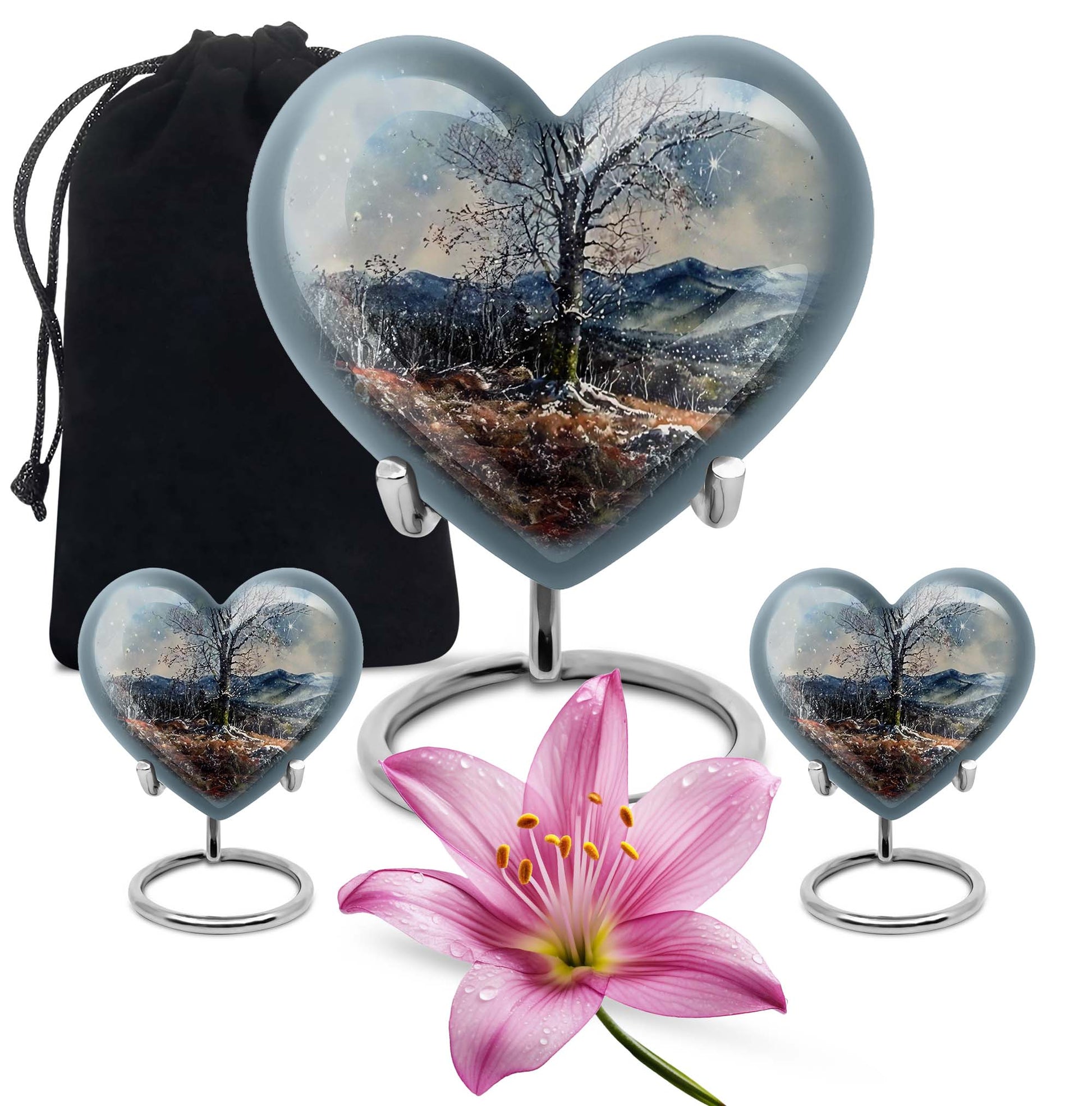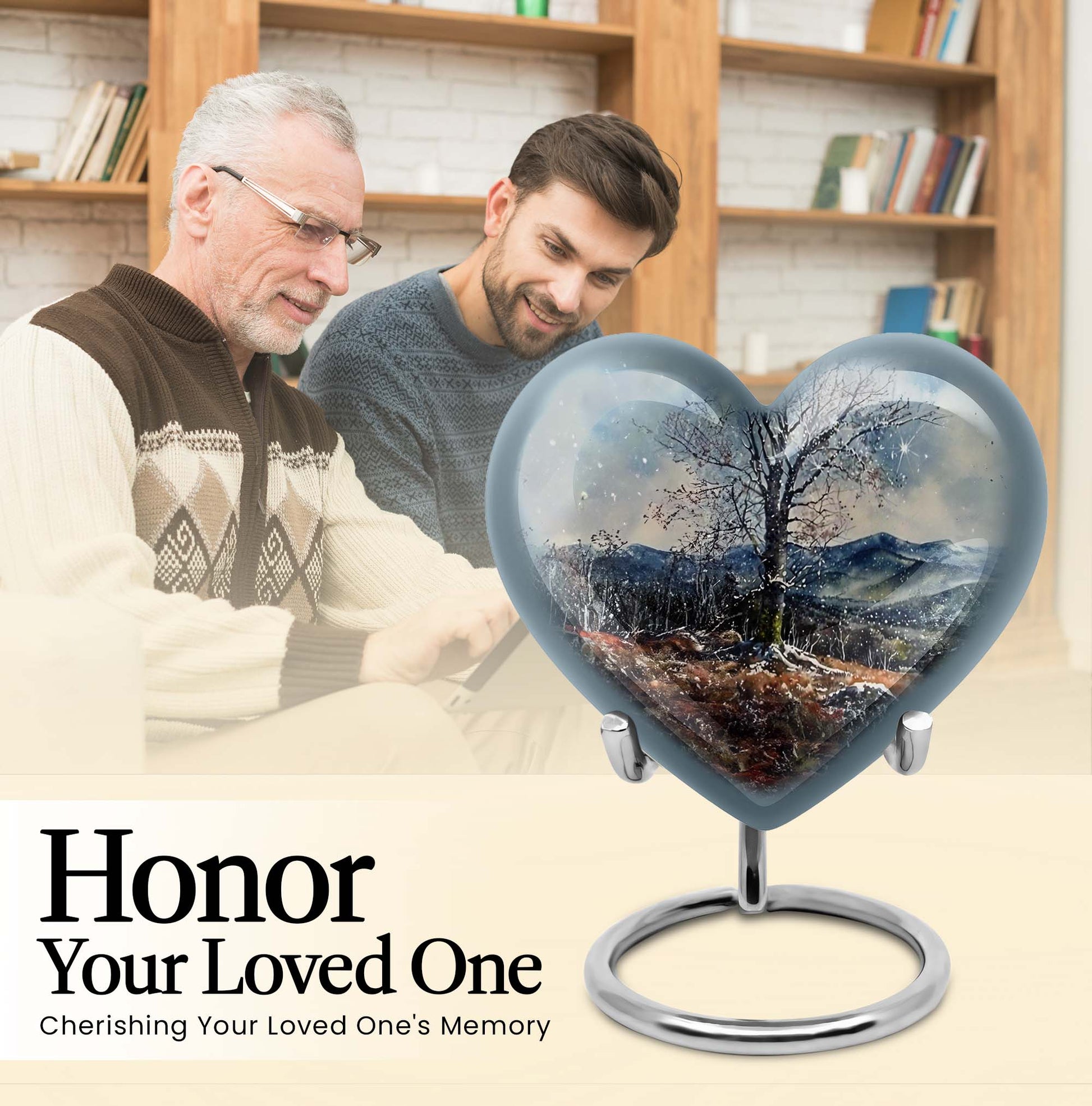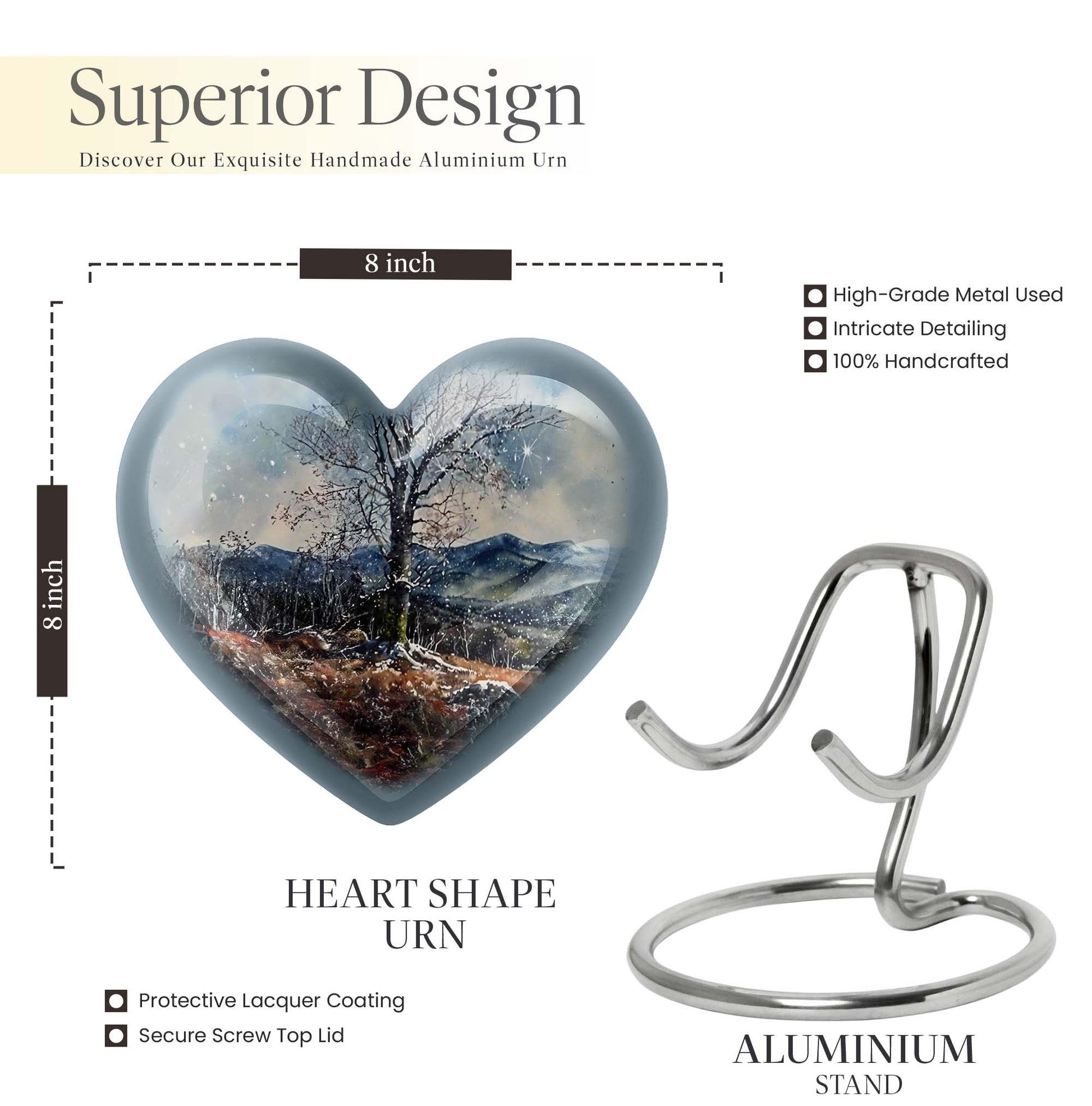 Memorialize cherished ones with a unique Mountains Urn that blends elegance with enduring design. Fashioned from high-quality, robust Aluminium, this heart-shaped urn, designed specifically for adults, measuring 10 inches in size, ensures a lasting resting place for your lost loved one. This tasteful abstract-themed urn is of significant dimensions—10 inches in height, holding a capacity of 200 cubic inches. While the urn alone makes a thoughtful commemoration symbol, it comes with an option to personalize with engraved names, making it truly special. Carefully designed to be weighty yet manageable at 3.3 pounds. Included is a velvet pouch perfect for containing ashes. Beyond its functionality, this large urn is elegant enough to adorn any household shrine or mantle. This piece is tailored for those looking towards making their memorial options as unique as the person gone. Keywords: Mountains Urn, memorial ash urns, Funeral urn for men's ashes, adult ashes men, Elegant urns.