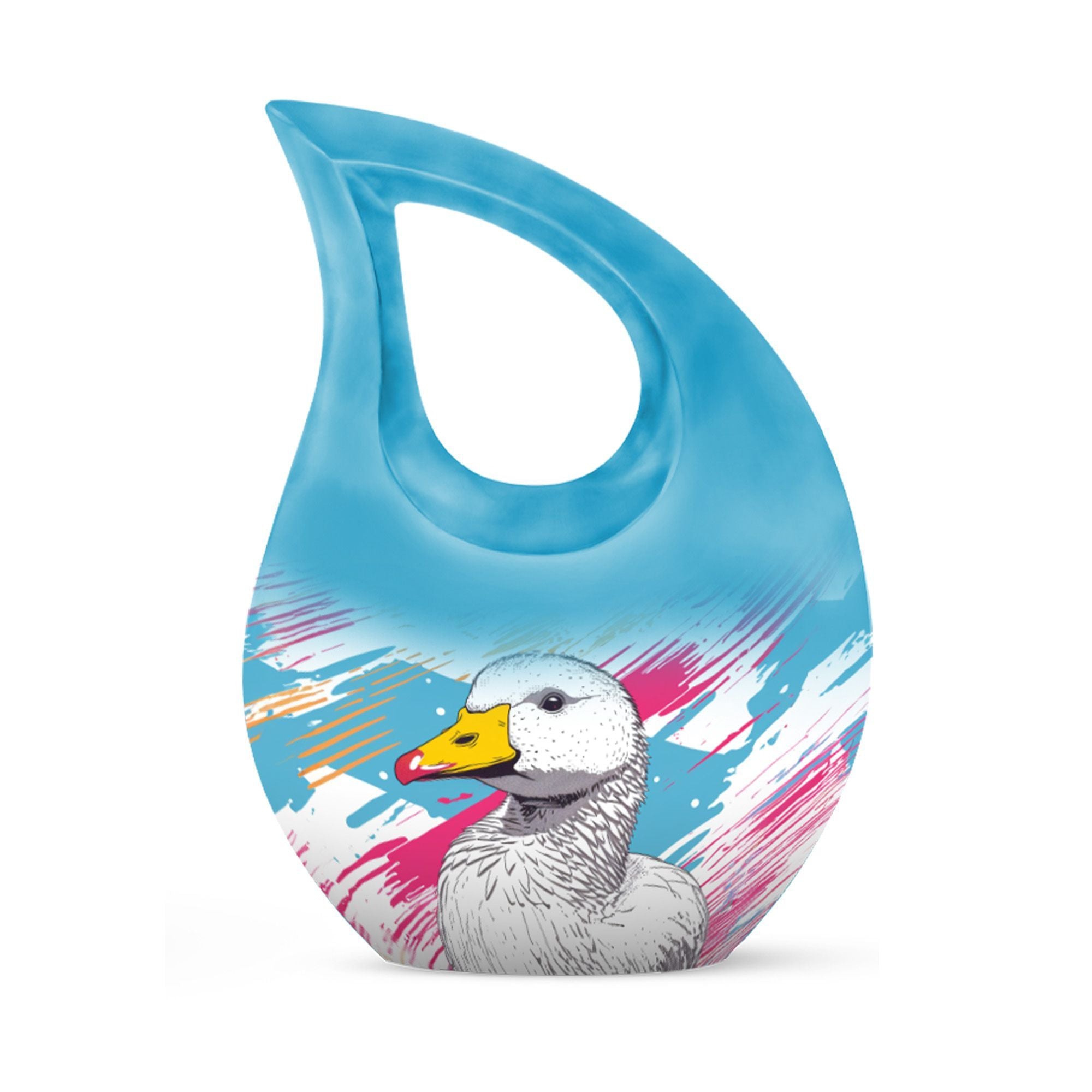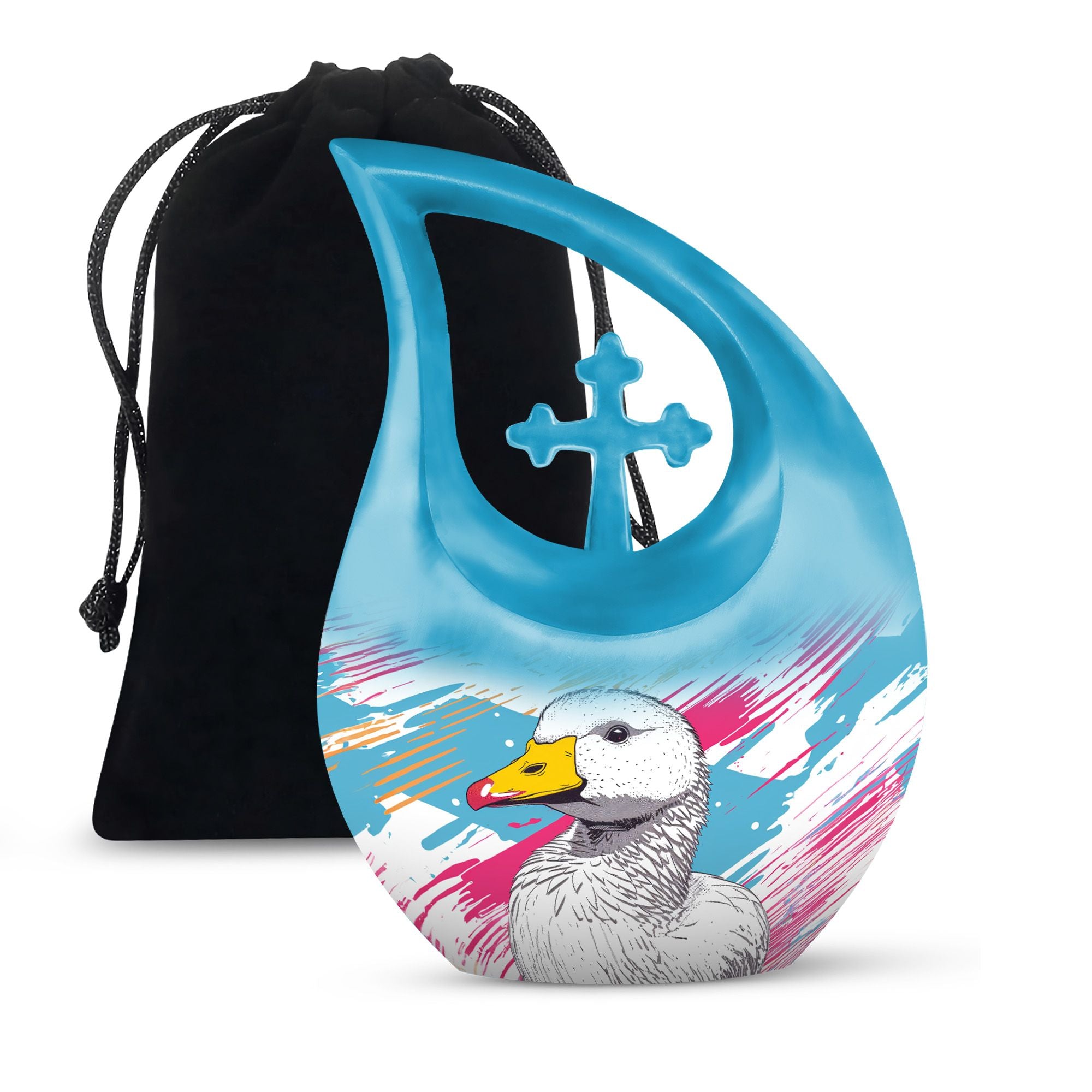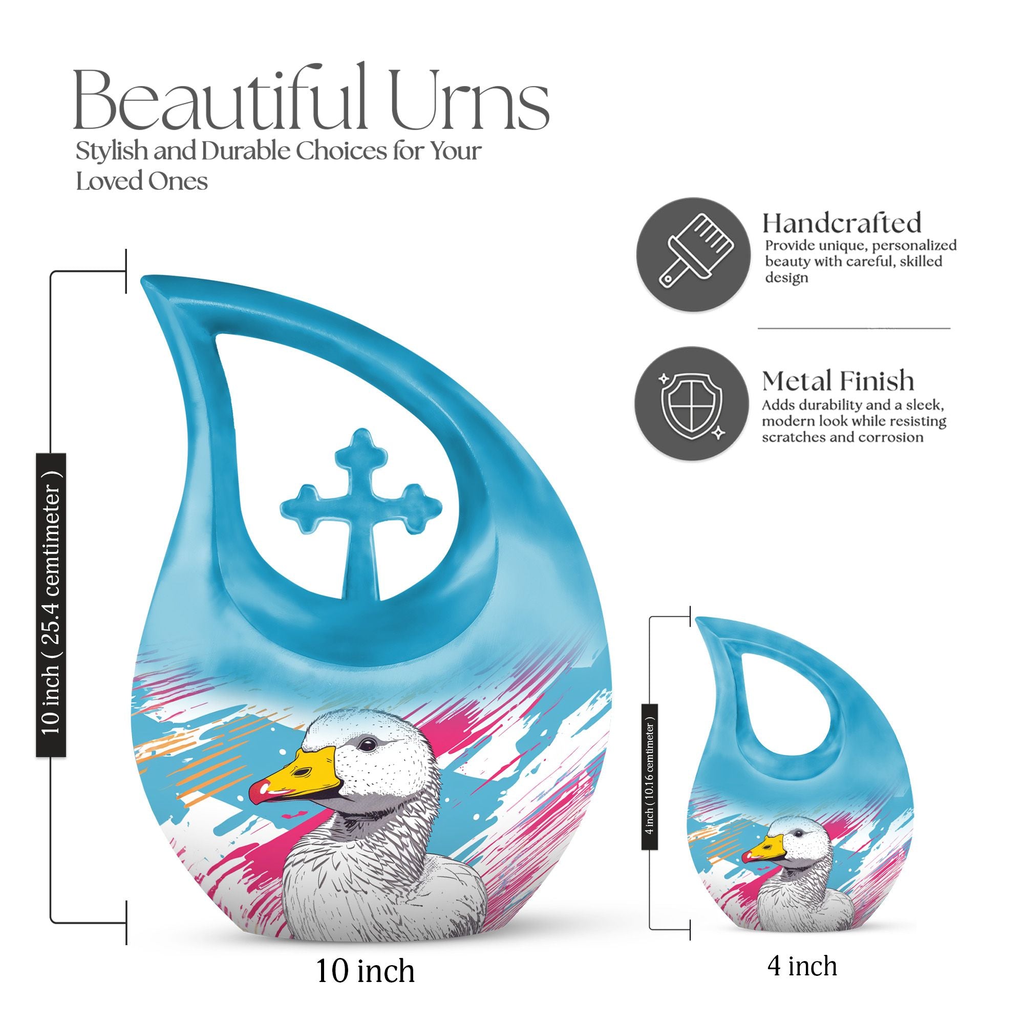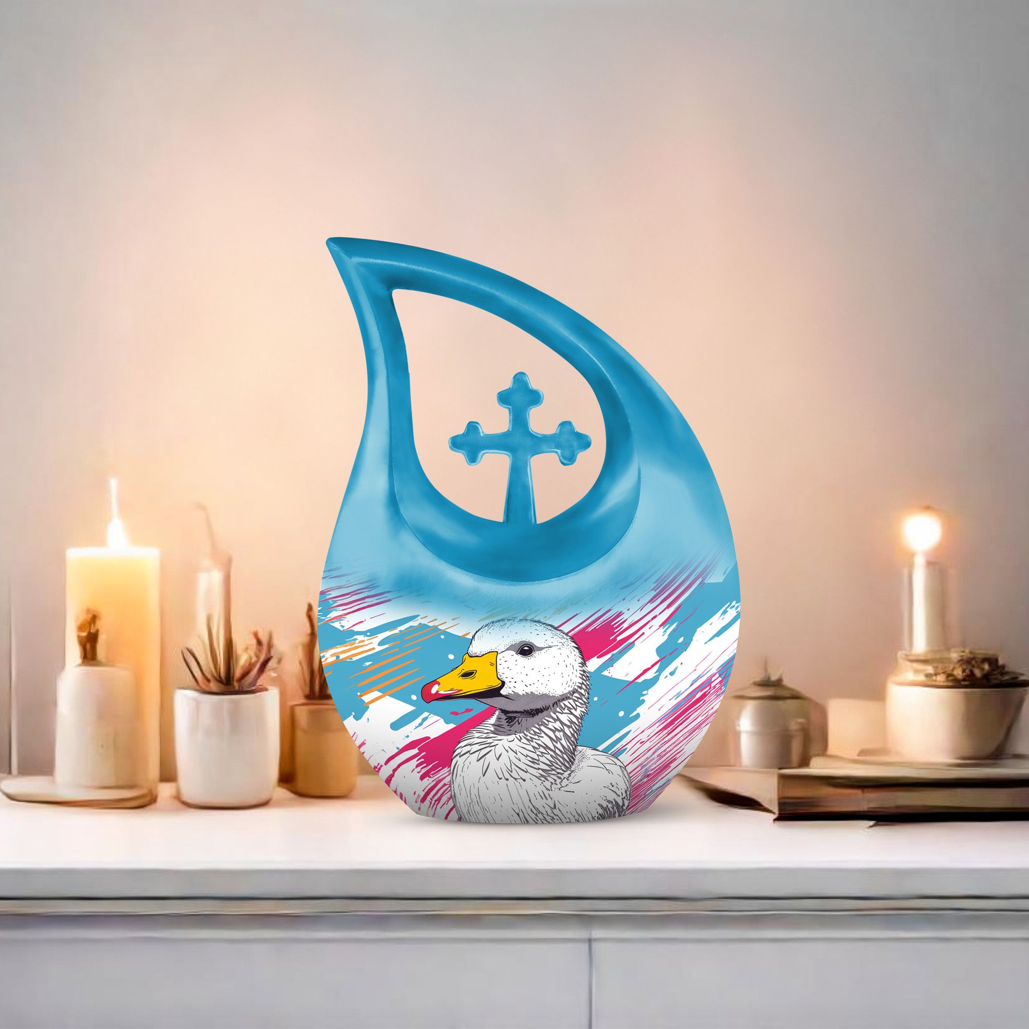 Capture a loved one's vibrancy and radiant personality with the Pop Art Duck Urn, a unique piece in our large cremation urn vaults collection. Standing at an impressive 10 inches in height, each urn is individually crafted from aluminium, promising sturdiness and longevity. With a capacity of 200 cubic inches, these urns comfortably contain ashes, securely stored within an inclusive velvet pouch. They weigh in at 3.3 pounds, making them substantial yet manageable for placement or transport. What sets these memorial urns apart is the distinctive Cross Drop design, symbolizing peace and divine guidance. As a reflection of your personal connection with the departed, each urn allows for customization — engrave cherished names on it for a personal touch. Whether you're searching for urns for ashes near you or keepsake urns for human ashes, our Pop Art Duck Urn strikes a balance between aesthetic and emotional value. It makes for an unforgettable tribute to honour a cherished life lived.