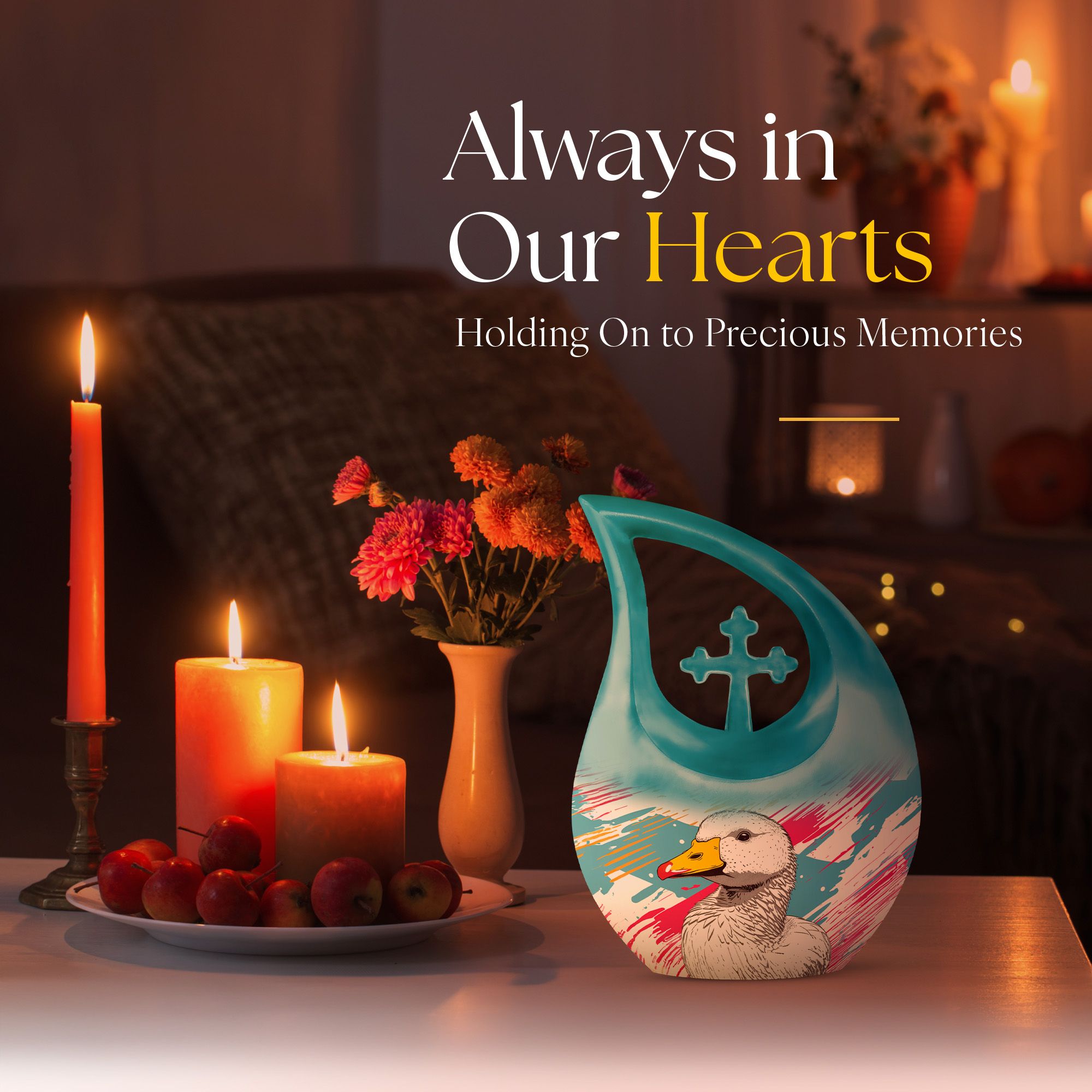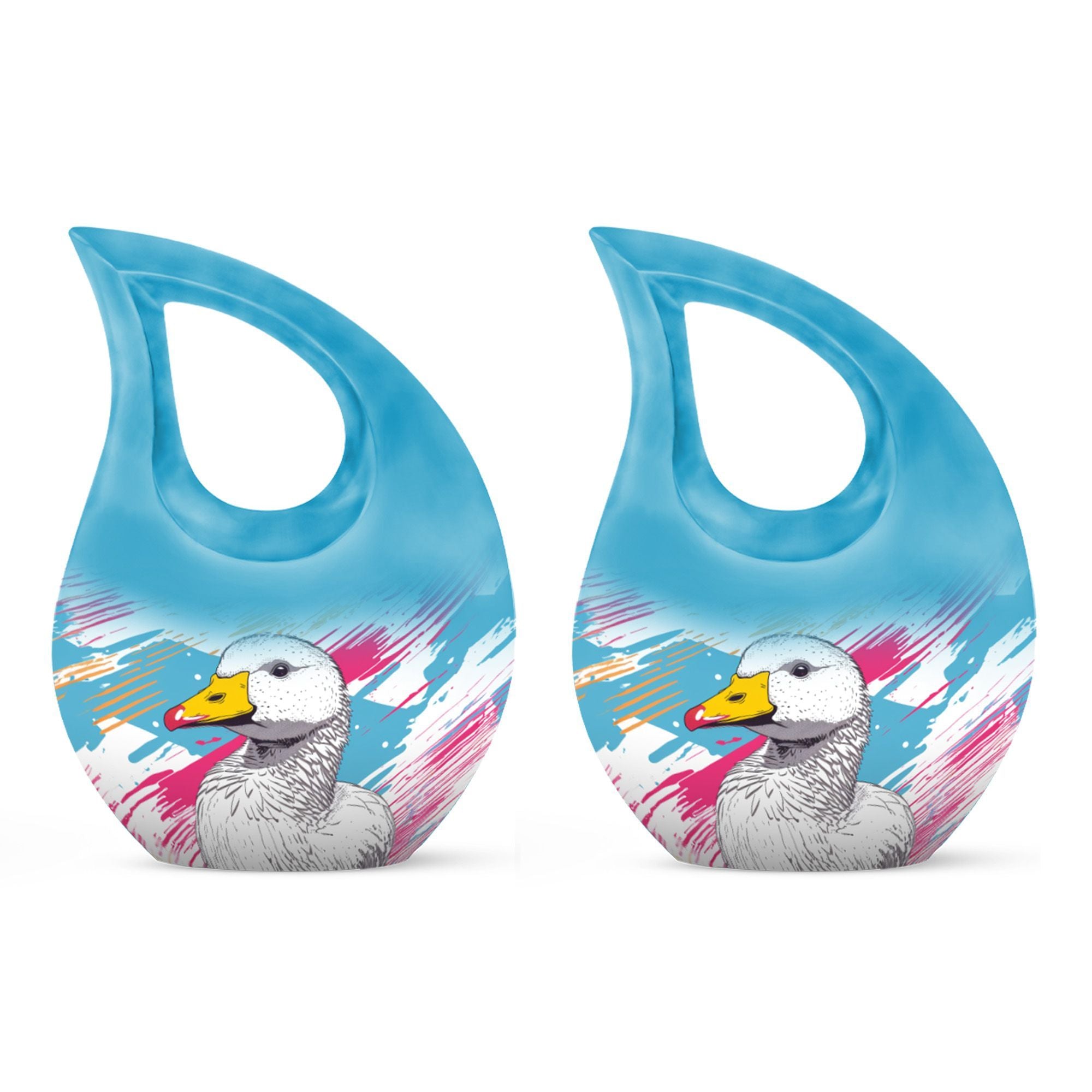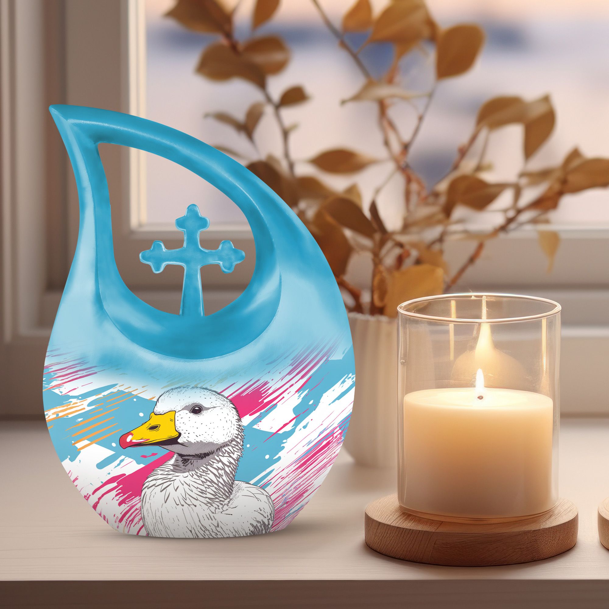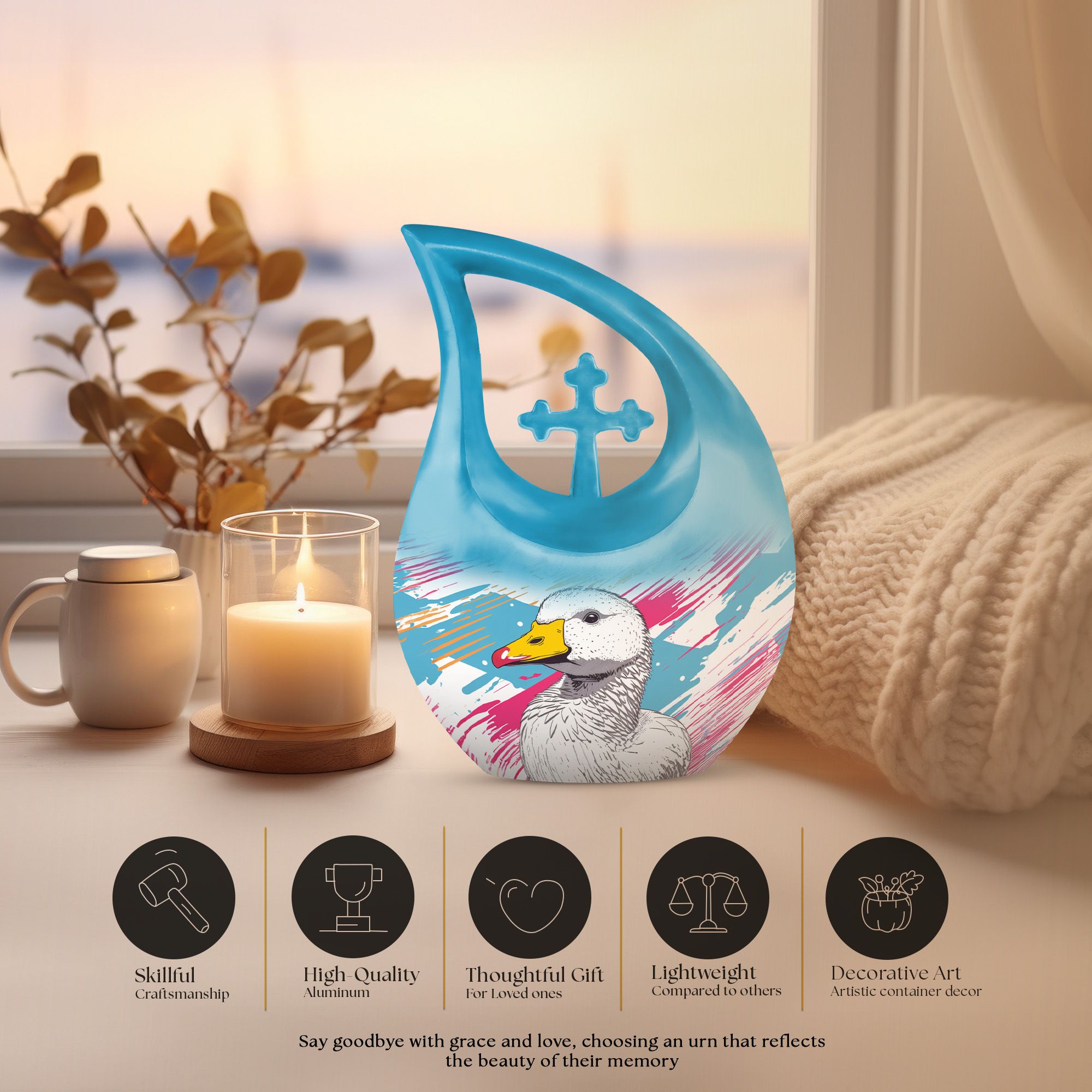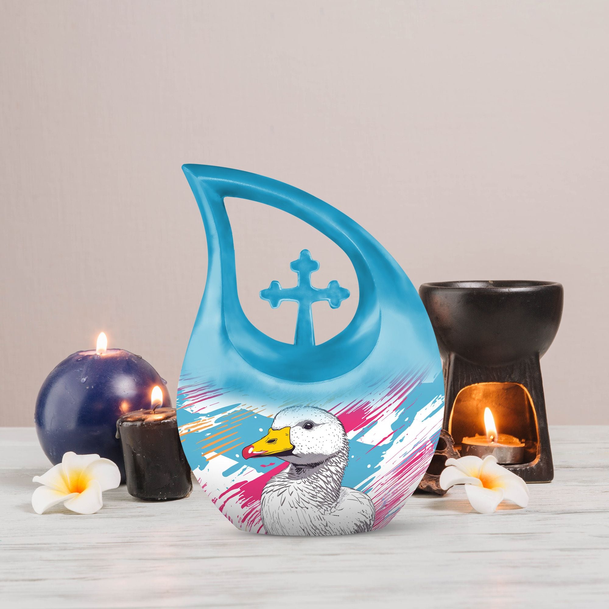 Capture a loved one's vibrancy and radiant personality with the Pop Art Duck Urn, a unique piece in our large cremation urn vaults collection. Standing at an impressive 10 inches in height, each urn is individually crafted from aluminium, promising sturdiness and longevity. With a capacity of 200 cubic inches, these urns comfortably contain ashes, securely stored within an inclusive velvet pouch. They weigh in at 3.3 pounds, making them substantial yet manageable for placement or transport. What sets these memorial urns apart is the distinctive Cross Drop design, symbolizing peace and divine guidance. As a reflection of your personal connection with the departed, each urn allows for customization — engrave cherished names on it for a personal touch. Whether you're searching for urns for ashes near you or keepsake urns for human ashes, our Pop Art Duck Urn strikes a balance between aesthetic and emotional value. It makes for an unforgettable tribute to honour a cherished life lived.