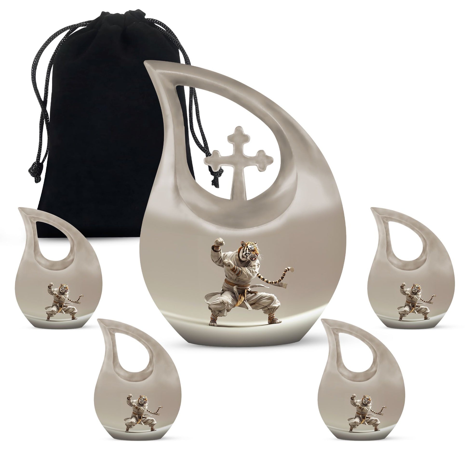Honor your loved one's memory in a unique way with our striking Tiger-themed Large Urn. Specially designed as an online exclusive item, this 10-inch memorial urn is delicately crafted from exceptional quality aluminium and is sturdy enough to weigh 3.3 pounds. Its mesmerizing 'Cross Drop' design ingredient is a gentle reminder of love, loss, and remembrance. Every detail, from its impressive 200 cubic inches capacity to its meticulous form, is unequivocally captivating. For added convenience, each purchase includes a plush velvet pouch, precisely designed to safeguard the precious ashes of your beloved. Your personal touch can be added by engraving names, effectively transforming this urn into a poignant keepsake memory box. With Tiger Urn, memorializing is not just an act, but an exquisite journey of recollection. Unparalleled in its class, our Large Urn is a testament to the enduring bond of love and an artful alternative to traditional cremation boxes for adults. Explore and purchase urns online from our exclusive range today.