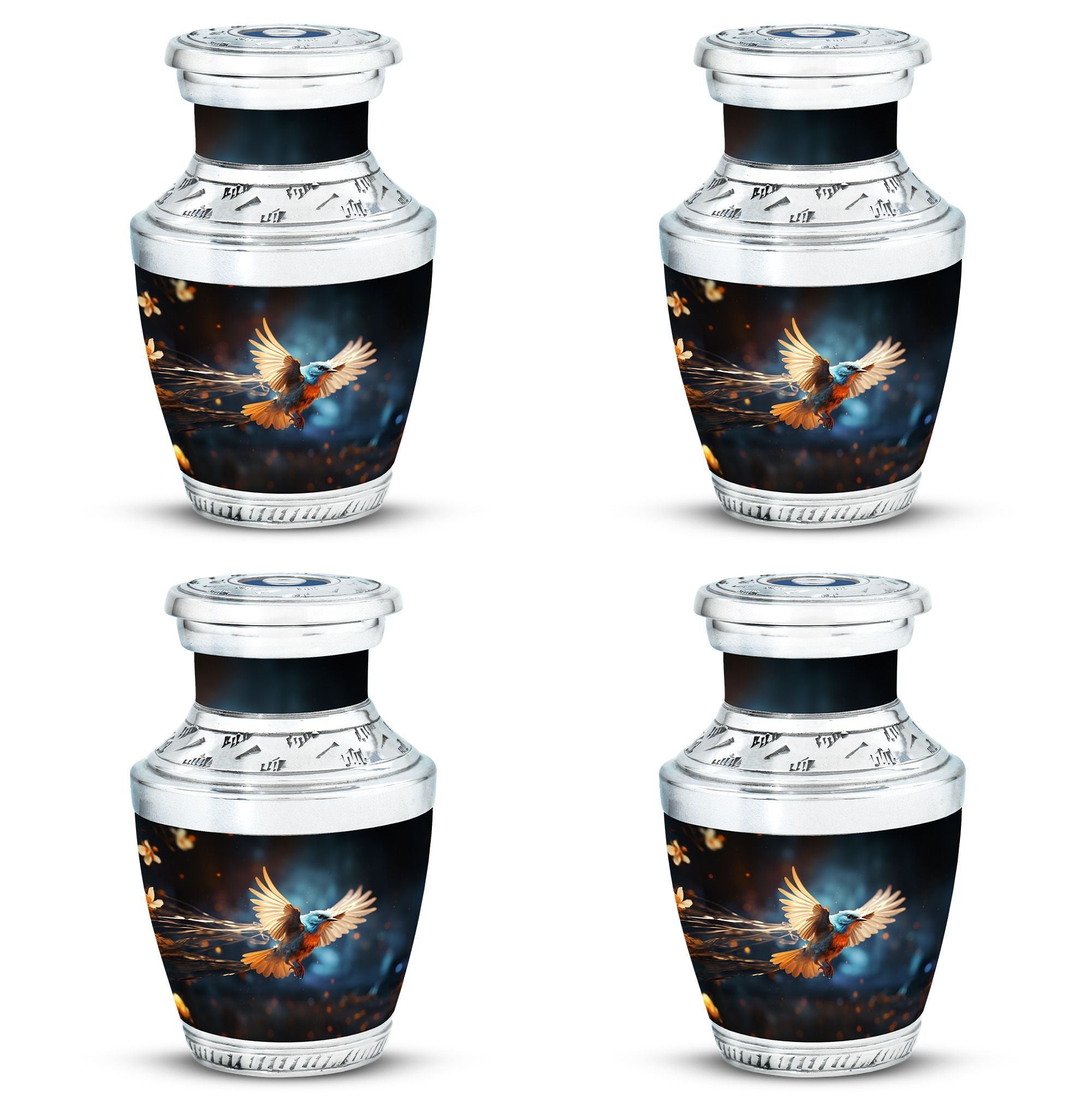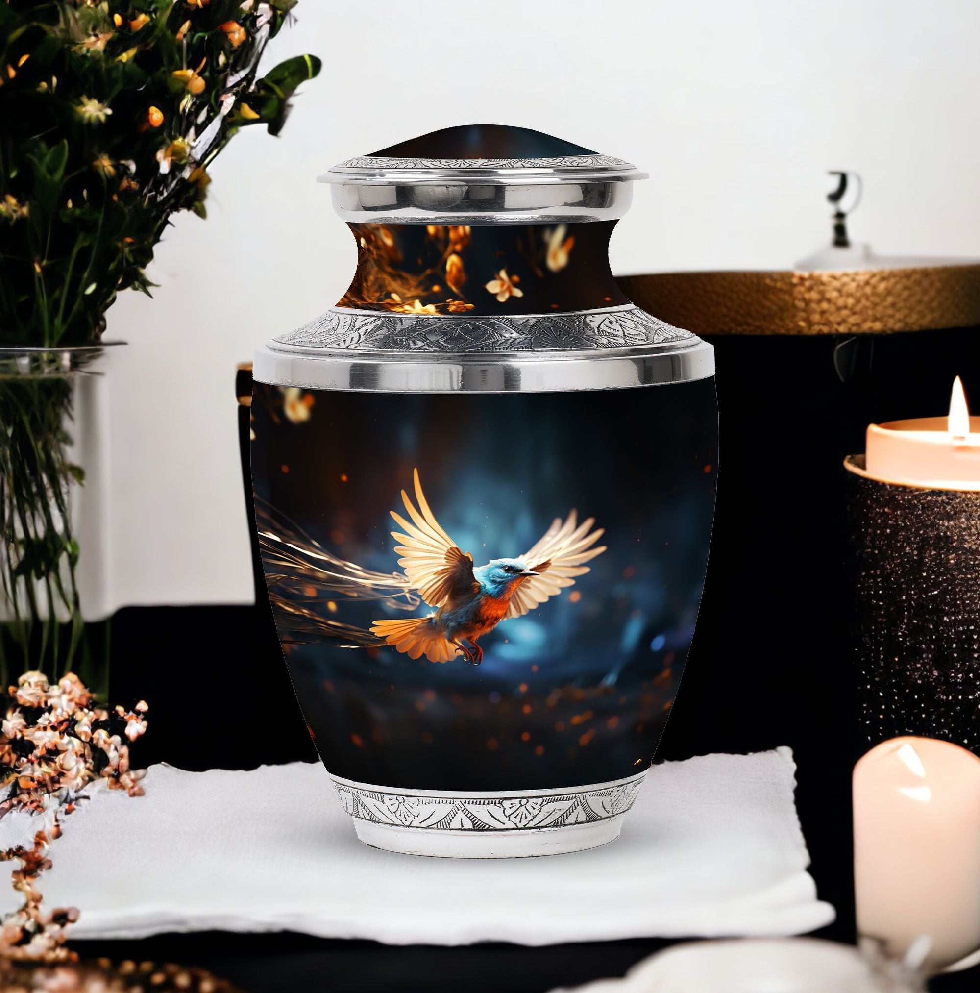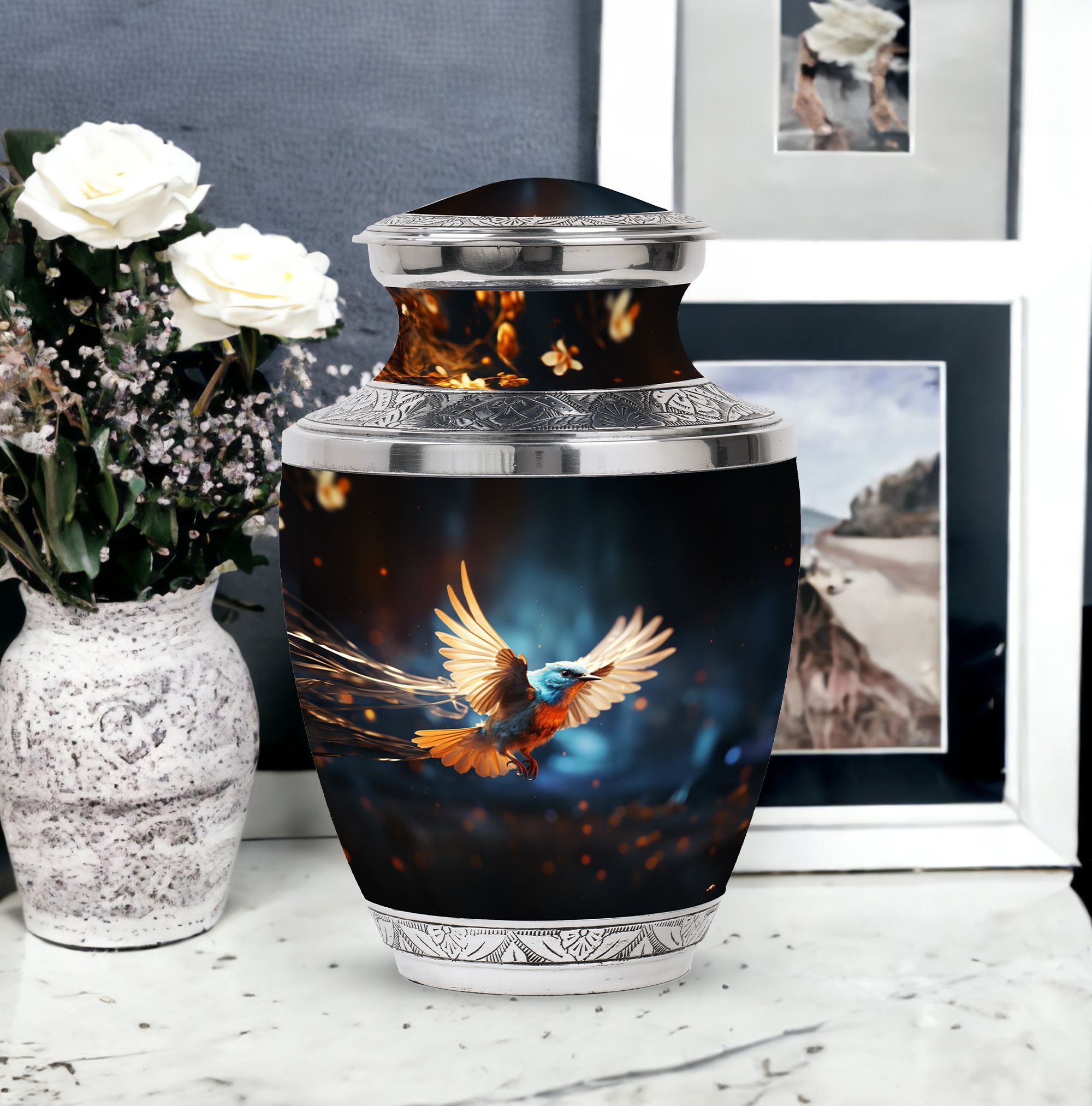Experiencedly crafted, the Red Sparrow Flying Urn is one of our unique large urns that stand impressively at a height of 10 inches. This cremation urn, specially designed for adults and seniors, holds a capacity of 200 cubic inches and weighs modestly at 3.3 pounds. Impressively lightweight for its size. The urn is made from high-quality Aluminium, adding a touch of sturdy elegance to its overall appeal. The package comes with a soft velvet pouch for safekeeping of the ashes, ensuring they hold a special place in your heart for eternity. The small urn for ashes is fully customizable, with the ability to personalize through engraved names, making it truly one-of-a-kind. The Red Sparrow urn, filled with reverence and respect, is an exceptional choice among burial urns for ashes. It marries traditional aesthetics with a modern urn design. Capture the essence of a loved one's spirit in a way that is both beautiful and personalised, just like their life was.