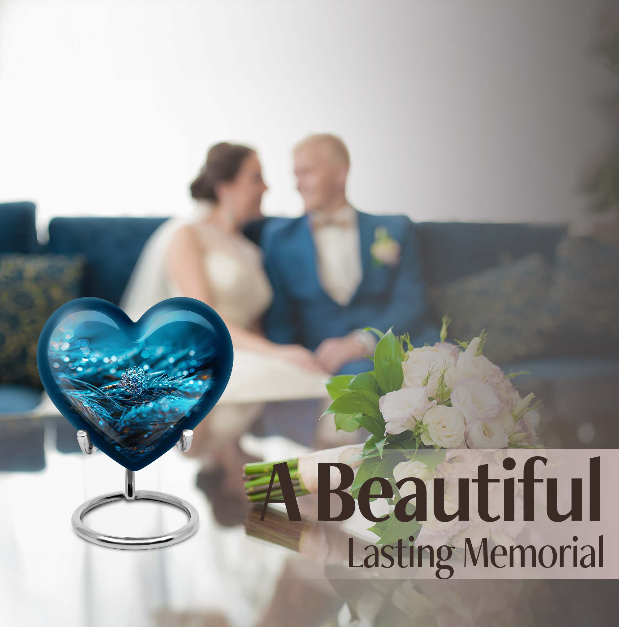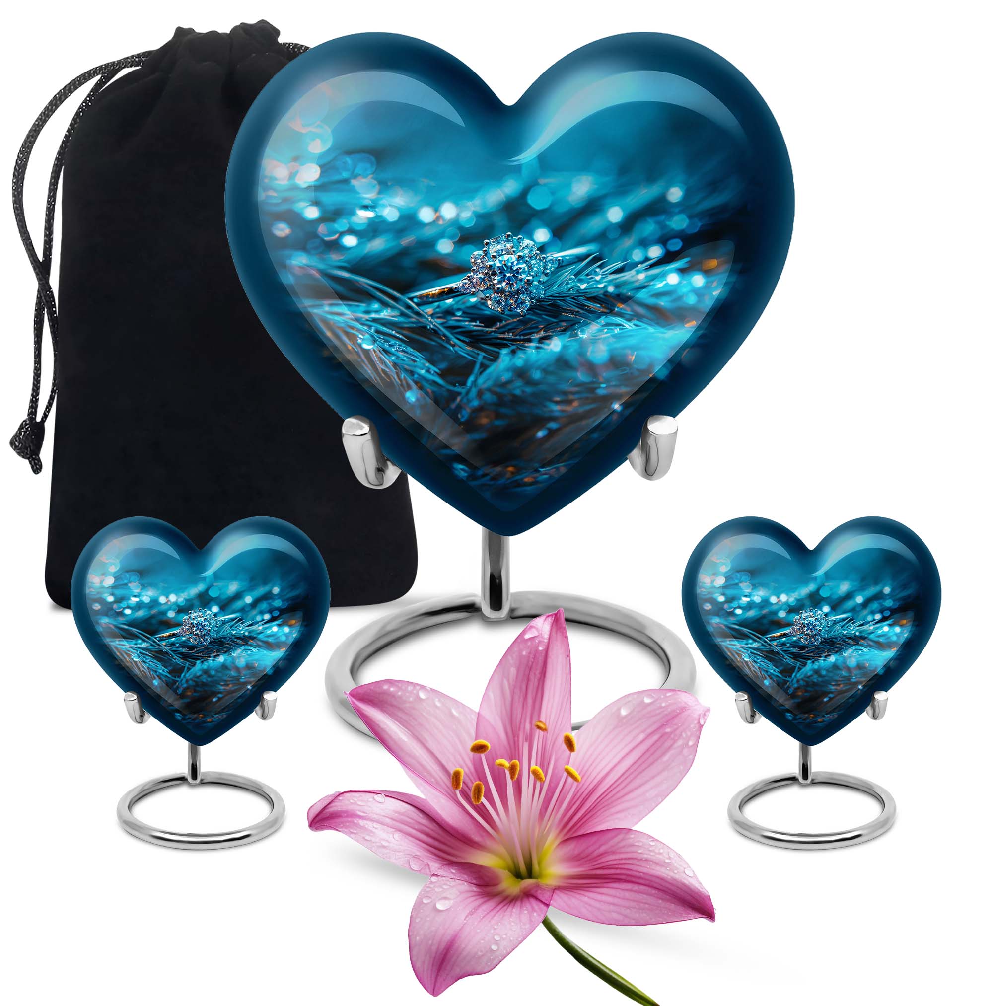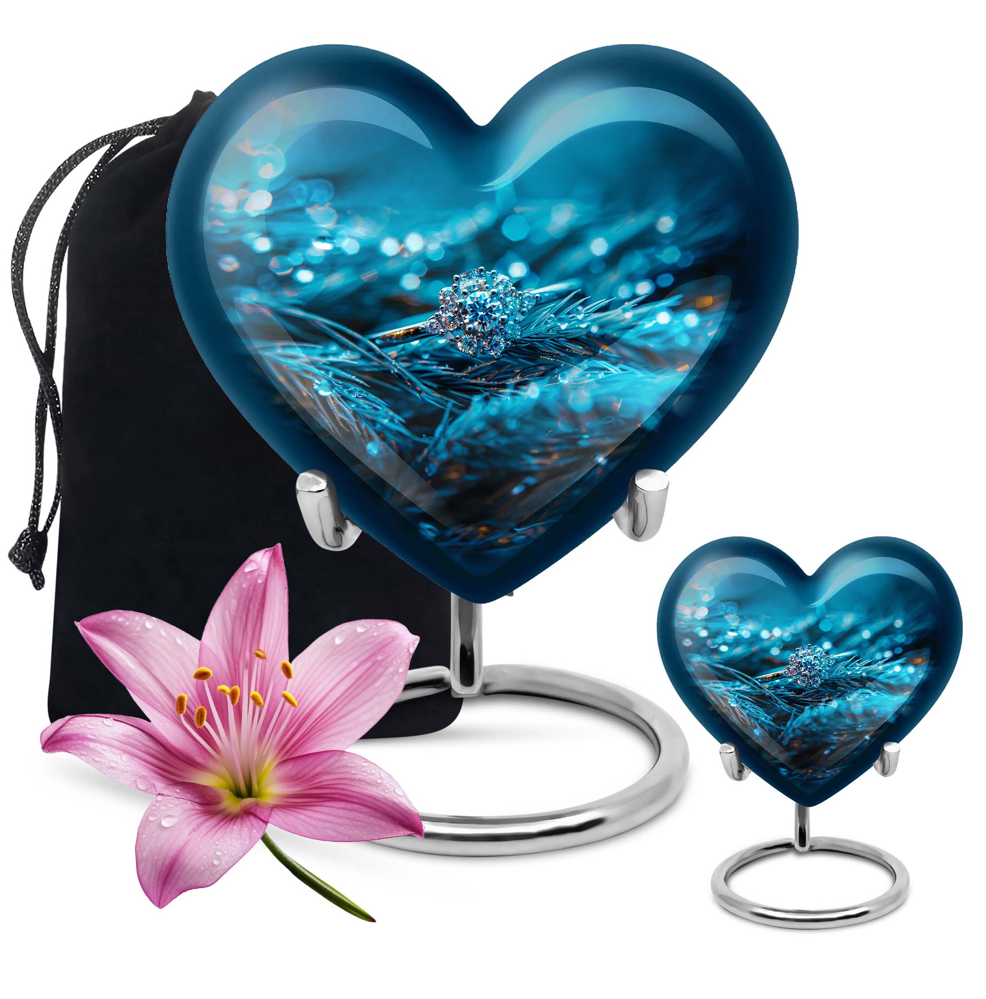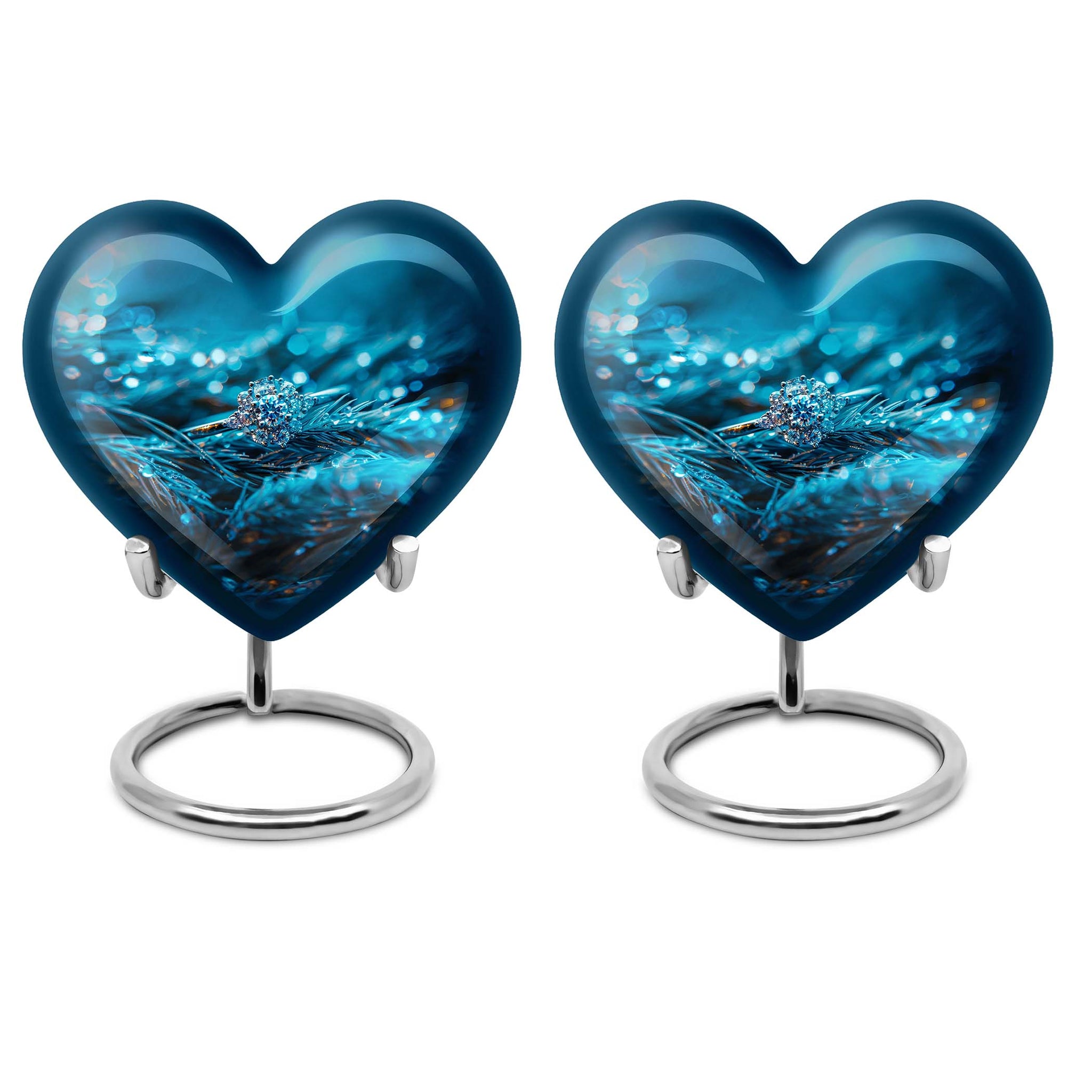 Experience the serenity of cherishing the memory of your loved ones with our exquisite Heart Urn, a quintessential part of memorial ceremony supplies. This 10-inch Ring Urn, meticulously constructed from high-quality aluminum, offers a weight of 3.3 pounds for steady positioning. The abstract theme of our large urn adds a unique allure, perfectly complementing the aesthetic of any space. Our urn provides a remarkable capacity of 200 cubic inches, ideal for storing adult ashes. Tucked within an elegant velvet pouch, this urn ensures secure containment of ashes, aiding in the preservation of your precious memories. Take a step further by personalizing the urn with engraved names, transforming it into a unique and heartfelt tribute to the lost ones. Discovered under the 'memorial ash urns' category, this Funeral urn beautifully encapsulates all the loving memories. Whether you are searching for 'funeral urns for men's ashes' or 'elegant memorial urns', this premium offering rises to the occasion with its exceptional features and touching sentiment.