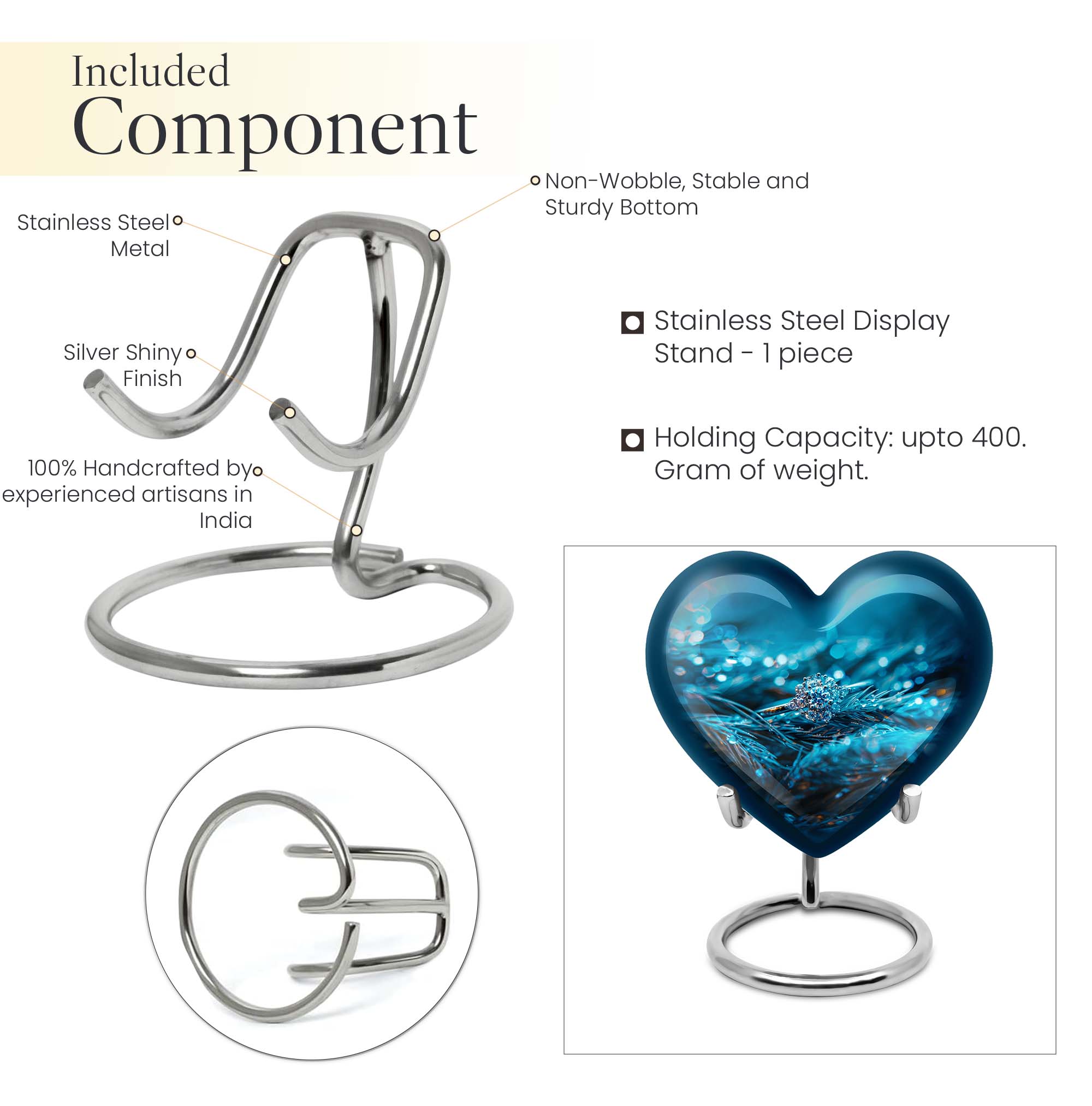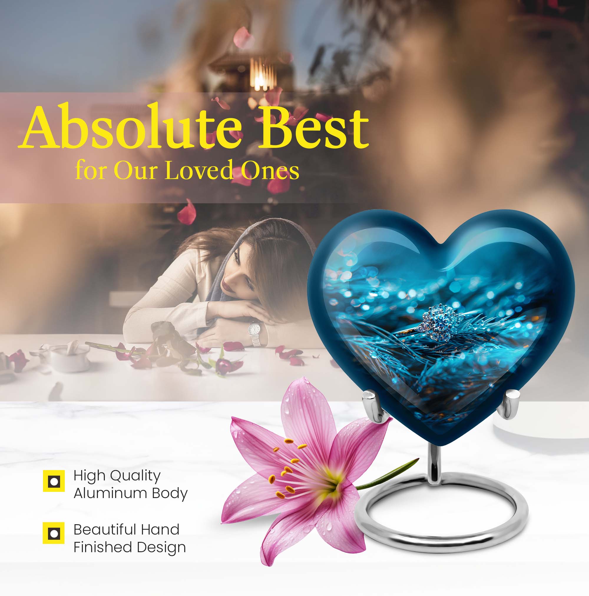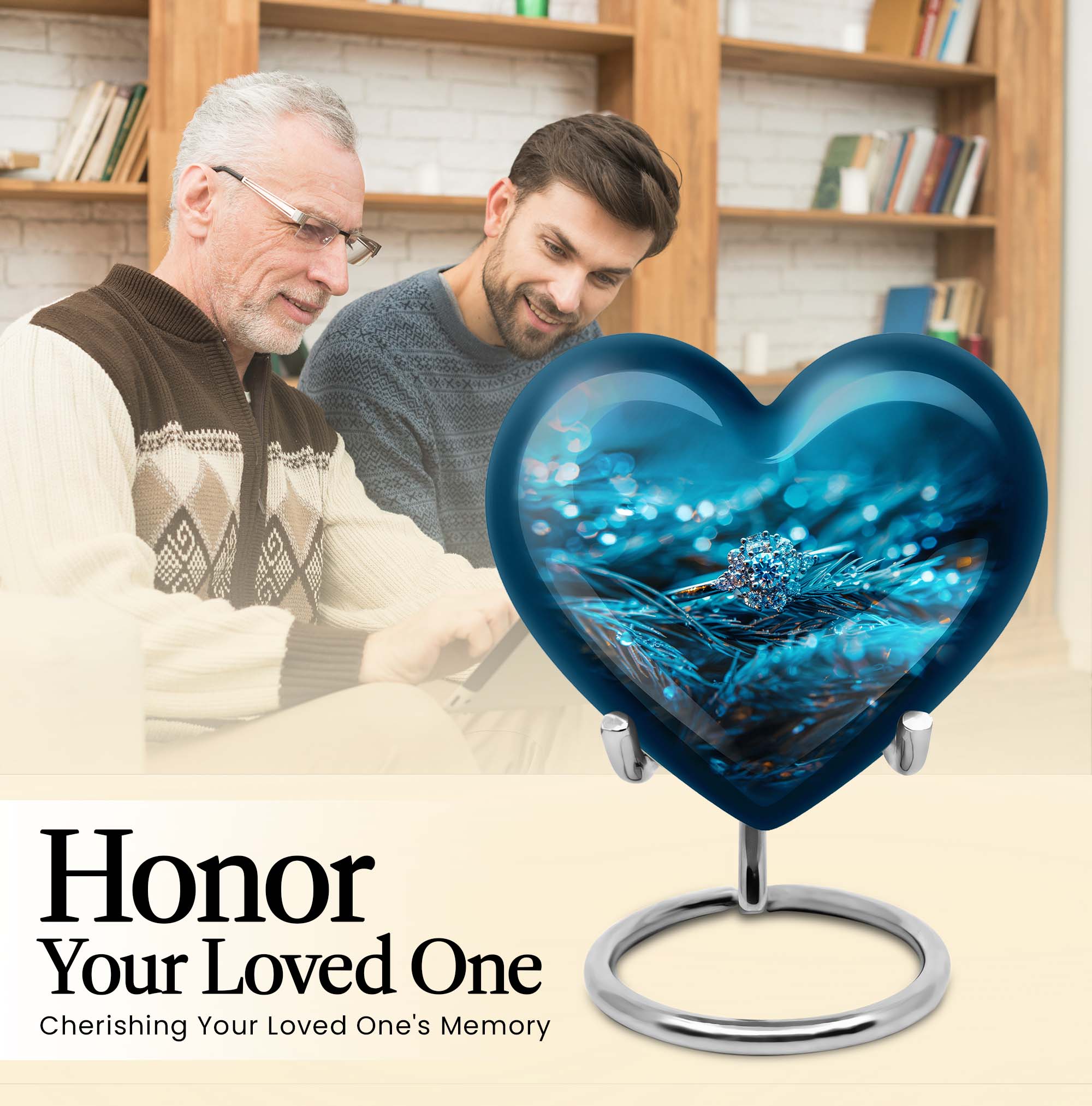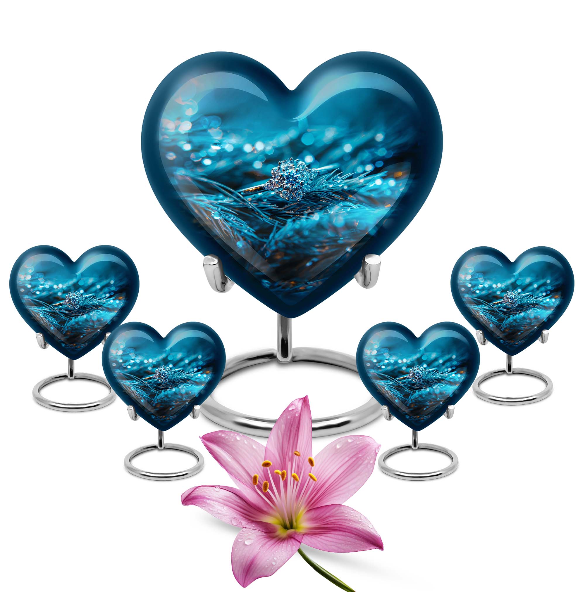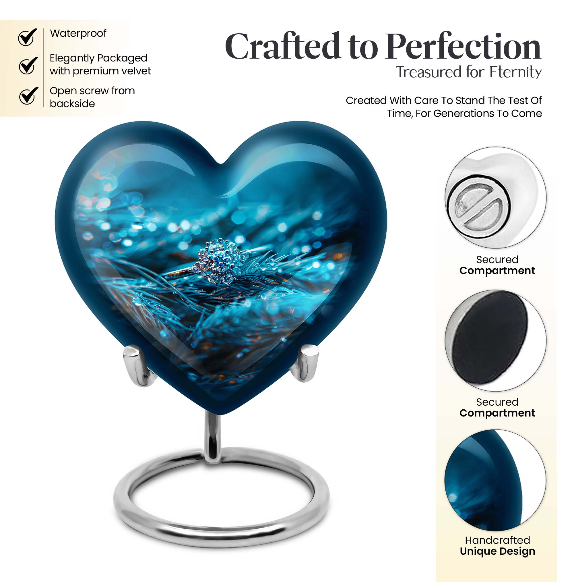 Experience the serenity of cherishing the memory of your loved ones with our exquisite Heart Urn, a quintessential part of memorial ceremony supplies. This 10-inch Ring Urn, meticulously constructed from high-quality aluminum, offers a weight of 3.3 pounds for steady positioning. The abstract theme of our large urn adds a unique allure, perfectly complementing the aesthetic of any space. Our urn provides a remarkable capacity of 200 cubic inches, ideal for storing adult ashes. Tucked within an elegant velvet pouch, this urn ensures secure containment of ashes, aiding in the preservation of your precious memories. Take a step further by personalizing the urn with engraved names, transforming it into a unique and heartfelt tribute to the lost ones. Discovered under the 'memorial ash urns' category, this Funeral urn beautifully encapsulates all the loving memories. Whether you are searching for 'funeral urns for men's ashes' or 'elegant memorial urns', this premium offering rises to the occasion with its exceptional features and touching sentiment.