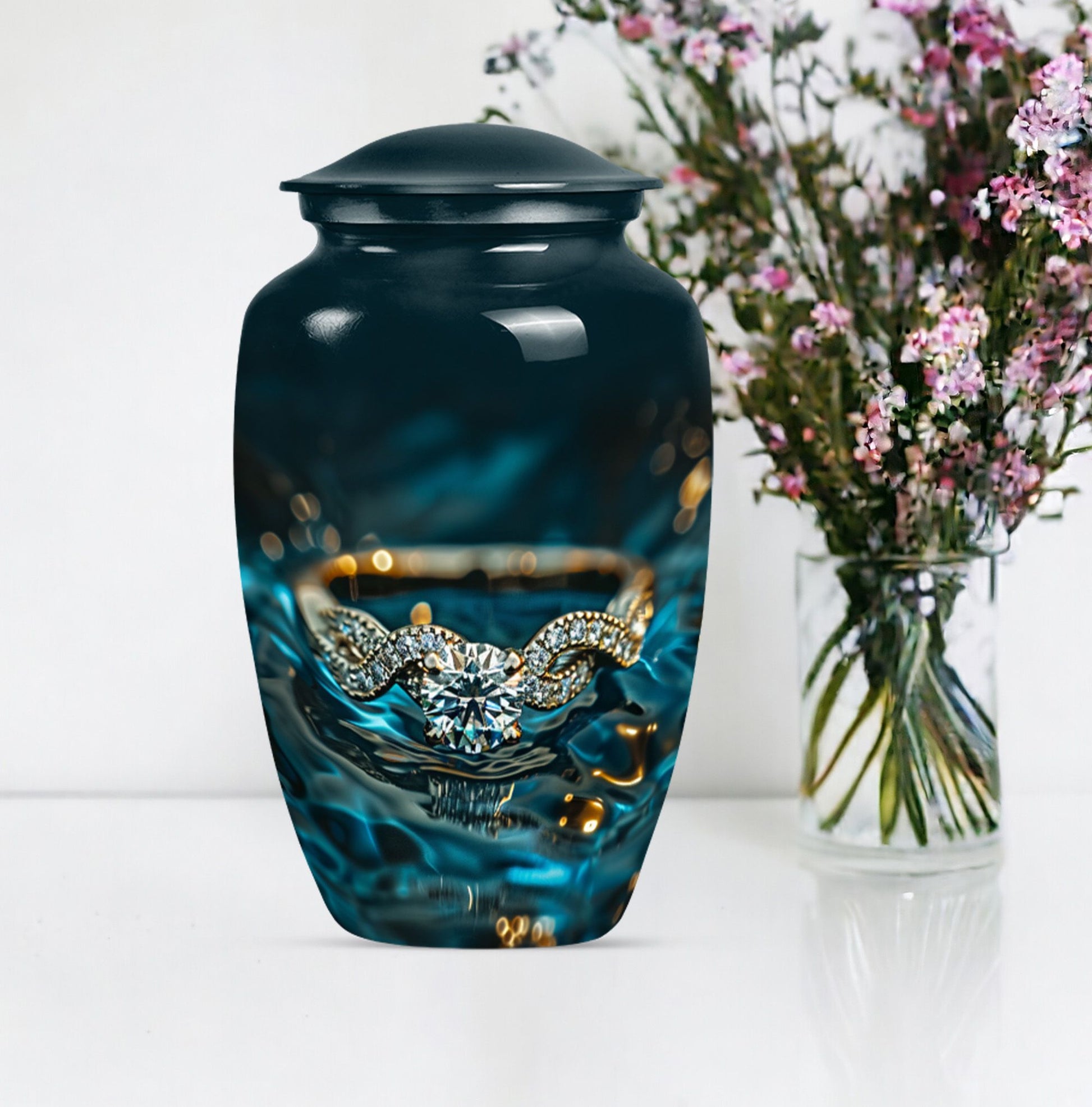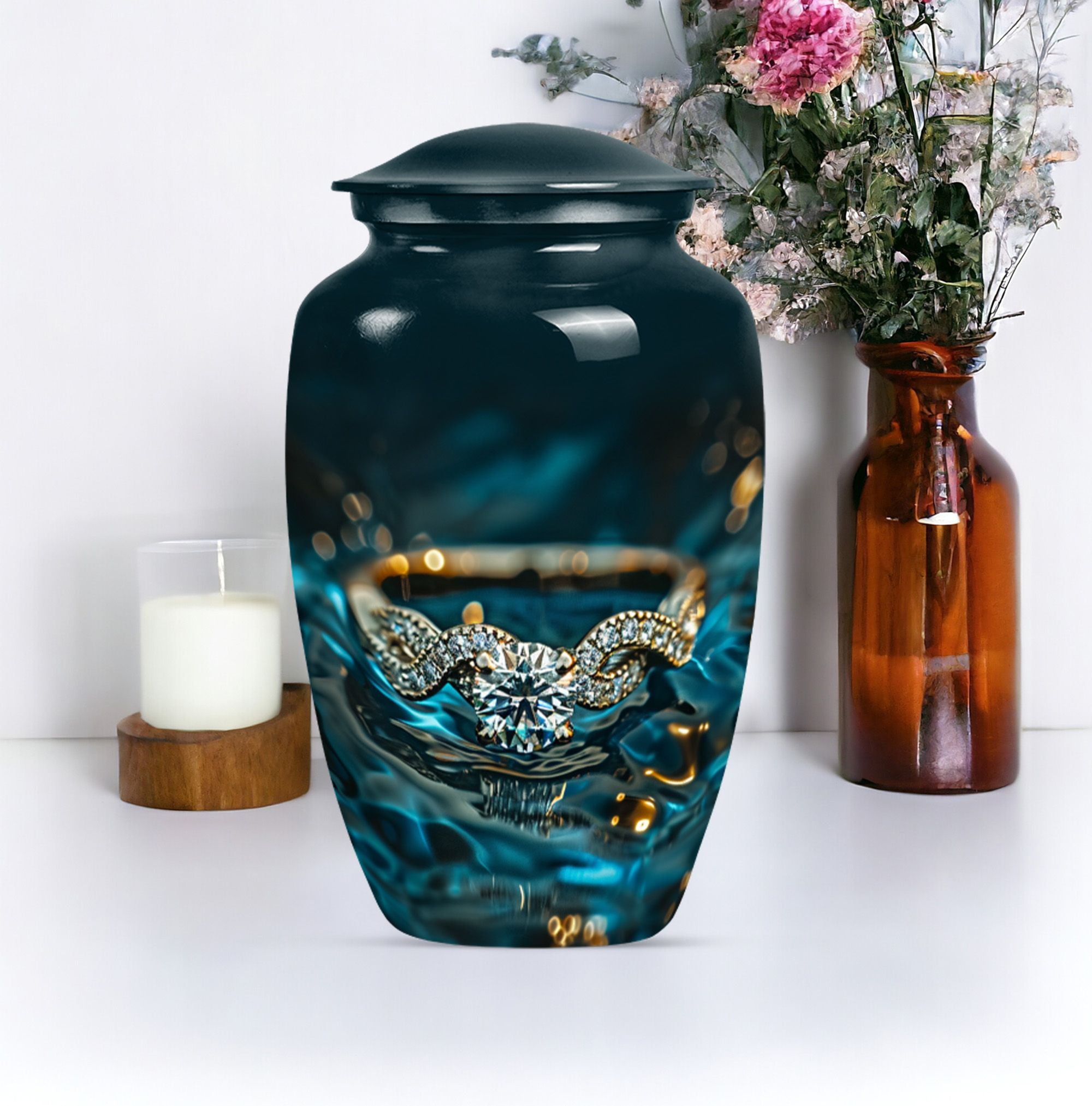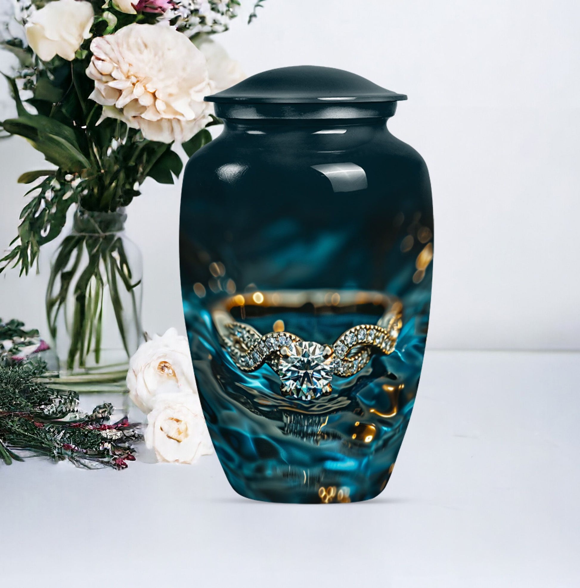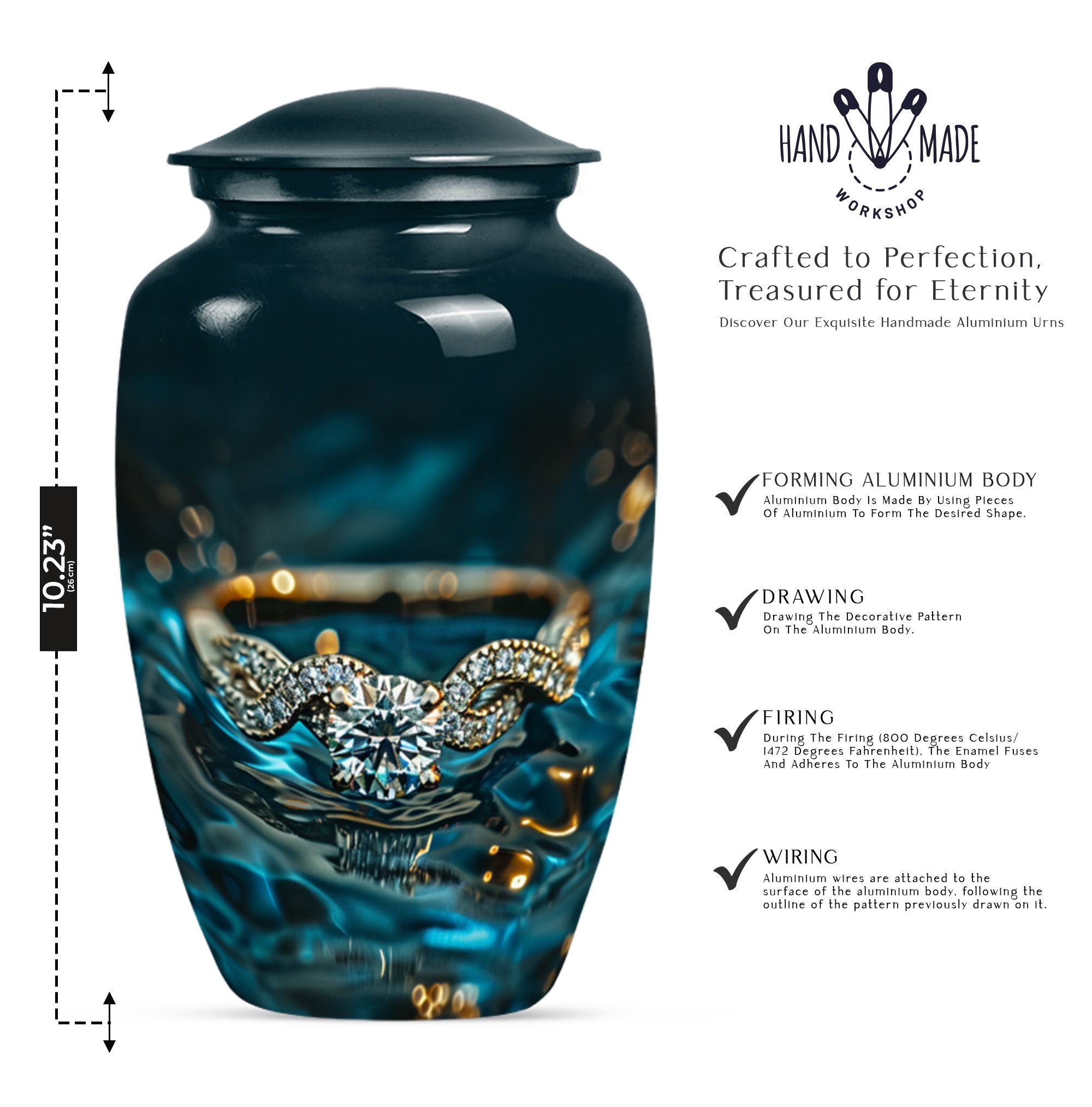 Featuring a size of 10 Inches, this Classic Ring Urn serves as a dignified memorial human urn for ashes. Crafted from sturdy and durable aluminium, it weighs a substantial 3.3 pounds, cementing a tangible presence dedicated to your loved ones. Its 10-Inch height and capacity of 200 cubic inches ensure ample space, making this an ideal 'large urn'. The shape and theme are abstract, providing both a modern design and a comforting, timeless presence. Provided alongside this cremation urn is a velvet pouch, offering tender containment and respect to the ashes. The urn offers the ability for personalization, allowing you to engrave names and perpetuate the memory of your loved ones. As a metal large urn, it perfectly caters to those searching for 'Memorial funeral urns for ashes', 'adult burial urn', or 'ashes of love'. Honor the memory of your dearly departed with this large then life urn, a fitting tribute to their lasting impact.