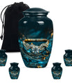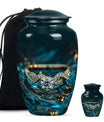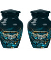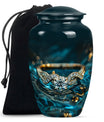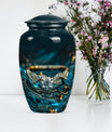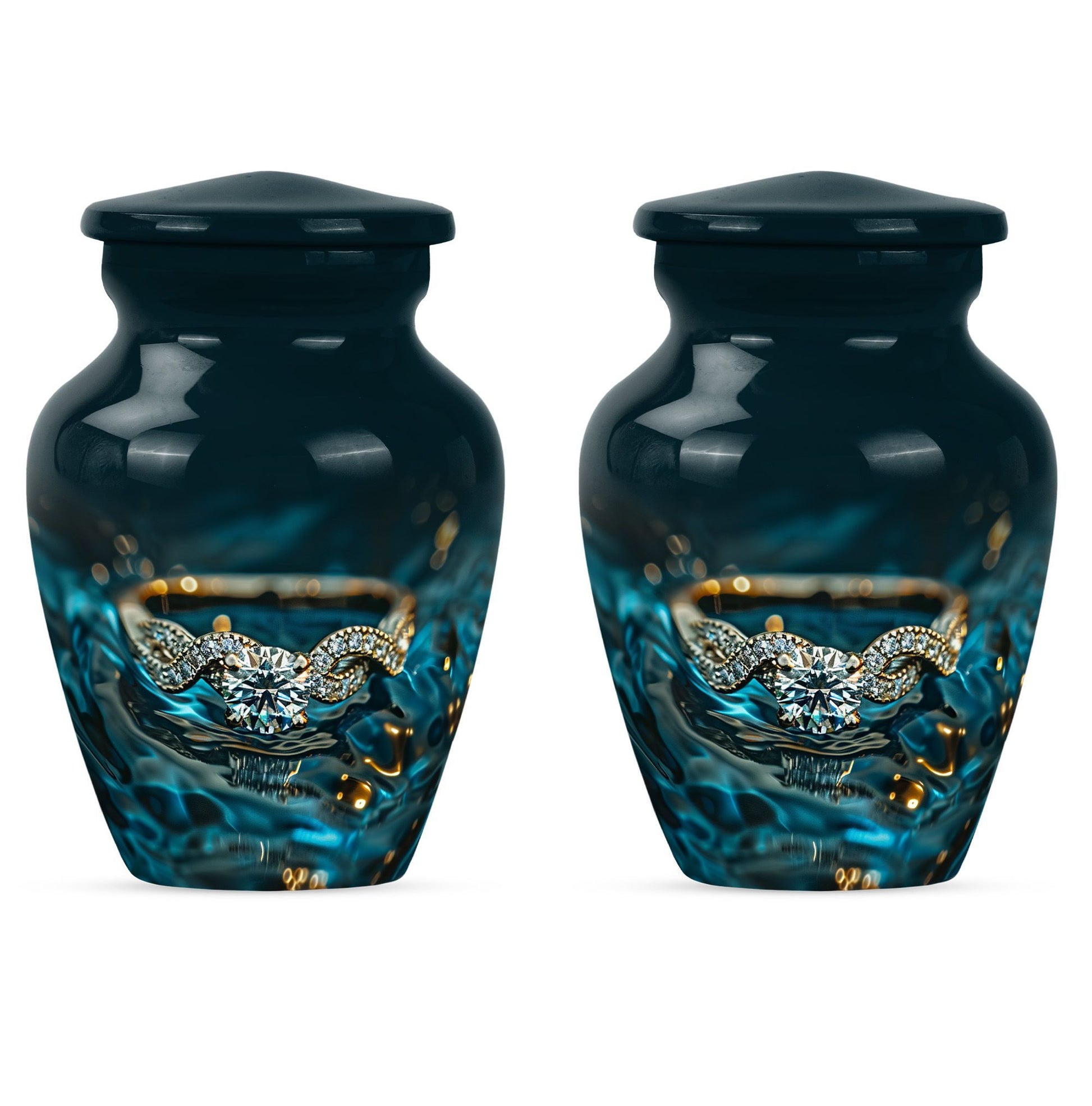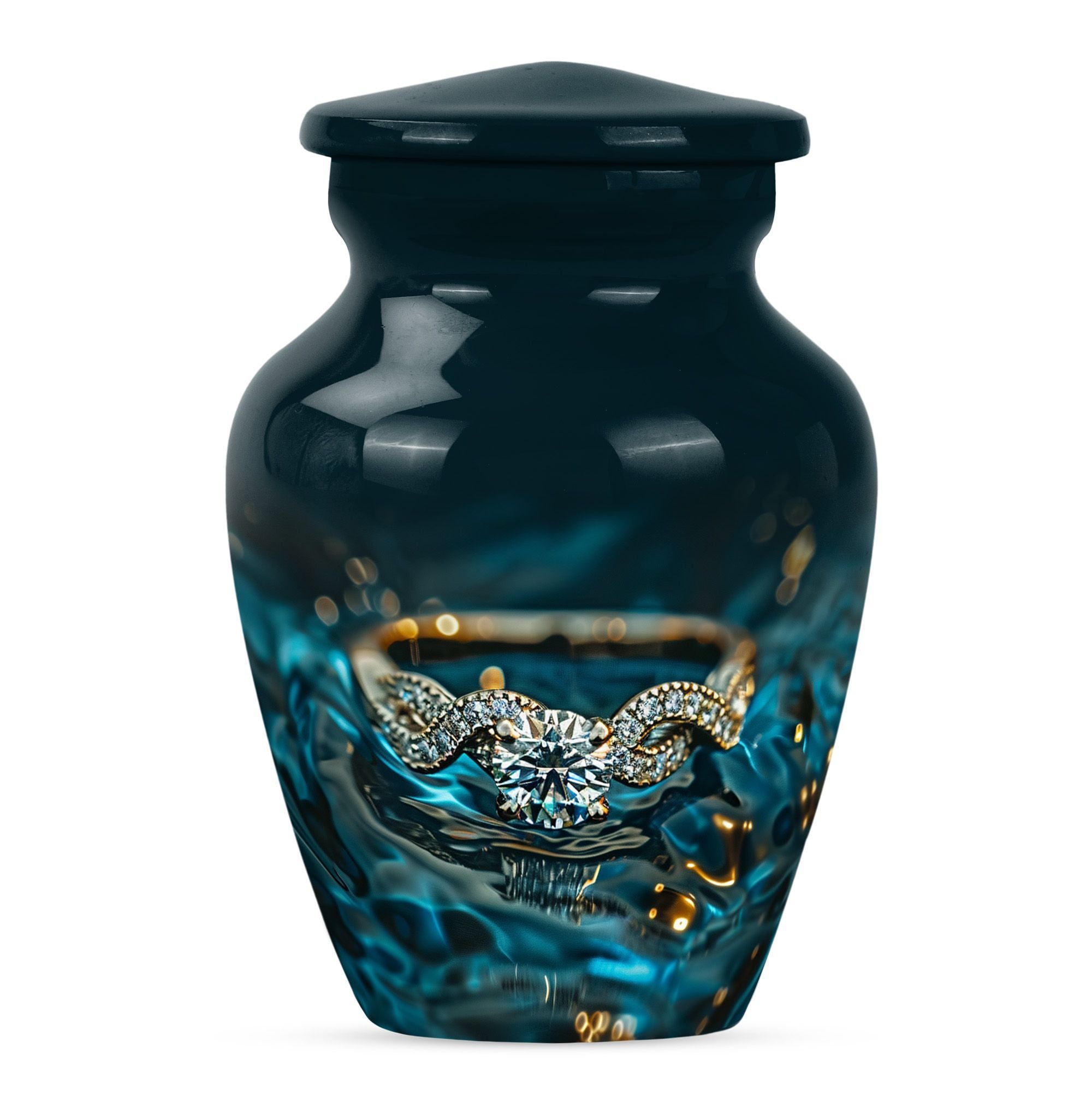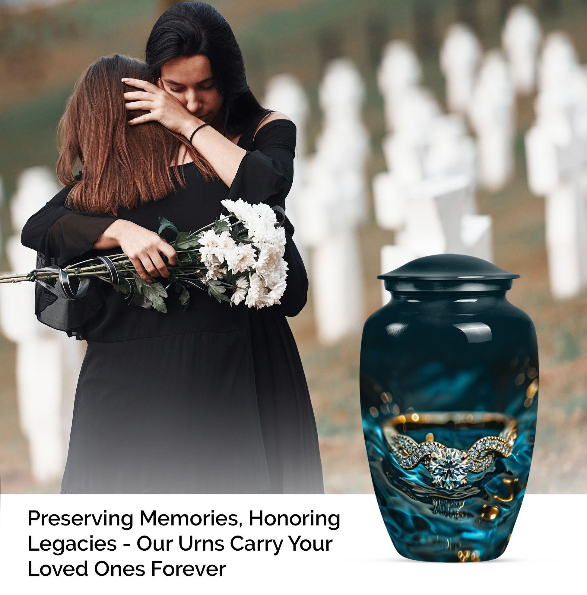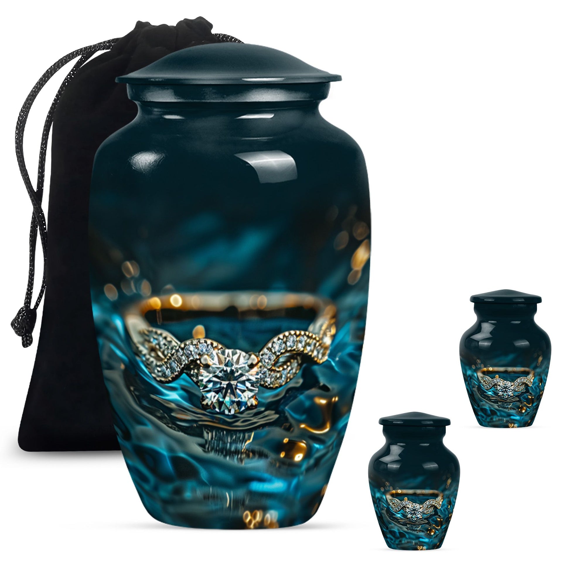 Featuring a size of 10 Inches, this Classic Ring Urn serves as a dignified memorial human urn for ashes. Crafted from sturdy and durable aluminium, it weighs a substantial 3.3 pounds, cementing a tangible presence dedicated to your loved ones. Its 10-Inch height and capacity of 200 cubic inches ensure ample space, making this an ideal 'large urn'. The shape and theme are abstract, providing both a modern design and a comforting, timeless presence. Provided alongside this cremation urn is a velvet pouch, offering tender containment and respect to the ashes. The urn offers the ability for personalization, allowing you to engrave names and perpetuate the memory of your loved ones. As a metal large urn, it perfectly caters to those searching for 'Memorial funeral urns for ashes', 'adult burial urn', or 'ashes of love'. Honor the memory of your dearly departed with this large then life urn, a fitting tribute to their lasting impact.