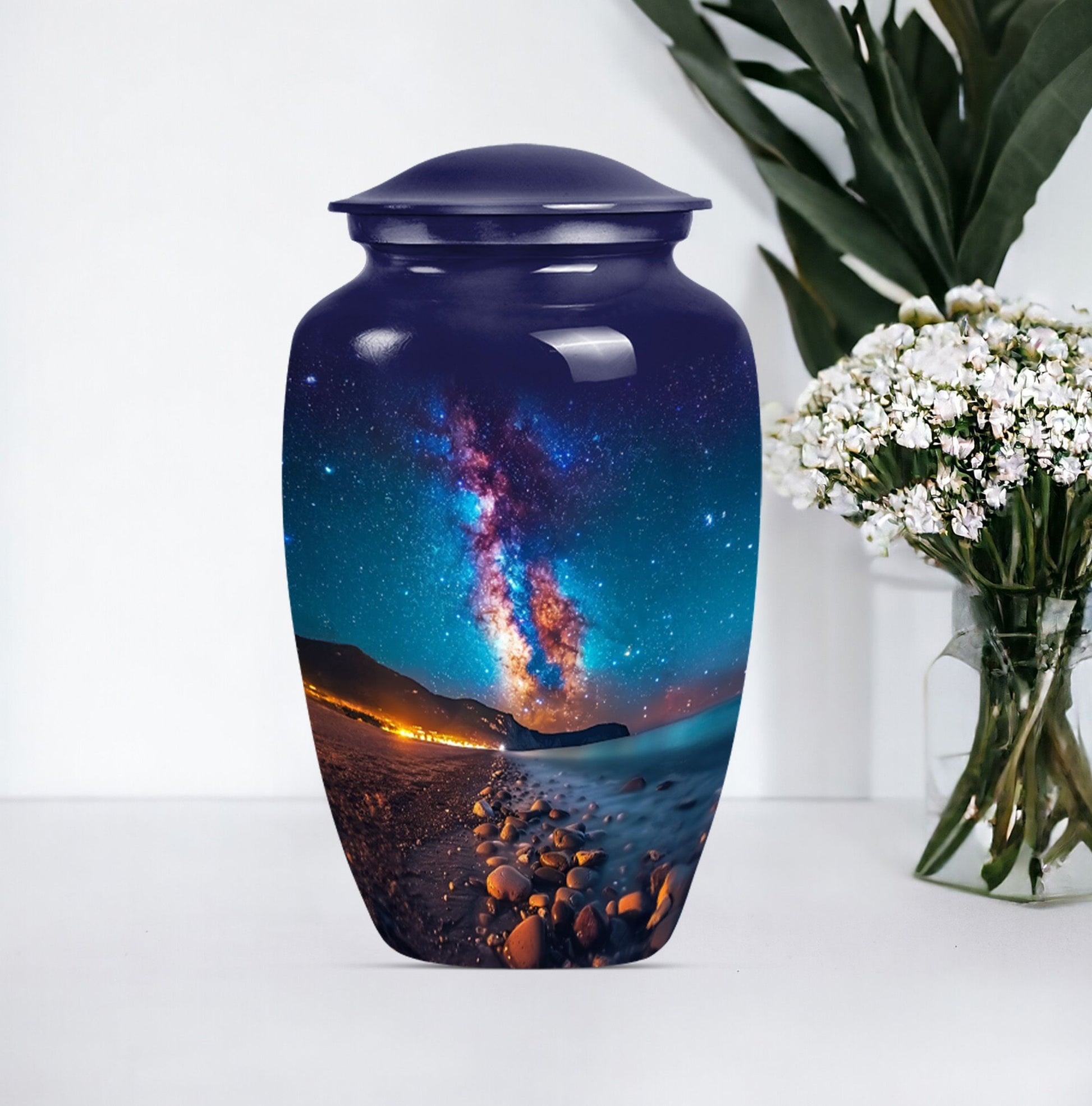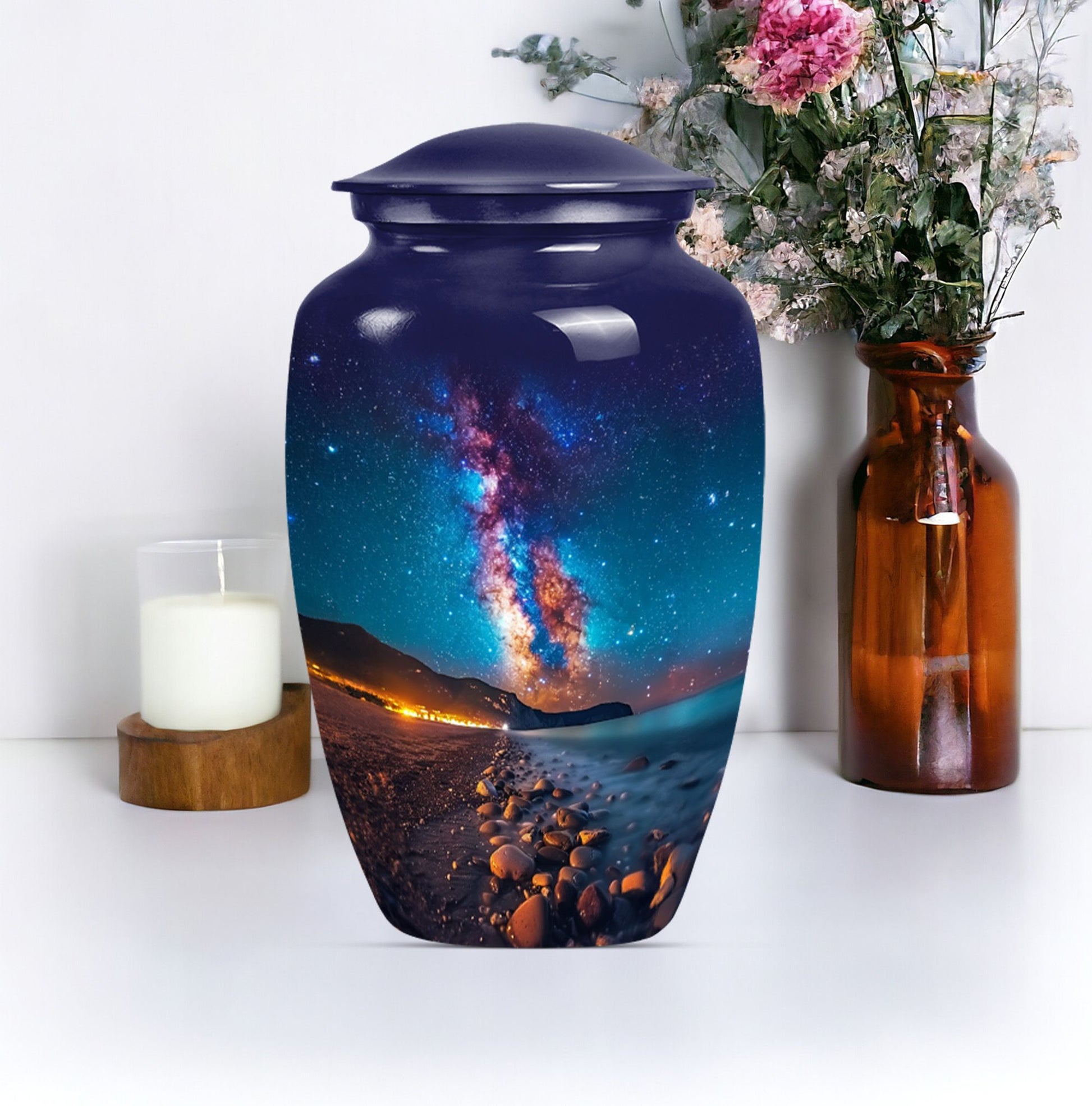 One's journey in this temporal world may cease, but the memories remain forever. The 'Classic Urn' is a celebration of those cherished moments - a respectful and secure memorial for your beloved. The 10-inch height makes this large urn ample enough to hold 200 cubic inches of ashes, and it weighs a substantial 3.3 pounds indicating its robust construction. Its abstract theme provides an understated yet striking reminder of the cycle of life. This urn, constructed from long-lasting aluminium, comes with personalised engraving options for that uniquely touching tribute to your departed. A supplementary velvet pouch offers discreet inclusion of ashes. Keep in mind, 'Milkyway Urn' or 'funeral funeral urns for human ashes adult' when searching online. Some use the term 'memorial urn for burial in the ground' or 'human ash urn ash adult', while 'cremation rings for ashes' and 'large metal urn for ashes' are also common terms associated with this item. Please note that our urn design excludes the 'Design' attribute. Maintain your loved one's memory in an honorable, dignified manner with our classic urn.