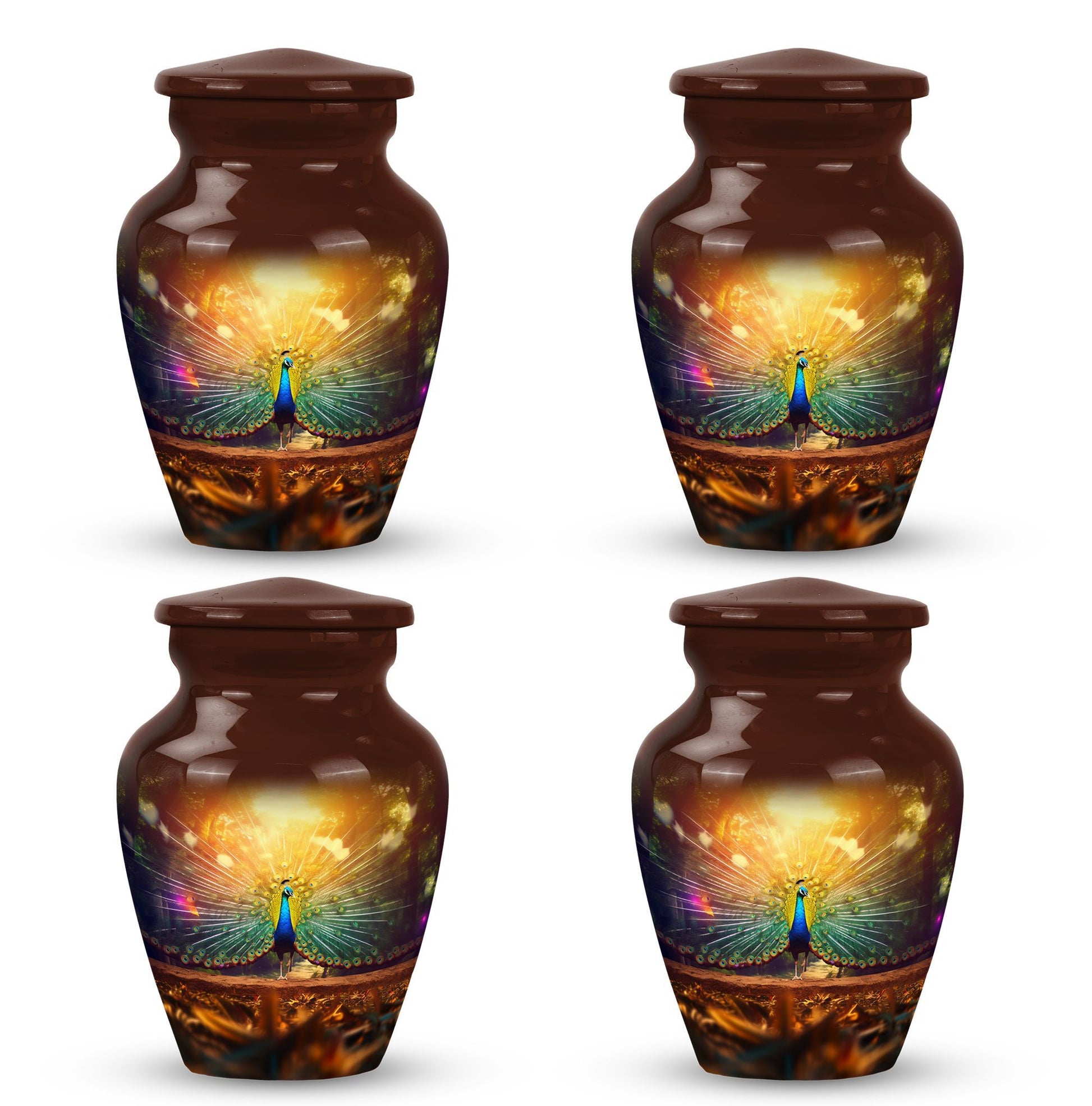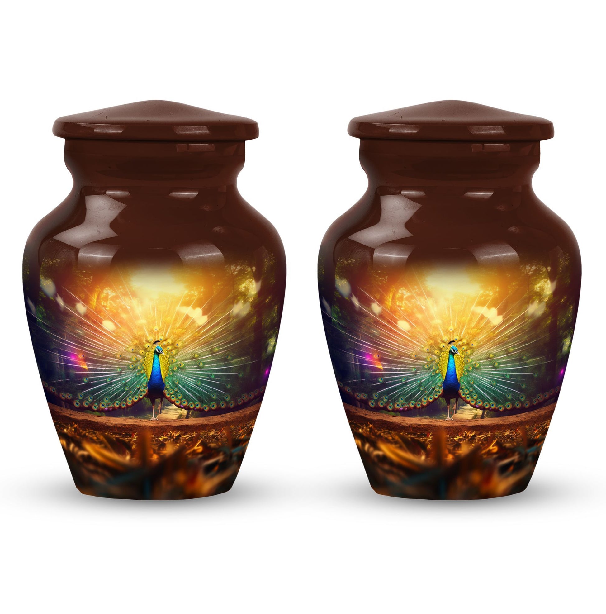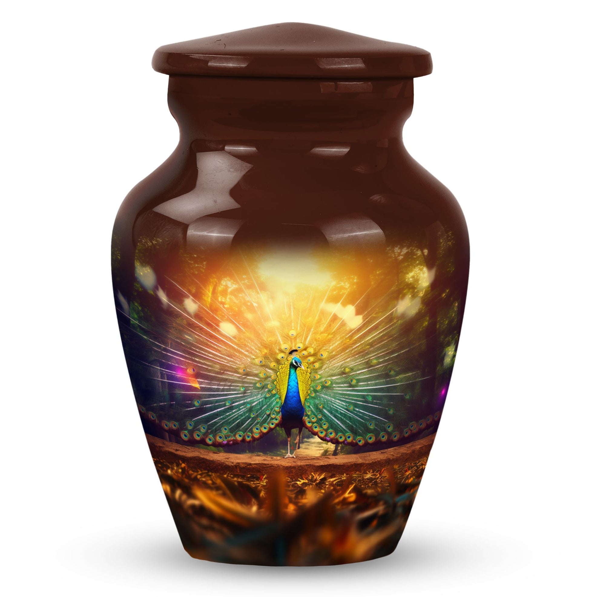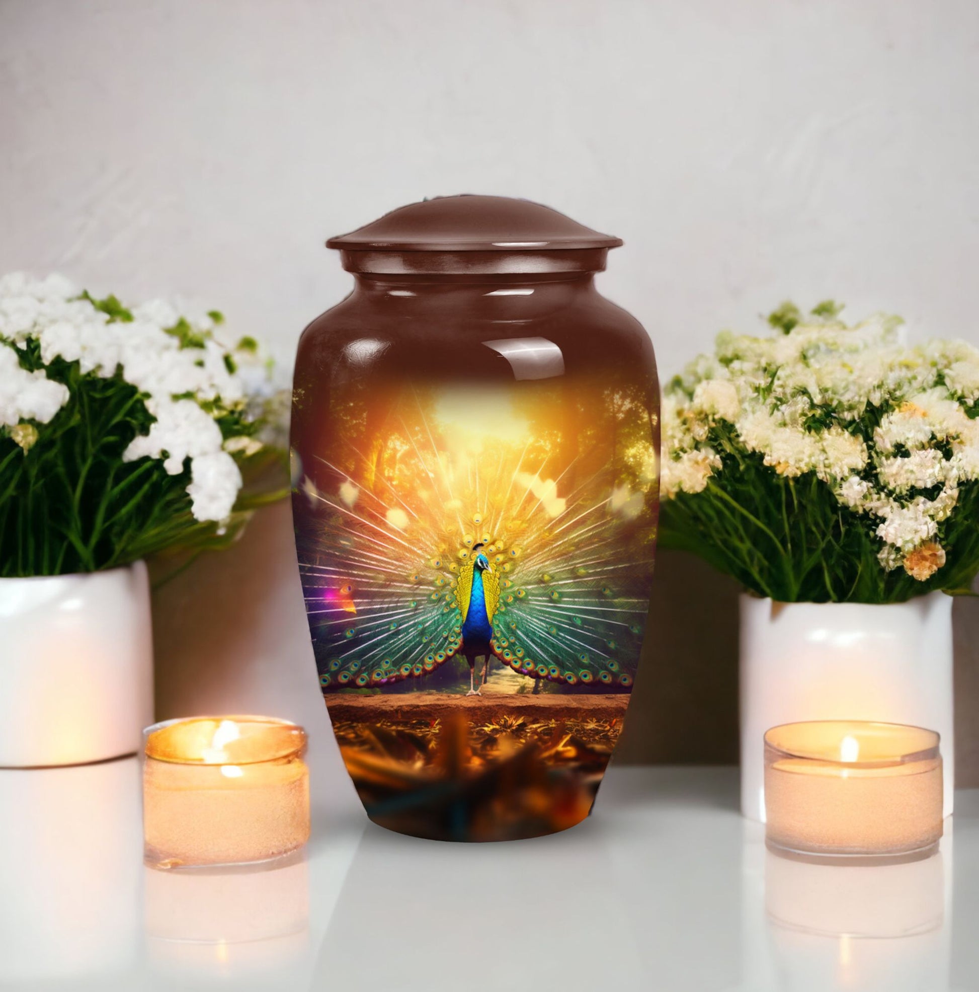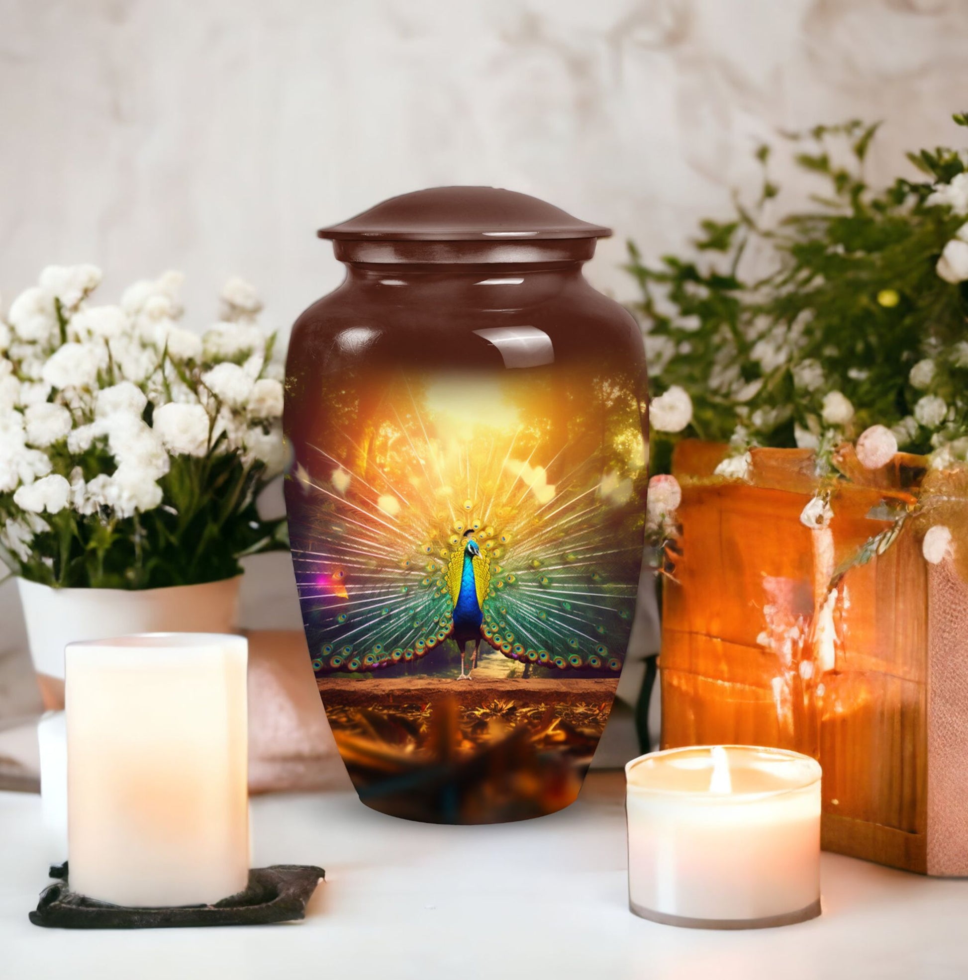 Discover solace in our superbly crafted Peacock Urns for Ashes. These urns for cremation personally create a memorial for your cherished ones. If you search for modern urns for ashes personalized, you've arrived at the right spot. Our 3 inches, remarkably made, Aluminum-built Classic Urn has room for up to 200 cubic inches of ashes, representing a weight of nearly 3.3 pounds. This dignified container, standing 10 inches tall, is the ideal size for large urns, ensuring your cherished one's legacy continues to live on. Accompanied by a delicate velvet pouch, this urn safeguards the ashes securely. Plus, there is an option for added personalization - Engrave your loved one's name onto the urn, creating a unique emblem of their lifetime. Ideal for human cremation ashes, these metal urns offer a distinguished and respectful remembrance option.
