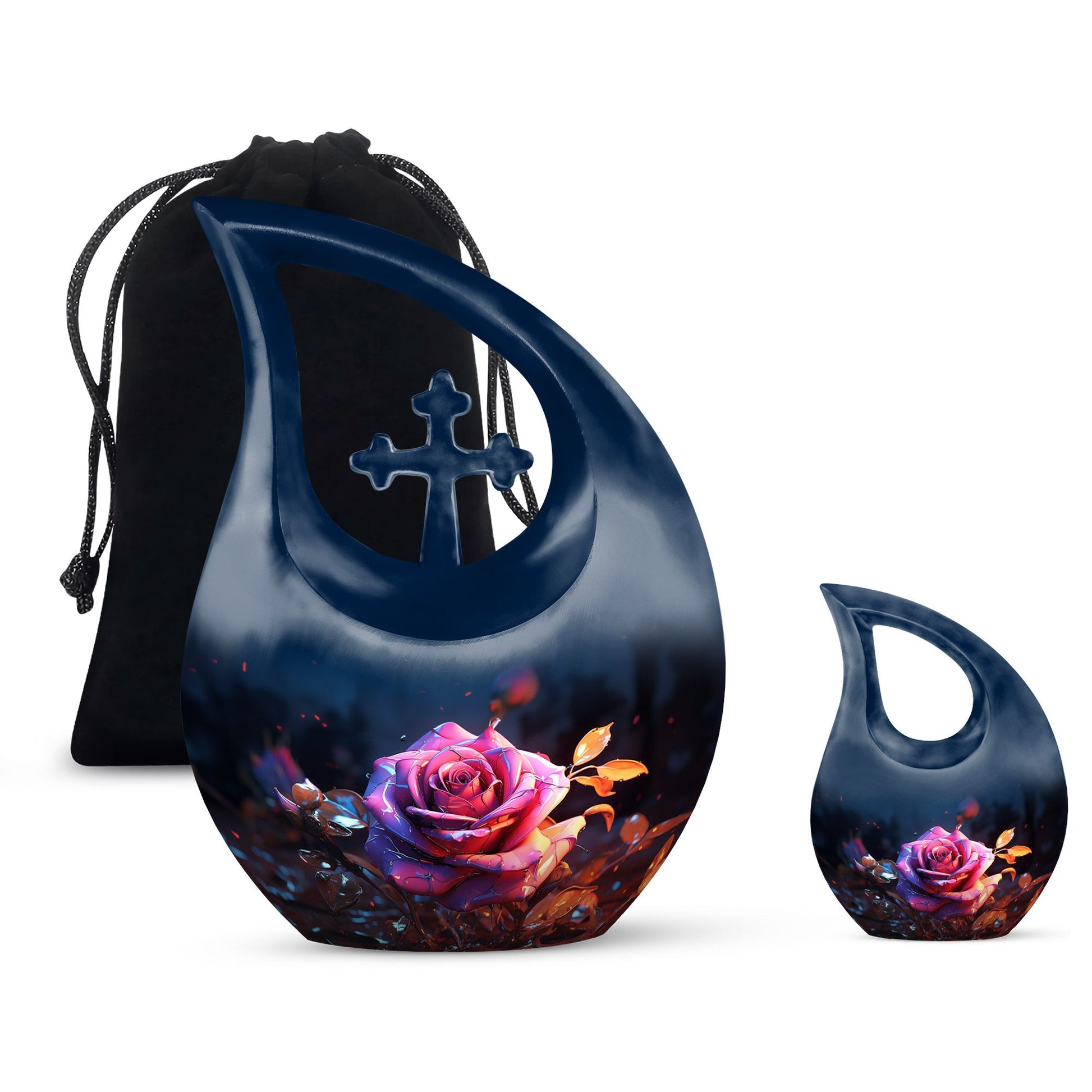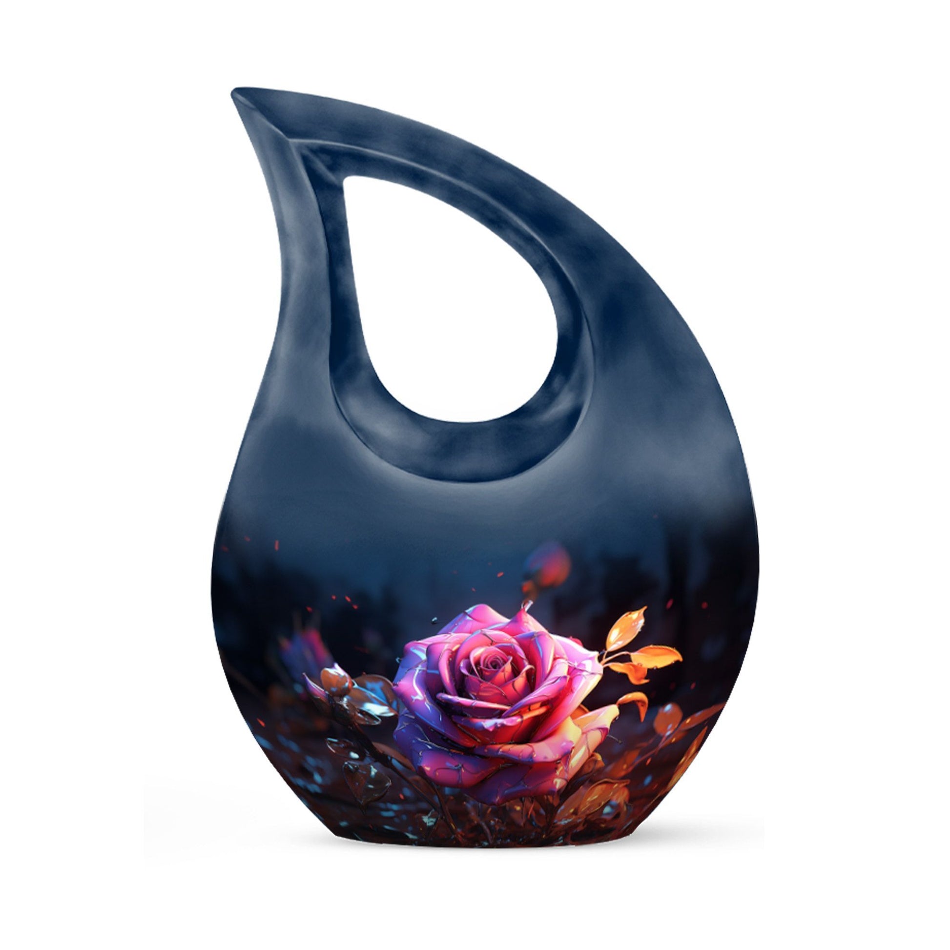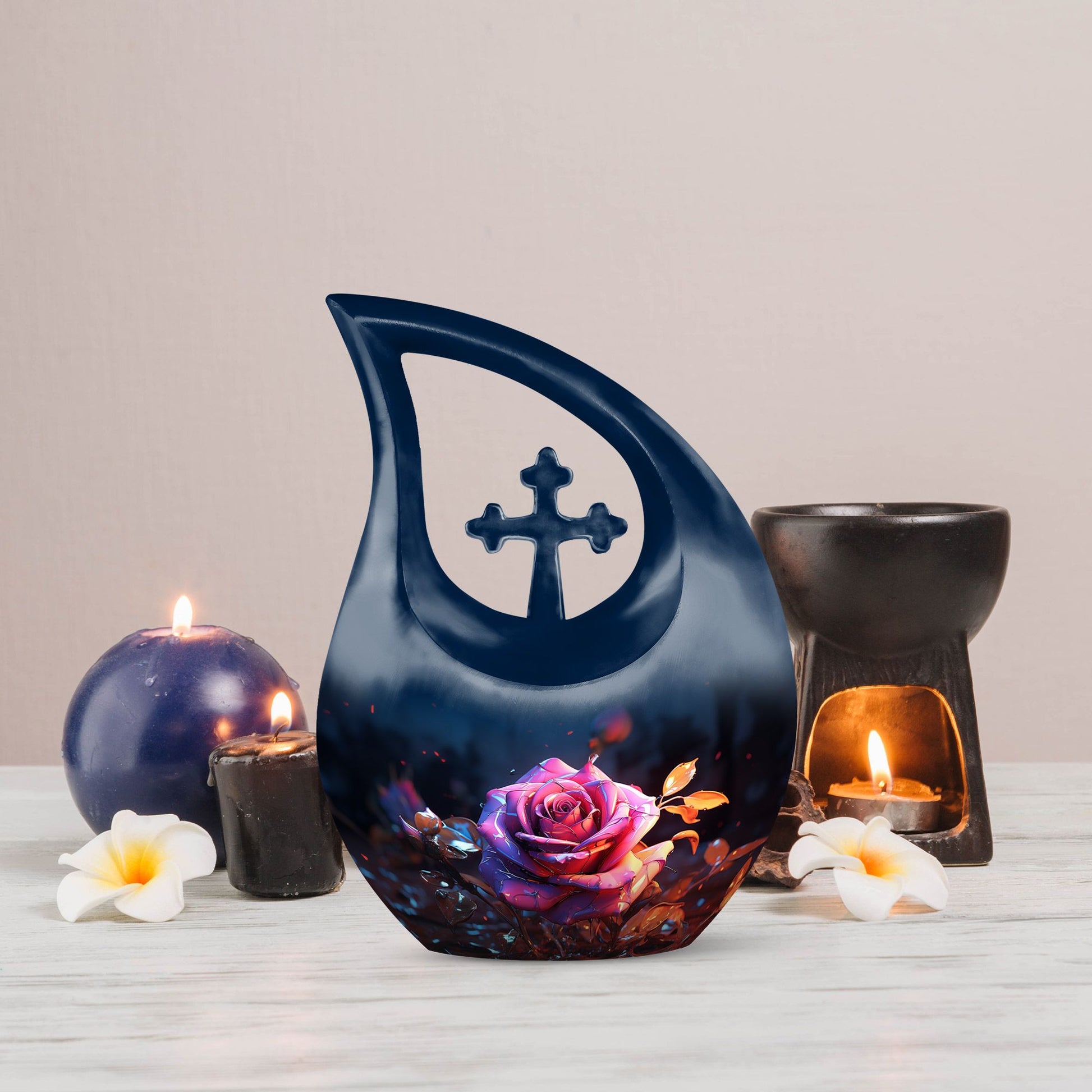 Celebrate the eternal bond of love and faith with our Blue Teardrop Burial Urn for Human Ashes. Designed with a radiant single neon rose and cross motif, this elegant cremation urn for ashes serves as a beautiful tribute to a life cherished and remembered. Its teardrop silhouette represents both sorrow and everlasting love — a touching symbol of remembrance for families seeking comfort and grace.