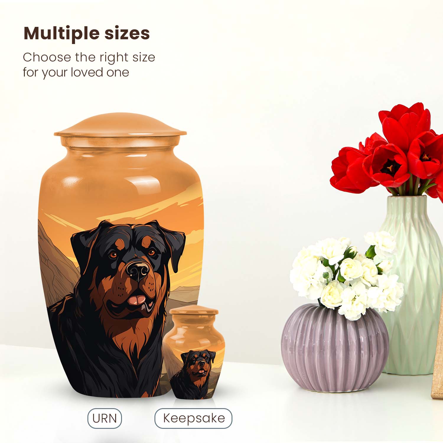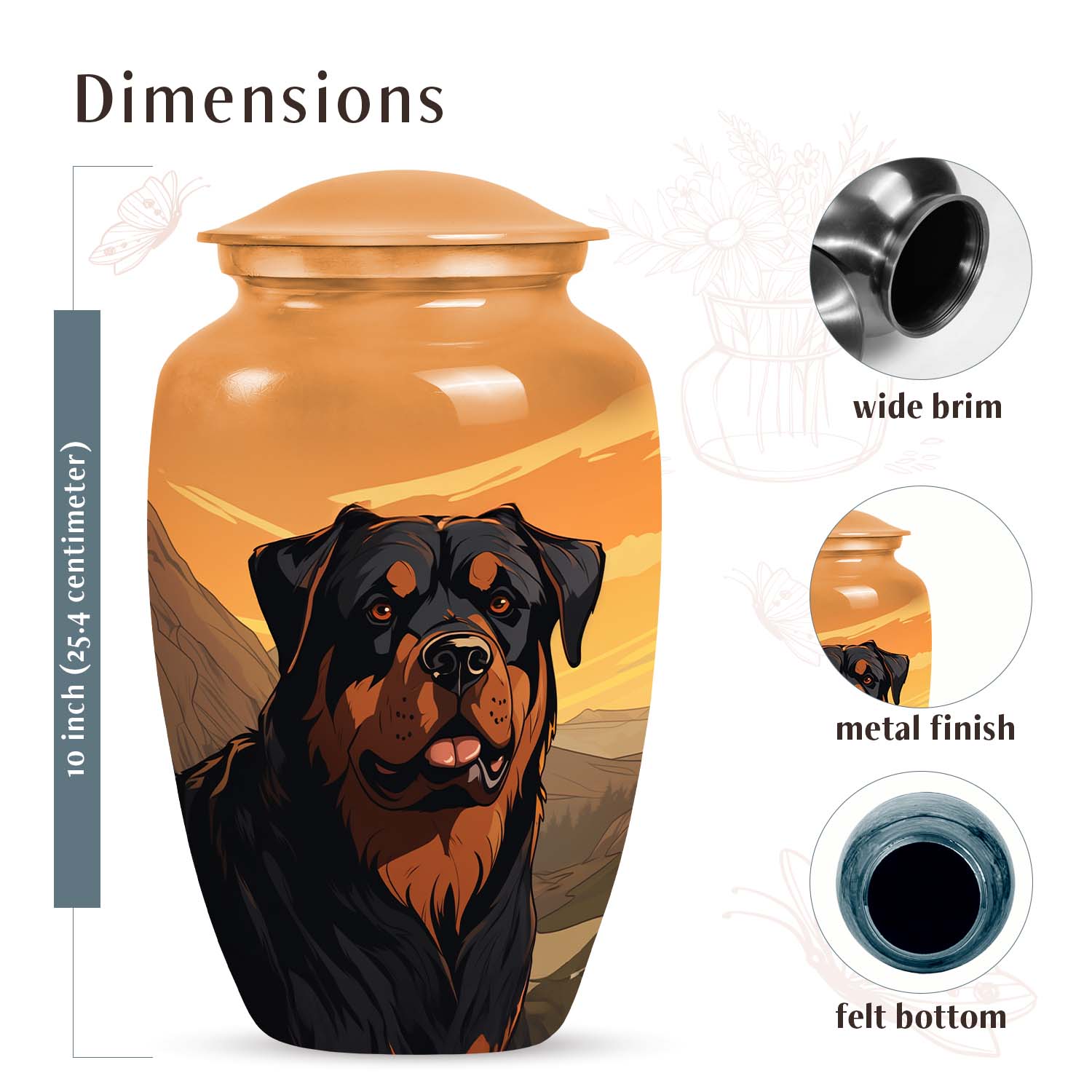 The Rottweiler Cremation Urn for Pet Ashes – Orange Sunset Mountain Dog Memorial Urn beautifully celebrates the unbreakable bond between pet and owner. With its hand-painted mountain backdrop and glowing orange sunset, this urn symbolizes peace, devotion, and eternal love. It’s a touching addition to any collection of dog memorials and keepsakes, offering a dignified way to honor your beloved Rottweiler’s memory.