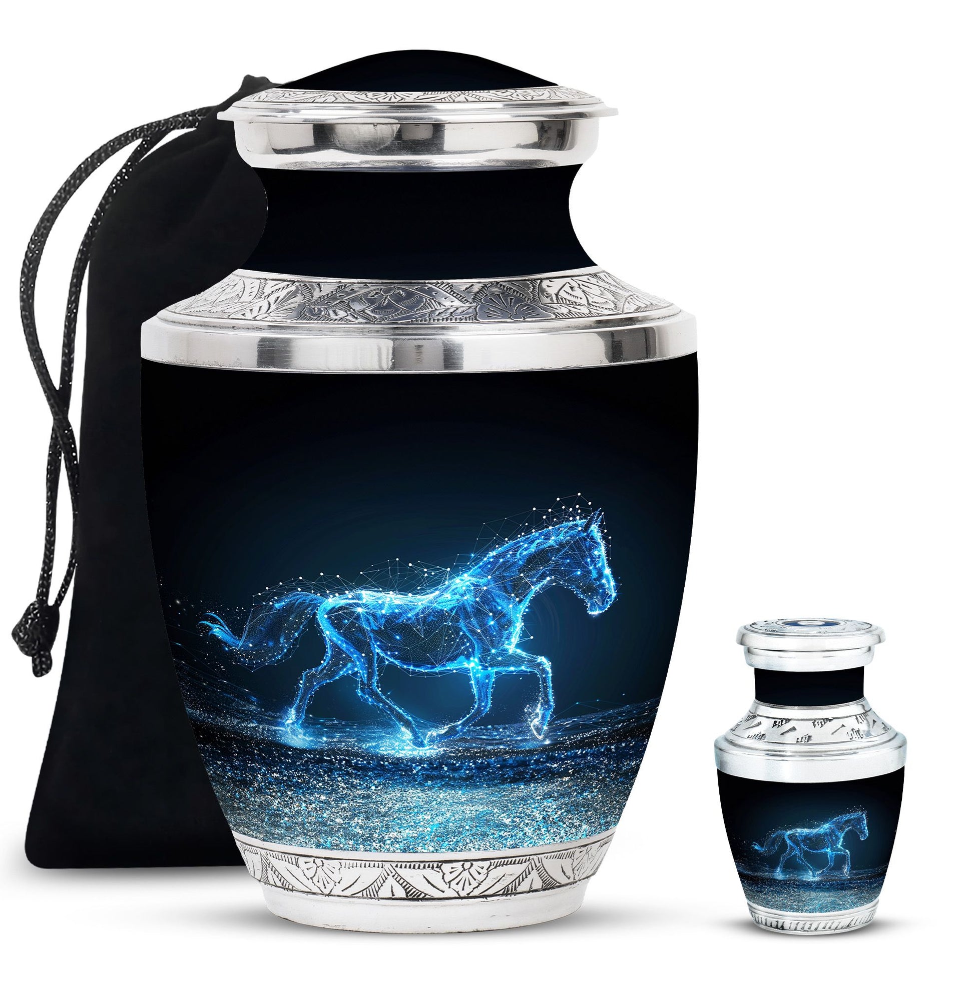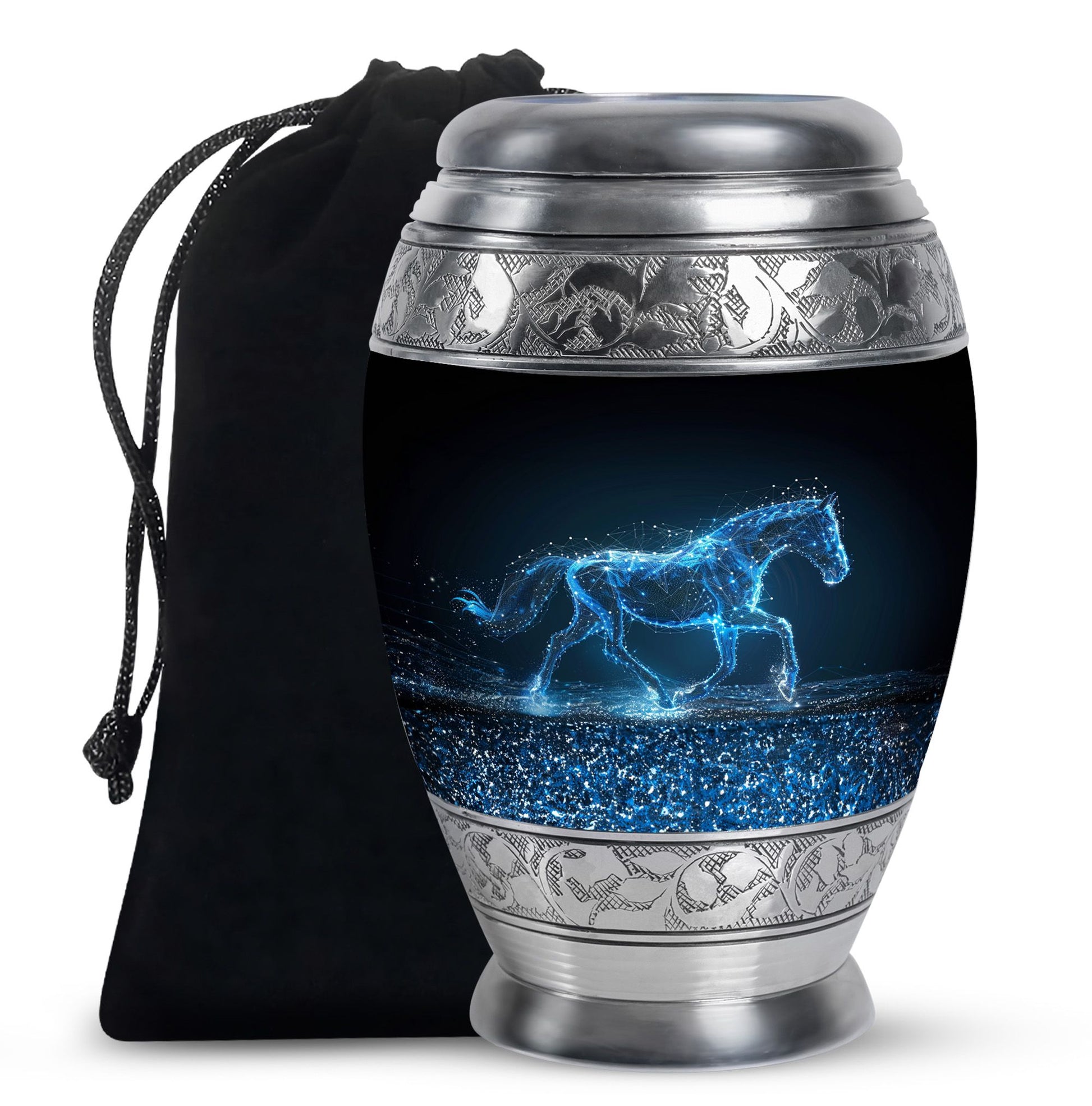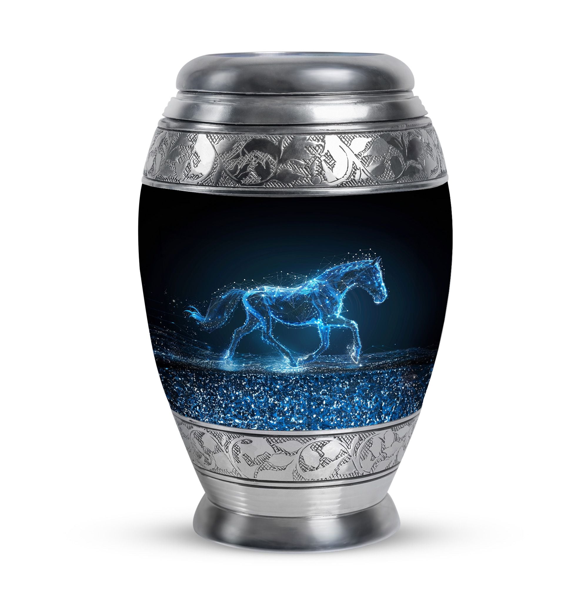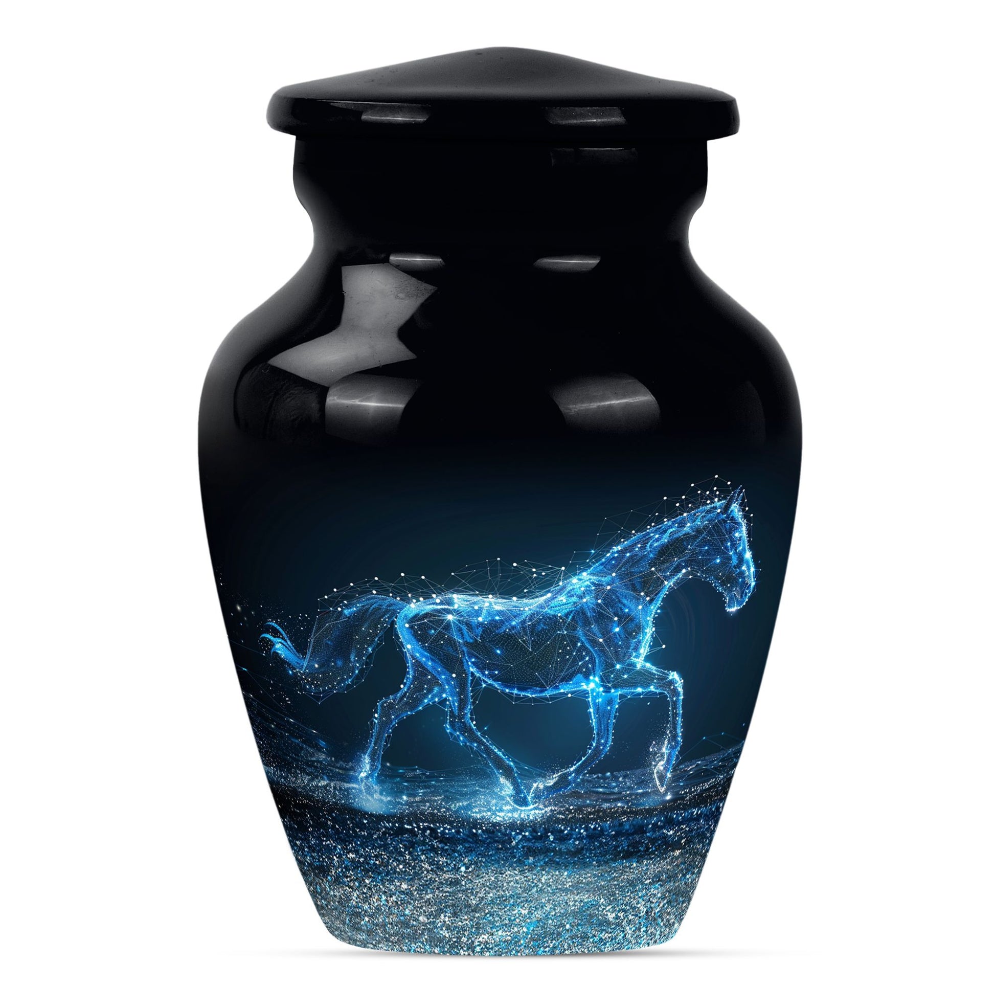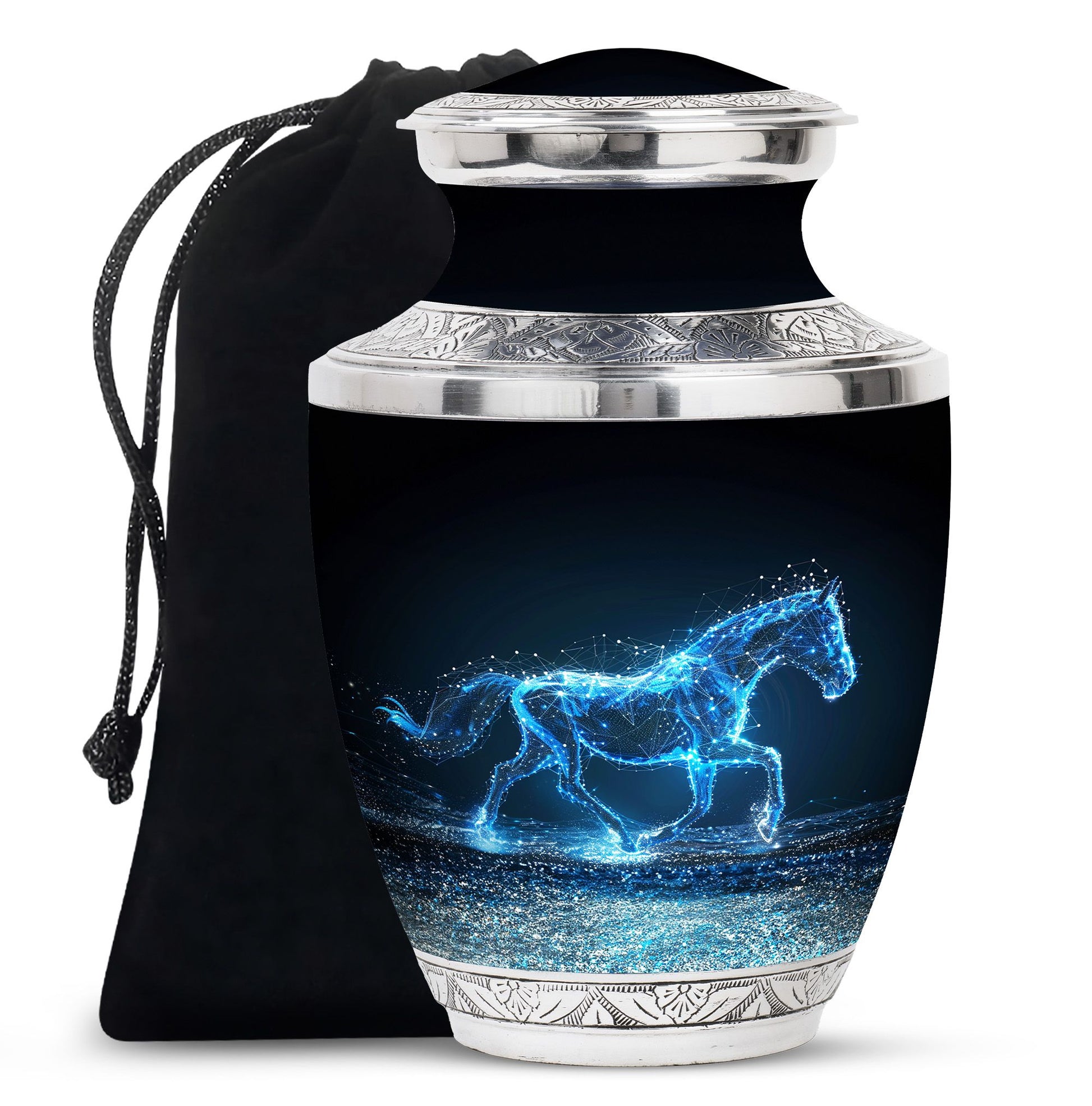 Honor a loved one with the Neon Blue Horse Cremation Urn, featuring a powerful running horse design symbolizing strength, freedom, and spirit. This adult urn is suitable for men and women, offering a meaningful tribute that combines artistry with lasting quality.
