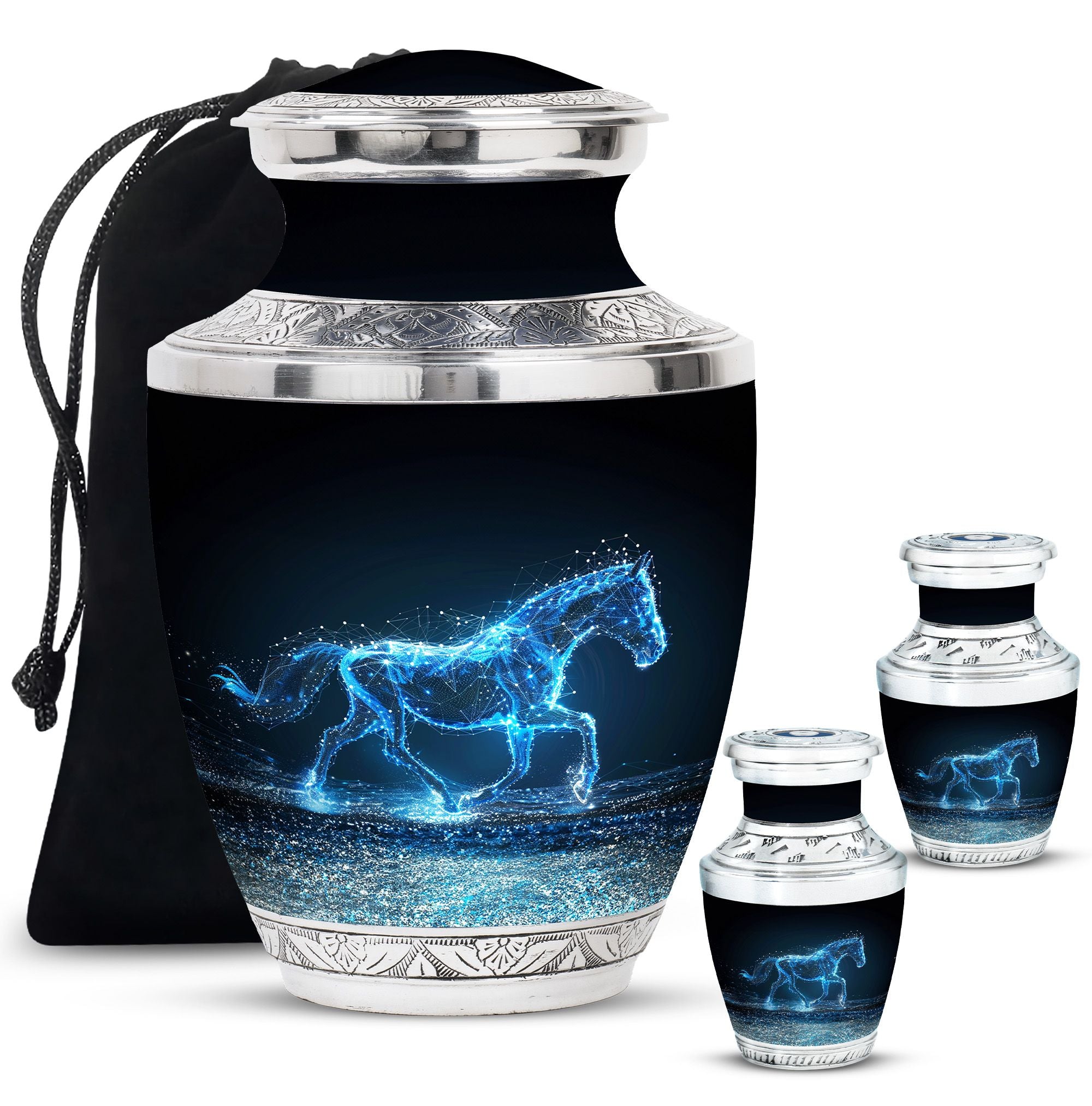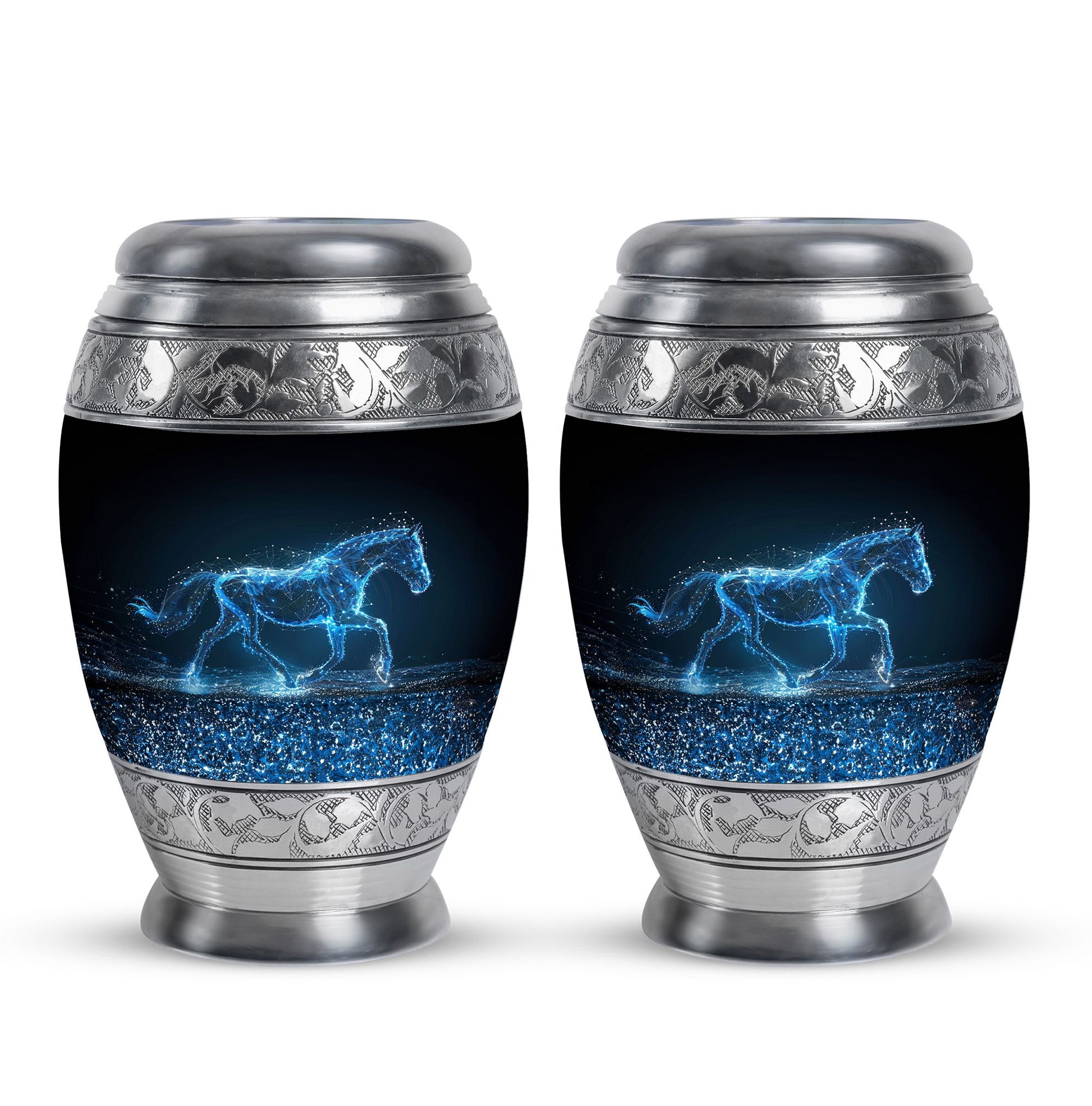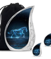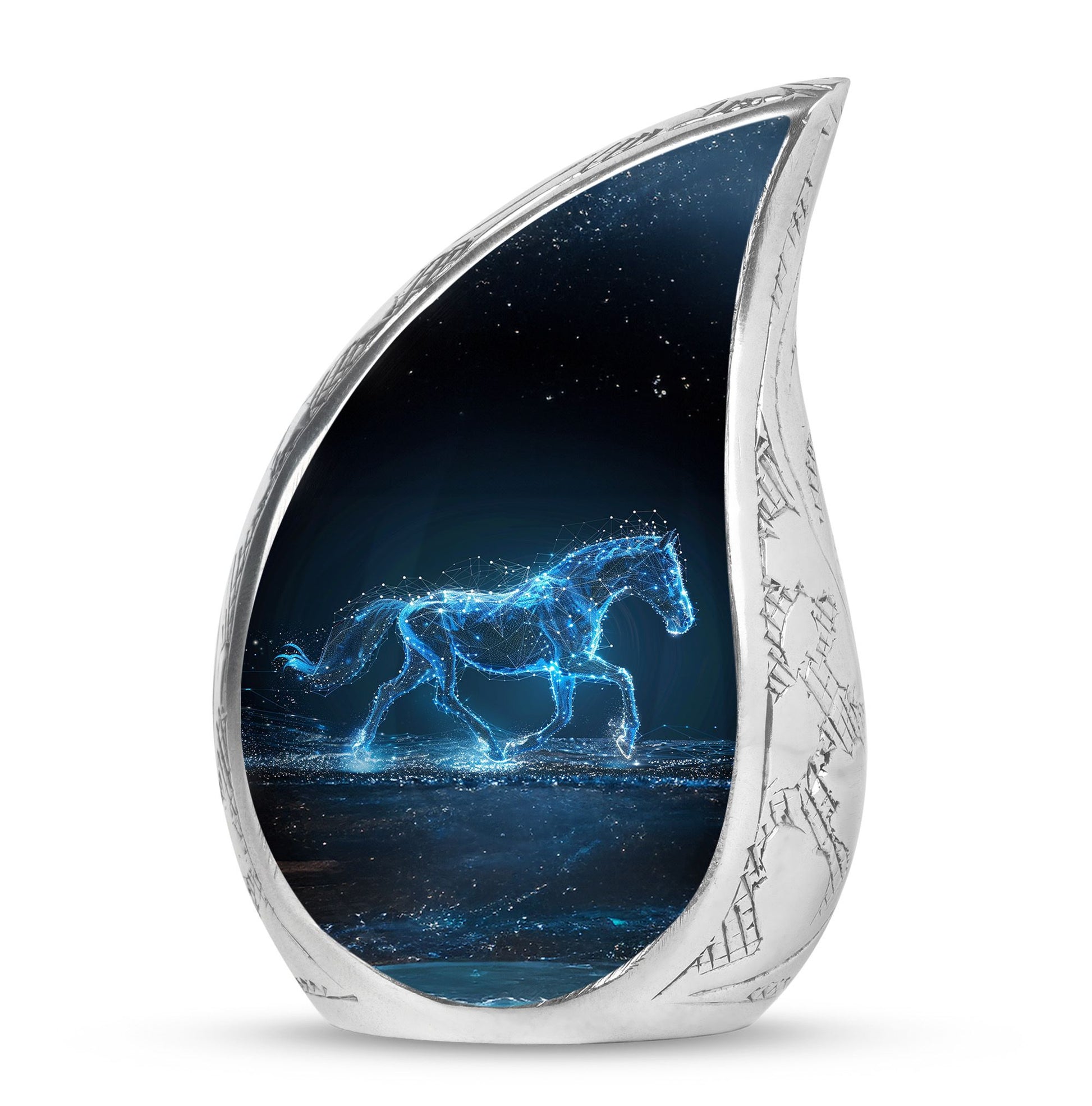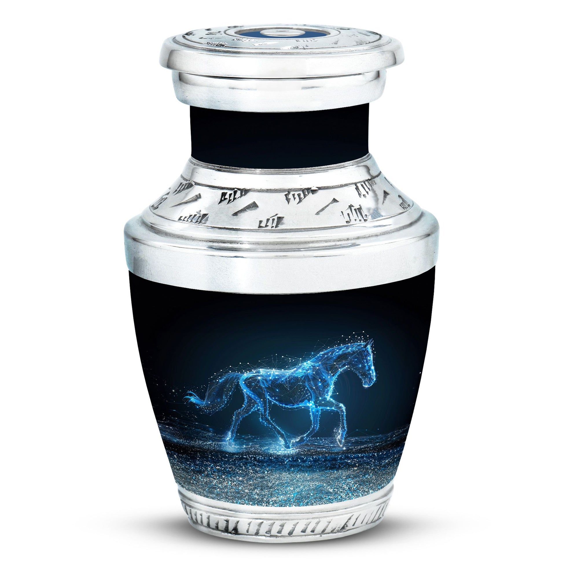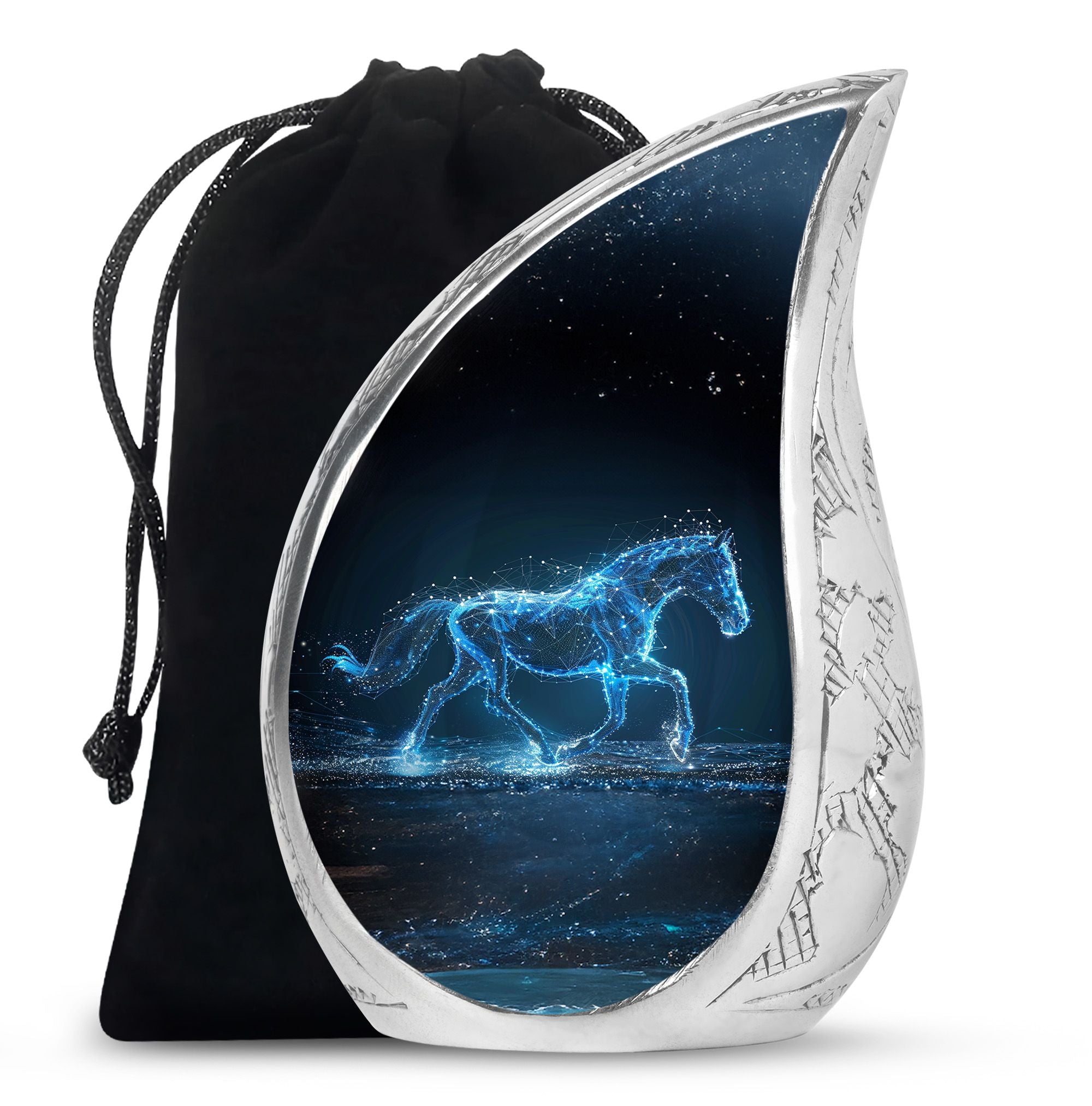 Honor a loved one with the Neon Blue Horse Cremation Urn, featuring a powerful running horse design symbolizing strength, freedom, and spirit. This adult urn is suitable for men and women, offering a meaningful tribute that combines artistry with lasting quality.