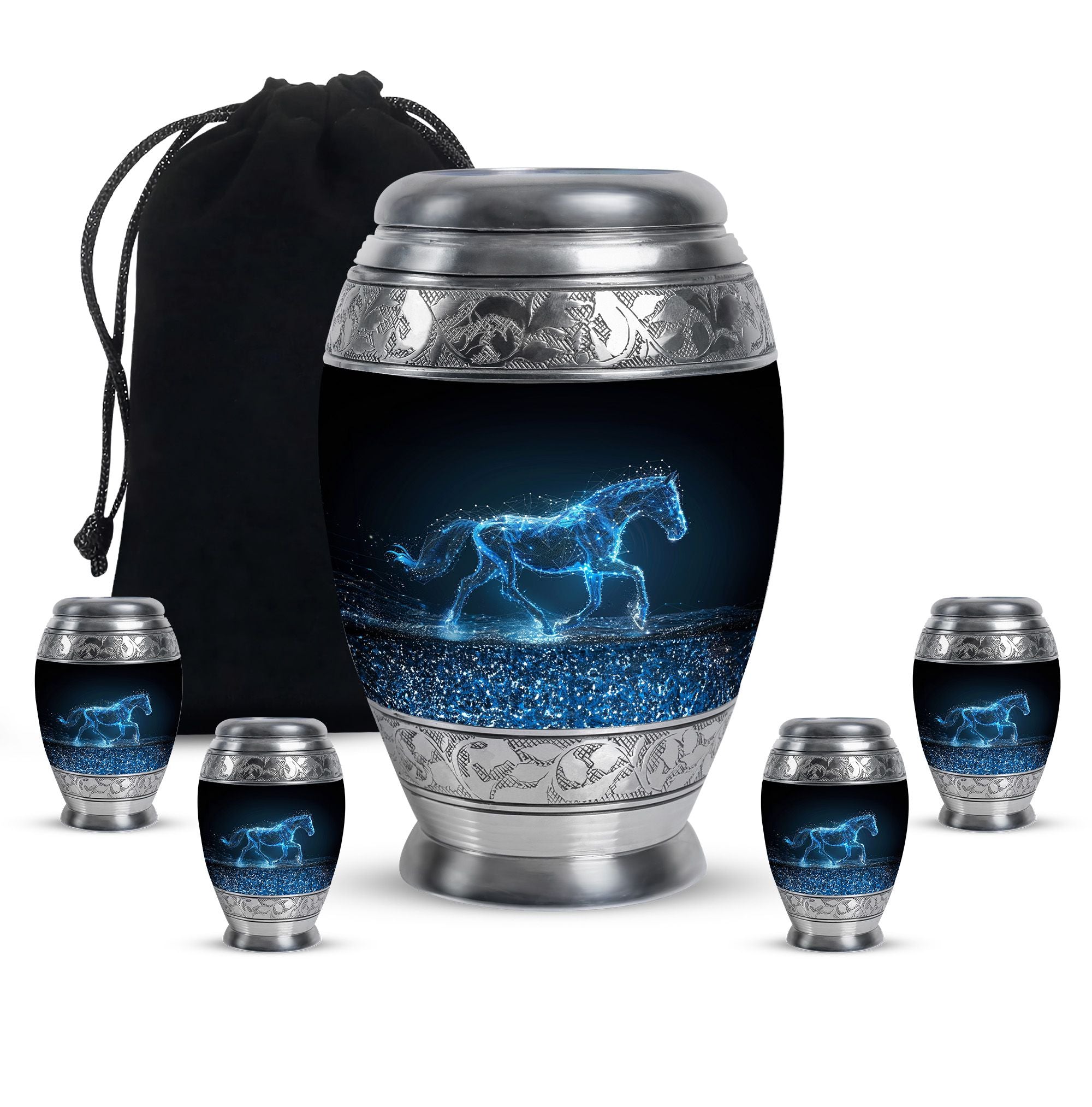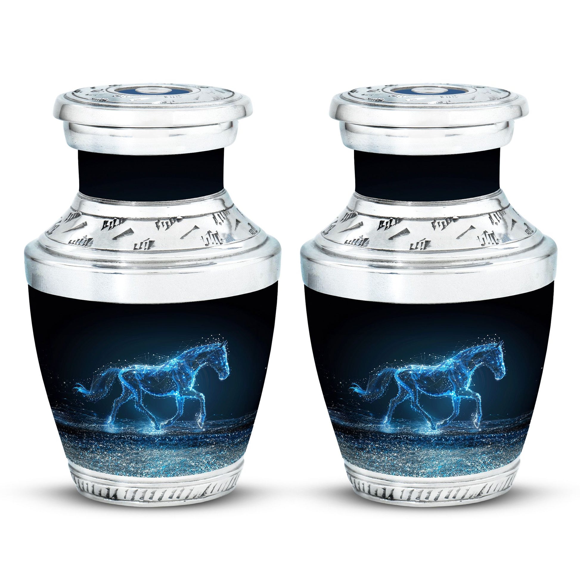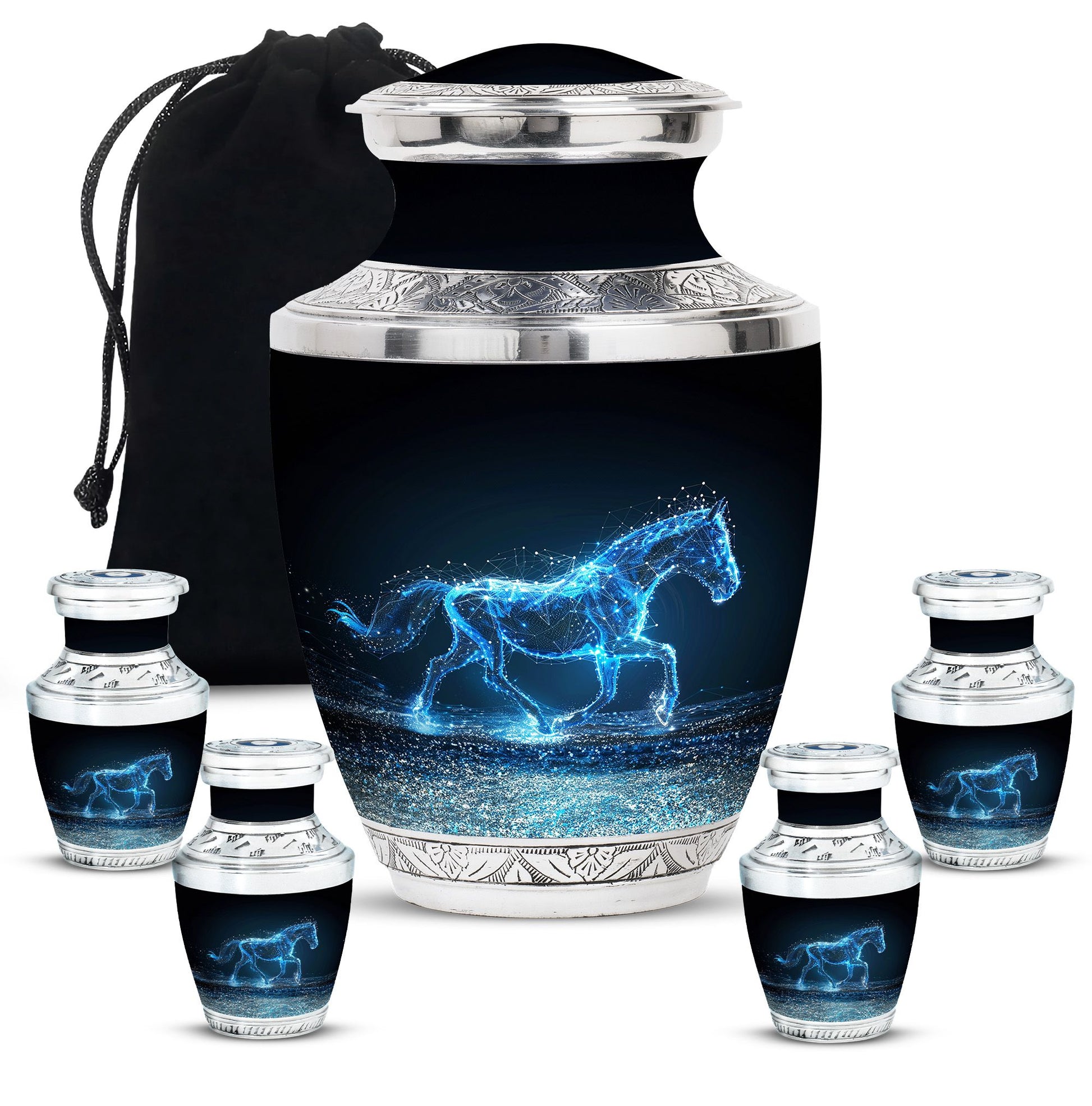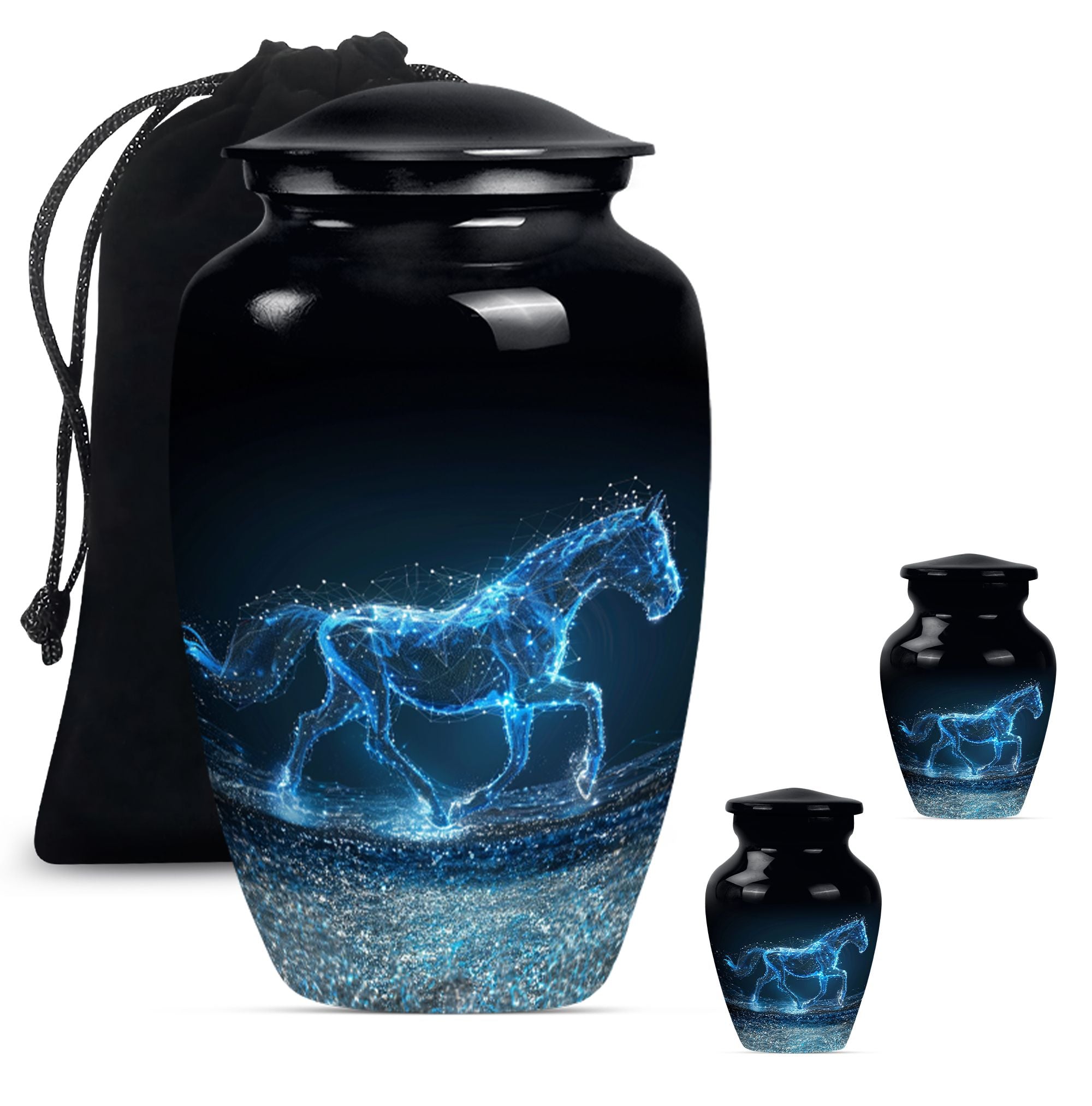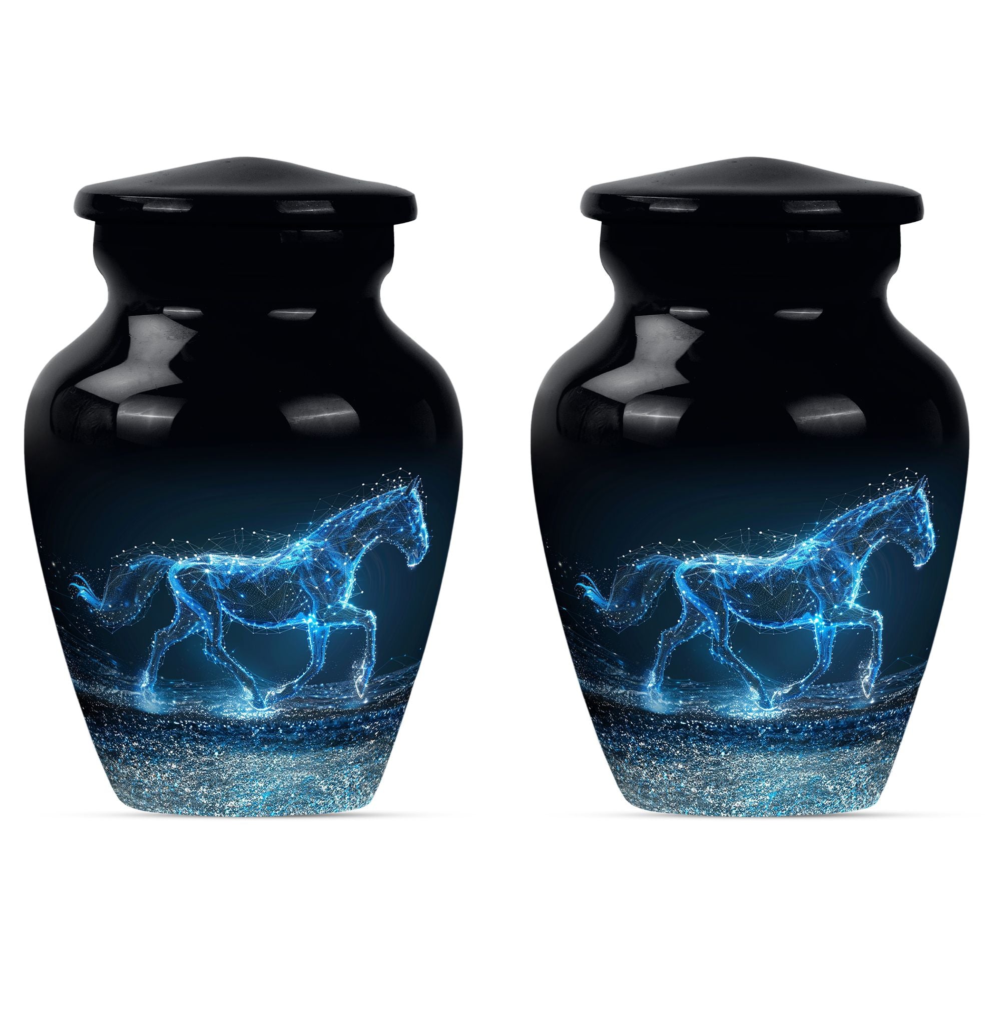 Honor a loved one with the Neon Blue Horse Cremation Urn, featuring a powerful running horse design symbolizing strength, freedom, and spirit. This adult urn is suitable for men and women, offering a meaningful tribute that combines artistry with lasting quality.