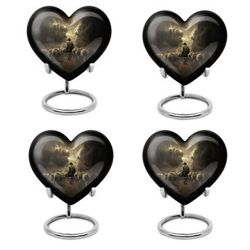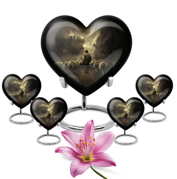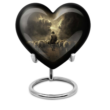 Emanate pure love even in absence with this exquisite 10-inch Shepherd Urn, a unique tribute to those loved but unseen, unheard, but always near. Crafted with the meticulous detail, this urn’s large size constitutes a capacity of 200 cubic inches. Constructed from durable aluminium, its enduring quality safeguards the ashes of your loved ones from the elements of time. The urn comes alongside a velvet pouch, enabling secure containment of ashes, and preserving the sanctity of remembrances. This large, heart-shaped urn, while abstract in theme, bears a weight of 3.3 pounds and offers the possibility of further customization. Personalize it with engraved names, infusing a part of your heart in its creation. This 'cremation urn' caters to keywords such as 'burial urns for cremation', 'ashes mother', 'urn ash funeral urn', 'shaped urn box' and 'funeral cremation urns'. This heart urn is more than a mere vessel; it’s a timeless keepsake, a beacon of undying love and a heartfelt solace in times of remembrance. An extraordinary choice for men, it mirrors strength in vulnerability and grace amidst loss.
