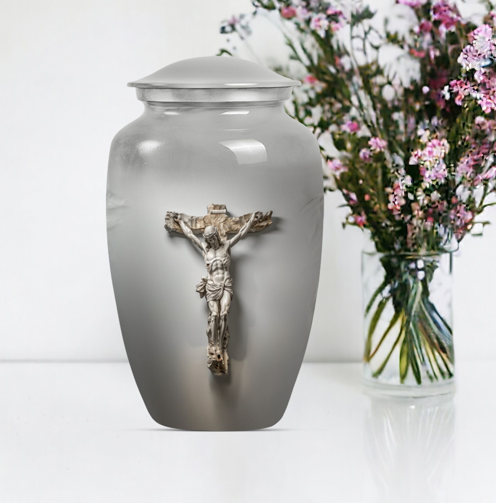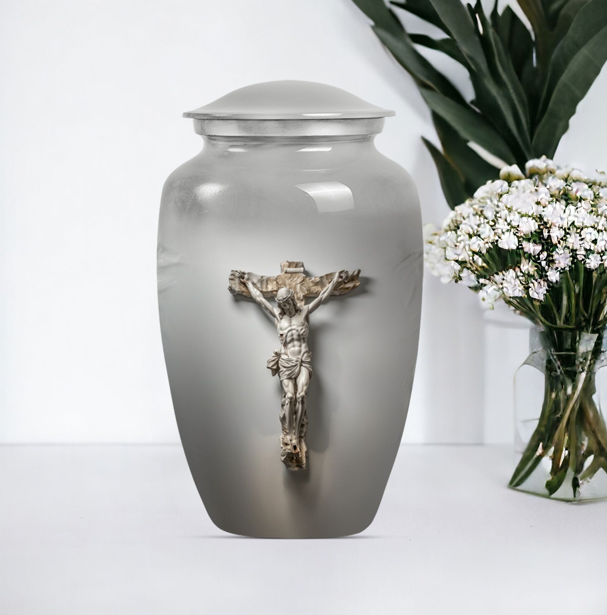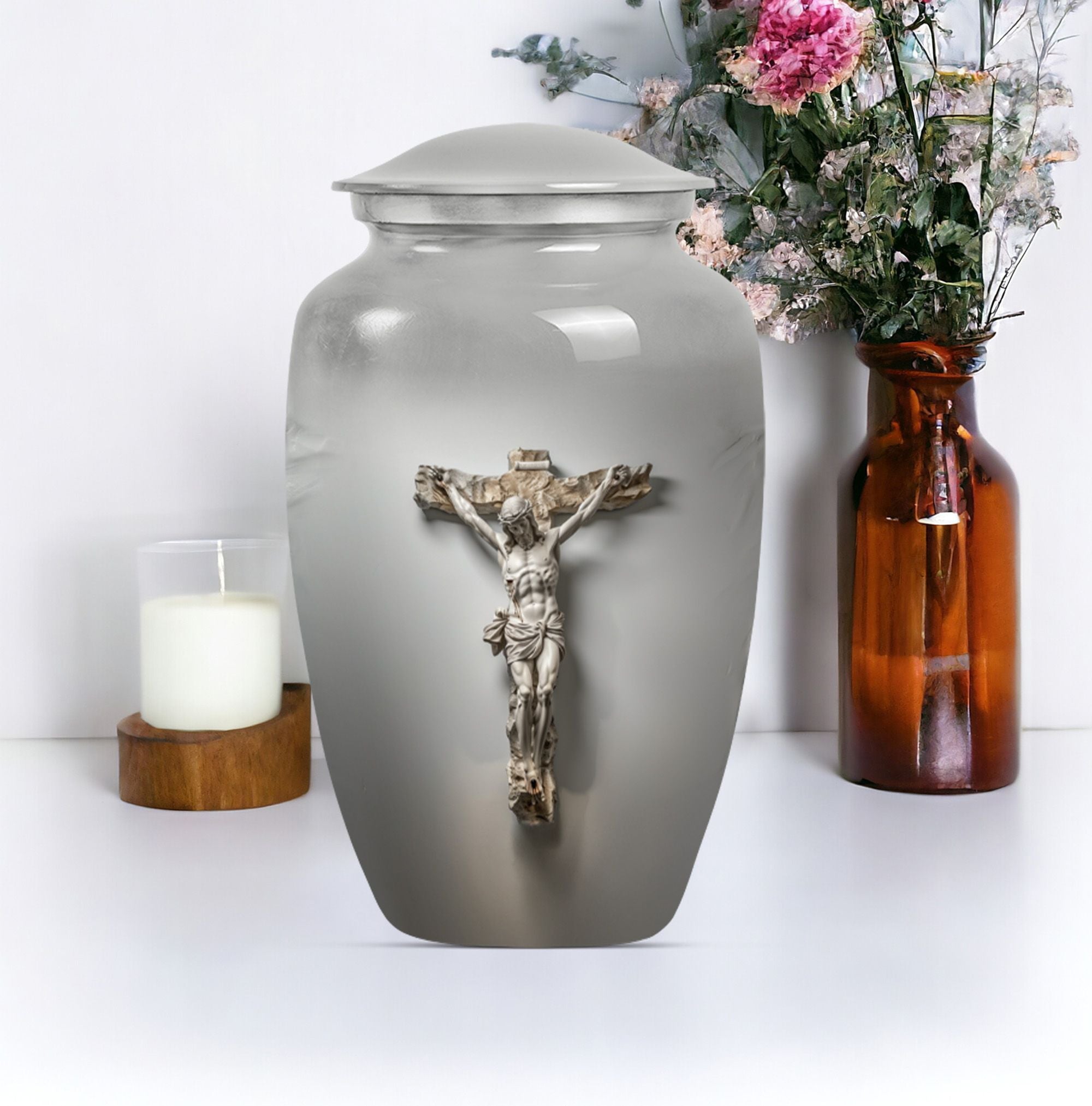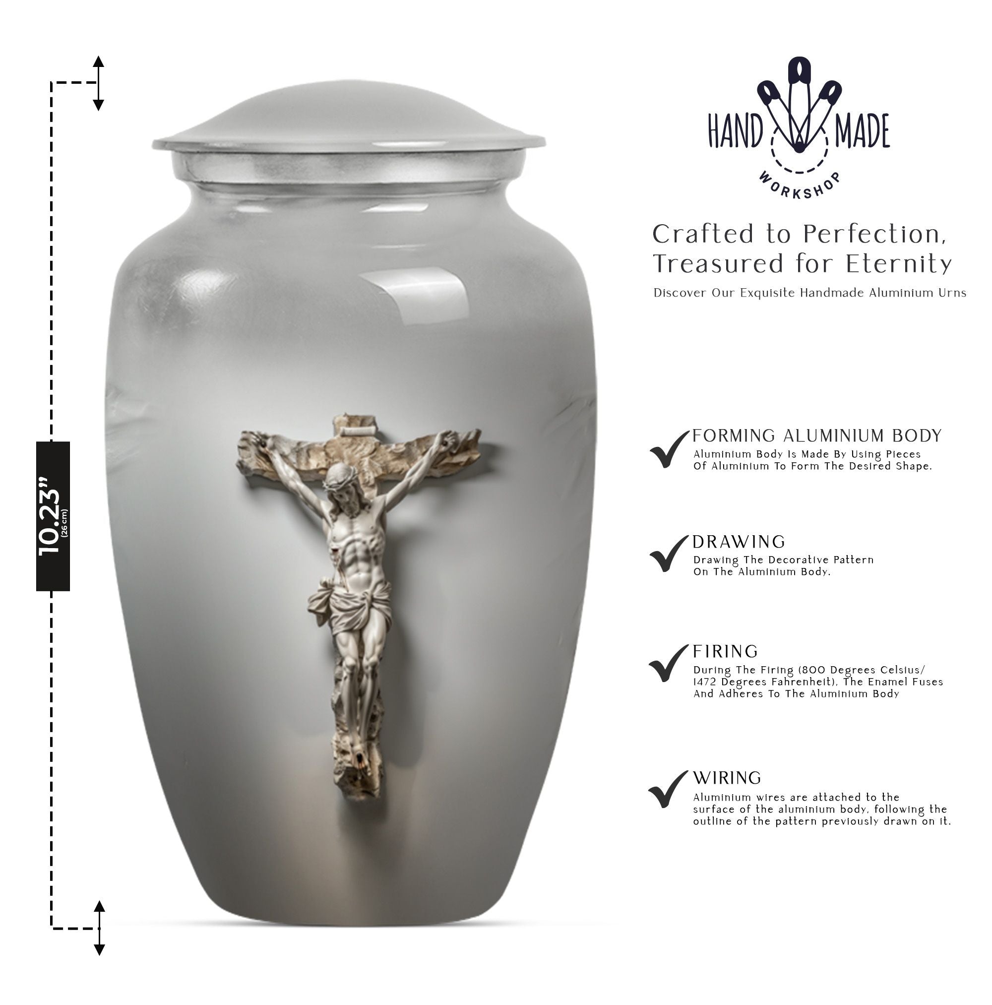 Preserve your loved one's memories in a dignified and enduring way with this 10 inch Large Jesus Urn, specifically designed for cremation ashes. Its distinct classic urn shape is complemented by an abstract theme, creating an elegantly timeless piece. Weighing 3.3 pounds and standing 10 inches in height, this large Urn boasts a substantial capacity of 200 cubic inches, ensuring ample space for holding burial ashes. Constructed from high-quality Aluminium, longevity is assured. In addition to its impressive functionality, this urn can also bear a personalized touch with the option to engrave names, adding that emotional touch to your tribute. Your purchase includes a soft velvet pouch for secure containment of the ashes. This urn is much more than just a storage vessel; it is a respectful commemoration of your loved one's life and legacy. Whether you're searching for 'urns for cremation ashes' or 'cremation funeral urns', this exceptional piece meets both those needs with grace and dignity.