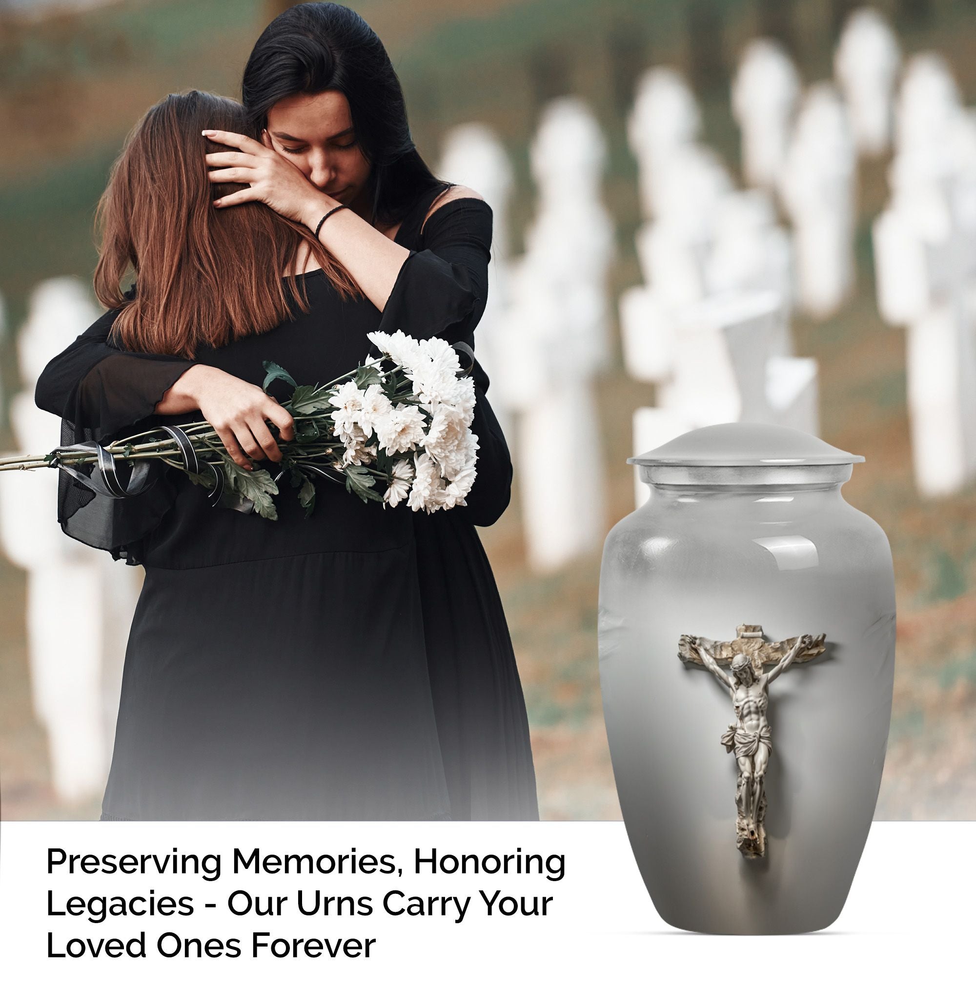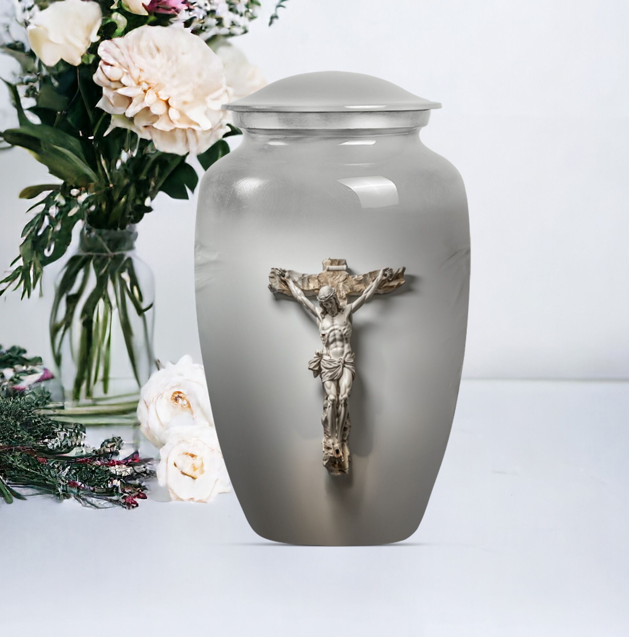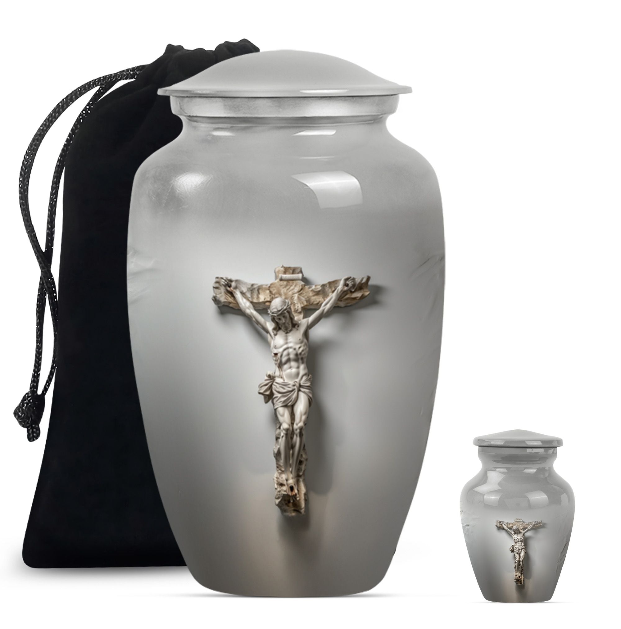 Preserve your loved one's memories in a dignified and enduring way with this 10 inch Large Jesus Urn, specifically designed for cremation ashes. Its distinct classic urn shape is complemented by an abstract theme, creating an elegantly timeless piece. Weighing 3.3 pounds and standing 10 inches in height, this large Urn boasts a substantial capacity of 200 cubic inches, ensuring ample space for holding burial ashes. Constructed from high-quality Aluminium, longevity is assured. In addition to its impressive functionality, this urn can also bear a personalized touch with the option to engrave names, adding that emotional touch to your tribute. Your purchase includes a soft velvet pouch for secure containment of the ashes. This urn is much more than just a storage vessel; it is a respectful commemoration of your loved one's life and legacy. Whether you're searching for 'urns for cremation ashes' or 'cremation funeral urns', this exceptional piece meets both those needs with grace and dignity.