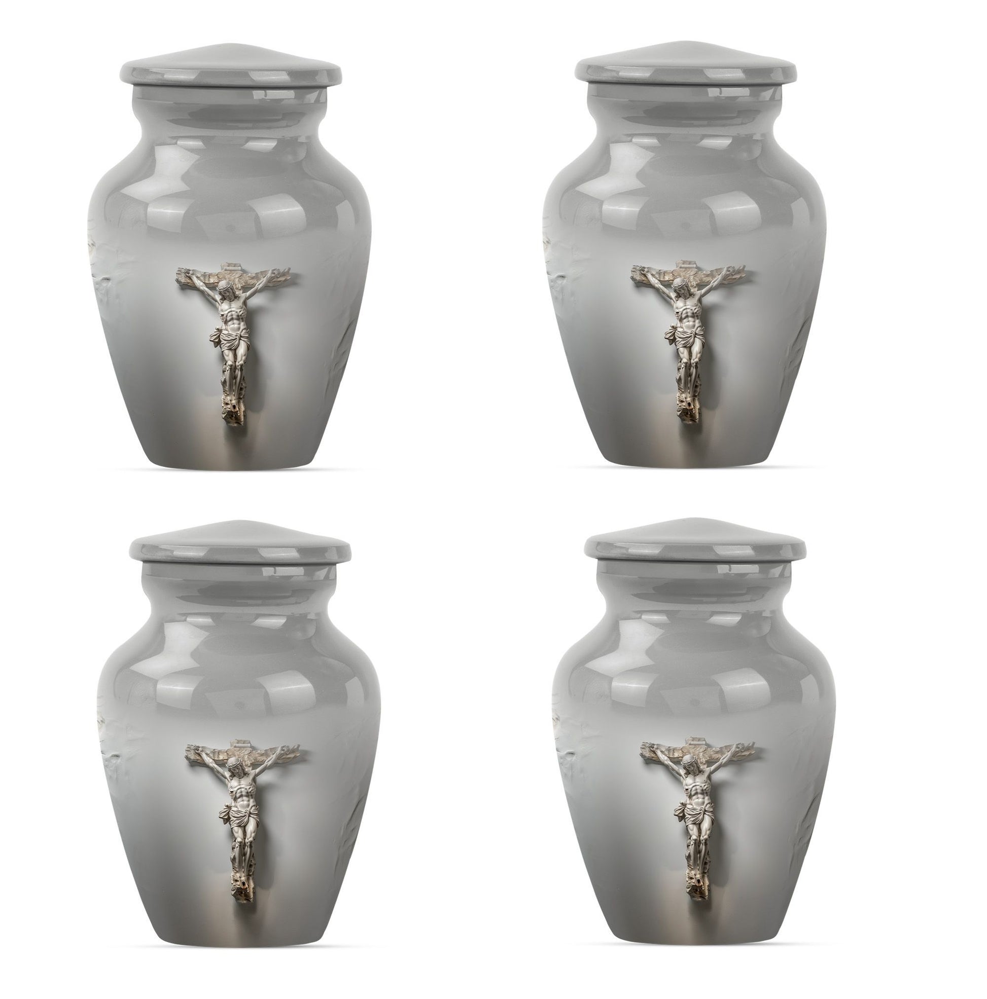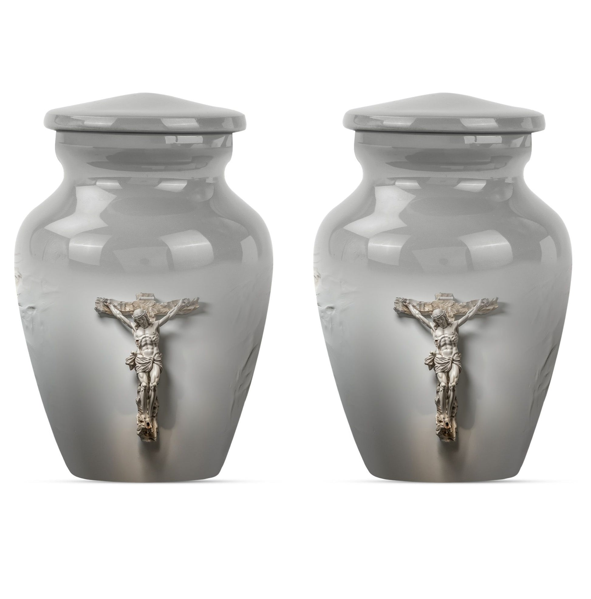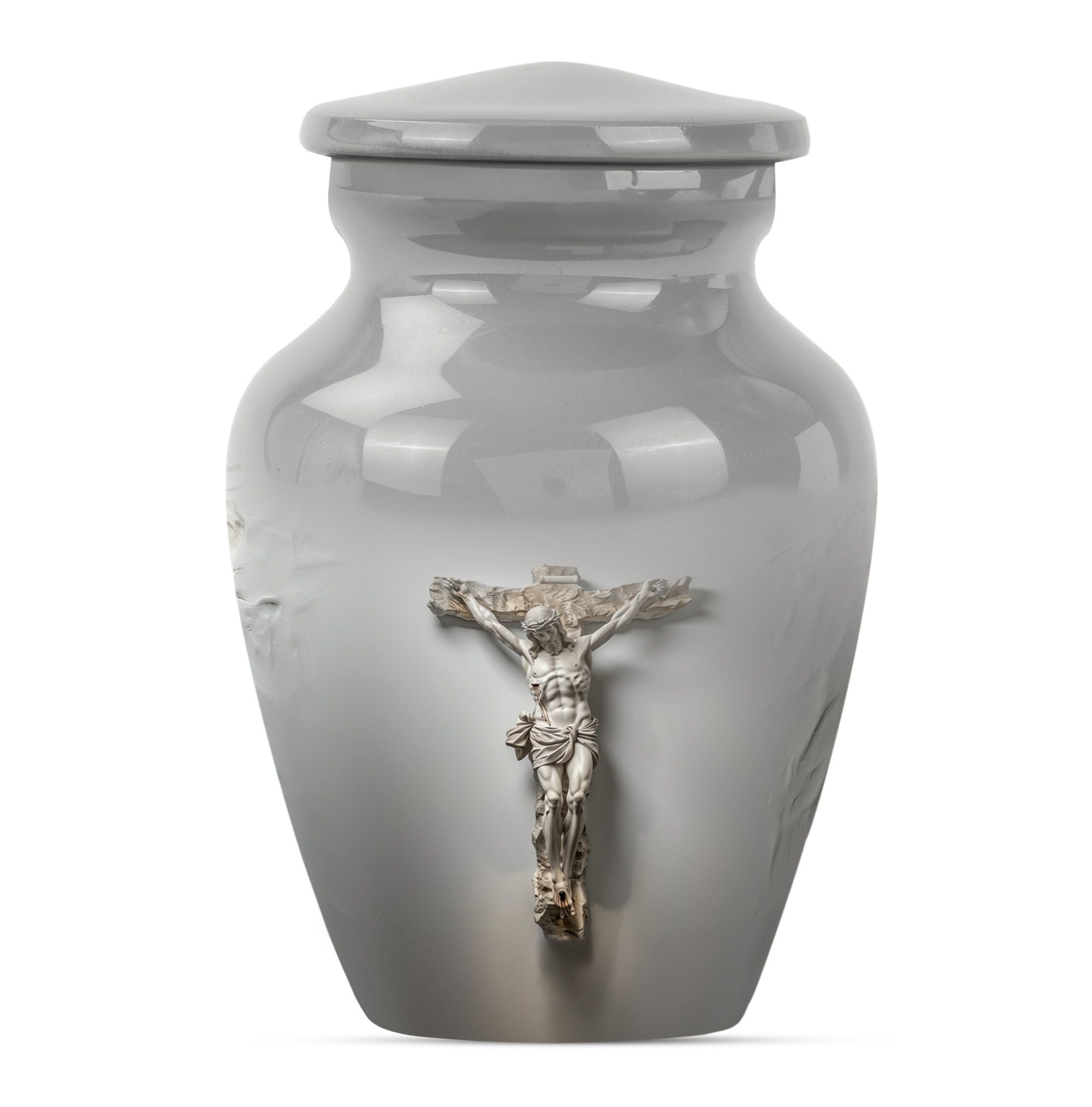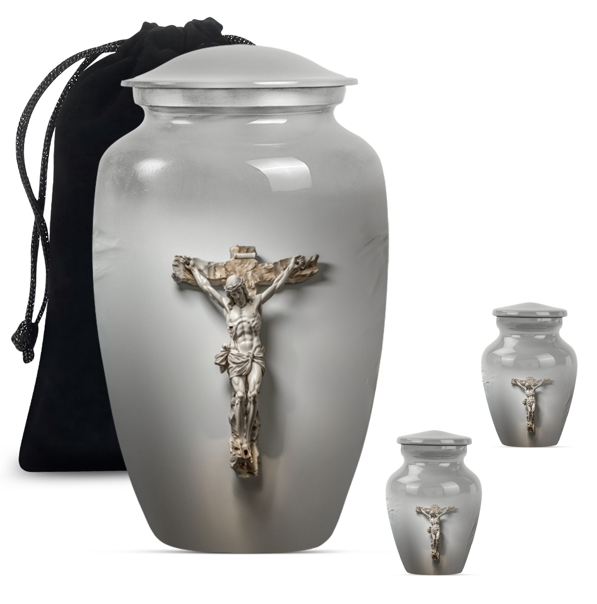 Preserve your loved one's memories in a dignified and enduring way with this 10 inch Large Jesus Urn, specifically designed for cremation ashes. Its distinct classic urn shape is complemented by an abstract theme, creating an elegantly timeless piece. Weighing 3.3 pounds and standing 10 inches in height, this large Urn boasts a substantial capacity of 200 cubic inches, ensuring ample space for holding burial ashes. Constructed from high-quality Aluminium, longevity is assured. In addition to its impressive functionality, this urn can also bear a personalized touch with the option to engrave names, adding that emotional touch to your tribute. Your purchase includes a soft velvet pouch for secure containment of the ashes. This urn is much more than just a storage vessel; it is a respectful commemoration of your loved one's life and legacy. Whether you're searching for 'urns for cremation ashes' or 'cremation funeral urns', this exceptional piece meets both those needs with grace and dignity.