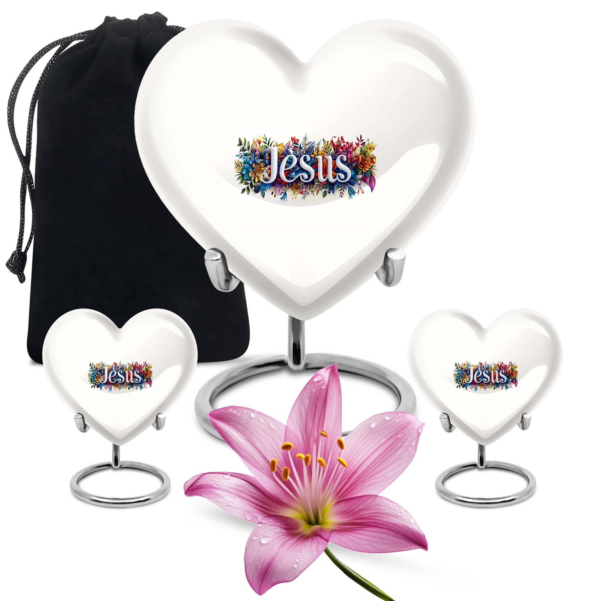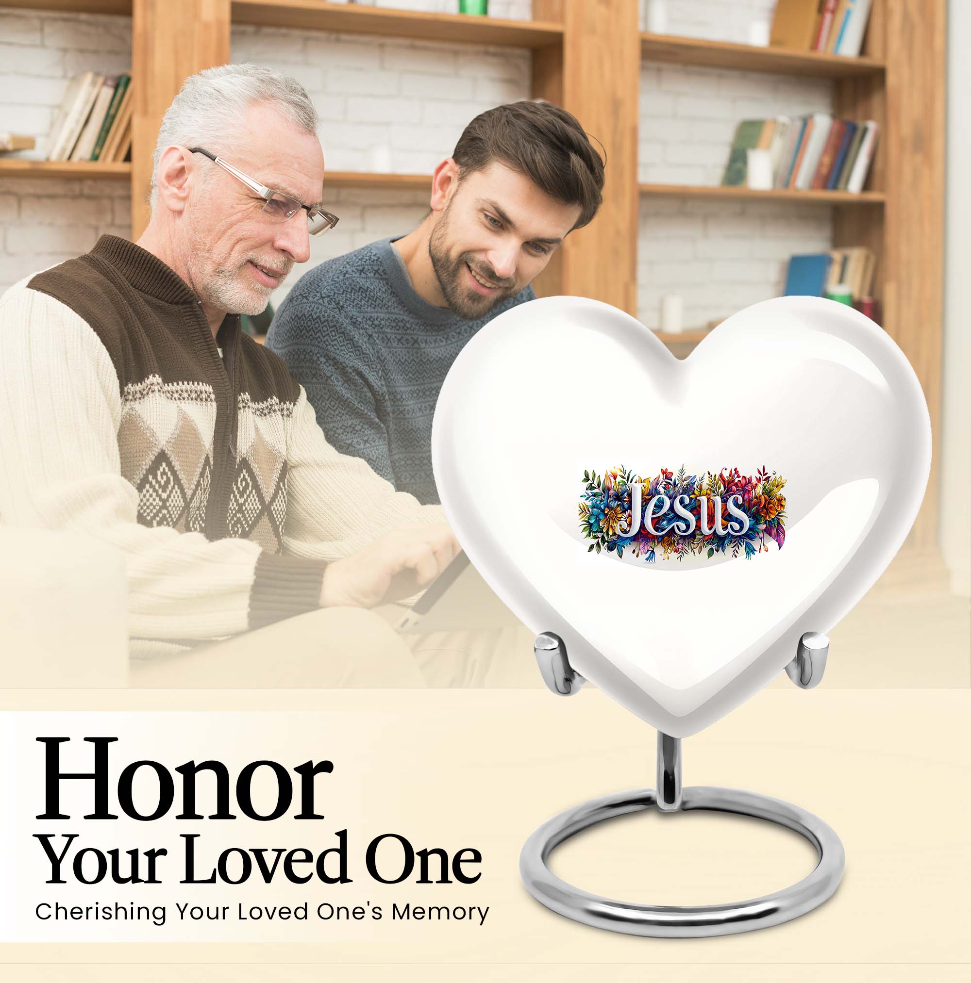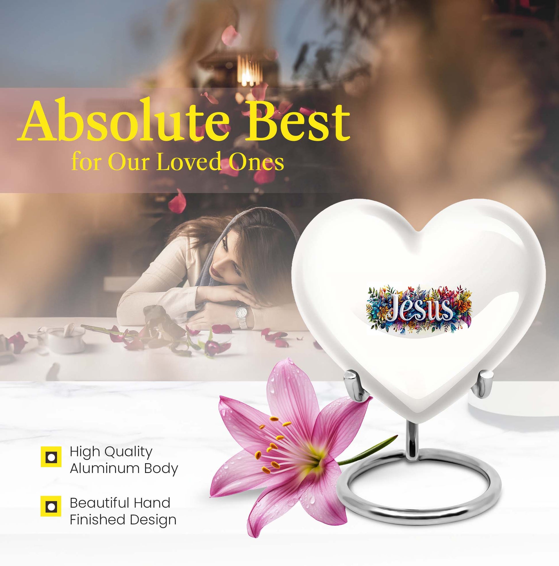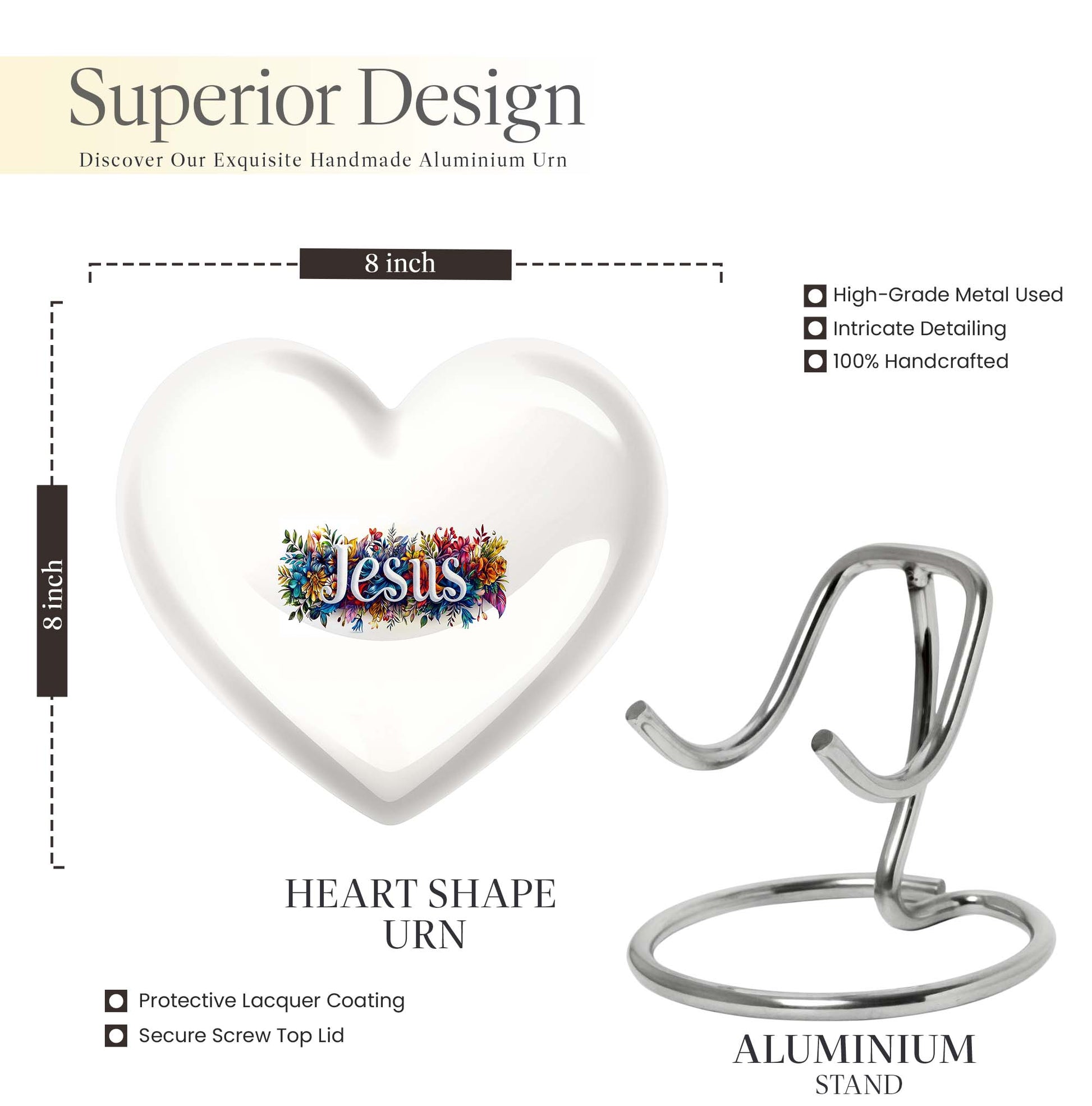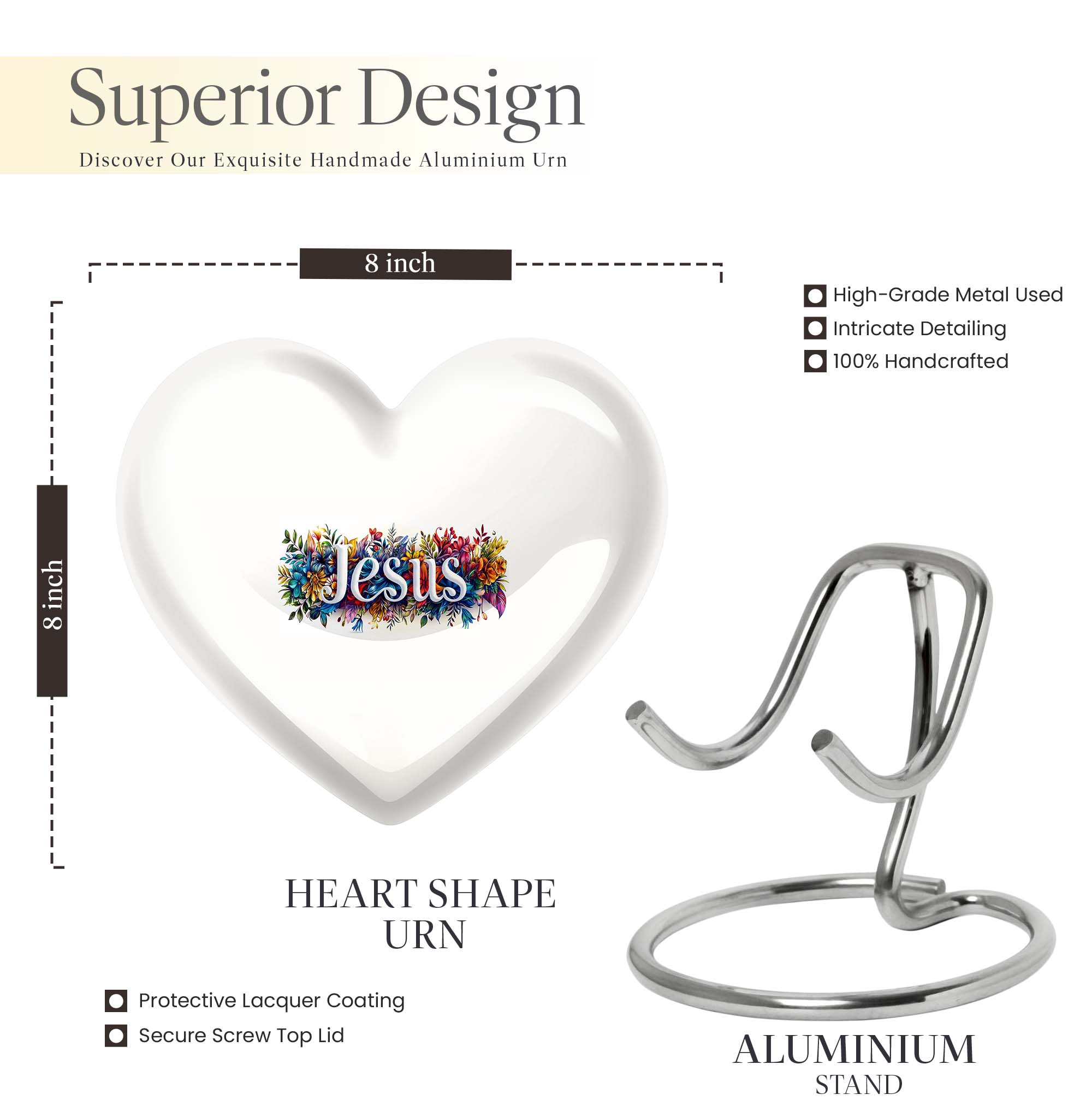 Honor your departed loved ones with this striking Jesus Urn, a fitting tribute for their final resting place. This aluminium cremation urn comes in a unique and robust 'Heart Urn' design, adding a touch of serenity to your memorial ceremonies. Designed to secure ashes, this sizeable 10-inch cremation instrument highlights an abstract theme that subtly breaks away from the norm. This cremation urn for human ashes is a perfect choice for adults and contains up to 200 cubic inches of ashes, embodying the physical measurements of a full-size adult. It is lightweight, weighing just 3.3 pounds, which makes it both transportable and easy to manage. The urn comes with a soft velvet pouch, thereby providing a dignified enclosure for your loved one's ashes. Additionally, you can personalize this cremation urn by engraving names, a tribute that either signifies love, peace, or everlasting memory. Choose this burial urn for cremation ashes for a celebration of your loved one's life.