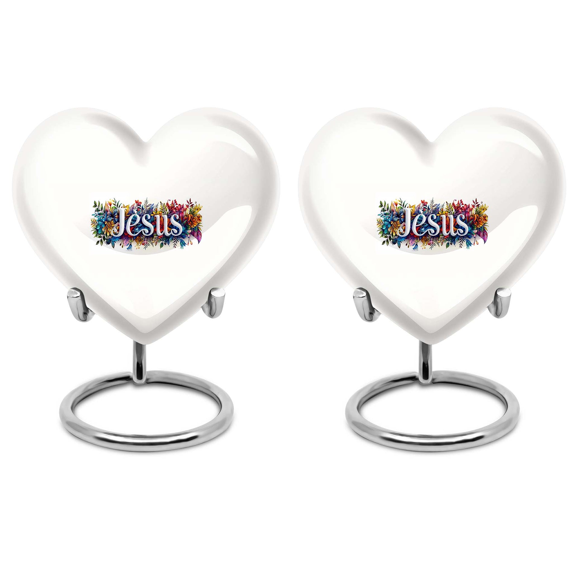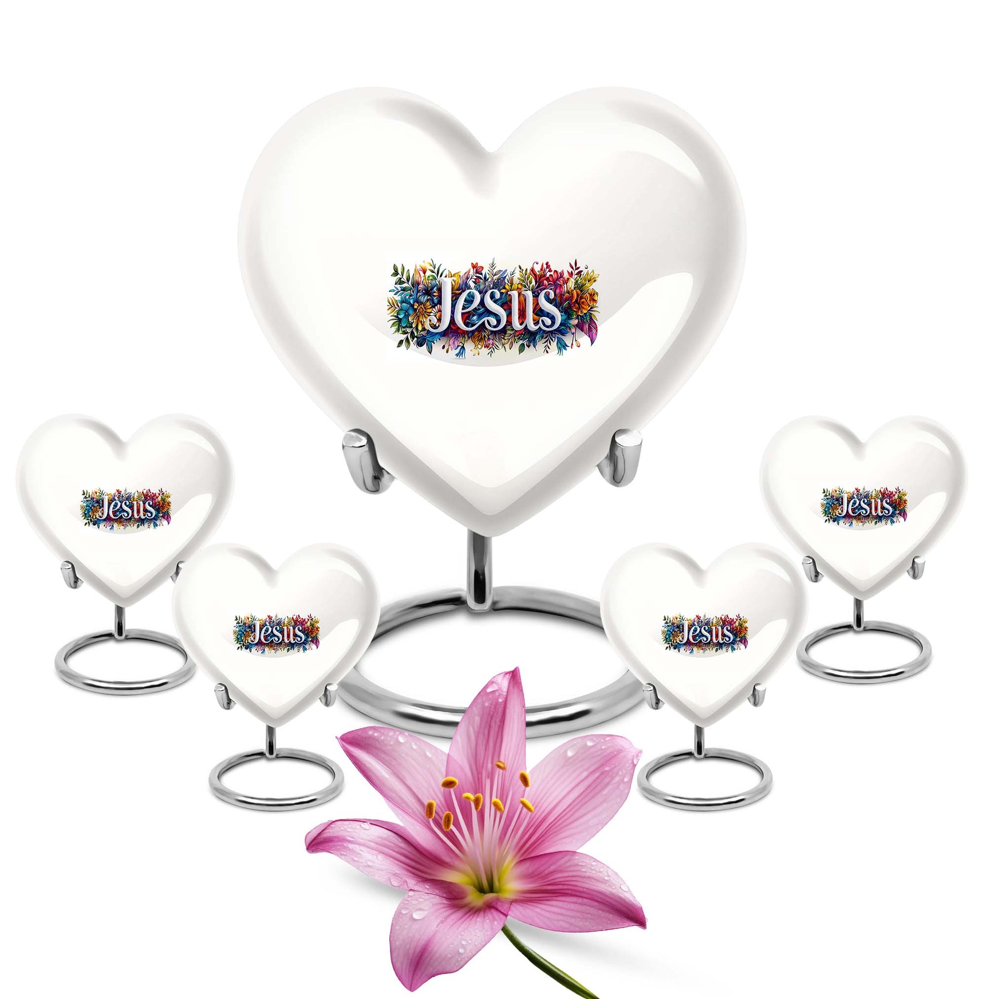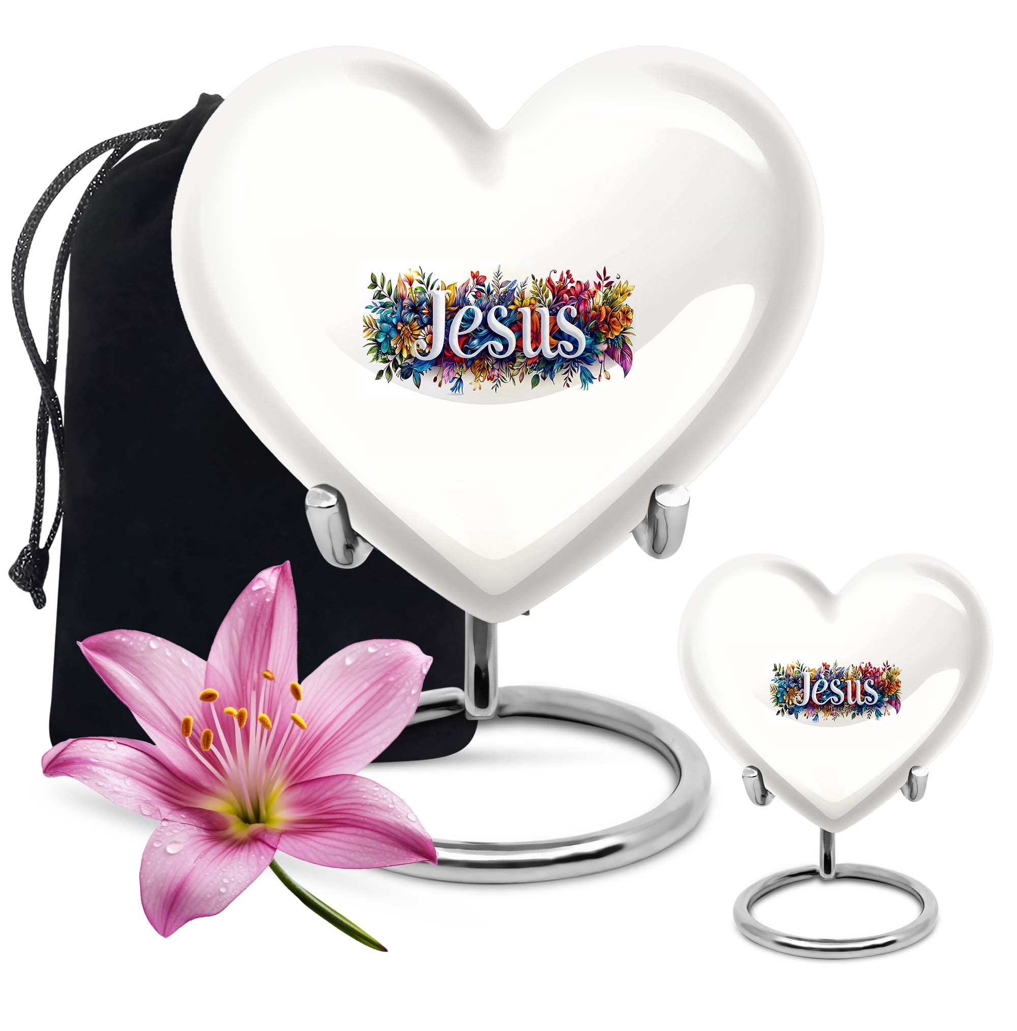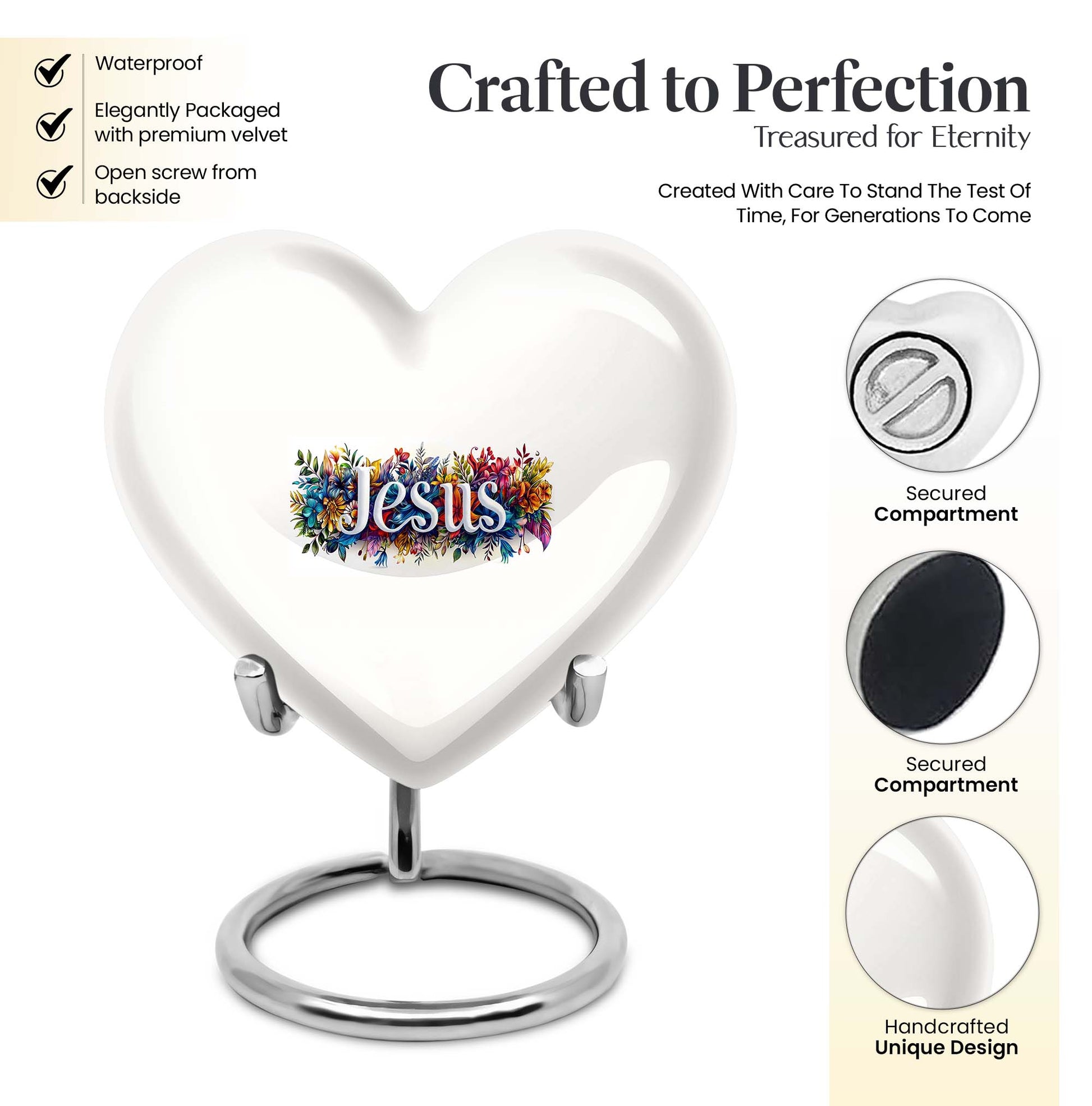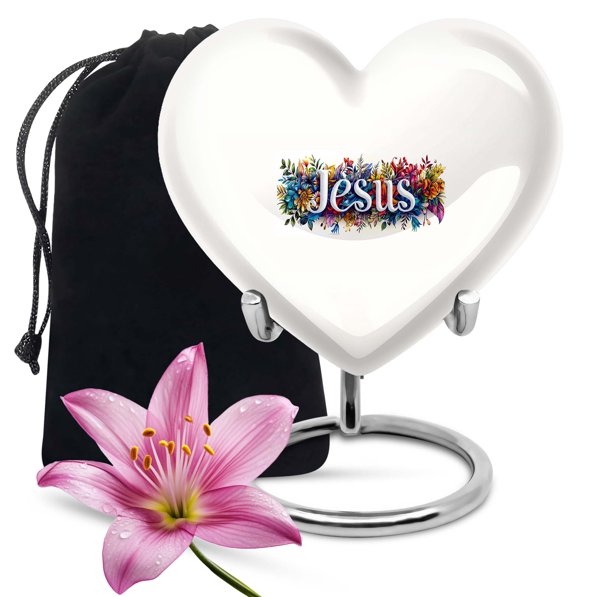 Honor your departed loved ones with this striking Jesus Urn, a fitting tribute for their final resting place. This aluminium cremation urn comes in a unique and robust 'Heart Urn' design, adding a touch of serenity to your memorial ceremonies. Designed to secure ashes, this sizeable 10-inch cremation instrument highlights an abstract theme that subtly breaks away from the norm. This cremation urn for human ashes is a perfect choice for adults and contains up to 200 cubic inches of ashes, embodying the physical measurements of a full-size adult. It is lightweight, weighing just 3.3 pounds, which makes it both transportable and easy to manage. The urn comes with a soft velvet pouch, thereby providing a dignified enclosure for your loved one's ashes. Additionally, you can personalize this cremation urn by engraving names, a tribute that either signifies love, peace, or everlasting memory. Choose this burial urn for cremation ashes for a celebration of your loved one's life.
