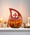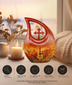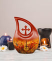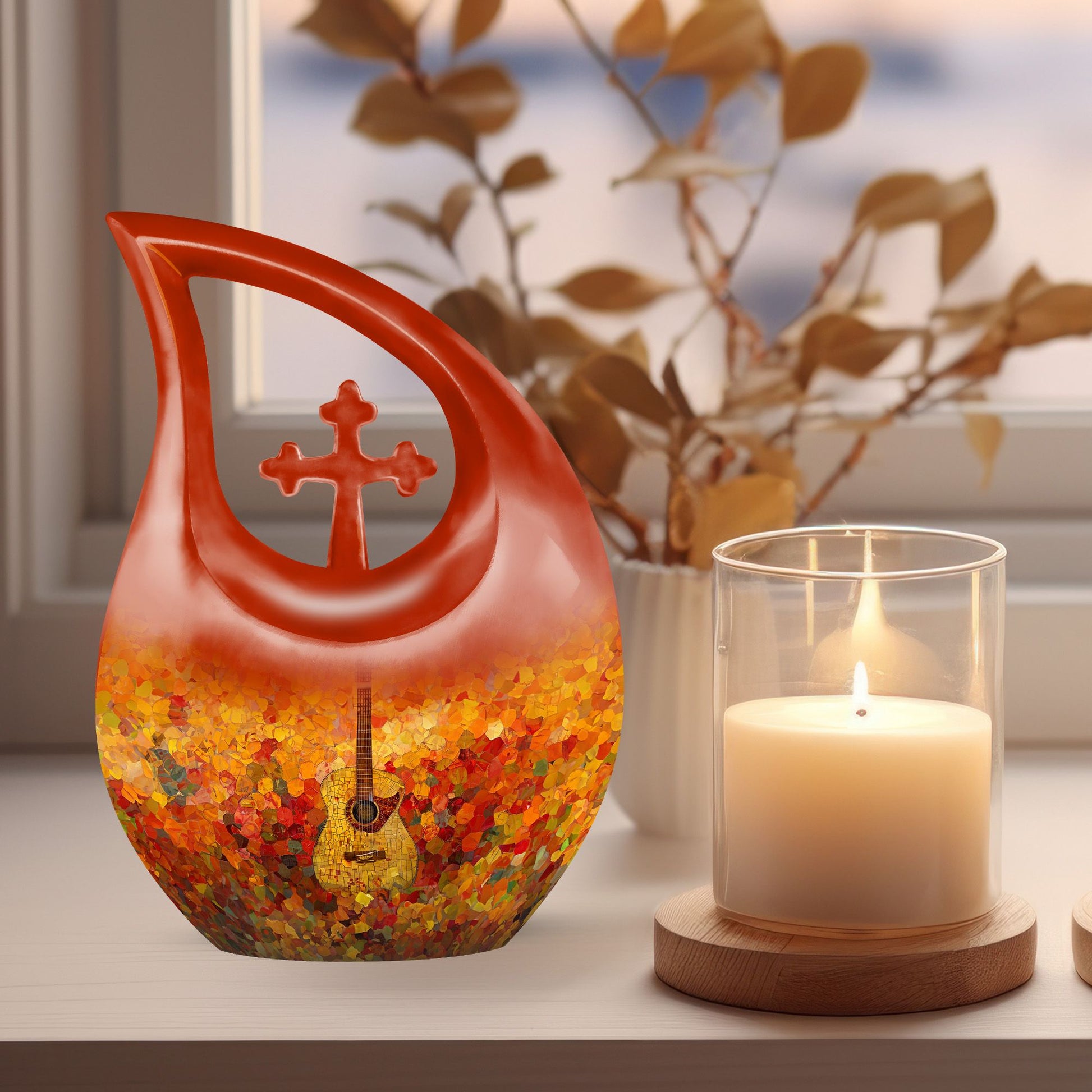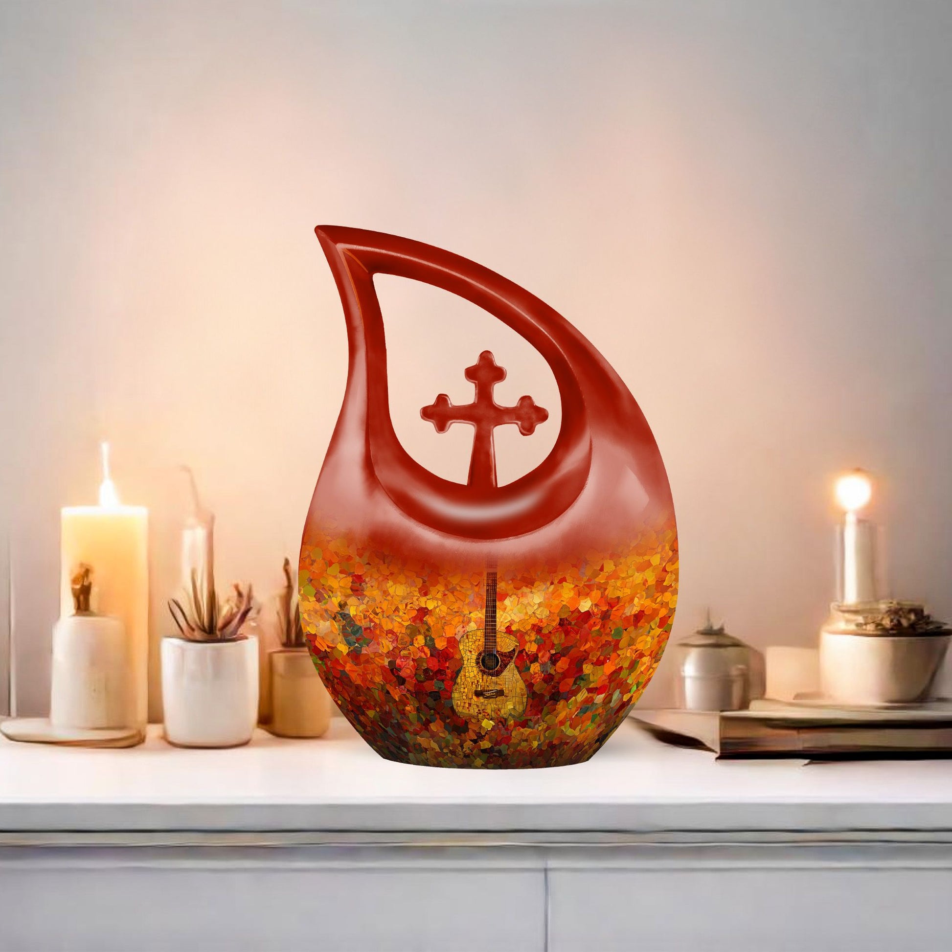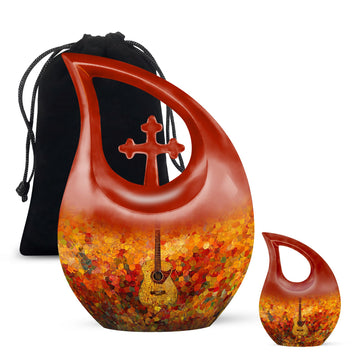 Preserve cherished memories with this authentic 10-inch Guitar Urn, a noteworthy tribute for music-lovers. Meticulously crafted from superior-quality Aluminium, this Large Cremation Urn is indeed an emblem of durability, ensuring a long-lasting remembrance. Adorned with an intricate 'Cross Drop' theme, it exudes a sense of tranquility and grace, upholding the spirit of your departed loved one. This urn can securely hold up to 200 cubic inches of ashes, providing sufficient space for most adults. Weighing 3.3 pounds, it is manageable and can be conveniently positioned in your beloved place. The urn offers customization options; you can personalize it with engraved names, adding an intrinsic touch of fond recollections. It comes with a velvet pouch to tactfully contain the ashes. Widely sought after for its affordability, this Guitar Urn makes for a considerate choice amongst memorial urns, ashes urns for sale, and cremation boxes medium urns.