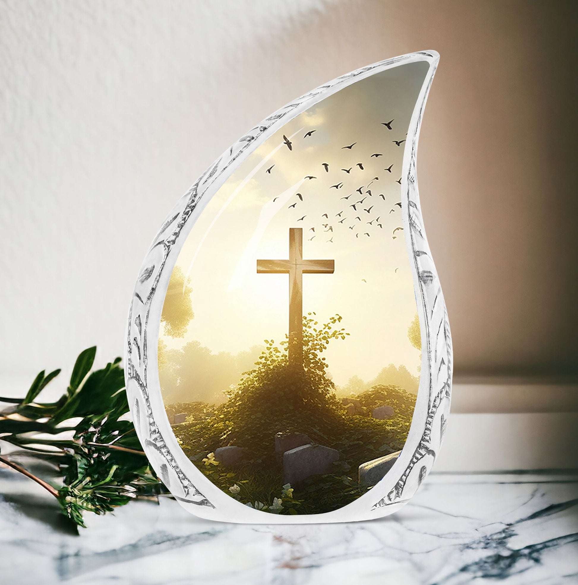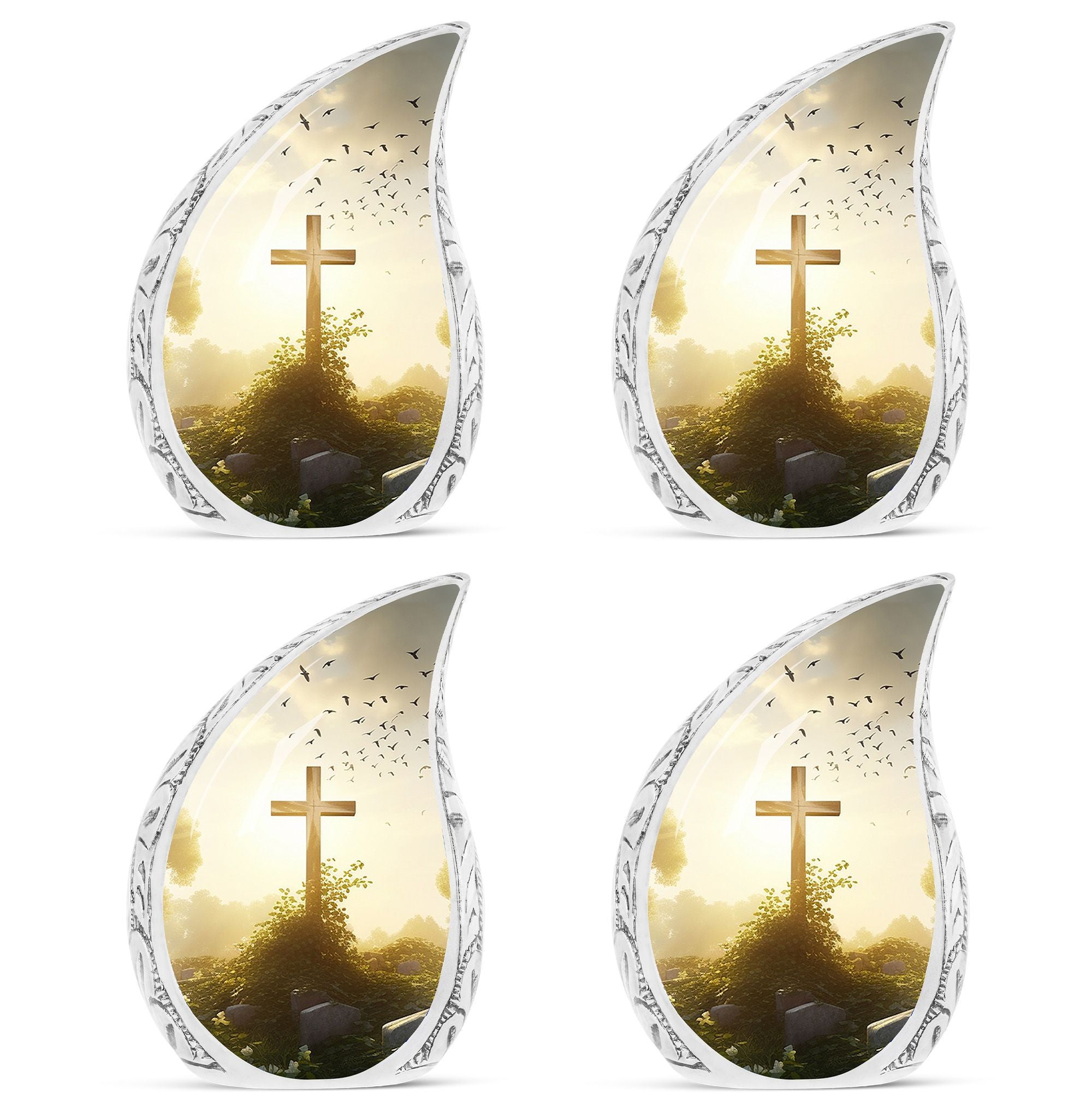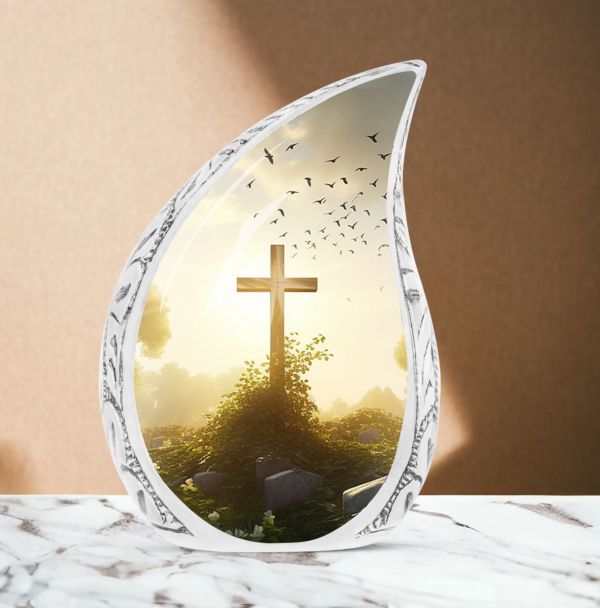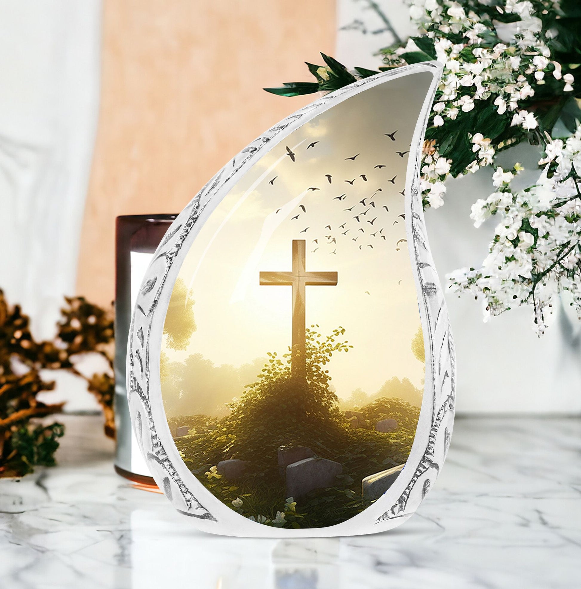 Introducing our Holy Cross Urn, a sublime selection from our array of Large Urns specially designed for human ashes. This cherished piece, crafted from robust aluminium, offers a solemn tribute and visible memorial to a loved one. Weighing in at 3.3 pounds and standing 10-inches tall, the urn possesses a 200 cubic inch capacity, handily accommodating the ashes of adults and seniors. The classic urn form is complemented by a Personalized engraving, offering an intimate touch to an already distinct commemorative vessel. Our urn is meticulously packaged in a velvet pouch, ensuring safe containment and delivery of its precious contents. The 3-inch size adds to the decorum, enriching your memorial ceremony experiences. Contemporary yet traditionally elegant, this cremation urn merges 'Modern Urn' design with ancient reverence. Distinct among Personalized Urns and Modern Cremation Urns, our Holy Cross Urn serves as a reminder of cherished memories and beloved figures.