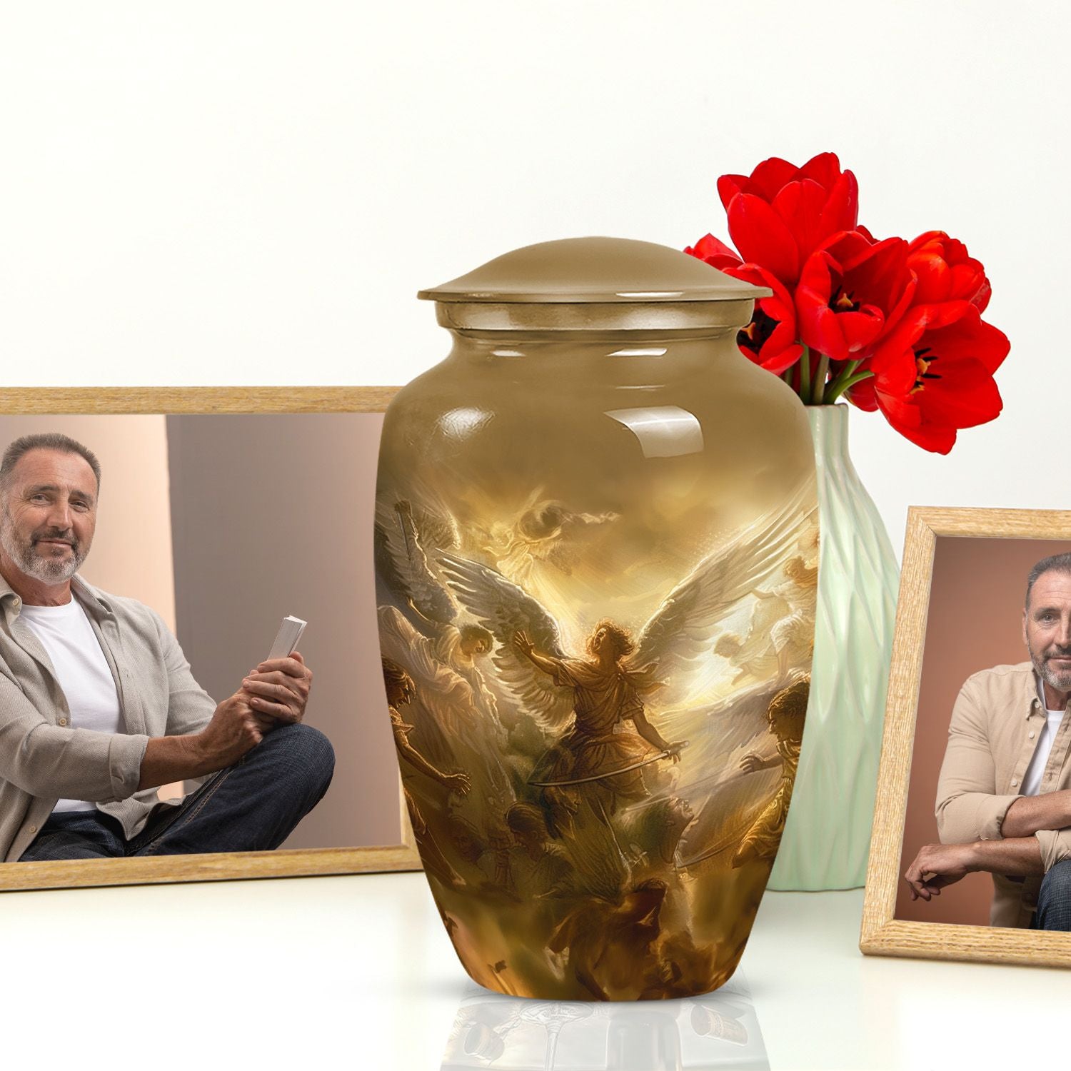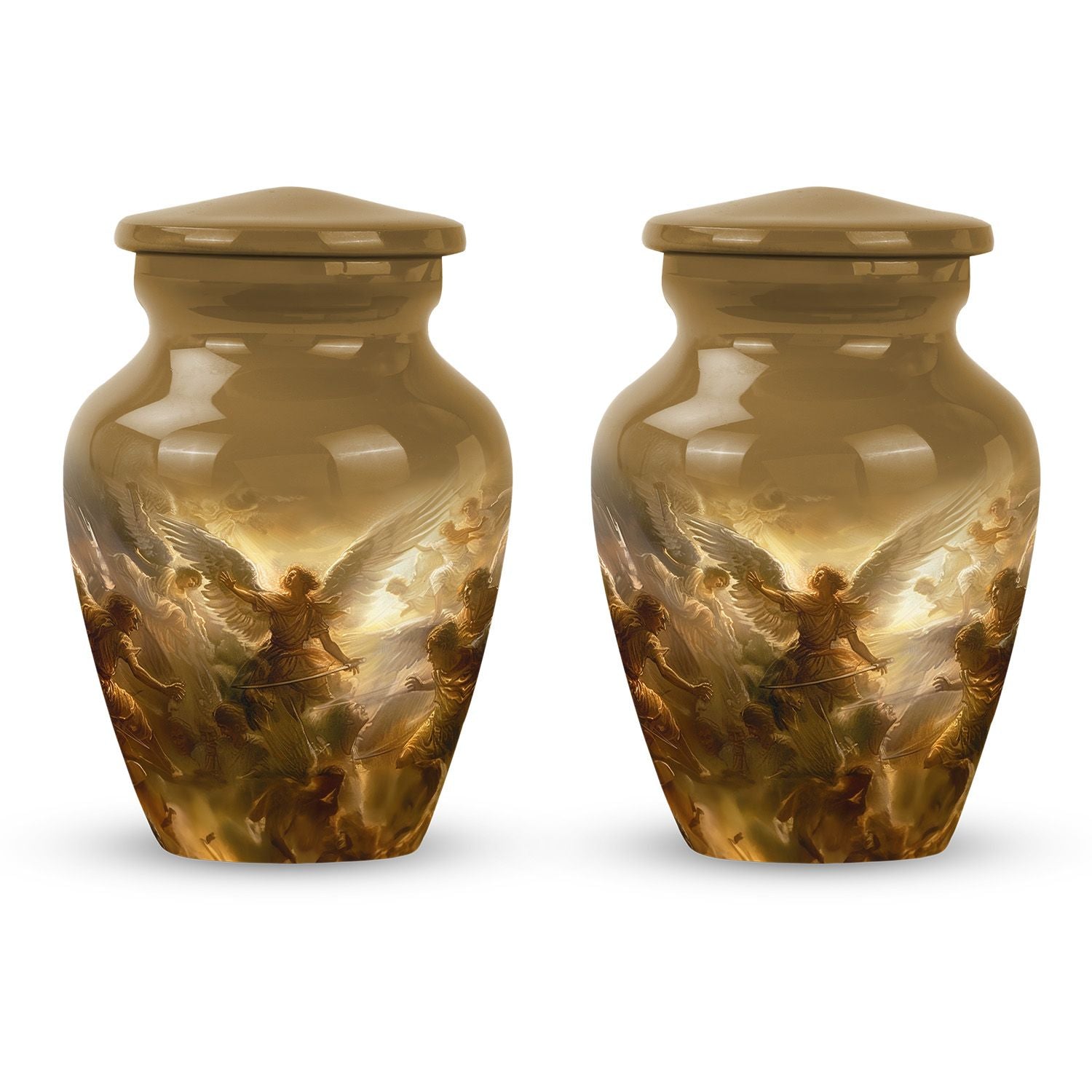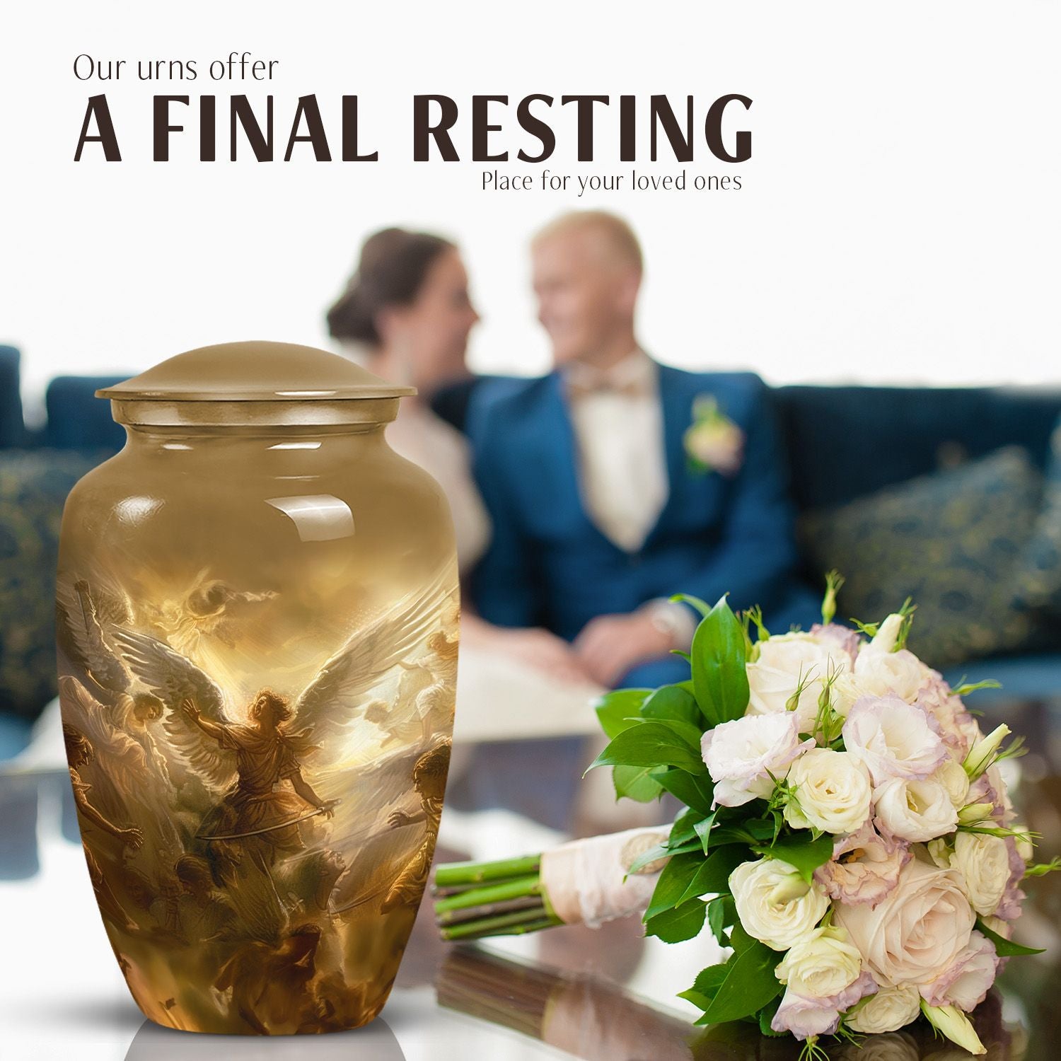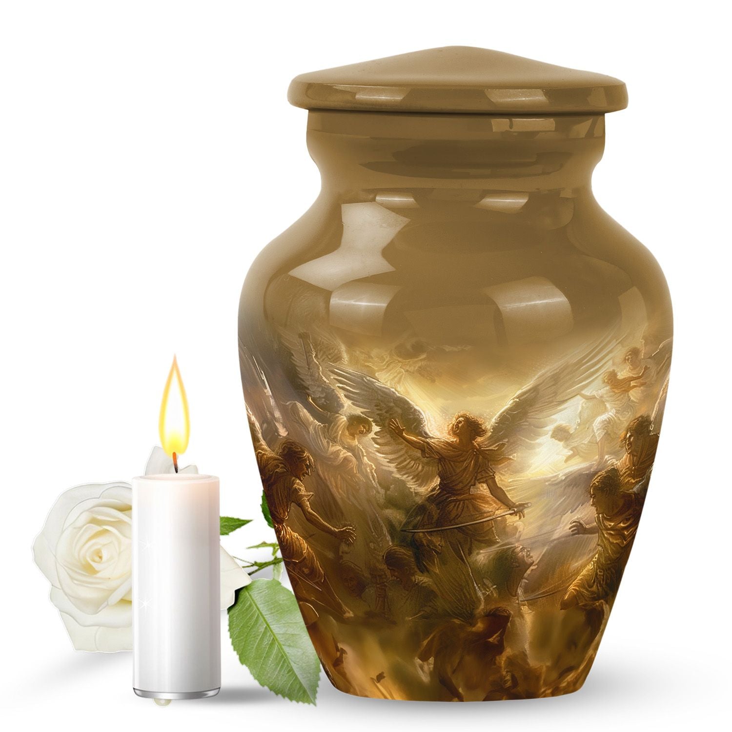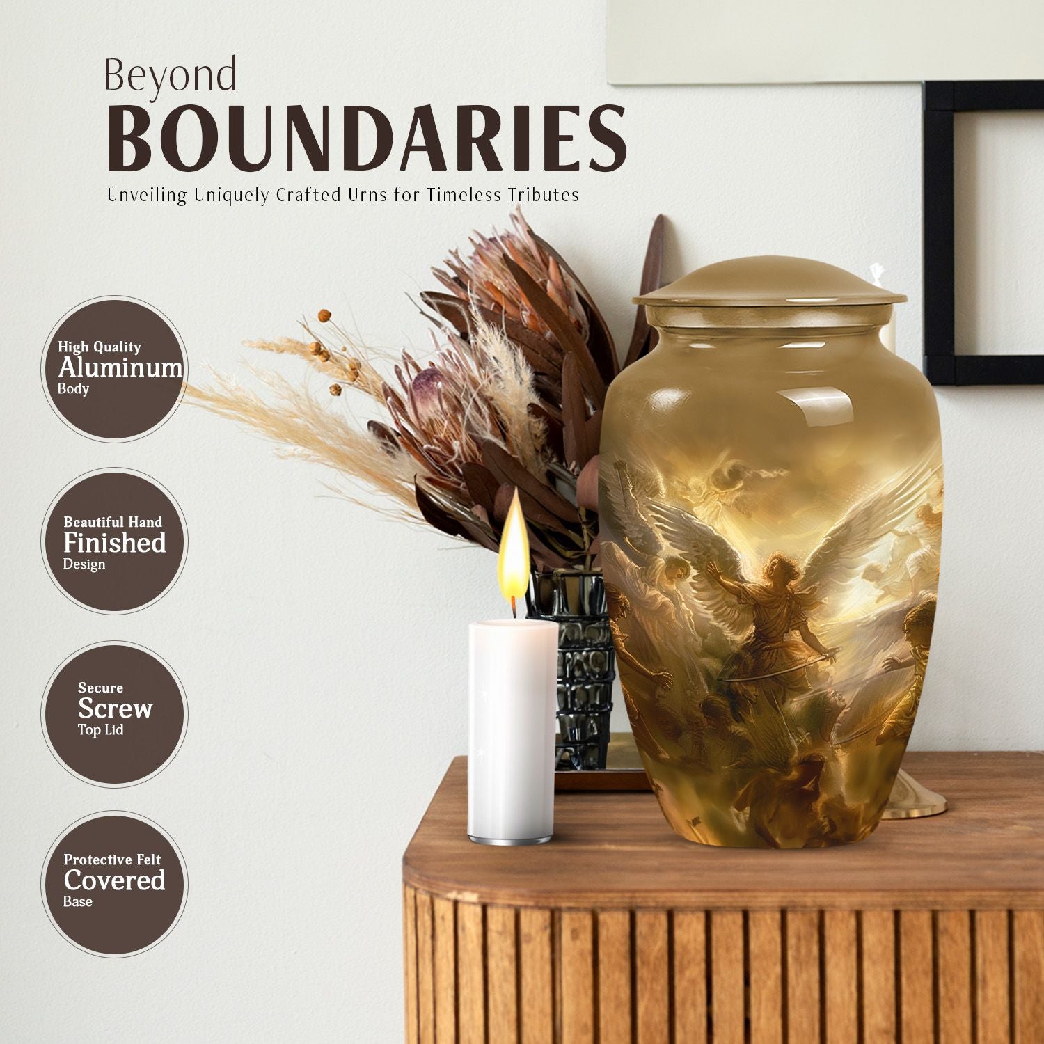 Experience the comforting presence of this serene, beautifully crafted 10-inch Catholic Urn. Our Large Urn is expertly fashioned from high-quality aluminium, offering a substantial weight of 3.3 pounds. Its unique abstract theme captures the essence of memorializing a loved one, transforming the urn from a simple container to a touching tribute. The urn has a generous capacity of 200 cubic inches, providing ample space for the containment of ashes. Each purchase comes with a velvet pouch, further emphasizing our commitment to making this moment as respectful as possible. Moreover, we offer the option to personalize this cremation funeral urns with engraved names, providing an intimate touch to an already meaningful piece. This urn is perfect for those seeking cremation urns for human ashes adult male or remembering any loved one. Ditch the usual 'memorial urns' search and opt for our distinctively stylish, timeless, and poignant product.
