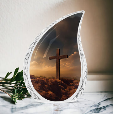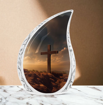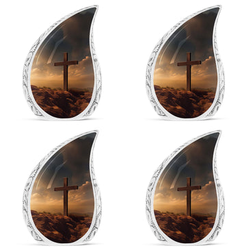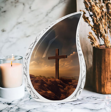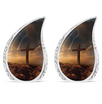 Preserve the sacred memories of your departed loved ones with our Jesus Christ Cross Cremation Urn. This aluminium large urn, measuring 10 inches in height and weighing 3.3 pounds, respectfully keeps up to 200 cubic inches of ashes. Our funeral urn, gracefully featuring the symbol of Jesus Christ Cross, offers a unique spiritual touch. Each urn comes with a plush velvet pouch designed for secure ash containment. With customization options, you can further personalize this urn with engraved names, making it a treasured homage for your beloved. This traditional 3-inch urn has the potential to become a cherished family heirloom. For those searching for 'Urns for Ashes for Dad', 'Personalized Urns', 'Decorative Urns for Ashes', or 'Urns for Human Remains', our Classic Urn perfectly meets your needs. Designed with love and dignity, this cremation urn is the ideal resting place for those closest to your heart.
