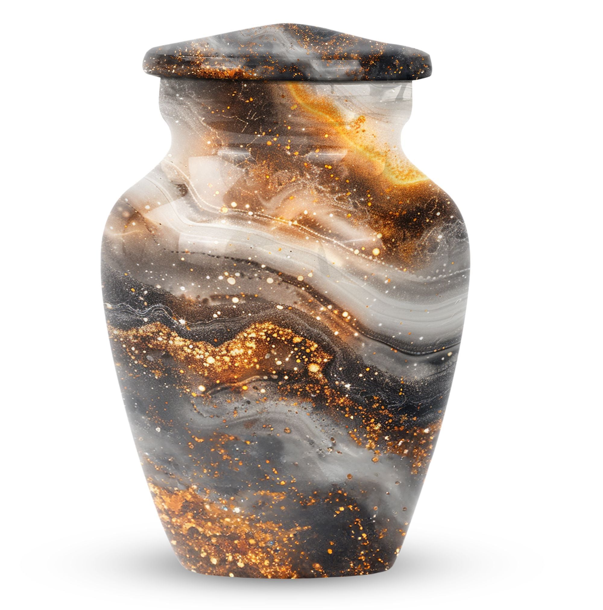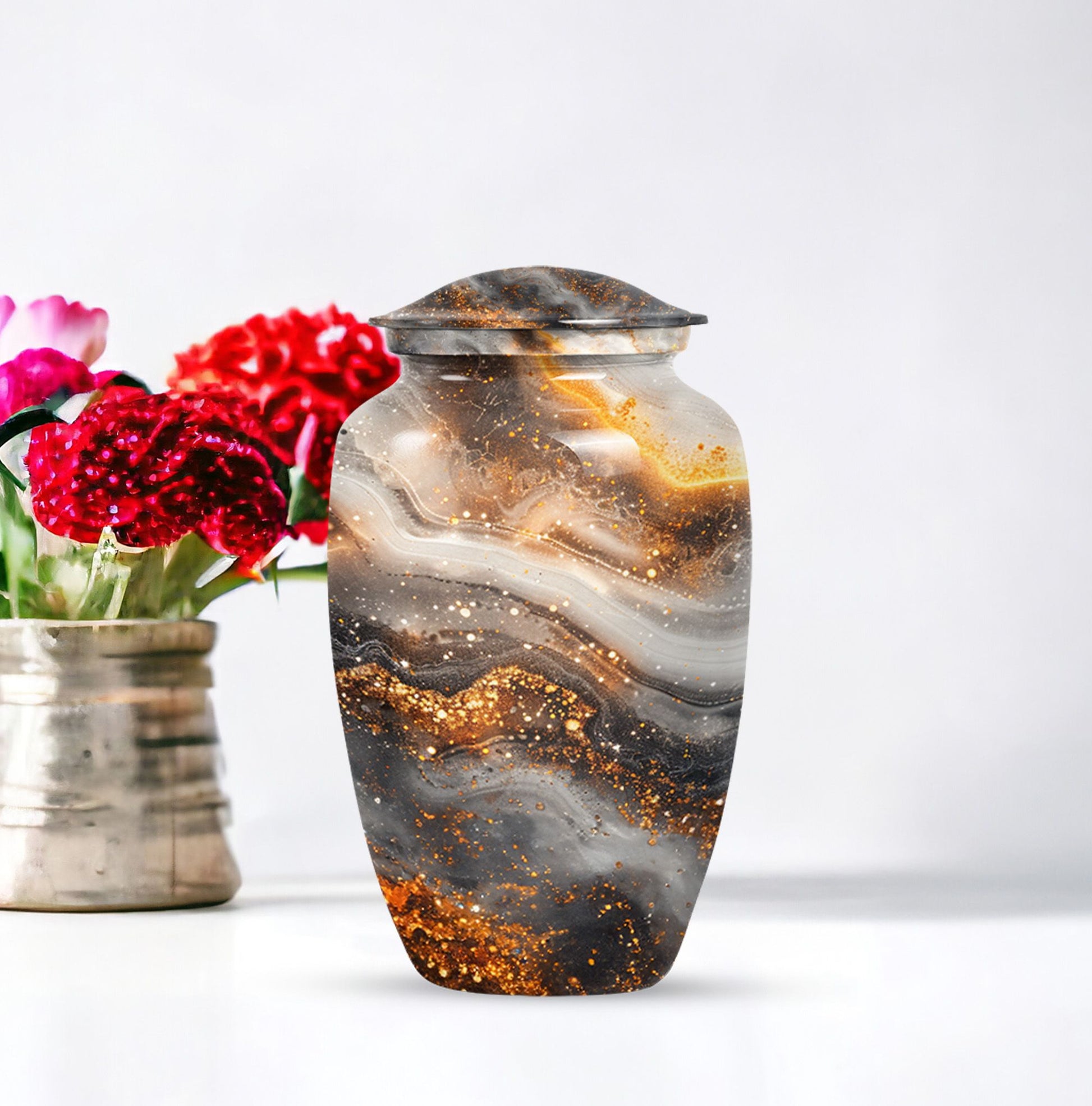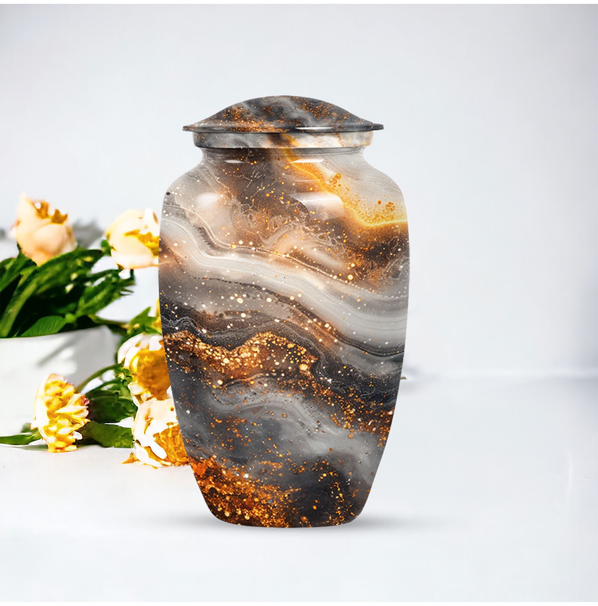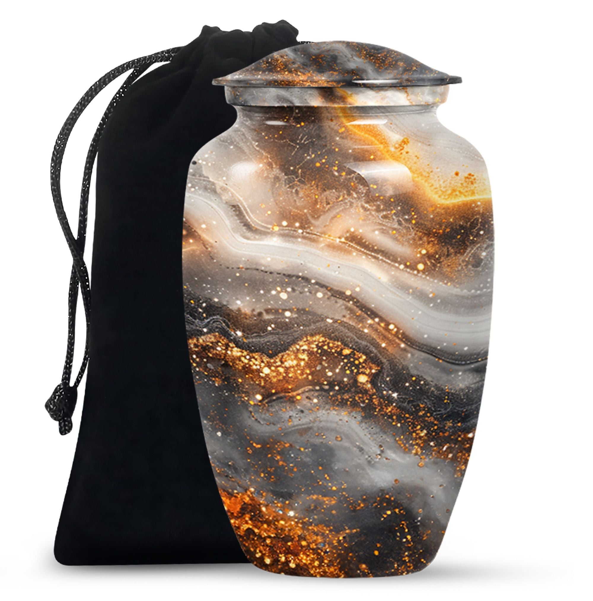 For those in search of memorial urns, our Vibrant Swirl Urn is a timeless tribute. Crafted from sturdy Aluminium material with an abstract theme, its medium size is perfect to store a substantial 200 cubic inches worth of human ashes. Despite its large capacity, this urn has a comfortable size of 10 inches and weighs a modest 3.3 pounds, making it fitting for both display and storage. The 10-inch height is not overbearing yet substantial, ensuring the urn holds a significant presence, wherever it may be positioned. We understand the significant role played by the urn in mourning and memorial ceremonies, thus its provision in a tasteful velvet pouch for containment and discreet carriage of the ashes. To add a personal touch, we offer the chance to personalize this classic urn with engraved names, making it all the more meaningful. For those considering funeral medium size urns for human ashes, the Vibrant Swirl Urn is the perfect emblem of remembrance. Perfectly balancing function and aesthetics, it serves as a fitting tribute to departed loved ones.