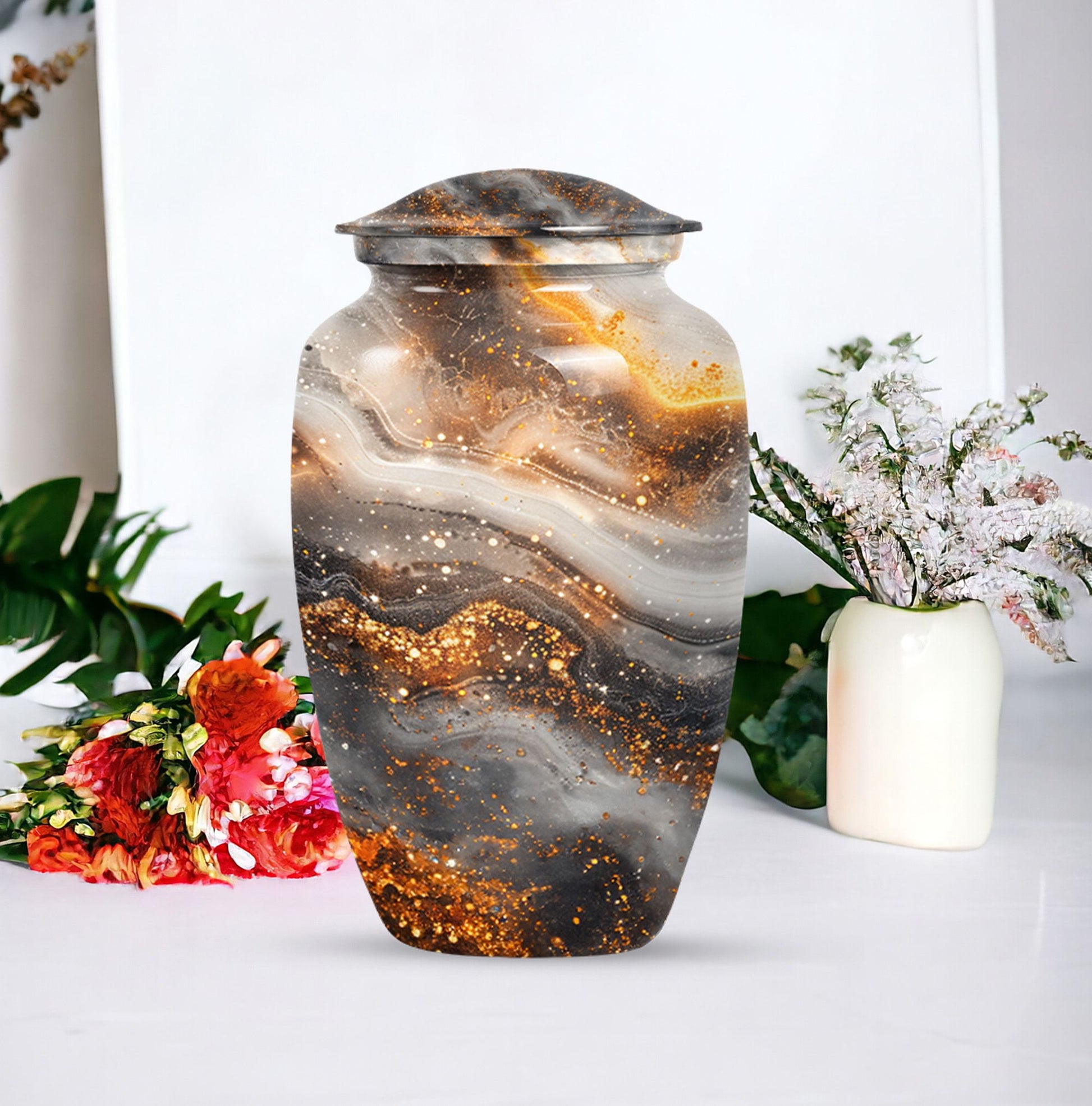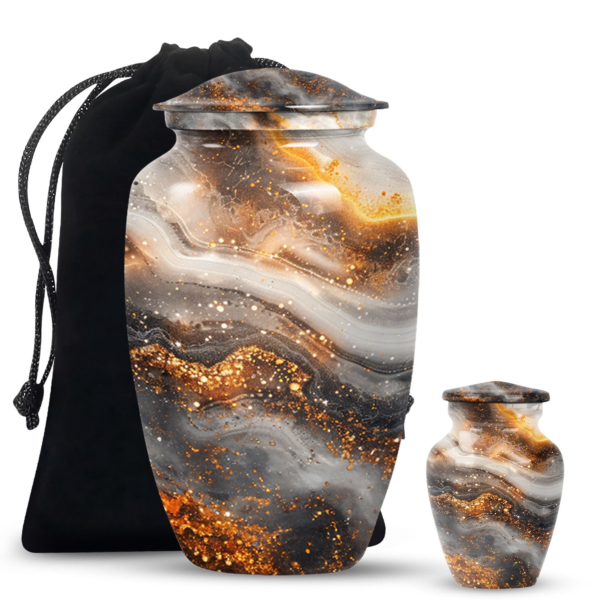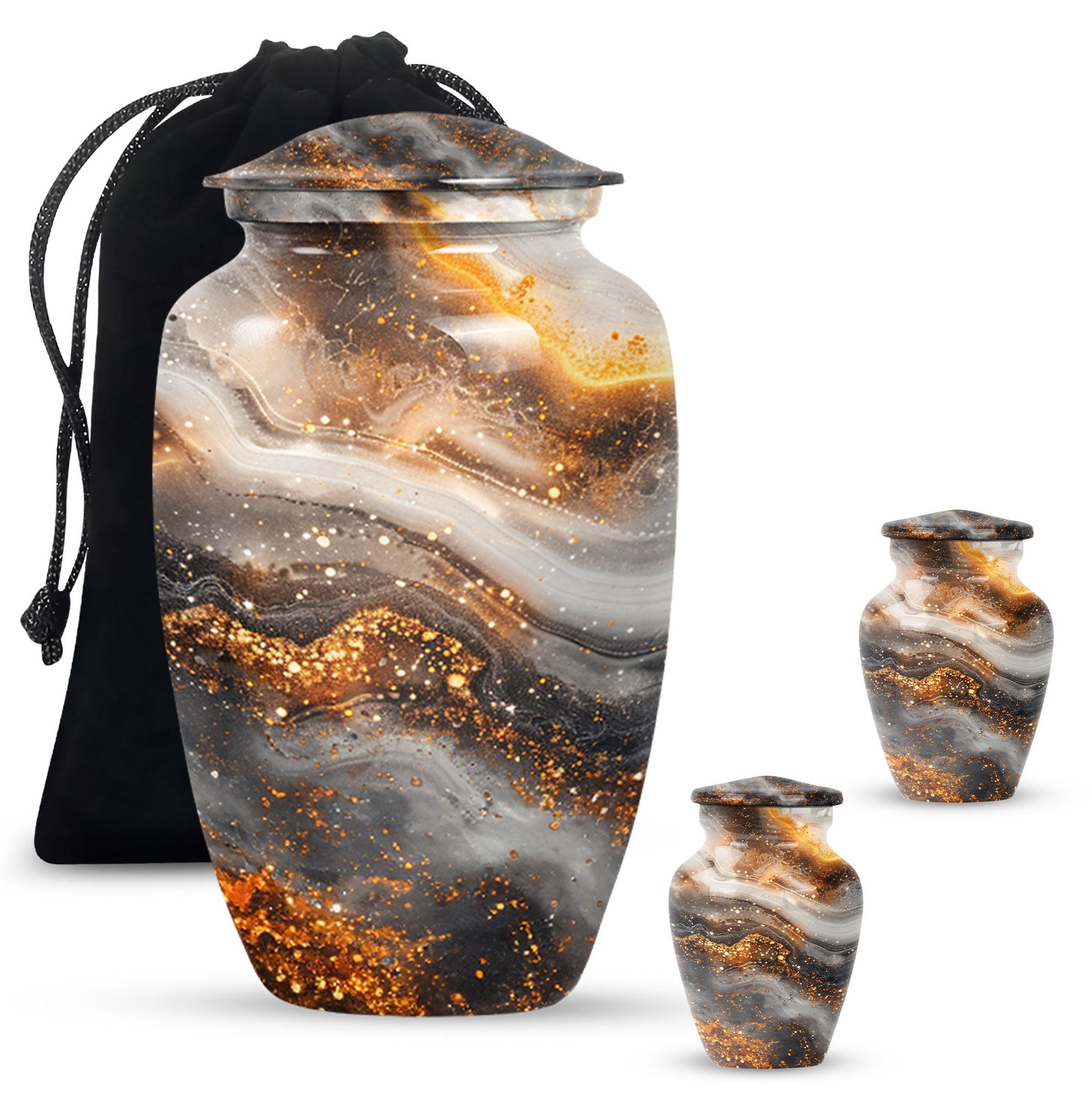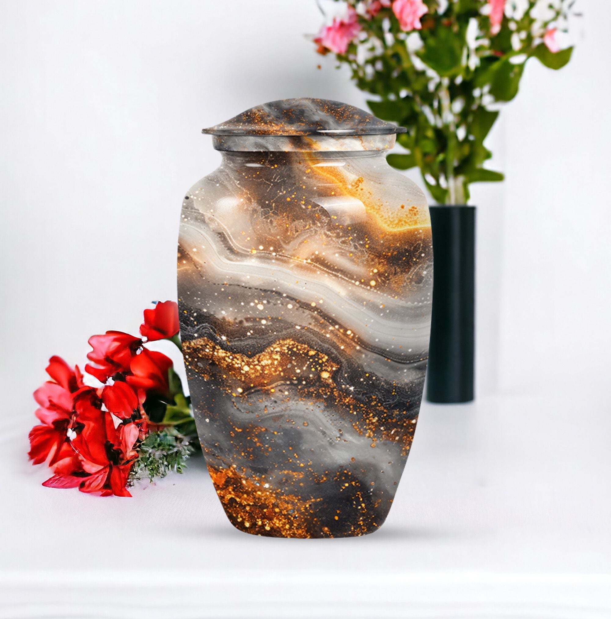 For those in search of memorial urns, our Vibrant Swirl Urn is a timeless tribute. Crafted from sturdy Aluminium material with an abstract theme, its medium size is perfect to store a substantial 200 cubic inches worth of human ashes. Despite its large capacity, this urn has a comfortable size of 10 inches and weighs a modest 3.3 pounds, making it fitting for both display and storage. The 10-inch height is not overbearing yet substantial, ensuring the urn holds a significant presence, wherever it may be positioned. We understand the significant role played by the urn in mourning and memorial ceremonies, thus its provision in a tasteful velvet pouch for containment and discreet carriage of the ashes. To add a personal touch, we offer the chance to personalize this classic urn with engraved names, making it all the more meaningful. For those considering funeral medium size urns for human ashes, the Vibrant Swirl Urn is the perfect emblem of remembrance. Perfectly balancing function and aesthetics, it serves as a fitting tribute to departed loved ones.