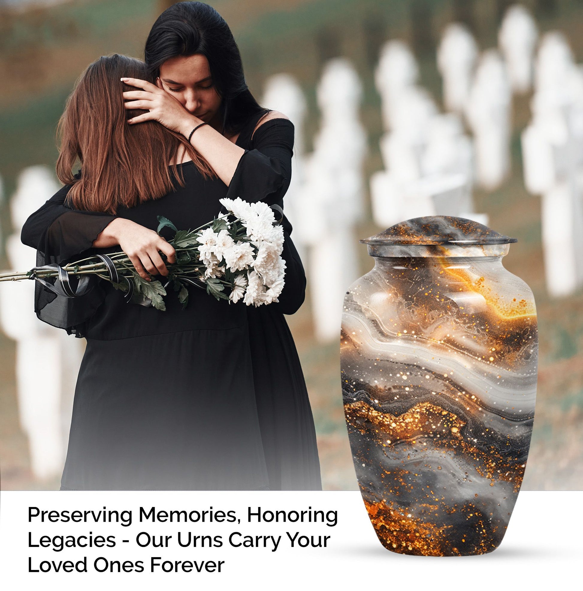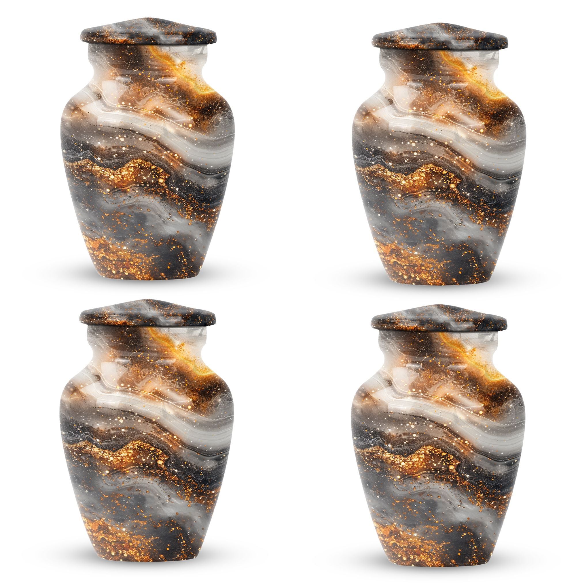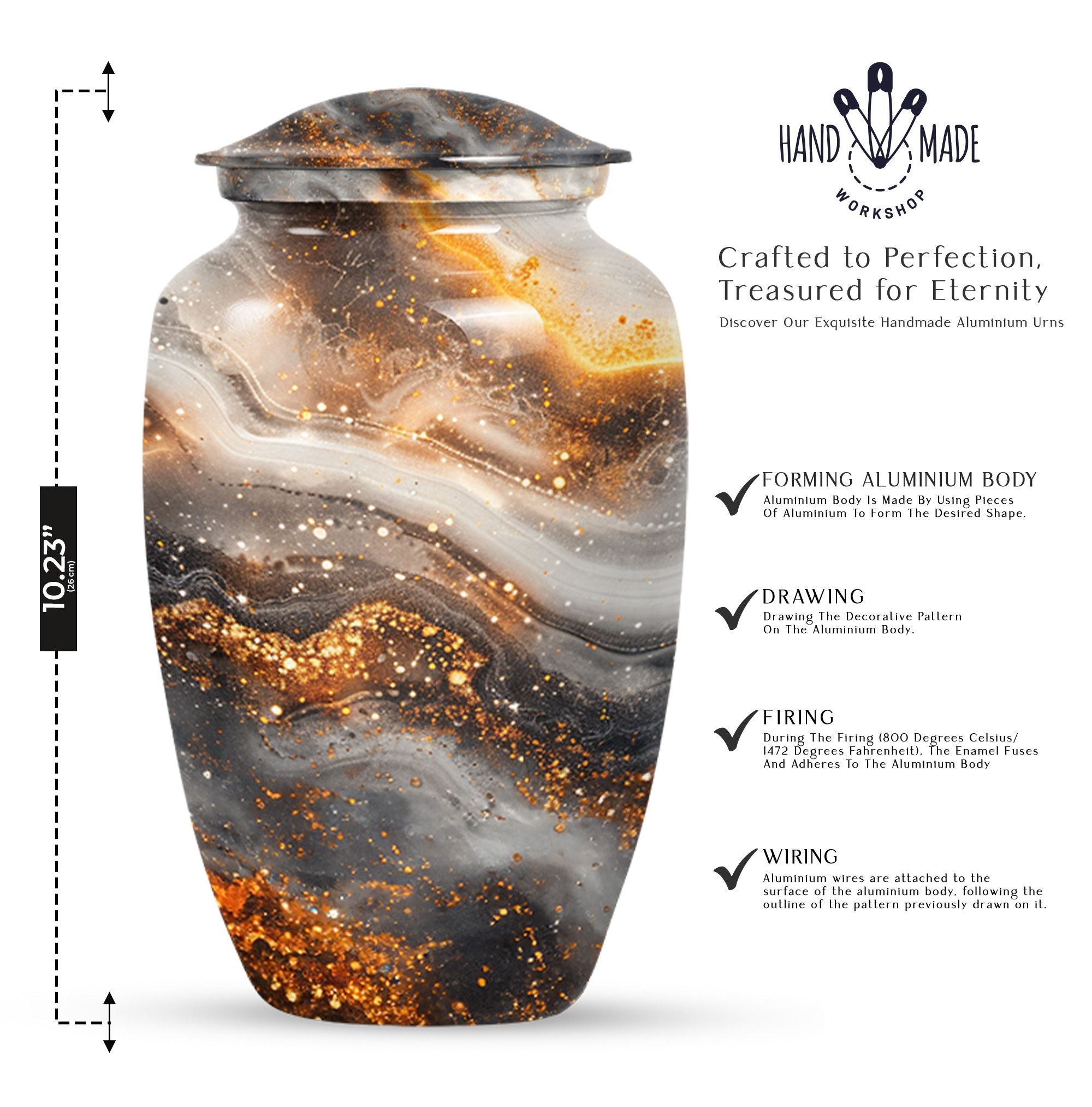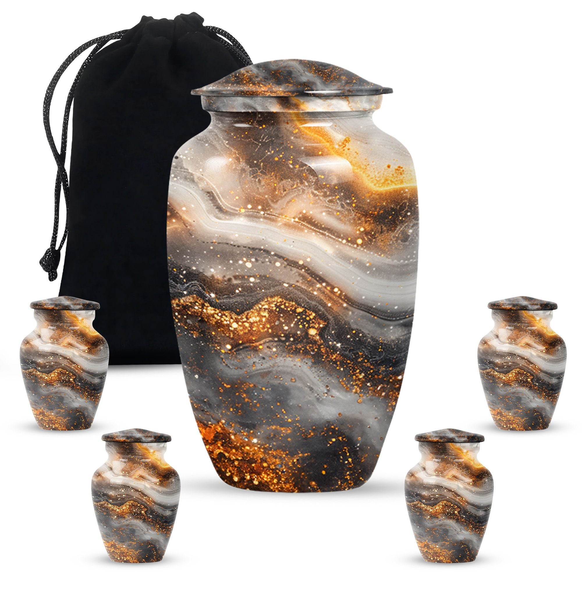 For those in search of memorial urns, our Vibrant Swirl Urn is a timeless tribute. Crafted from sturdy Aluminium material with an abstract theme, its medium size is perfect to store a substantial 200 cubic inches worth of human ashes. Despite its large capacity, this urn has a comfortable size of 10 inches and weighs a modest 3.3 pounds, making it fitting for both display and storage. The 10-inch height is not overbearing yet substantial, ensuring the urn holds a significant presence, wherever it may be positioned. We understand the significant role played by the urn in mourning and memorial ceremonies, thus its provision in a tasteful velvet pouch for containment and discreet carriage of the ashes. To add a personal touch, we offer the chance to personalize this classic urn with engraved names, making it all the more meaningful. For those considering funeral medium size urns for human ashes, the Vibrant Swirl Urn is the perfect emblem of remembrance. Perfectly balancing function and aesthetics, it serves as a fitting tribute to departed loved ones.