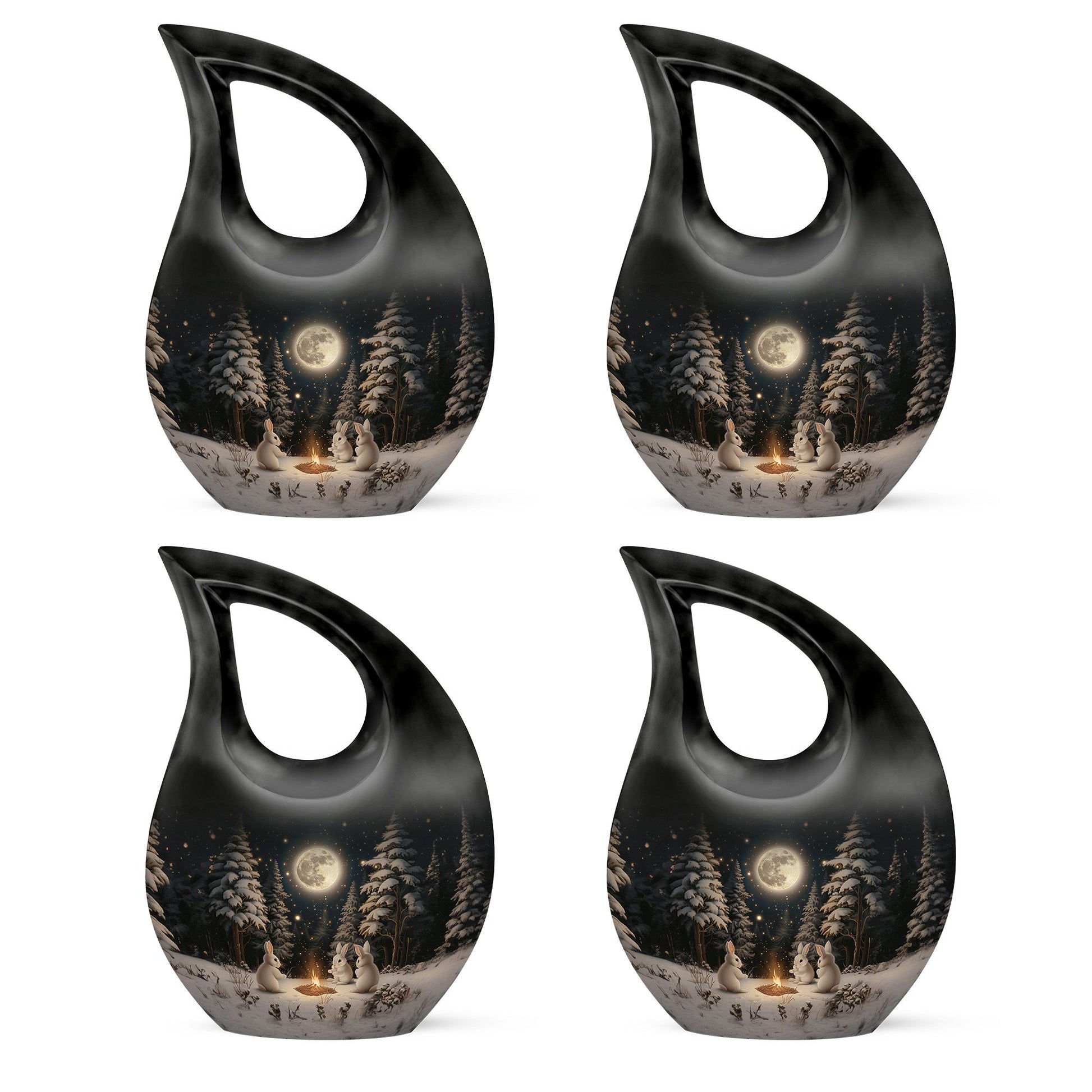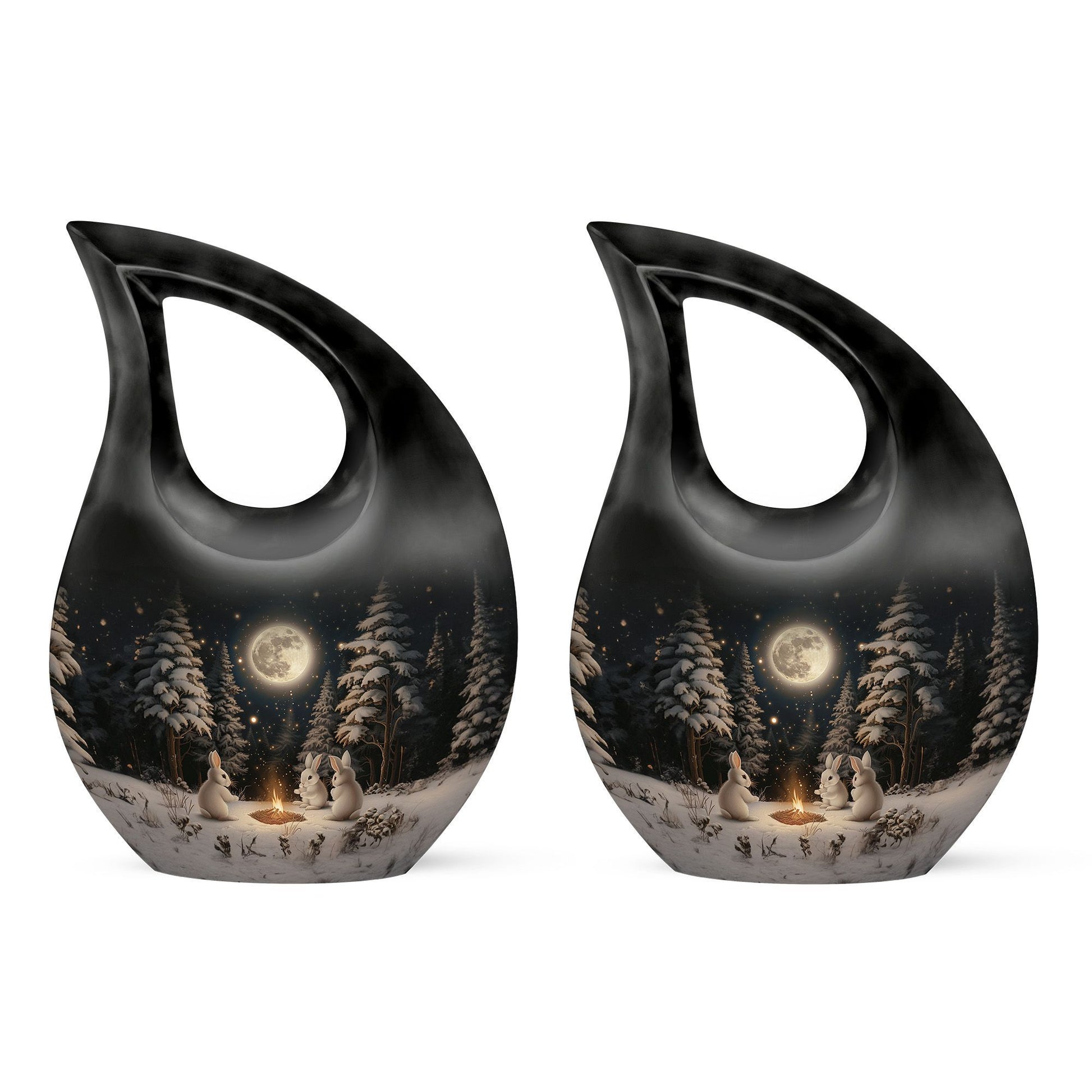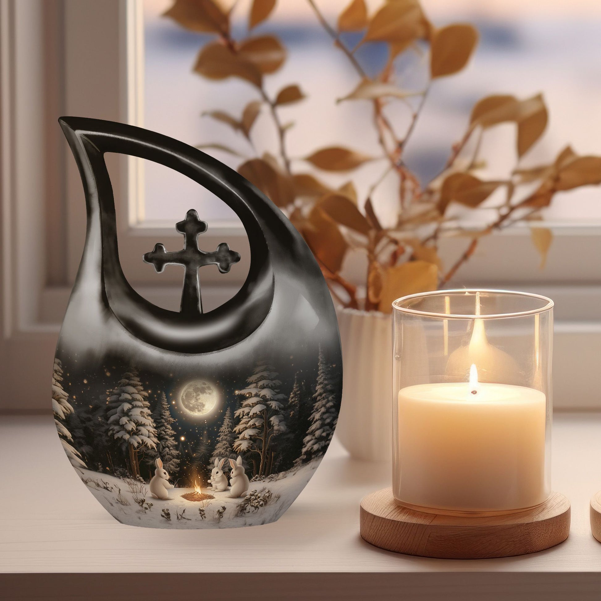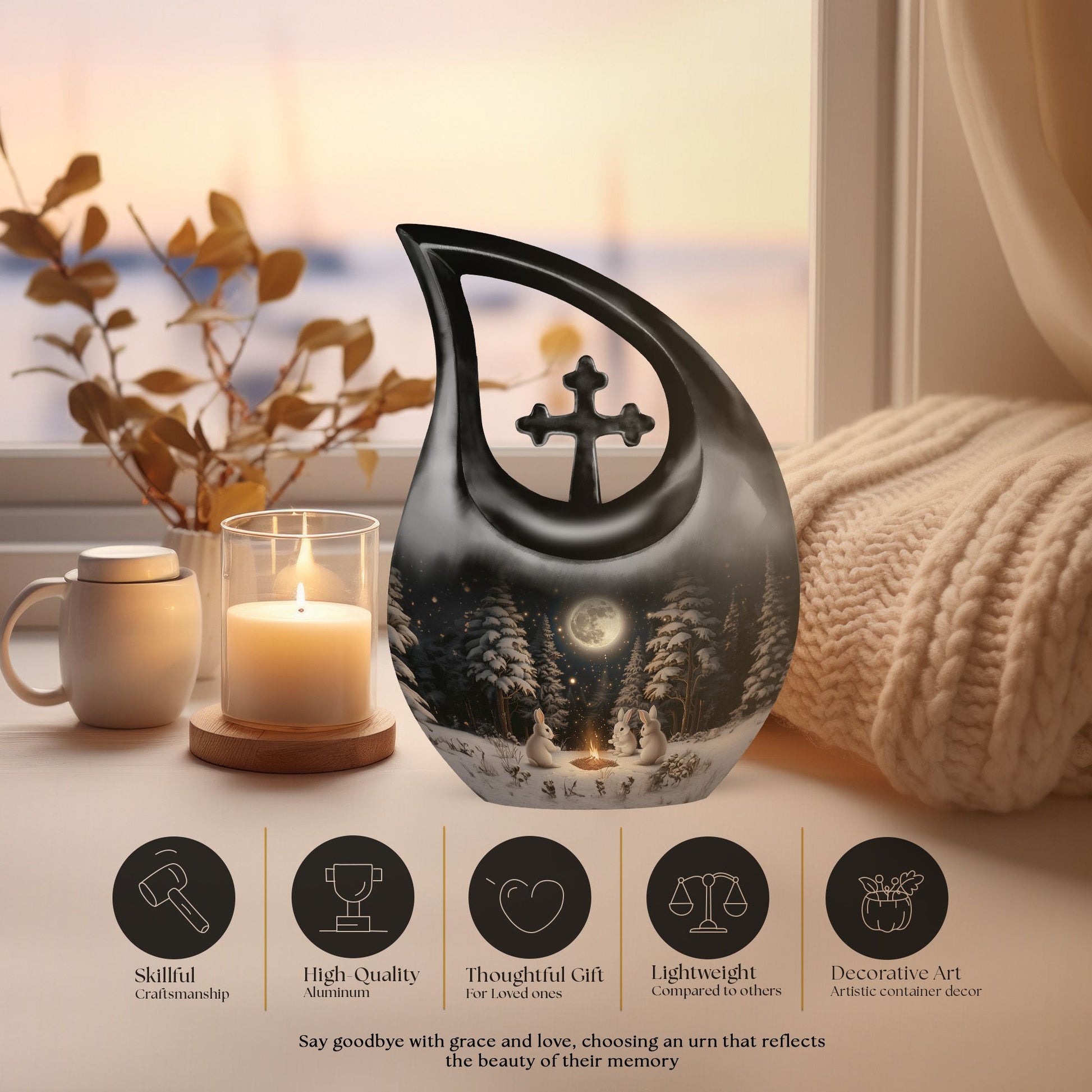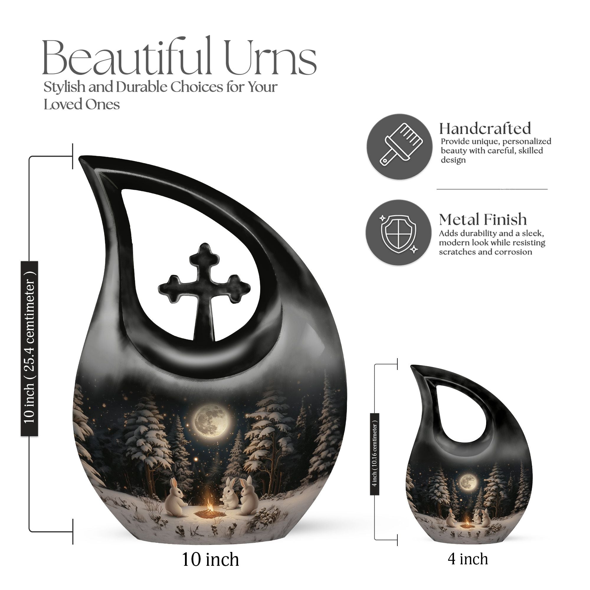Presenting the White Bunny Moon Urn, a thoughtfully crafted keepsake to celebrate and perpetuate the memories of your loved ones. This 'Large Urn' derived from sturdy 'Aluminium' stands at a height of '10 inches', weighing '3.3 pounds'. It can house '200 cubic inches' of memories, adding a touch of serenity to its surroundings. Our 'Cross Drop' urn design is geared towards those seeking a modern approach to memorial practices. The urn encapsulates comforting warmth and legacy within its style, all while respecting the essence of traditional memorial urns. It comes with a delicate 'velvet pouch' for the containment of ashes, ensuring dignity to your beloved's farewell. In addition to aesthetic attributes, we offer the opportunity to 'Personalize with engraved names' on the urn, making it an even more special memorial. With our White Bunny Moon Urn, we promise a timeless tribute. Popular among searches such as 'Urn For Mom', 'Remembrance Urns For Ashes', 'Modern Urns For Ashes', and 'Burial Urns For Human Ashes', this unique piece blends grace and sentiment effortlessly.