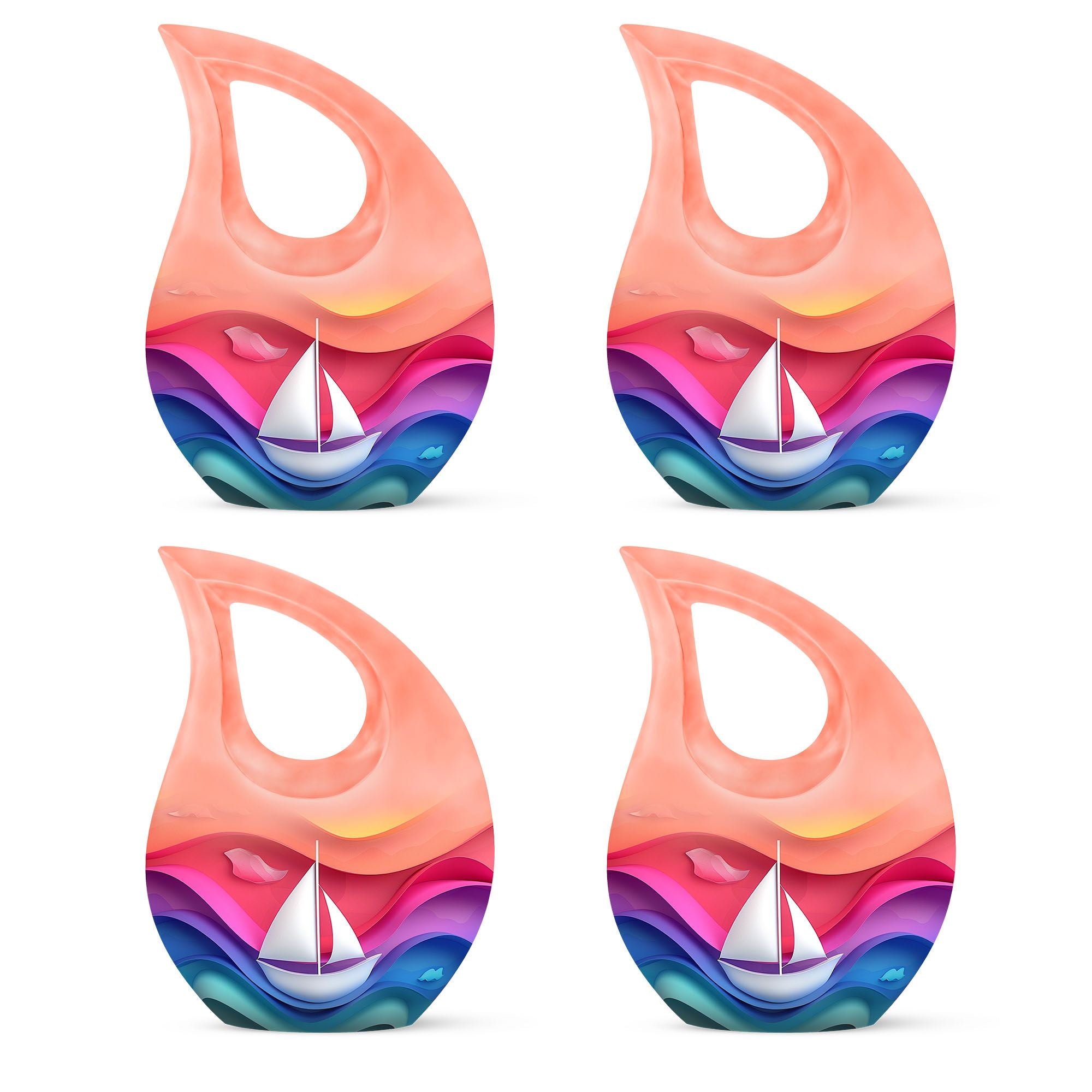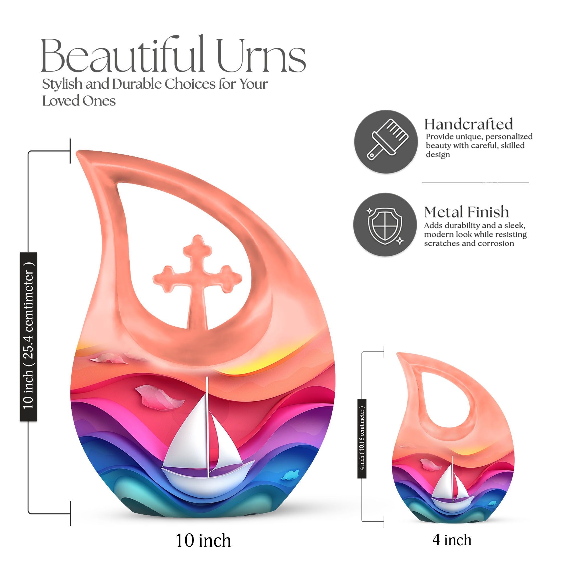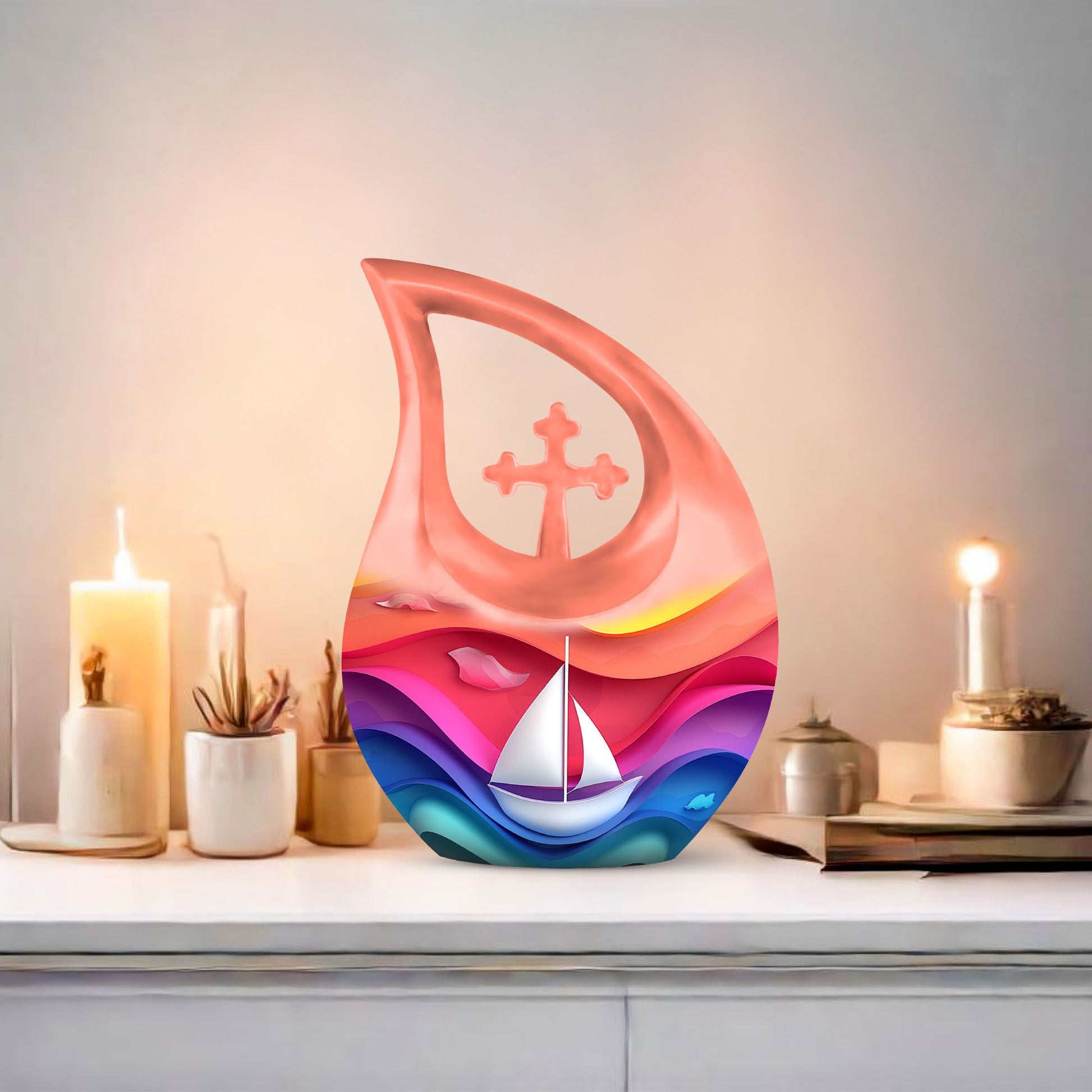 Expertly crafted from durable aluminum, this colorful urn features a gentle sail boat design symbolizing a peaceful journey forward. The smooth finish, secure construction, and timeless shape make it a beautiful option for those looking for mens urns for human ashes, funeral urns women, cremation urn women, or dignified funeral urns men. Designed as a classic 10 inch urn, it offers ample capacity and lasting durability for home display or burial.