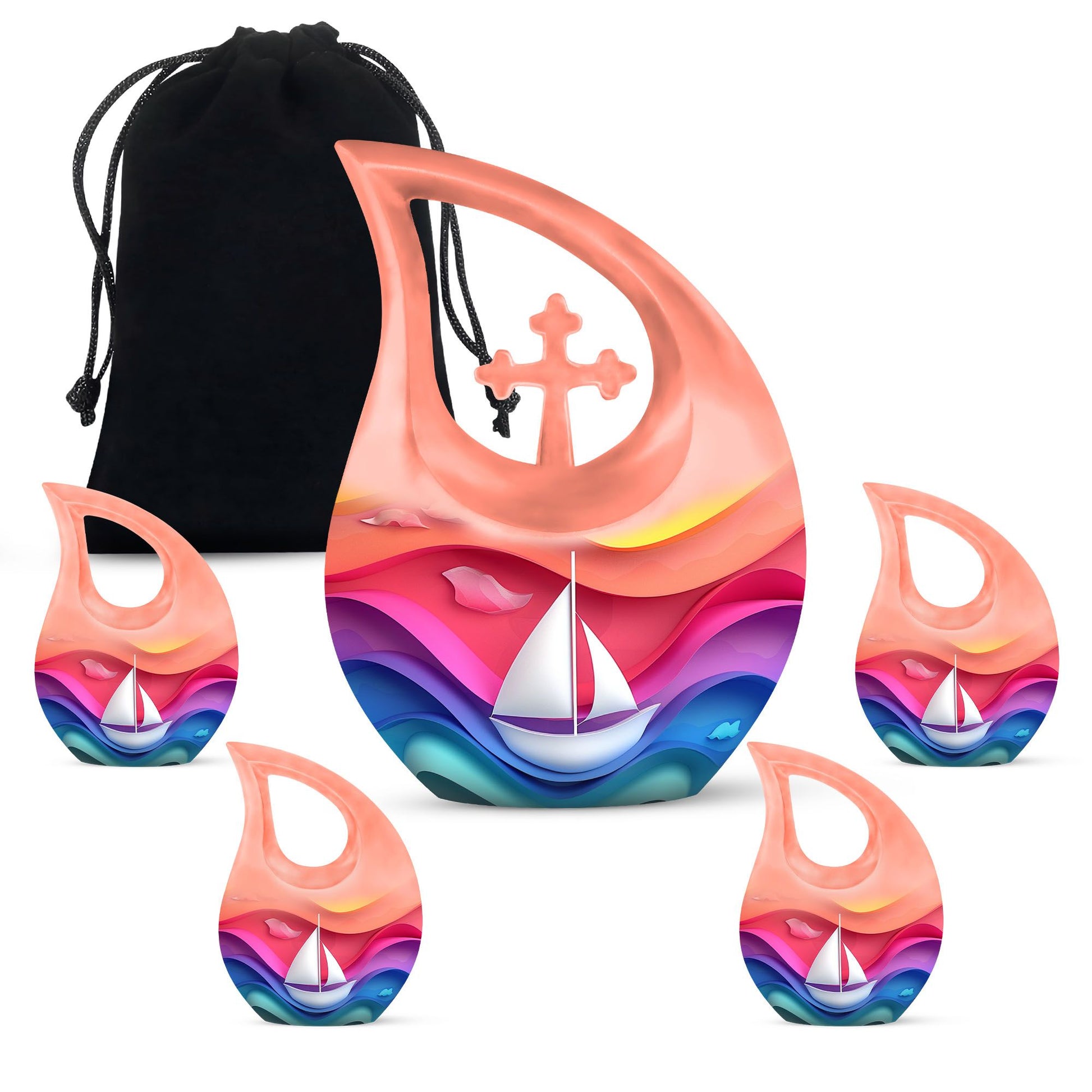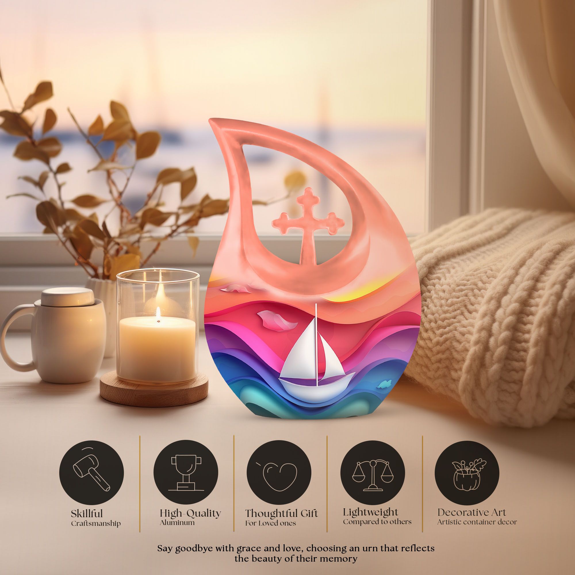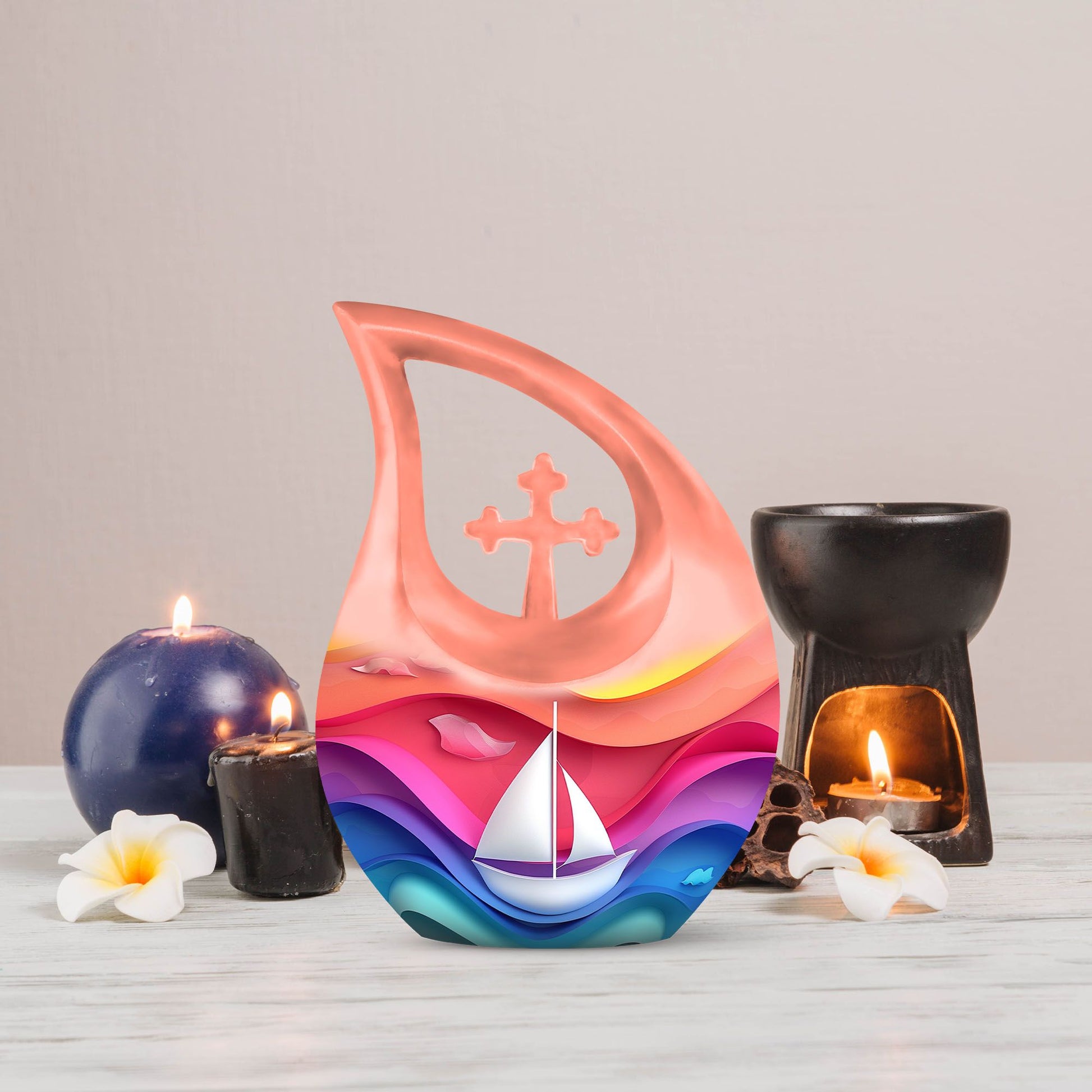 Expertly crafted from durable aluminum, this colorful urn features a gentle sail boat design symbolizing a peaceful journey forward. The smooth finish, secure construction, and timeless shape make it a beautiful option for those looking for mens urns for human ashes, funeral urns women, cremation urn women, or dignified funeral urns men. Designed as a classic 10 inch urn, it offers ample capacity and lasting durability for home display or burial.