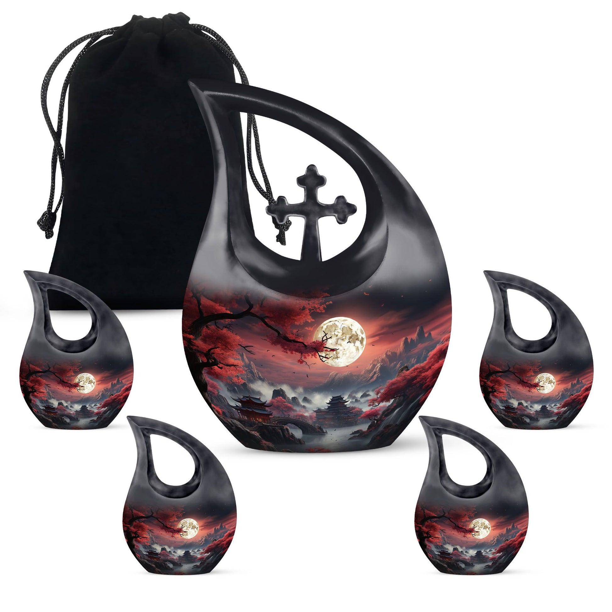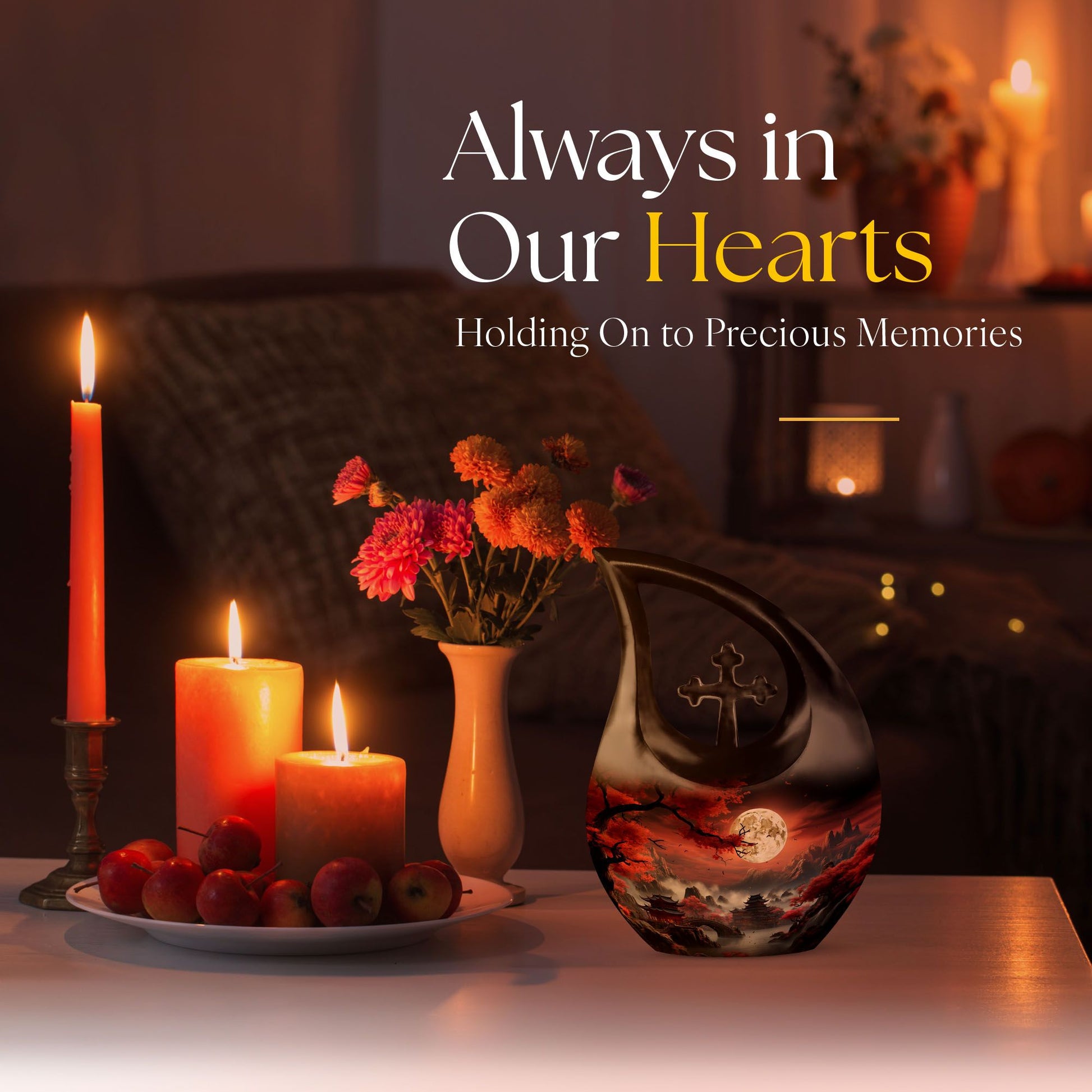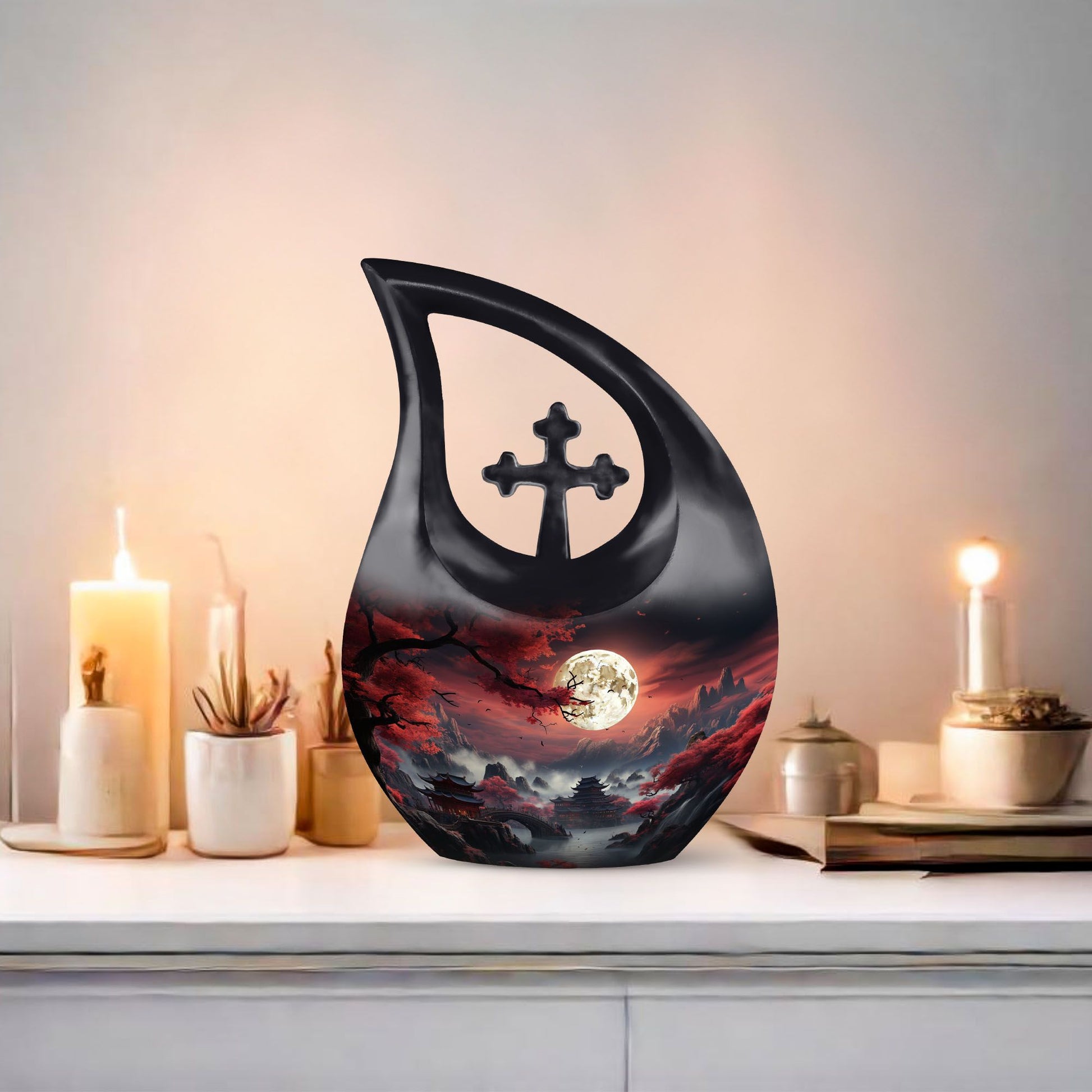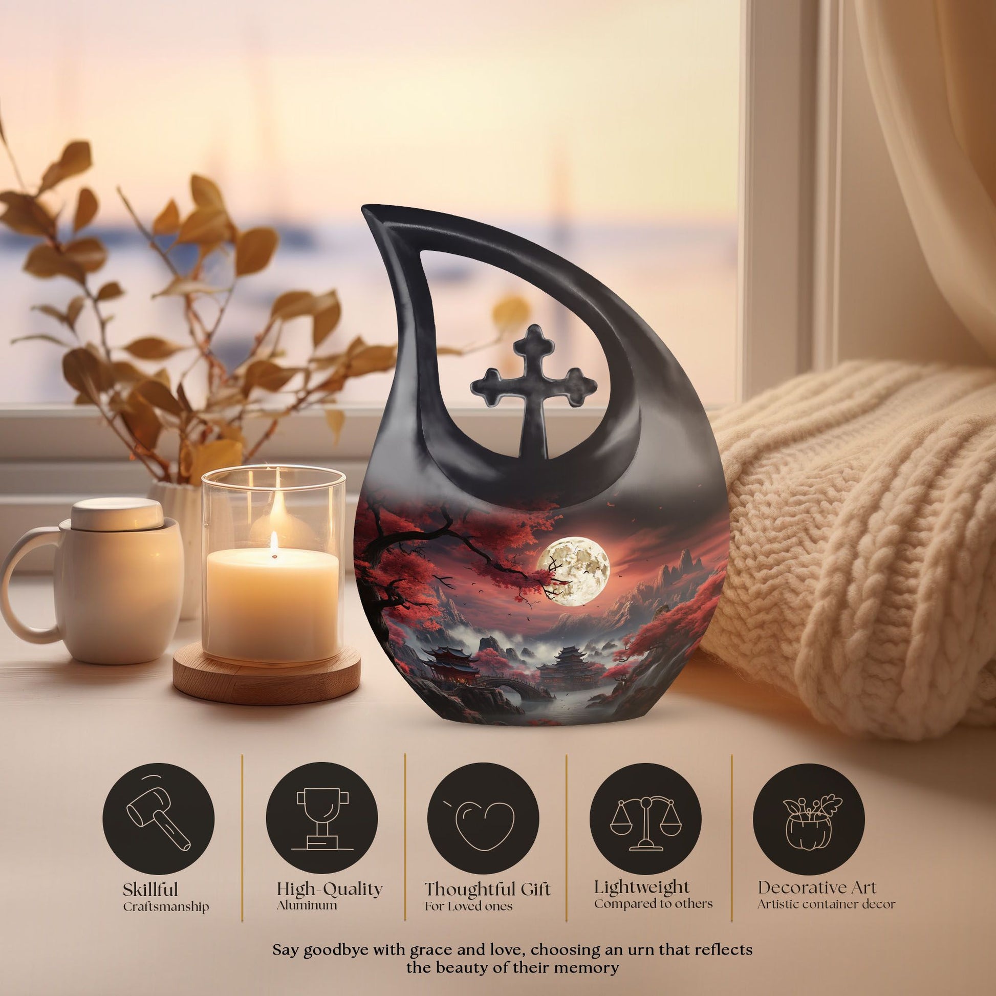 Every detail of this funeral adult urn captures the essence of artistic craftsmanship. Expertly made from high-quality aluminum, it features a hand-painted Japanese landscape illuminated by soft moonlight—an image of eternal tranquility. The smooth contours and lustrous finish make it a standout among funeral urn ashes options, while the sturdy structure ensures lasting protection. Whether displayed at home or in a memorial space, this funeral urn harmonizes art and remembrance in perfect balance.